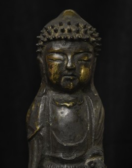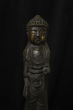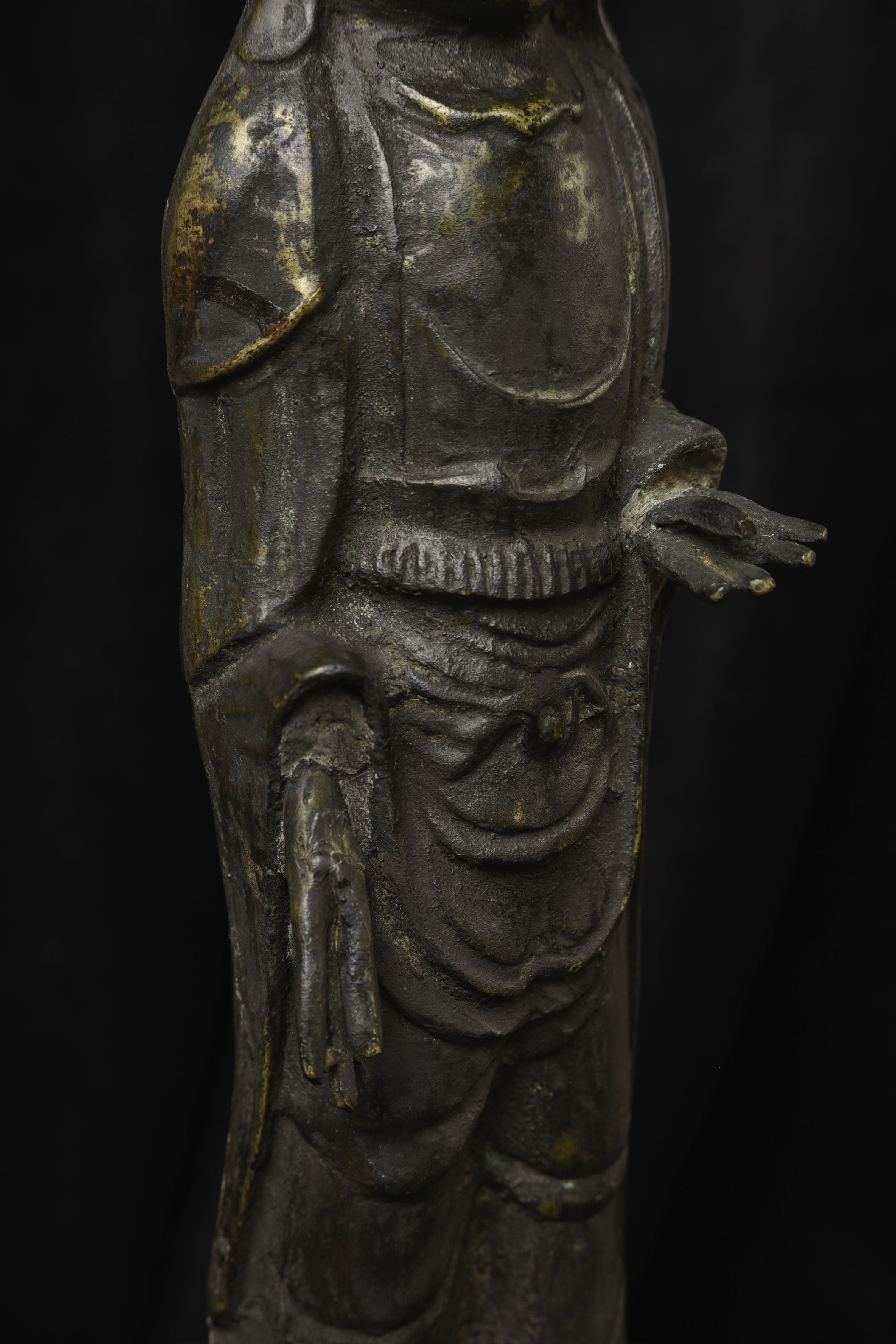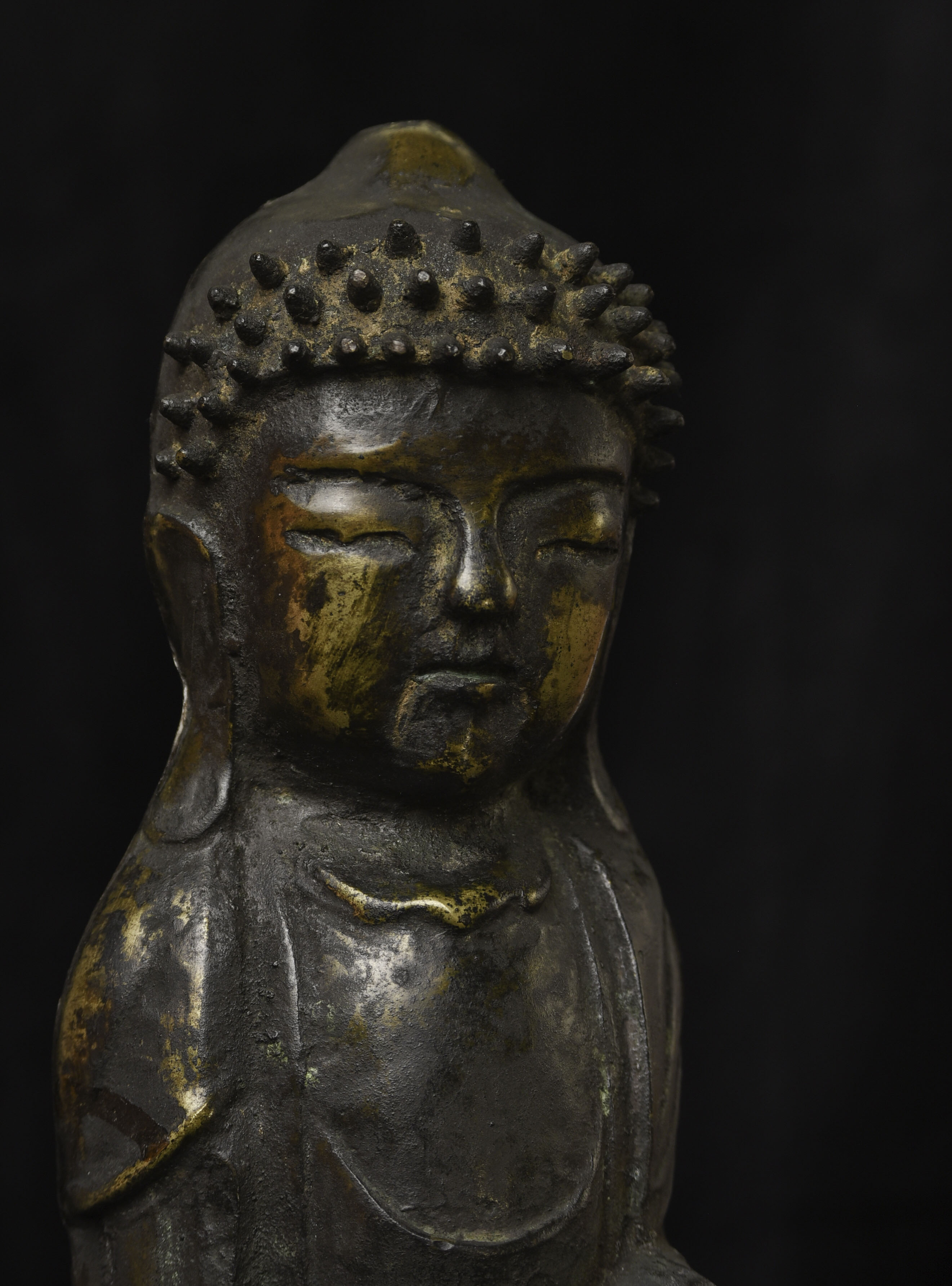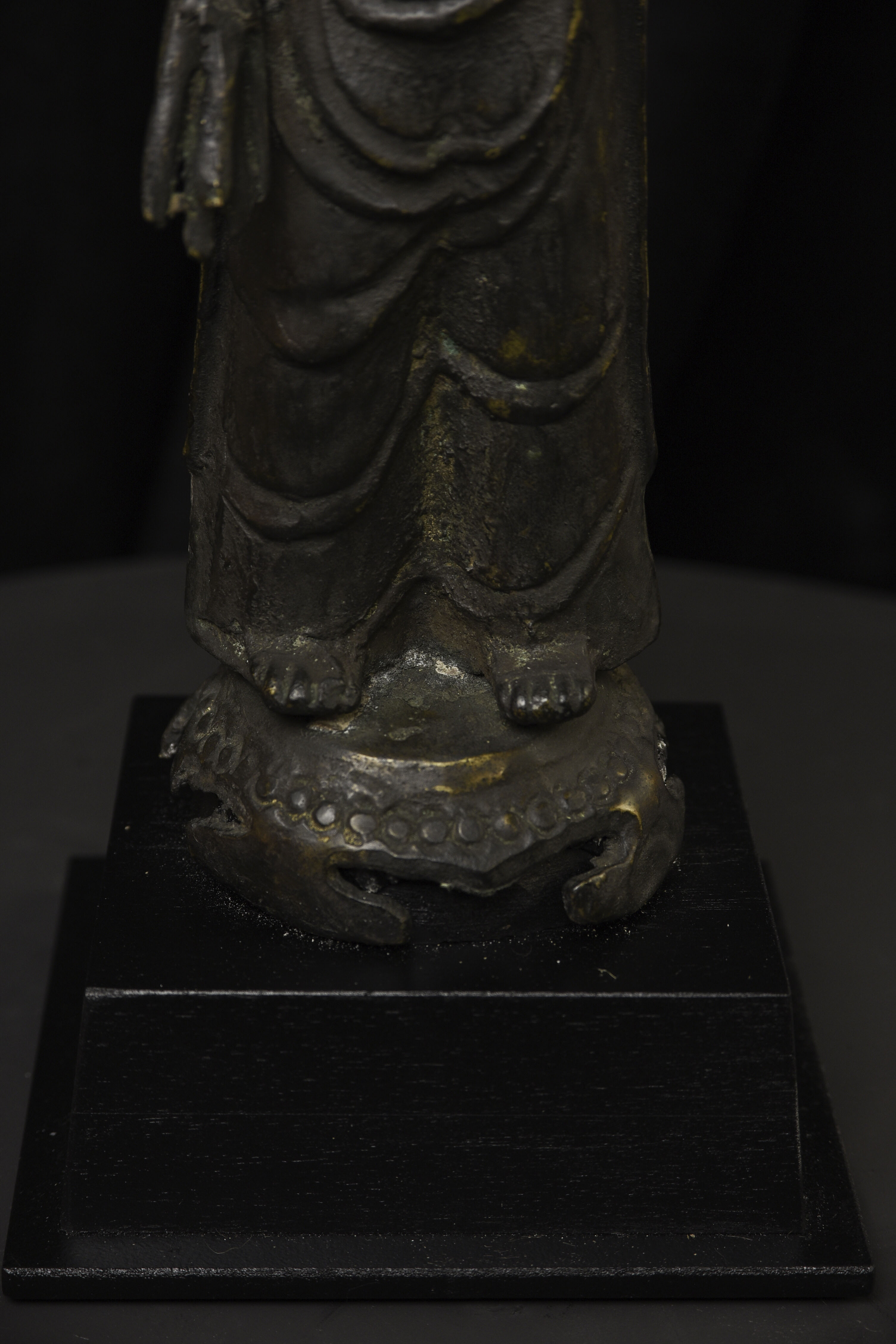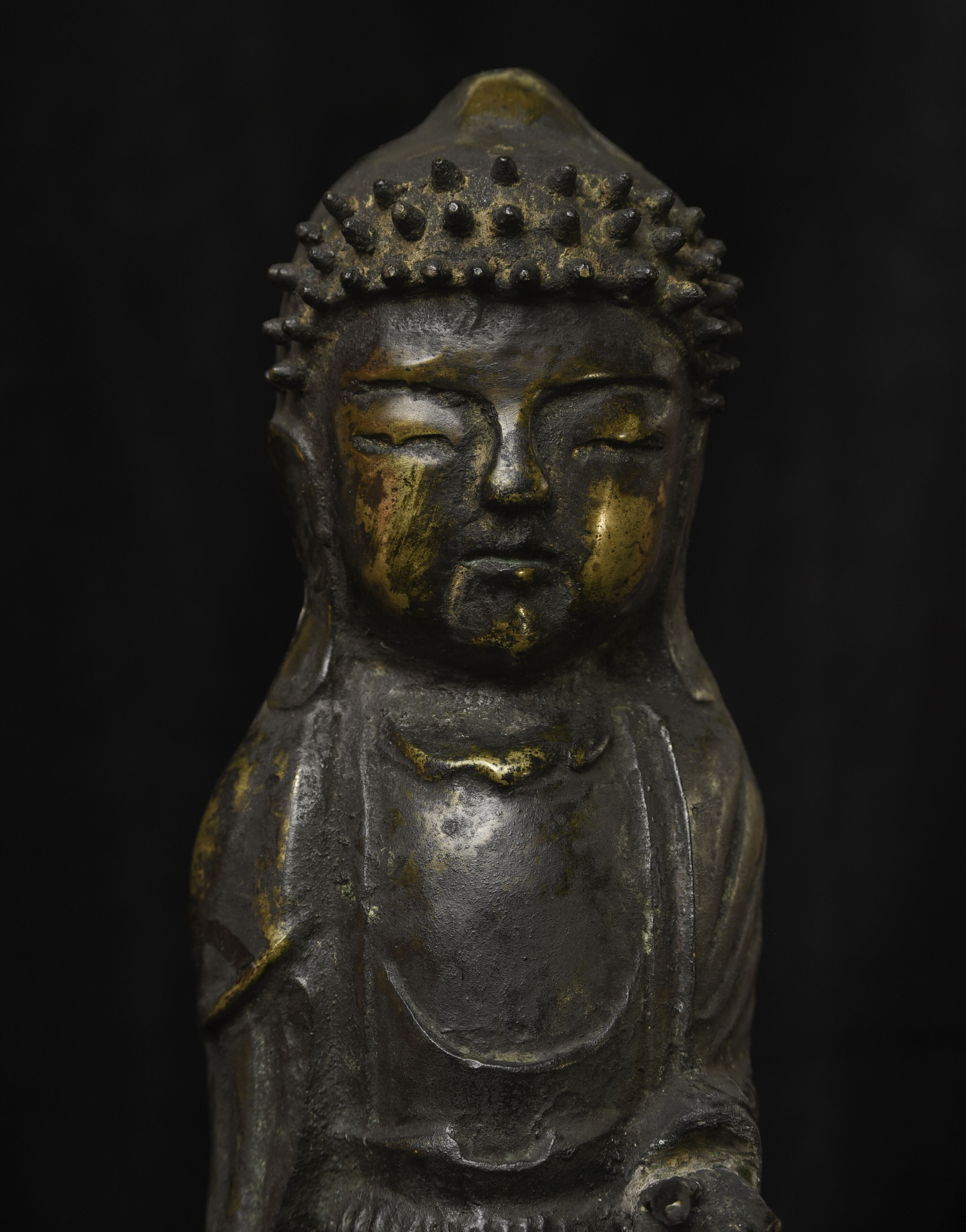 This is a very distinctive 13-15th-century standing bronze Korean Buddha. As you can see in the photos, there is a very closely related companion piece, which I am selling on my website as well. My strong preference is that I sell them together, but based on past experience I am offering them separately so that people have the option of considering them apart. I've never seen a pair like this, and I doubt that very few search closely related pairs exist in the world, especially in such complete condition with their original hands and bases. They are cast in a delightful provincial Style, which at first is deceptively simple and crude. The reality is that the sculptor has managed to create very successful spiritual statues that convey powerful imagery- as powerful as many of the most refined images. just look into the face of this Buddha and its companion. When I first saw this very distinctive standing Buddha and its counterpart, I immediately thought of Buddha Number 9020 on my website (thebuddhagallery.com). If you look at the photos below, you will see one of them that has 9020 alongside this one and its companion piece. As you can see they have a tremendous amount in common, from their oversized heads to the distinctive look and shape of their faces, to the way their robes drape to the way their bases are attached, to the way their backs are open, etc etc. You can see approximately what the backs would look like by looking at the back of 9020, though that statute was made of iron and is of a very different patina.14"H x 3.5"W not including the new custom base.