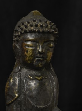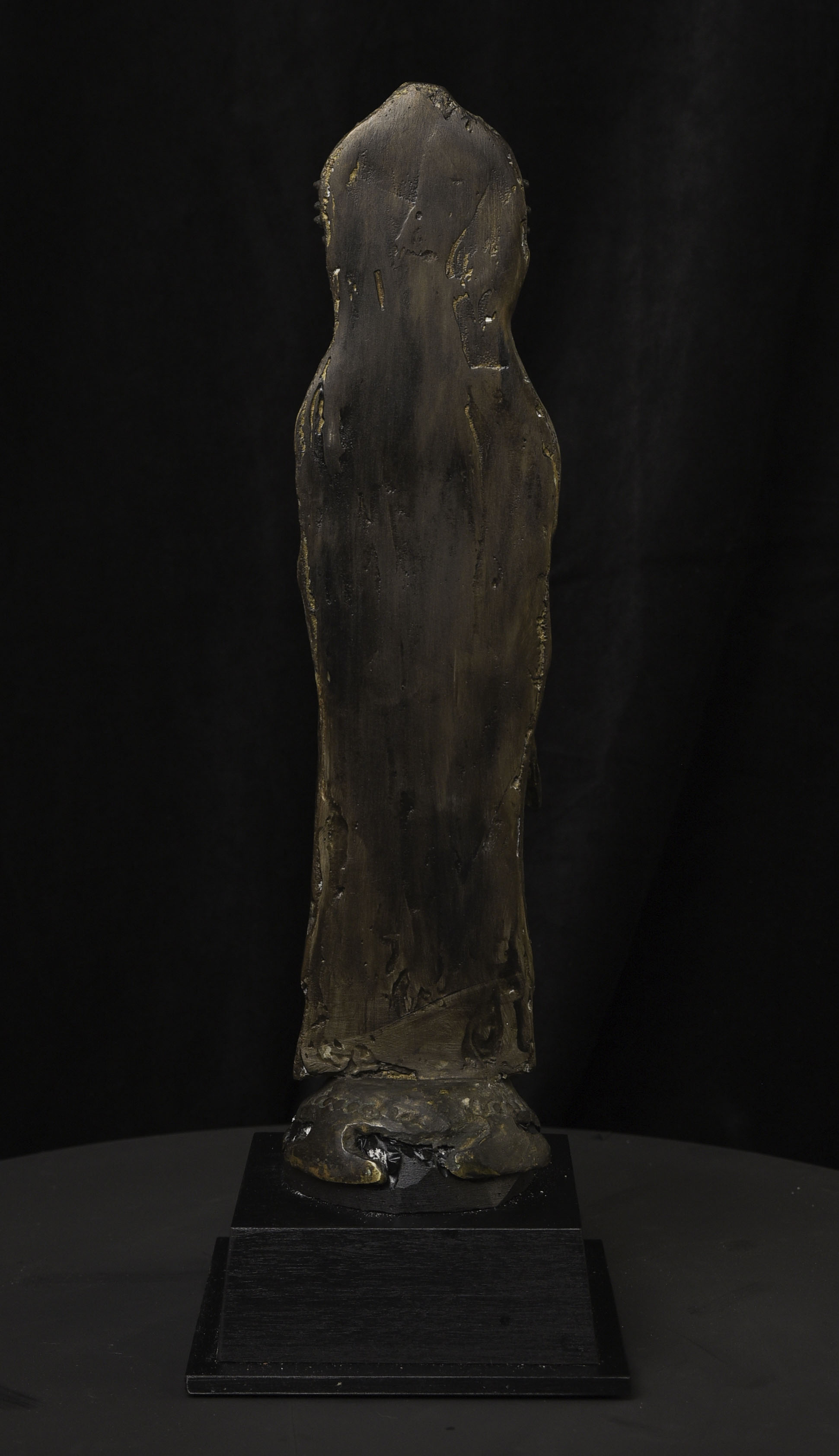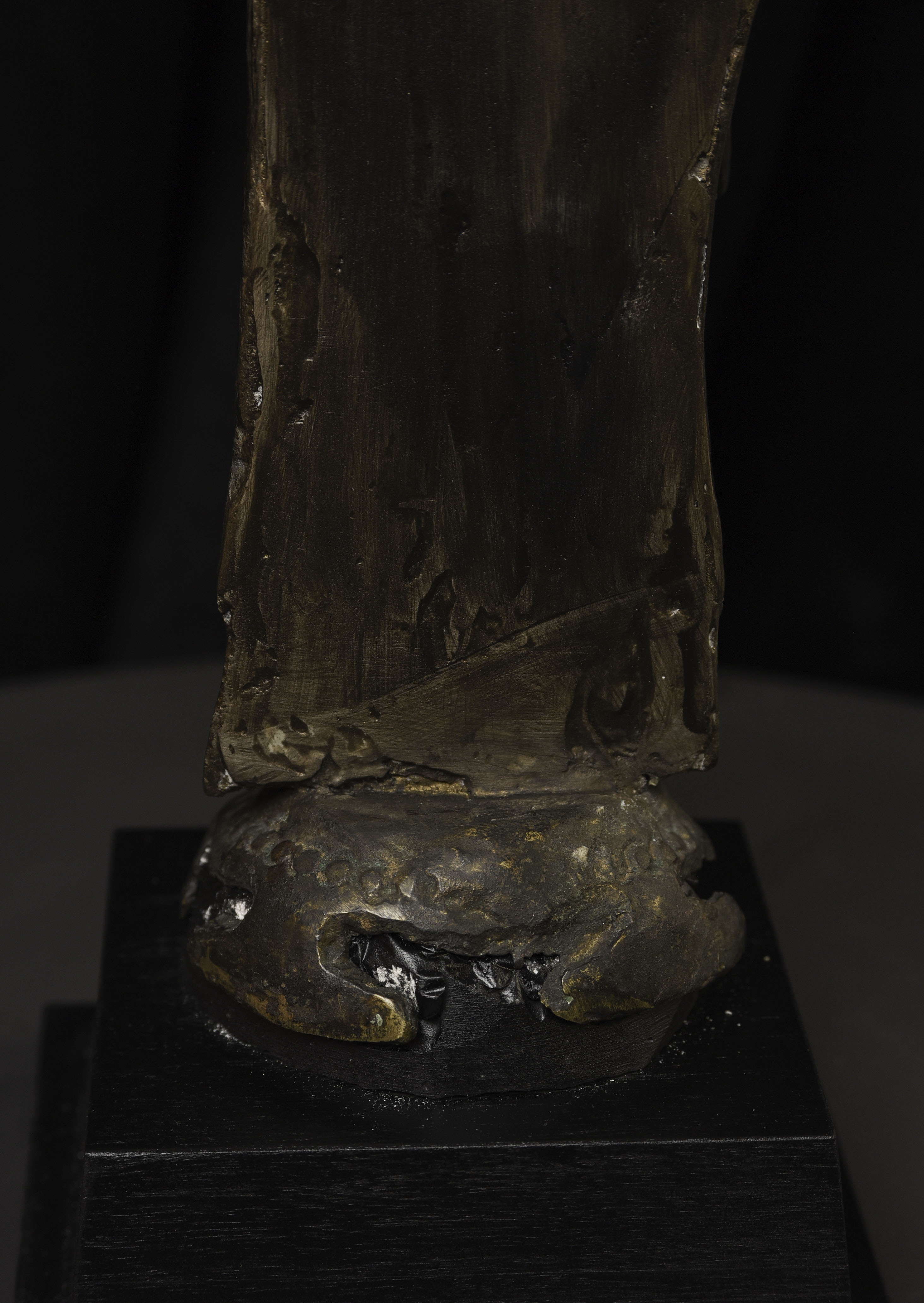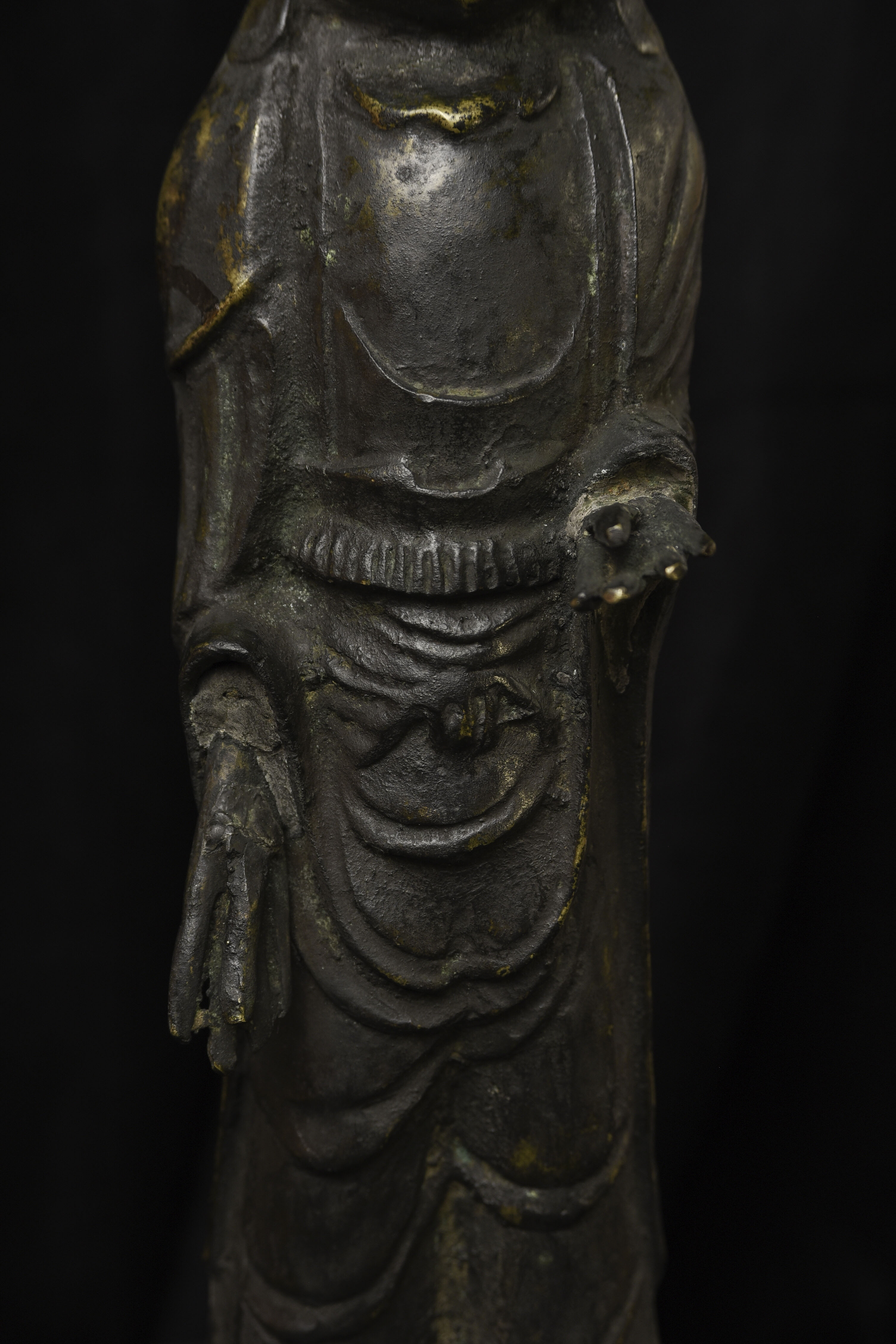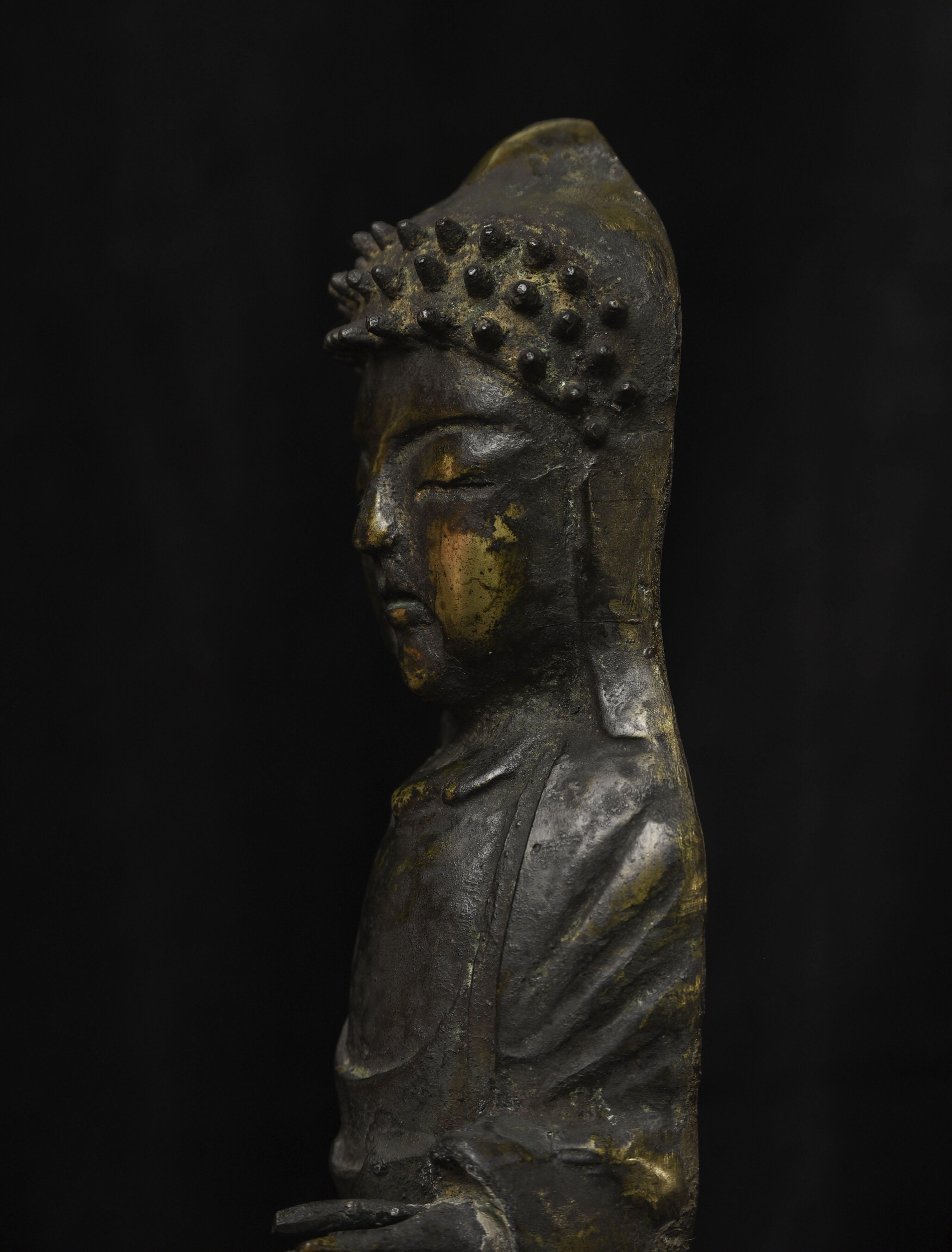 This is a very distinctive 13-15th-century standing bronze Korean Buddha. As you can see in the photos, there is a very closely related companion piece, which I am selling on my website as well. My strong preference is that I sell them together, but based on past experience I am offering them separately so that people have the option of considering them apart. I've never seen a pair like this, and I doubt that very few search closely related pairs exist in the world, especially in such complete condition with their original hands and bases. They are cast in a delightful provincial Style, which at first is deceptively simple and crude. The reality is that the sculptor has managed to create very successful spiritual statues that convey powerful imagery- as powerful as many of the most refined images. just look into the face of this Buddha and its companion. When I first saw this very distinctive standing Buddha and its counterpart, I immediately thought of Buddha Number 9020 on my website (thebuddhagallery.com). If you look at the photos below, you will see one of them that has 9020 alongside this one and its companion piece. As you can see they have a tremendous amount in common, from their oversized heads to the distinctive look and shape of their faces, to the way their robes drape to the way their bases are attached, to the way their backs are open, etc etc. You can see approximately what the backs would look like by looking at the back of 9020, though that statute was made of iron and is of a very different patina.14"H x 3.5"W not including the new custom base.