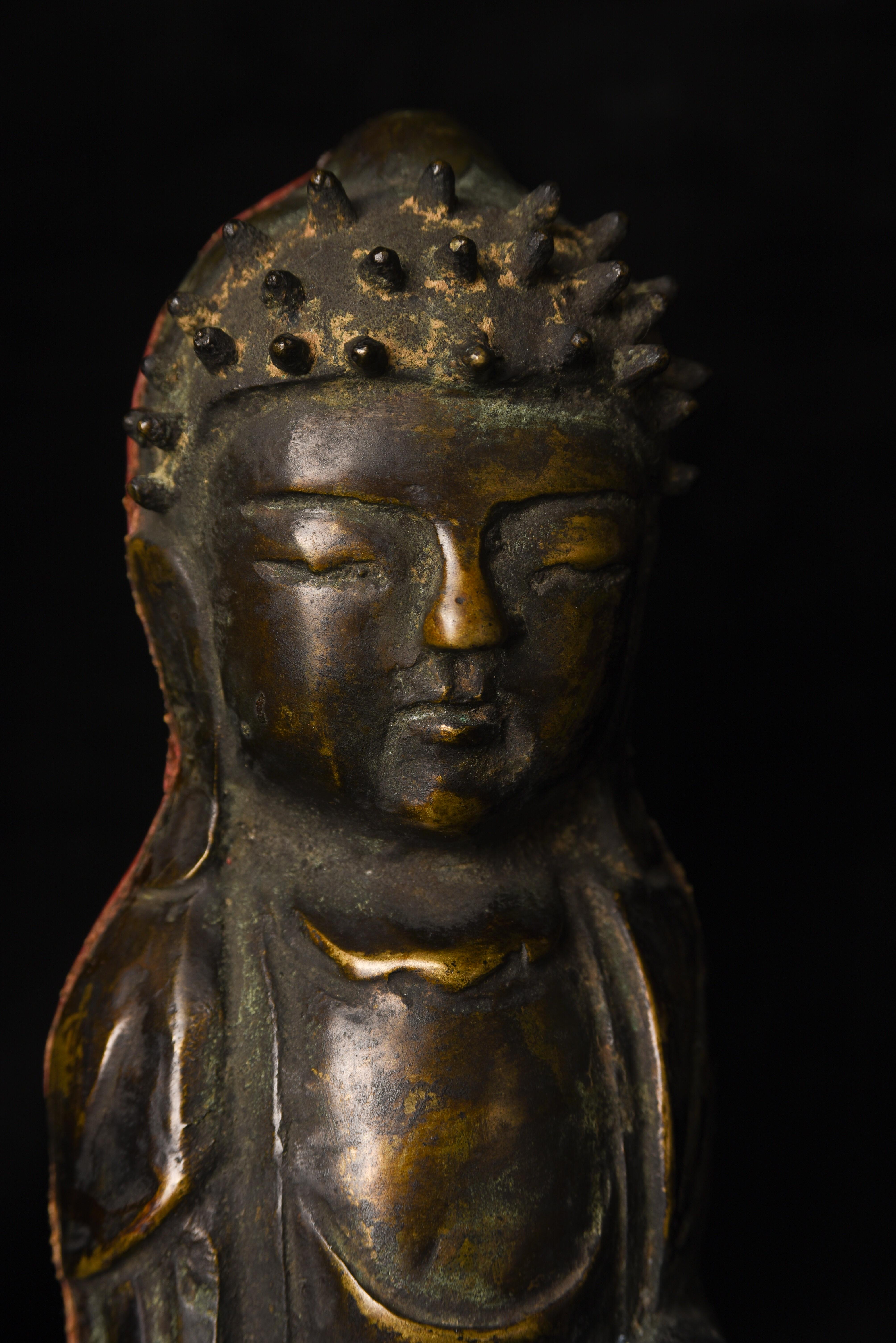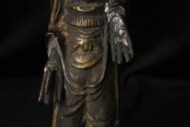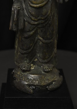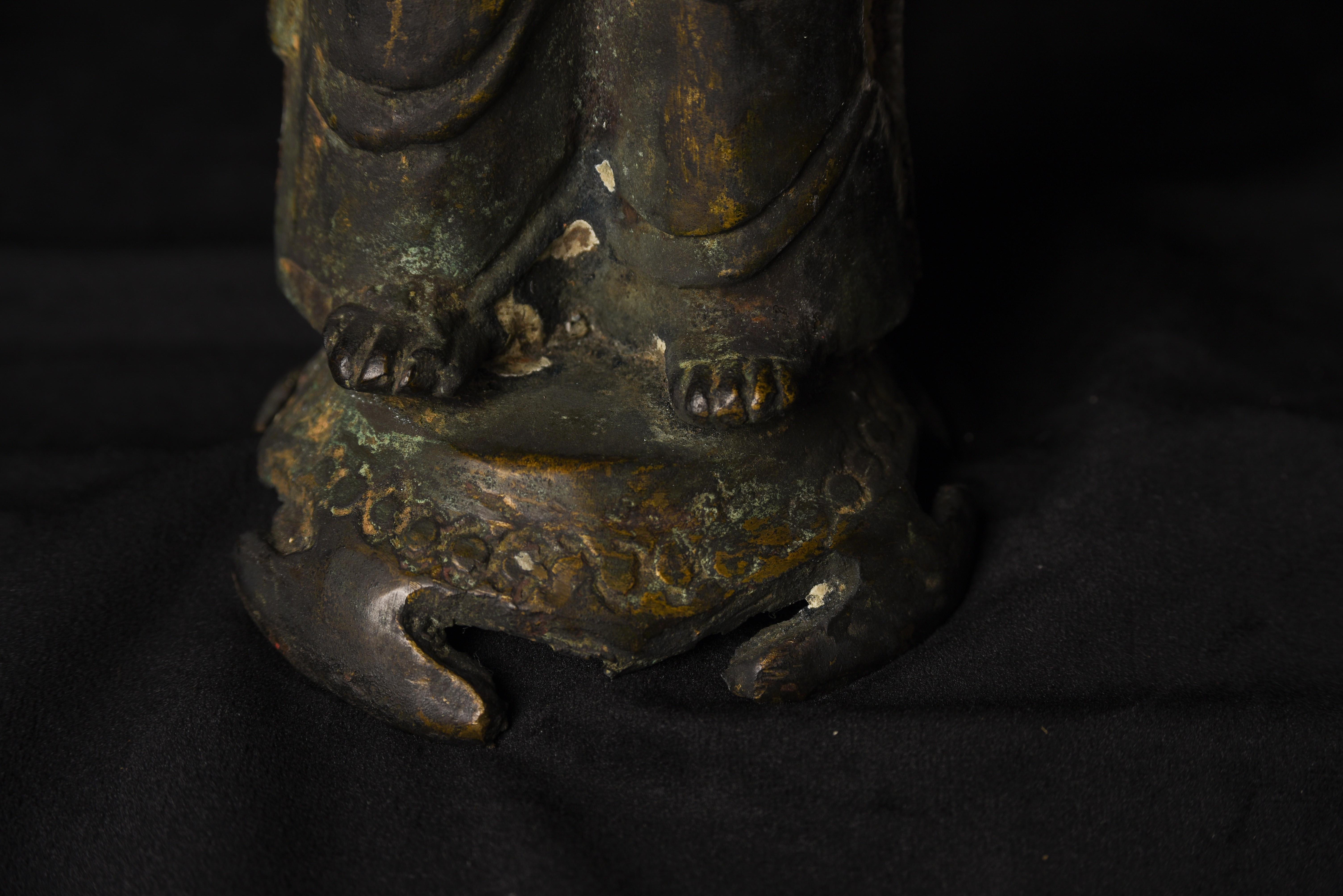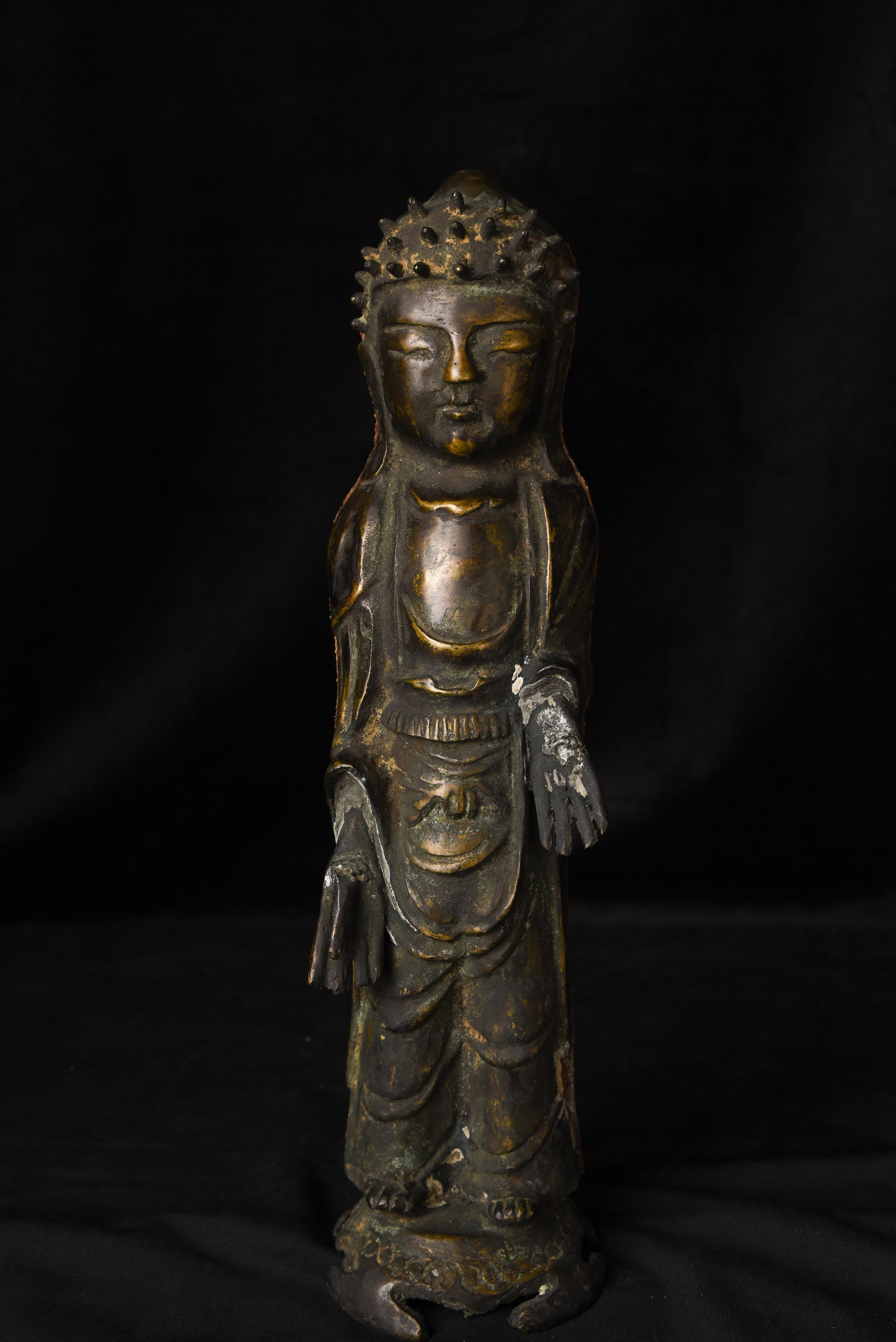 This is a very distinctive 13-15th-century standing bronze Korean Buddha. As you can see in the photos, there is a very closely related companion piece, which I am selling on my website as well. My strong preference is that I sell them together, but based on past experience I am offering them separately so that people have the option of considering them apart. I've never seen a pair like this, and I doubt that very few search closely related pairs exist in the world, especially in such complete condition with their original hands and bases. They are cast in a delightful provincial Style, which at first is deceptively simple and crude. The reality is that the sculptor has managed to create very successful spiritual statues that convey powerful imagery- as powerful as many of the most refined images. just look into the face of this Buddha and its companion. When I first saw this very distinctive standing Buddha and its counterpart, I immediately thought of Buddha Number 9020 on my website (thebuddhagallery.com). If you look at the photos below, you will see one of them that has 9020 alongside this one and its companion piece. As you can see they have a tremendous amount in common, from their oversized heads to the distinctive look and shape of their faces, to the way their robes drape to the way their bases are attached, to the way their backs are open, etc etc. You can see approximately what the backs would look like by looking at the back of 9020, though that statute was made of iron and is of a very different patina.14"H x 3.5"W not including the new custom base.