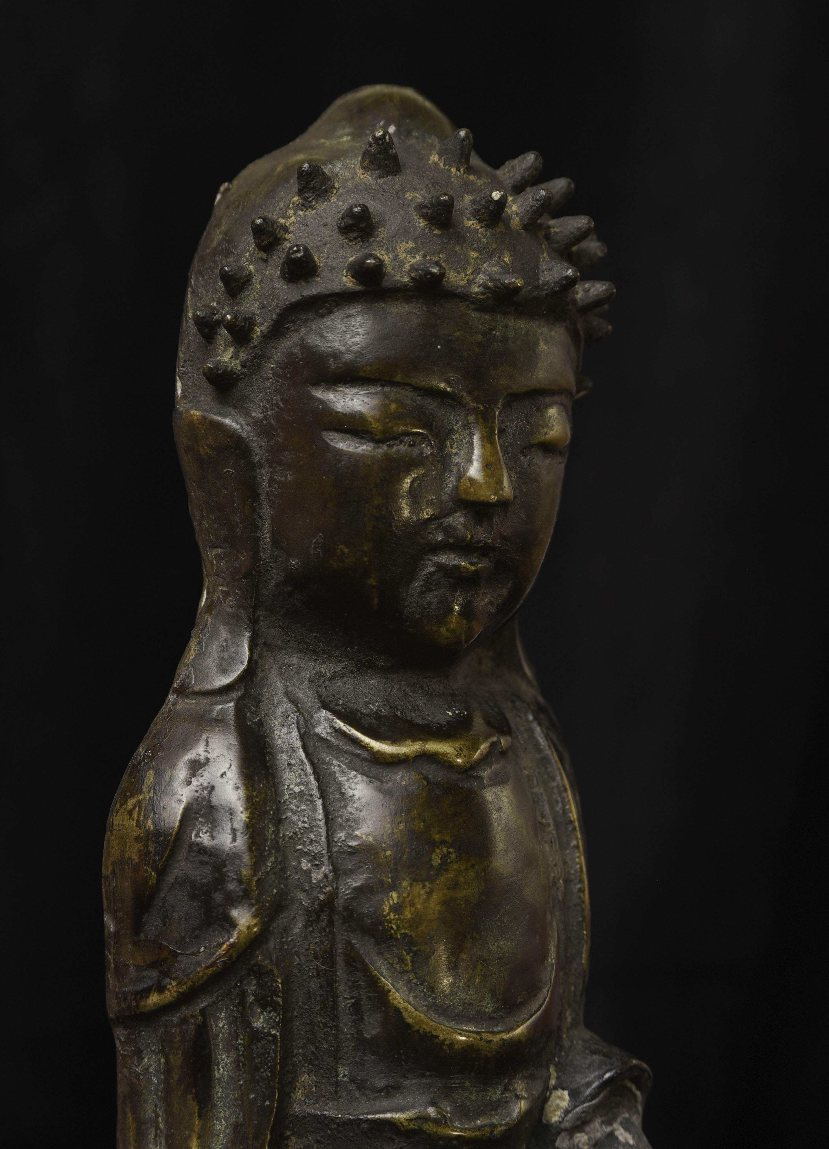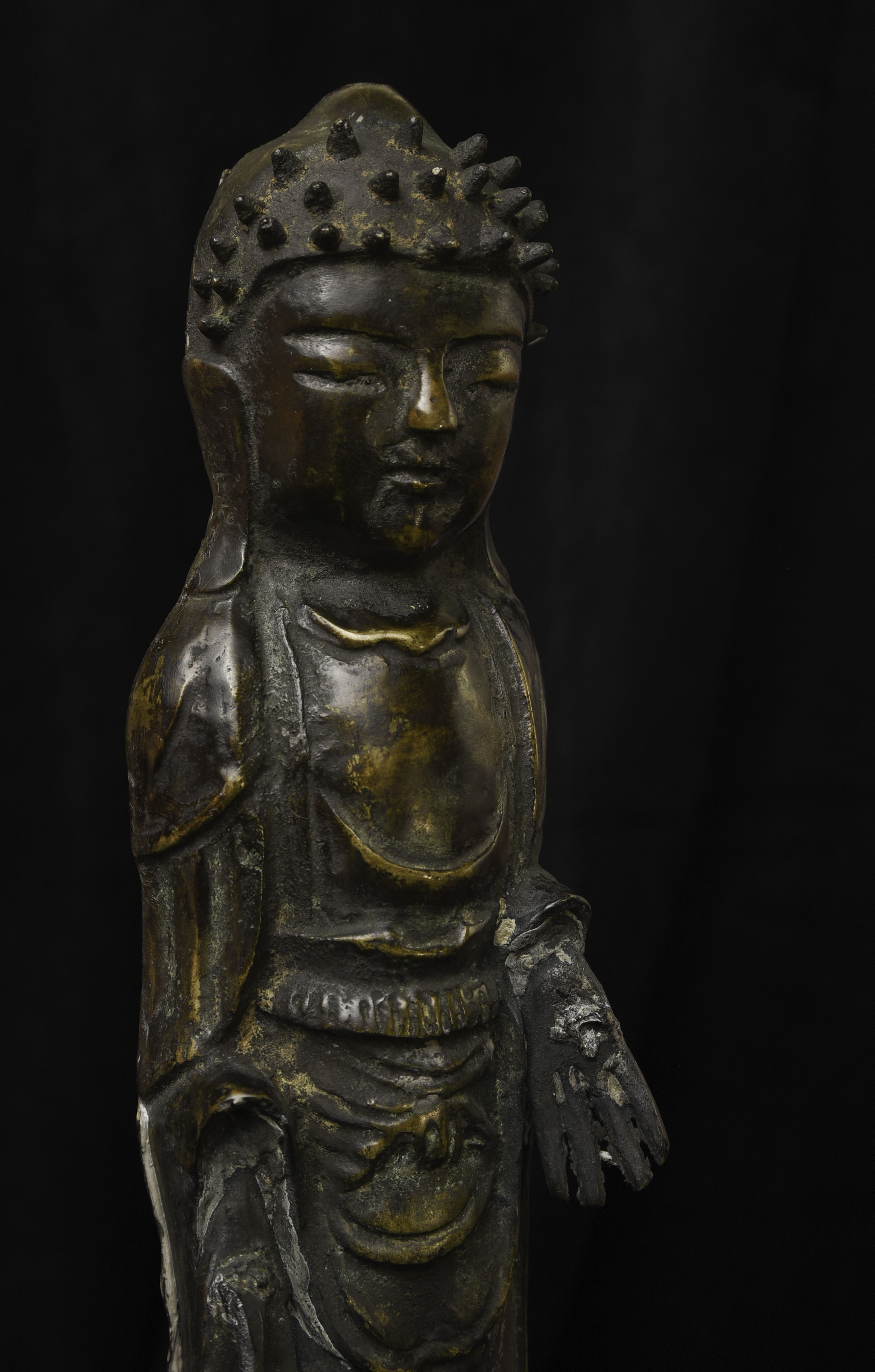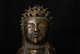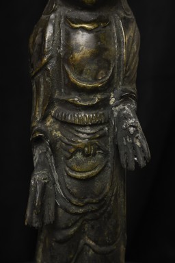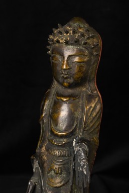 This is a very distinctive 13-15th-century standing bronze Korean Buddha. As you can see in the photos, there is a very closely related companion piece, which I am selling on my website as well. My strong preference is that I sell them together, but based on past experience I am offering them separately so that people have the option of considering them apart. I've never seen a pair like this, and I doubt that very few search closely related pairs exist in the world, especially in such complete condition with their original hands and bases. They are cast in a delightful provincial Style, which at first is deceptively simple and crude. The reality is that the sculptor has managed to create very successful spiritual statues that convey powerful imagery- as powerful as many of the most refined images. just look into the face of this Buddha and its companion. When I first saw this very distinctive standing Buddha and its counterpart, I immediately thought of Buddha Number 9020 on my website (thebuddhagallery.com). If you look at the photos below, you will see one of them that has 9020 alongside this one and its companion piece. As you can see they have a tremendous amount in common, from their oversized heads to the distinctive look and shape of their faces, to the way their robes drape to the way their bases are attached, to the way their backs are open, etc etc. You can see approximately what the backs would look like by looking at the back of 9020, though that statute was made of iron and is of a very different patina.14"H x 3.5"W not including the new custom base.