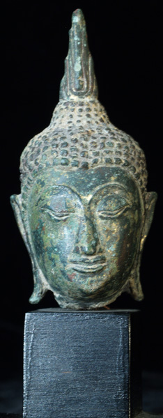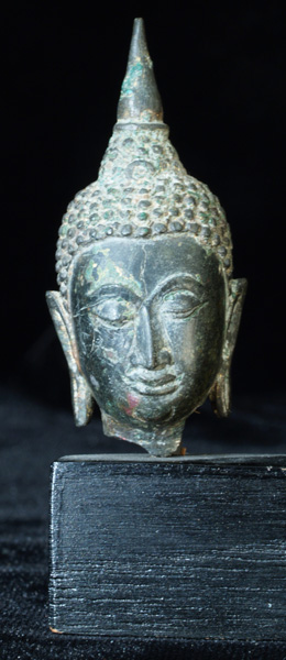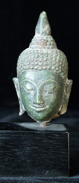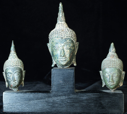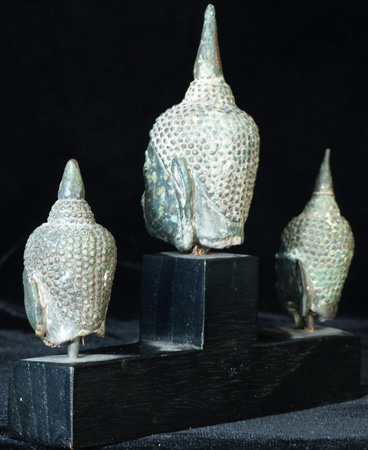 This is a base with 3 high quality, authentic Ayuthaya bronze Buddha heads. All 3 have superb "jade green" patinas, which are highly desirable. The largest head sits 2 and 3/4 inches tall without the base ant 4.5 inches tall with the base. The other 2 heads each sit 2 inches tall without the base and a little under 3 inches with it. The entire piece with the 3 heads is 5 inches long. A lovely grouping which looks better in person than in the photos.