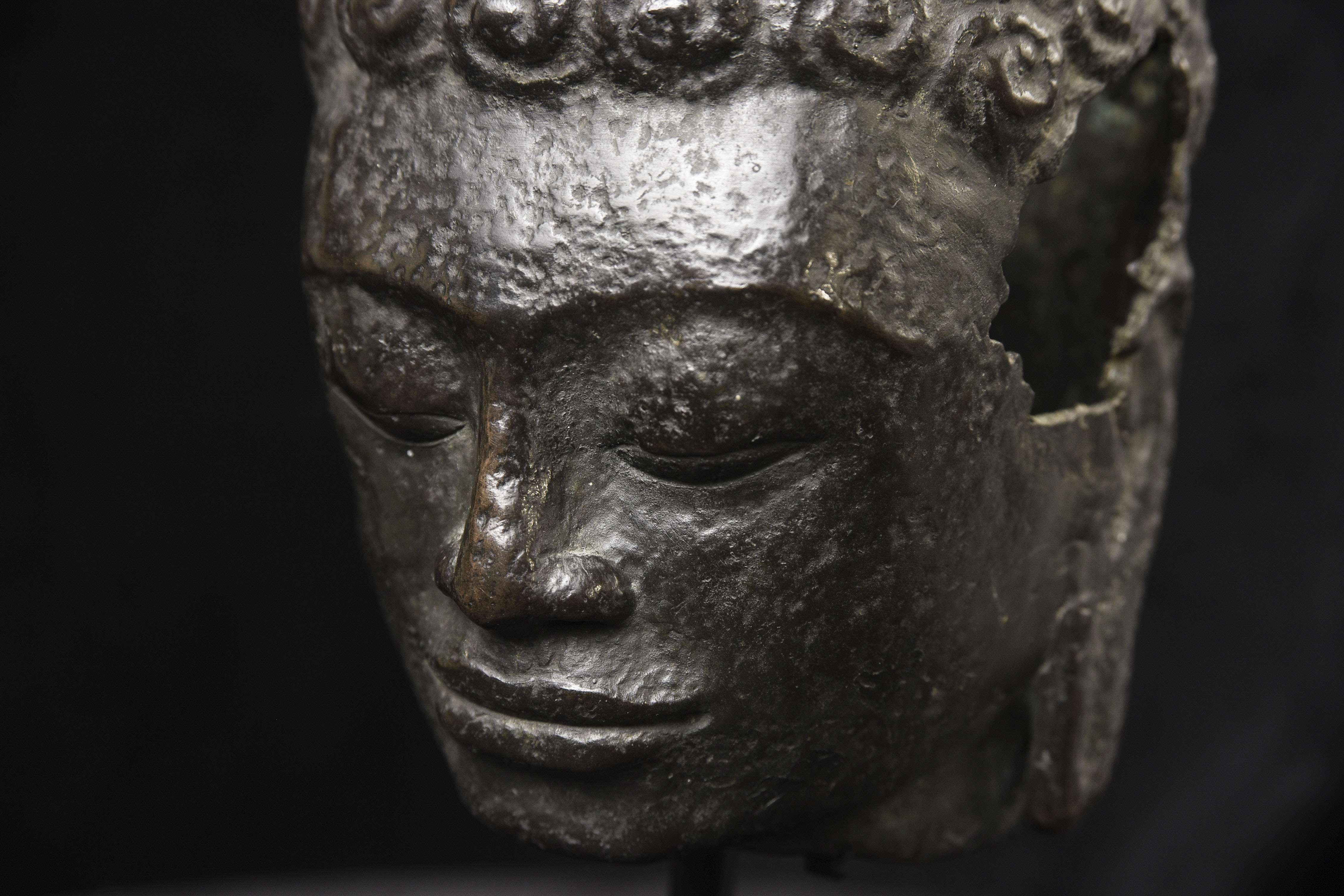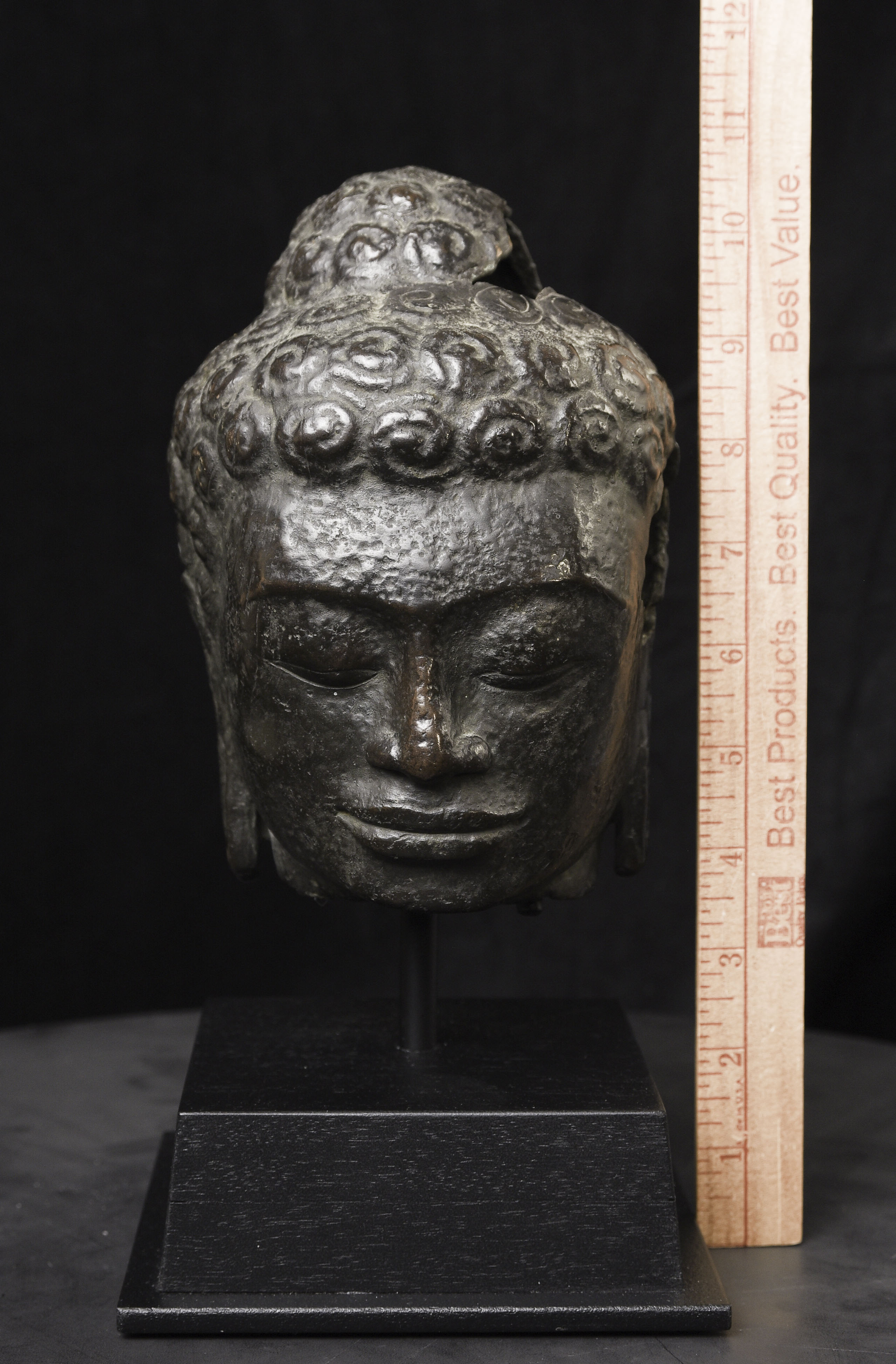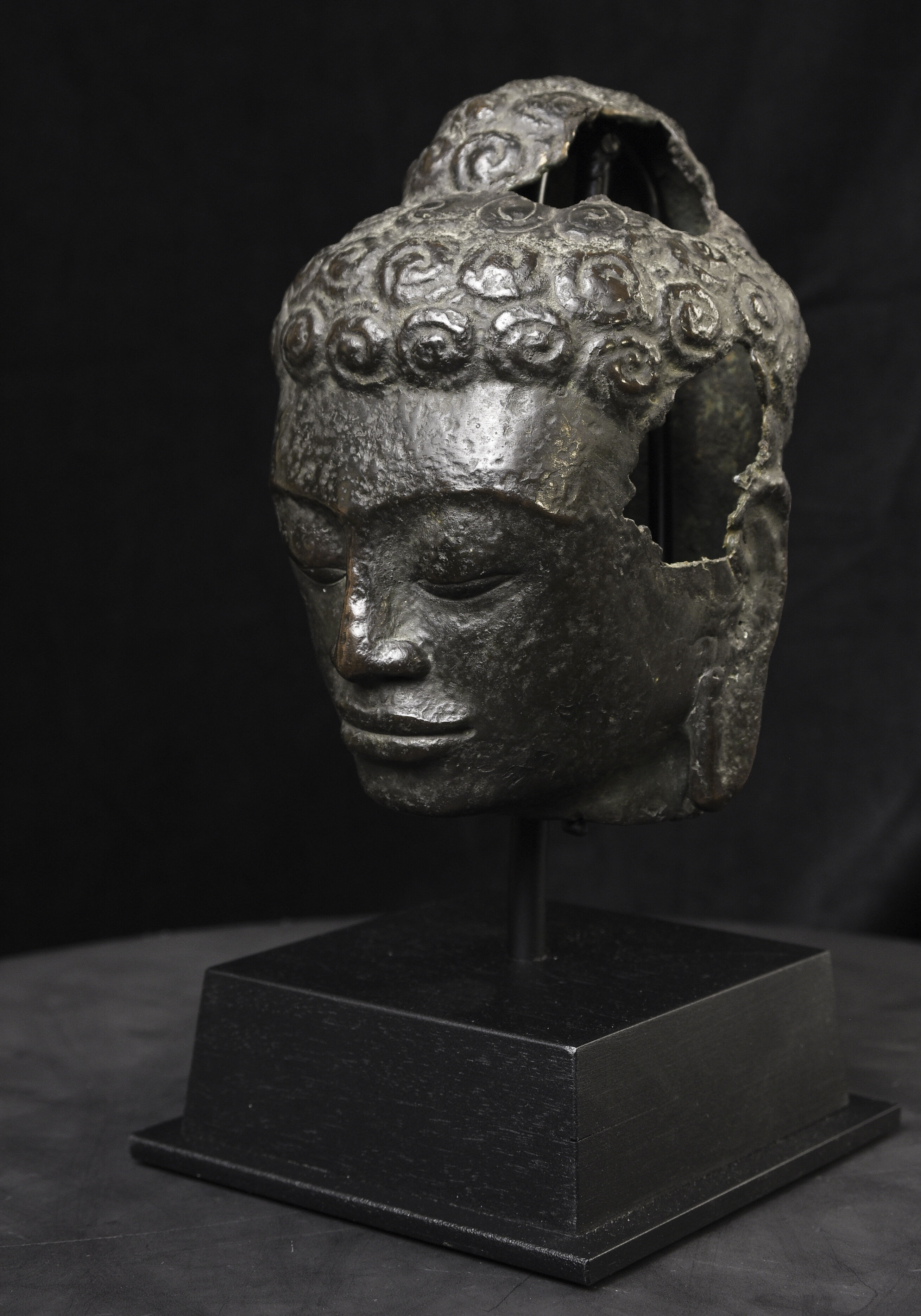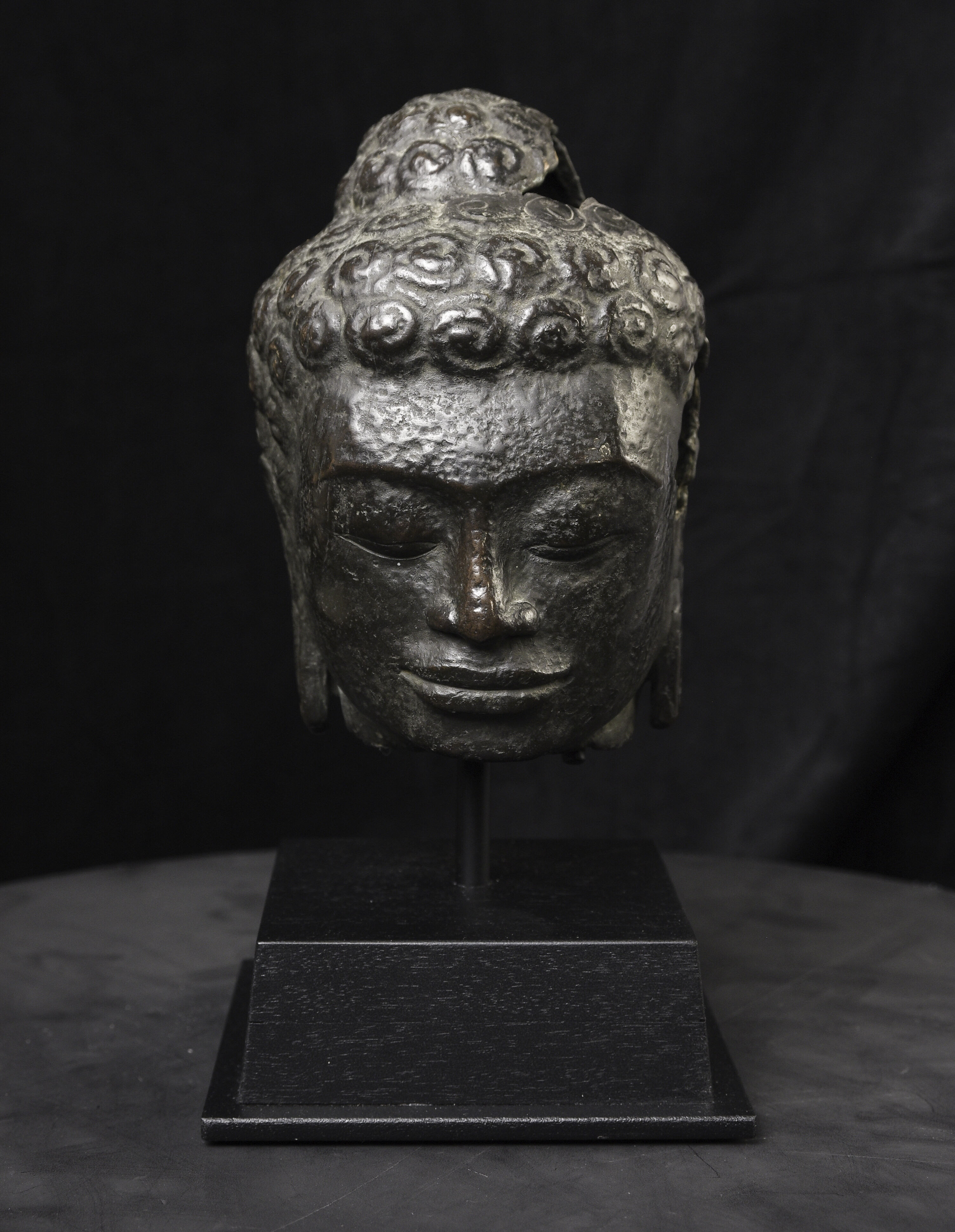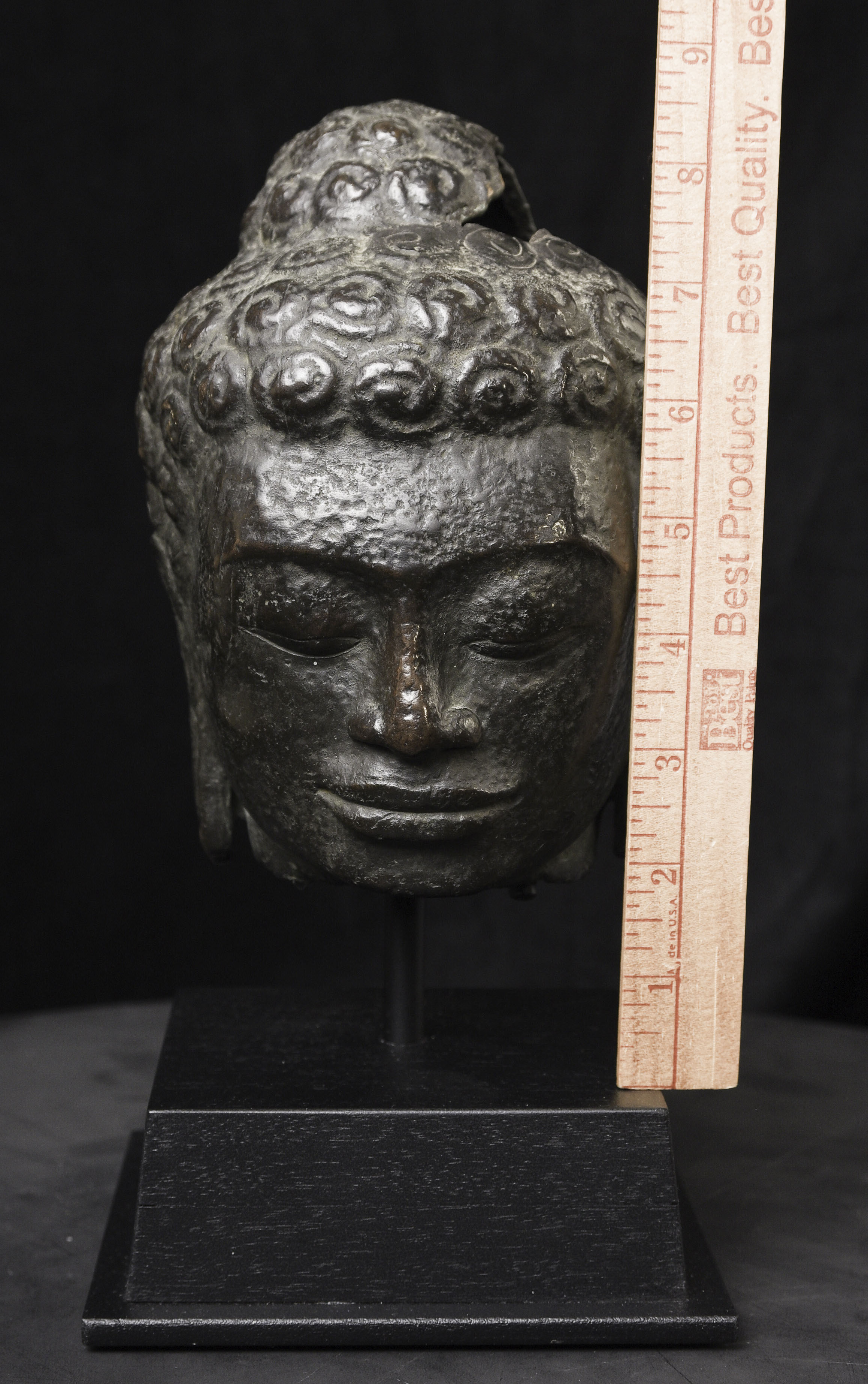Magnificent 11thC Dvarati Bronze Buddha Head. Superb face, casting, sculpting, and finishing. Plus, the patina and wear show 1,000 years of devotion and add tremendously. From a knowledgeable French collector.
