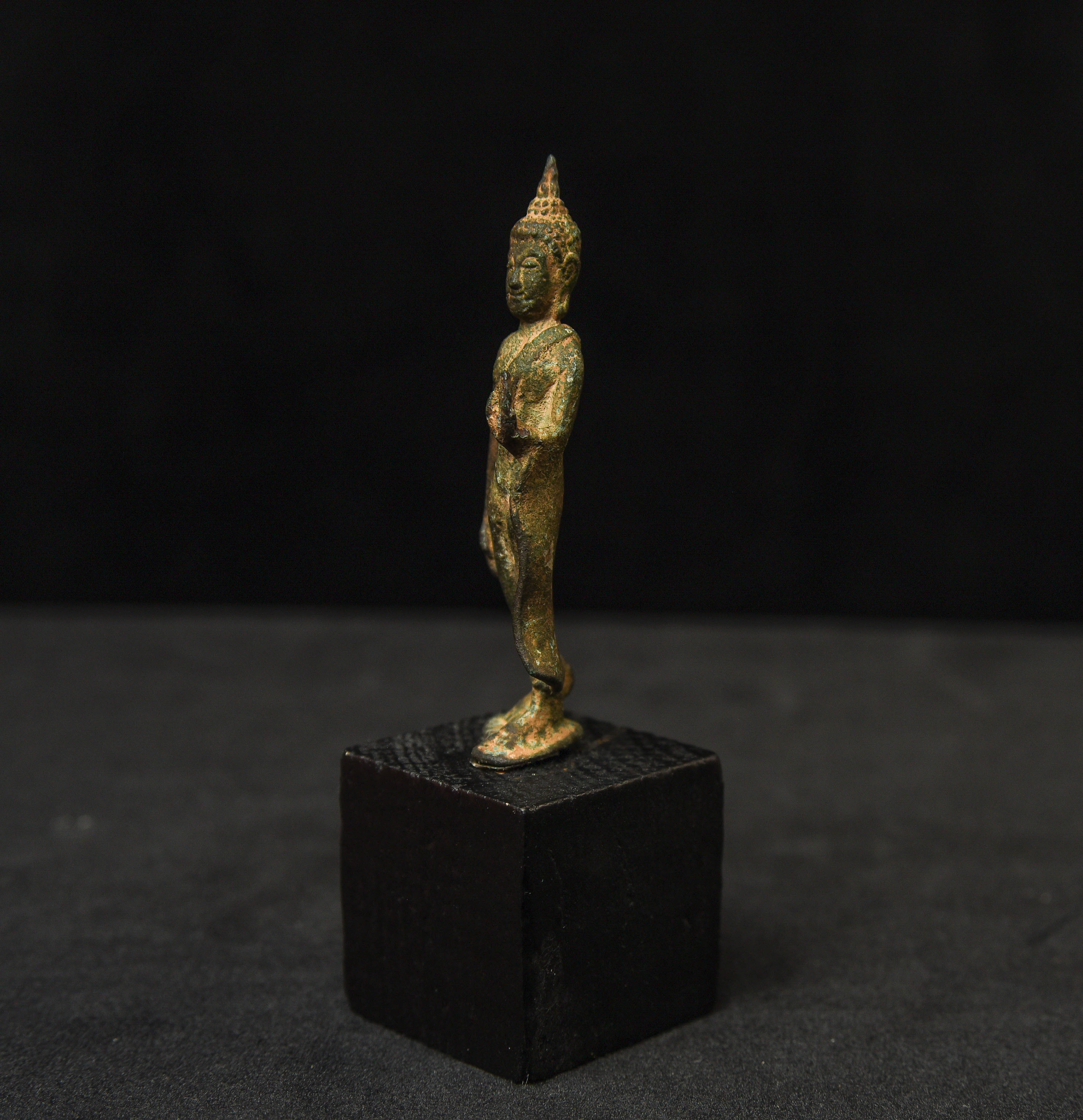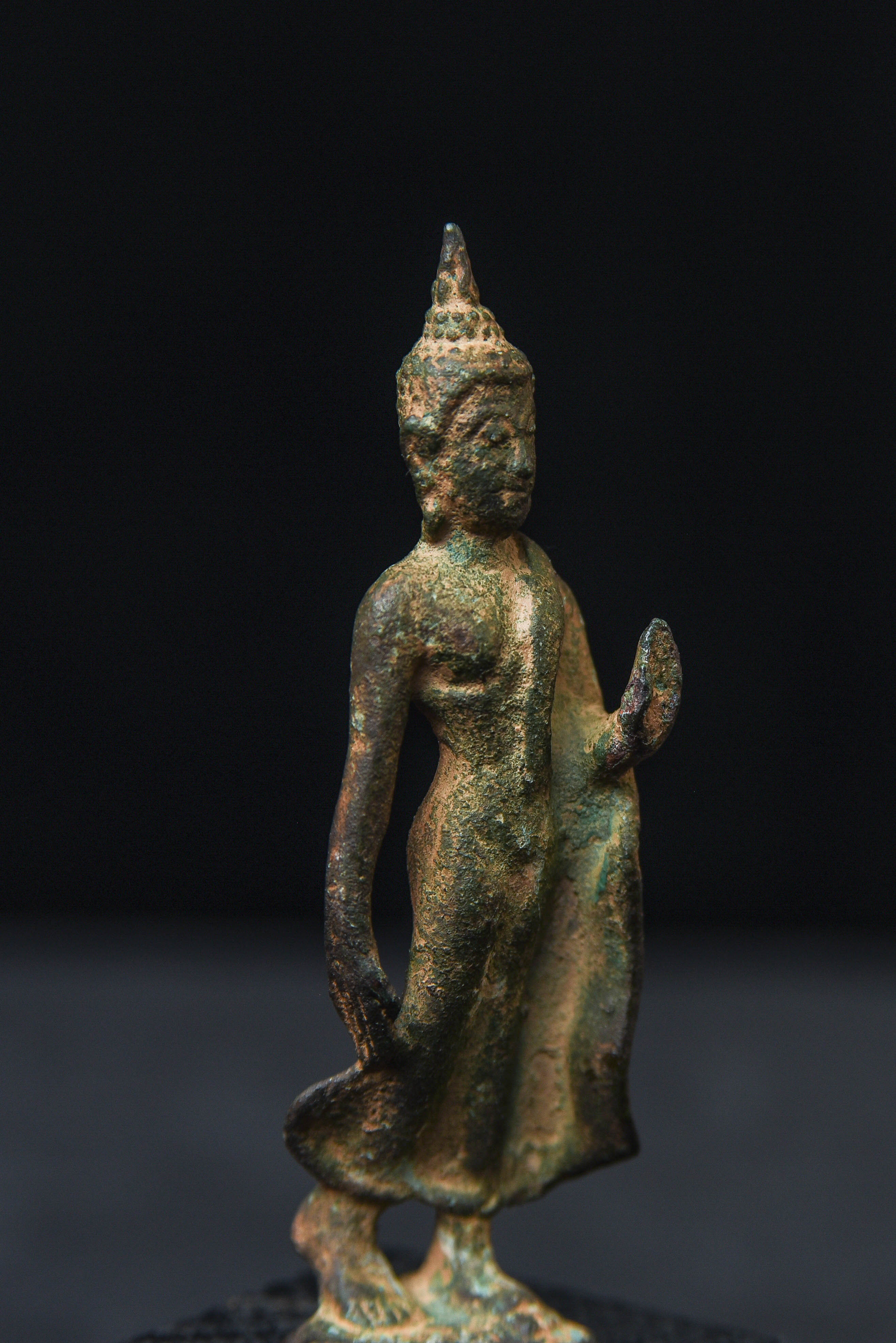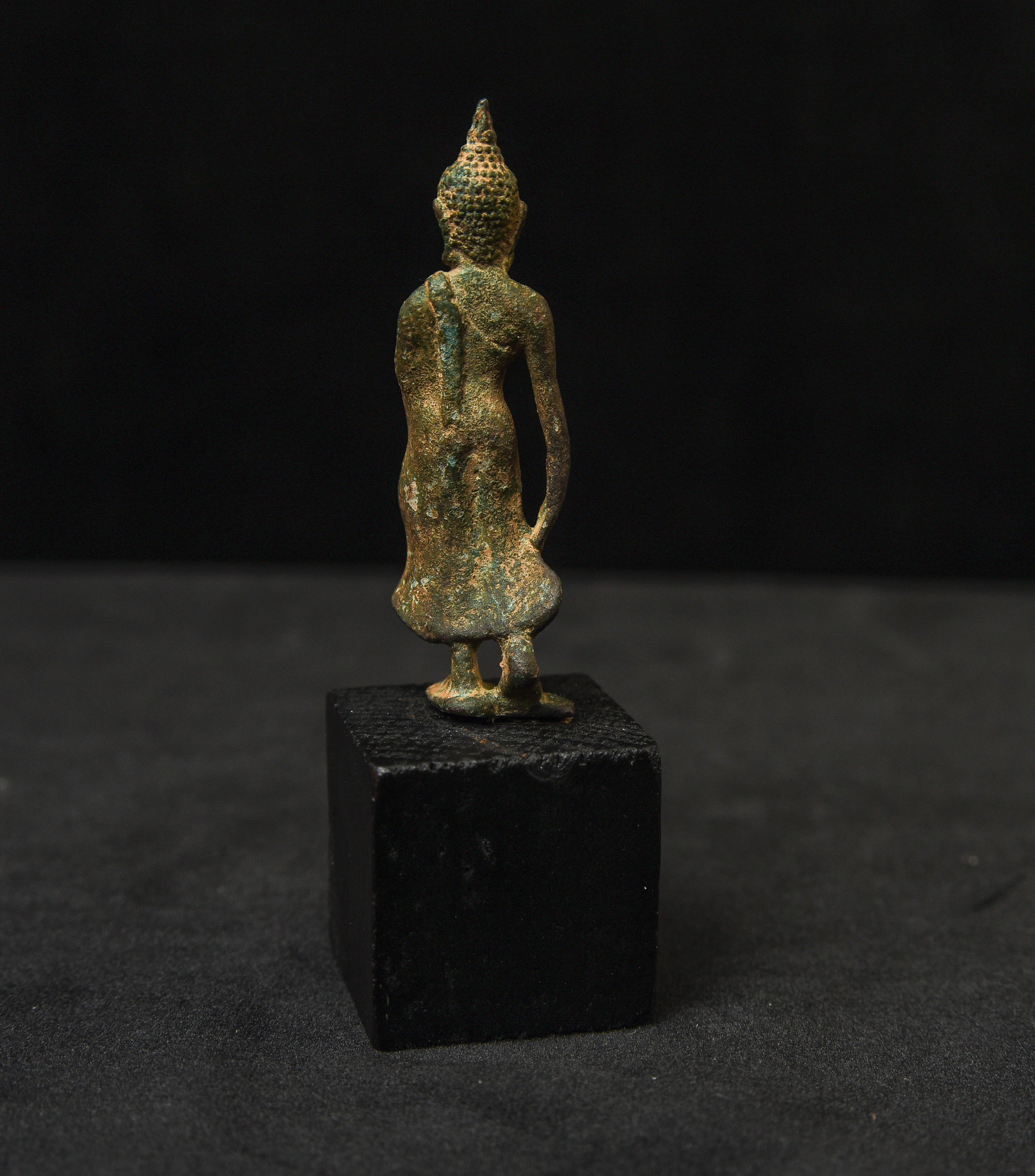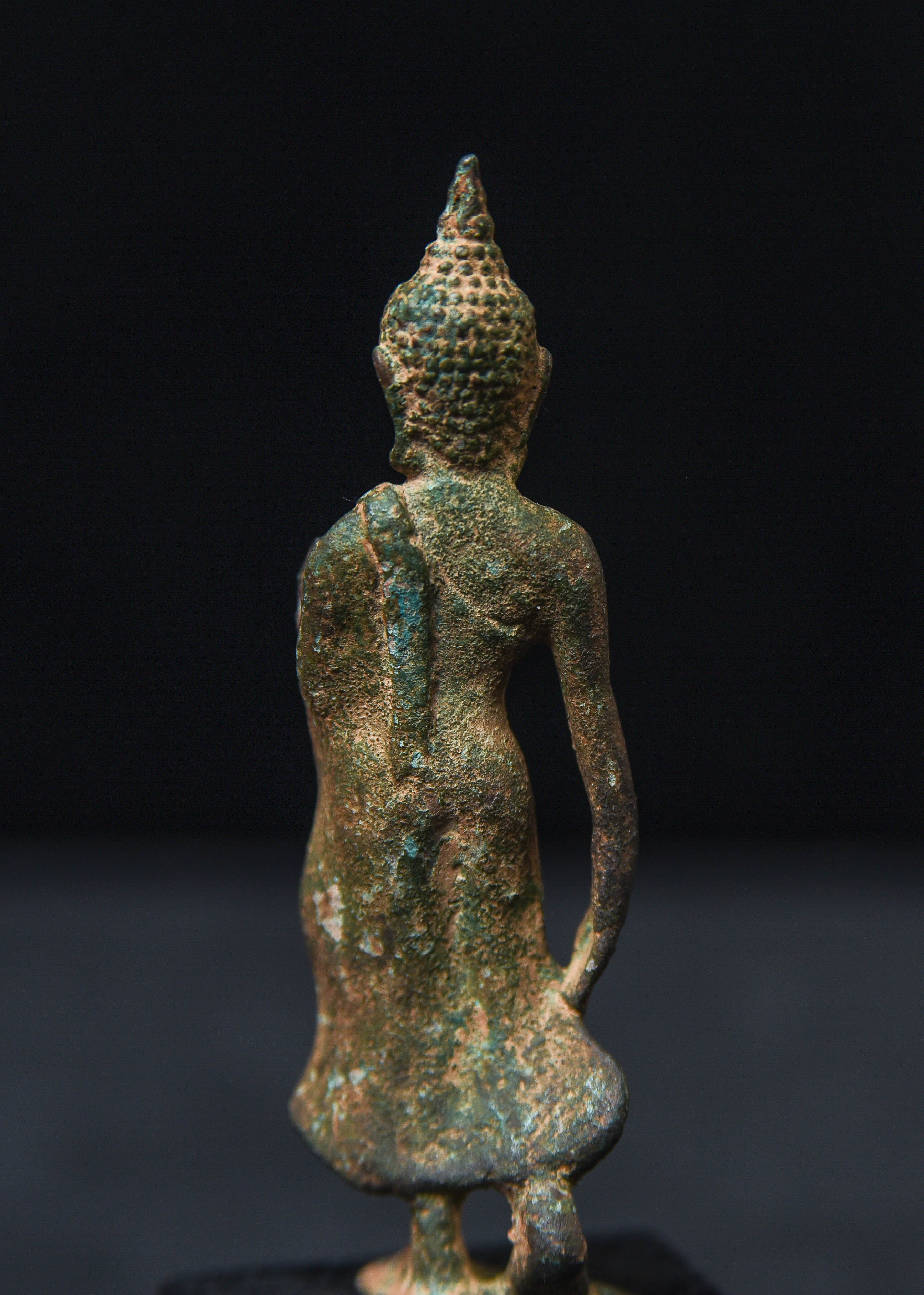 Authentic 15-17thC miniature bronze Sukhothai walking Buddha from Thailand. This is a true period piece, and nota 19th or 20th-century emulation like the vast majority of walking Buddhas that you will ever see. Authentic ones (including miniature examples) are very rare. Domestic Insurance included. International shipping will be $50 including packing, shipping, and insurance.