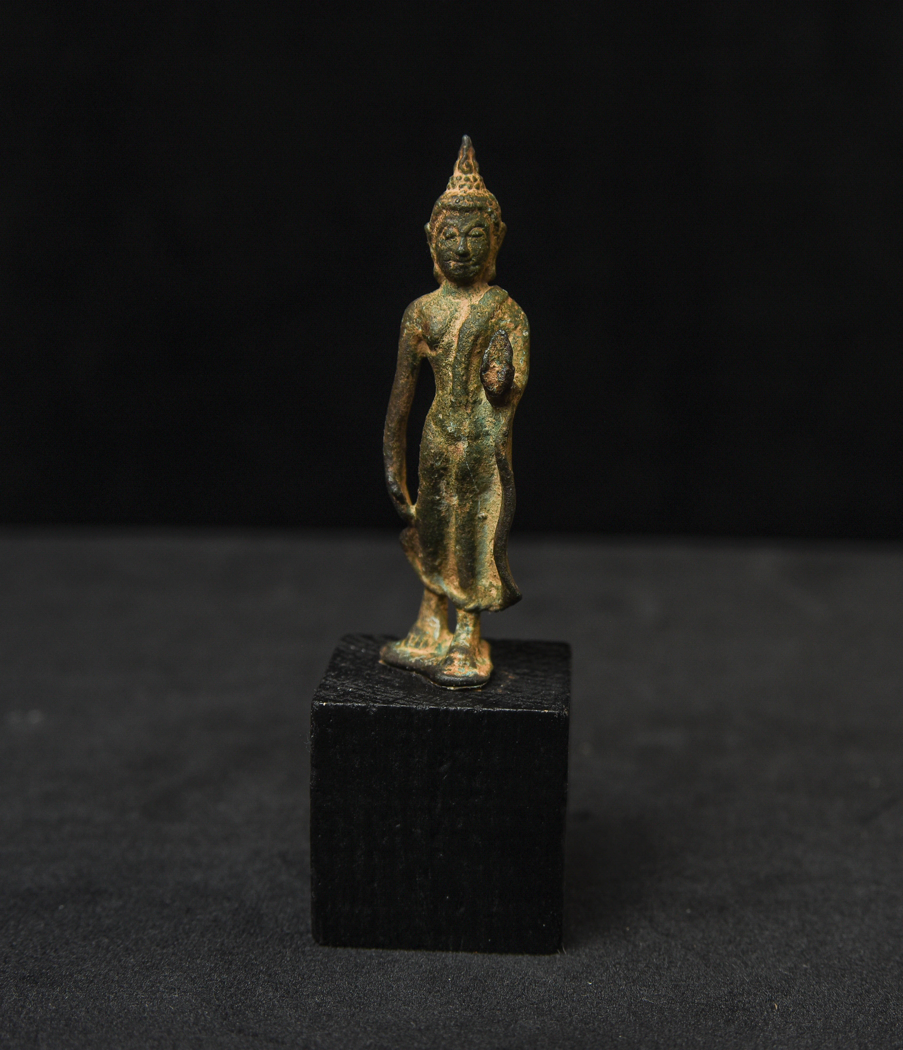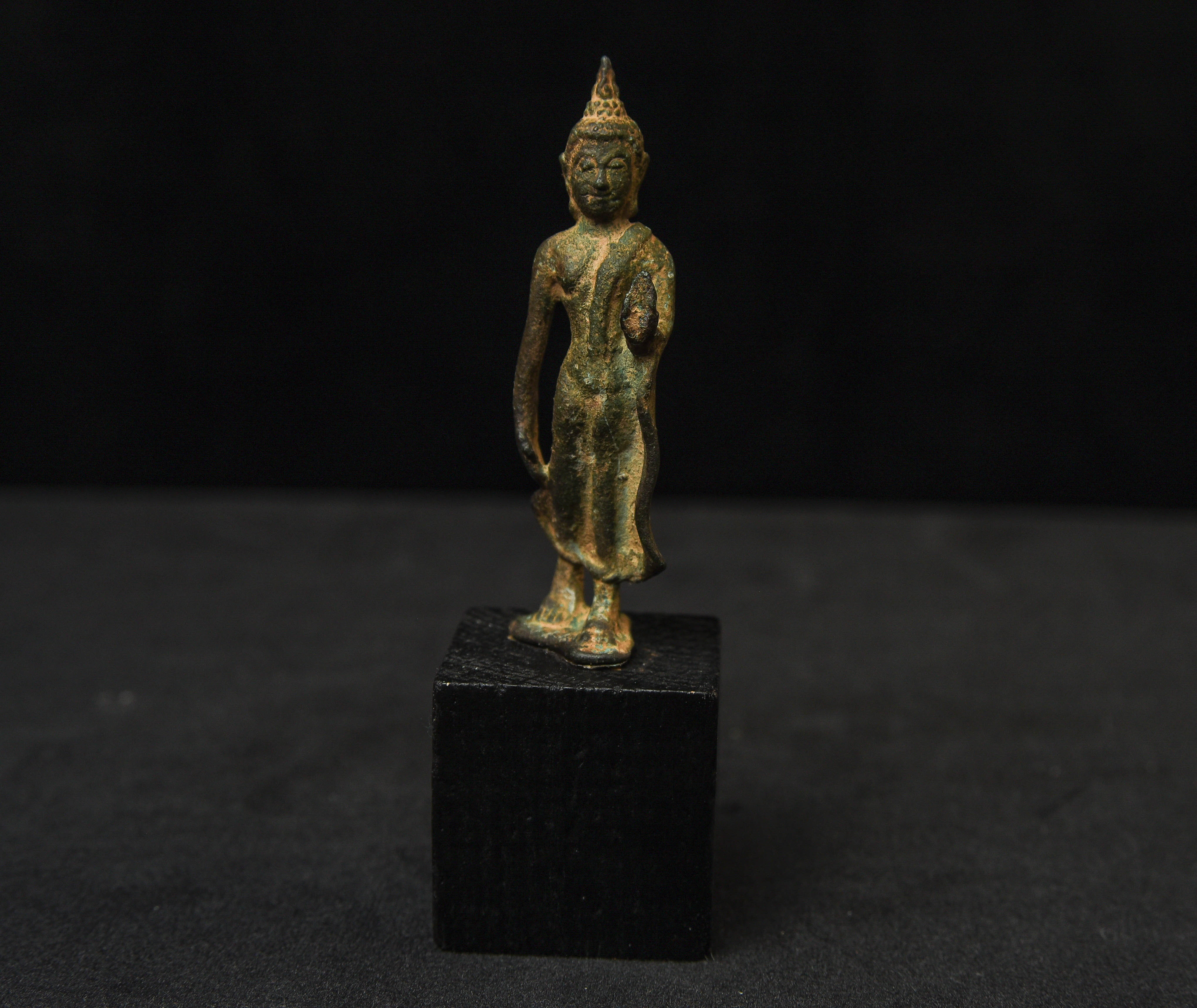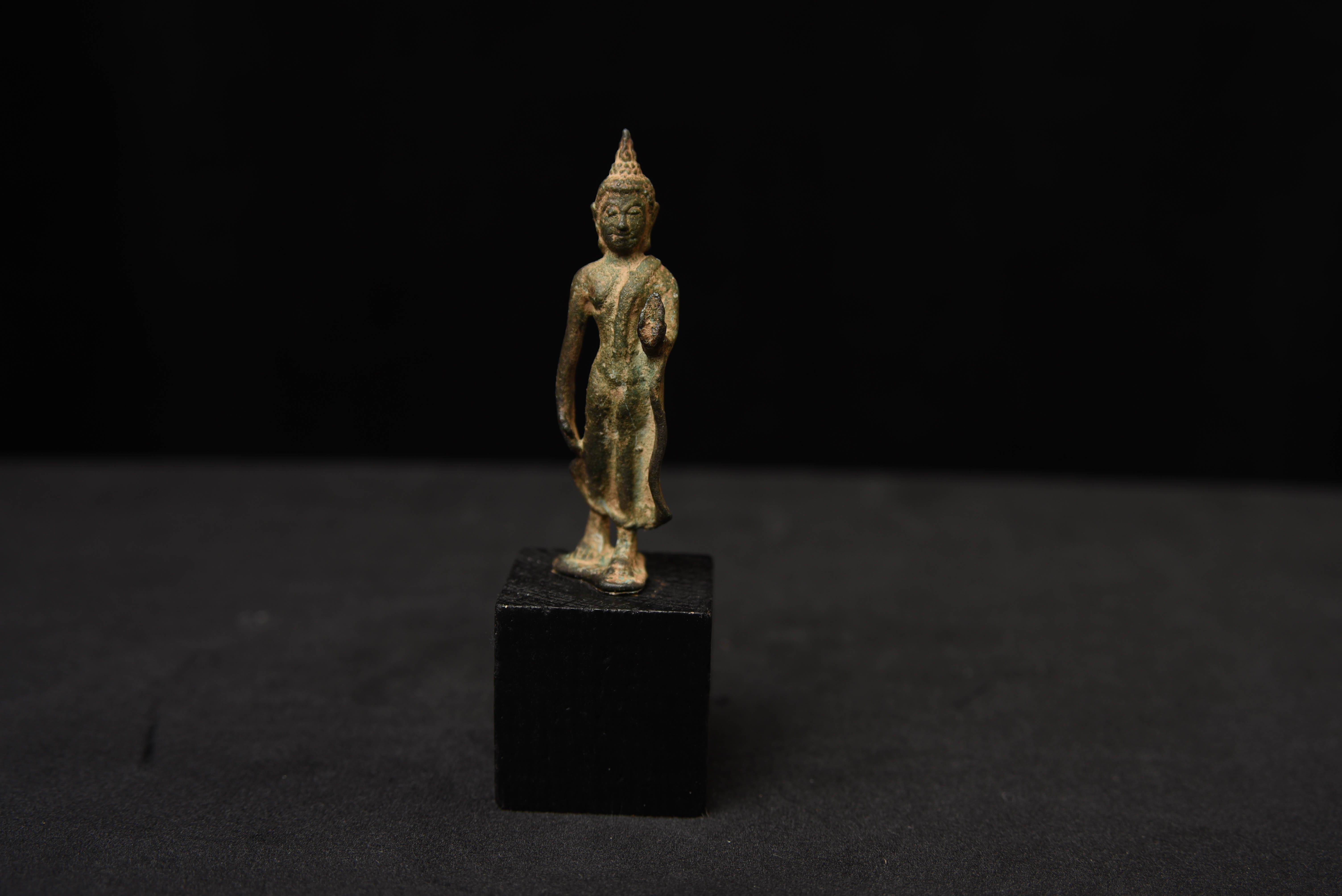 Authentic 15-17thC miniature bronze Sukhothai walking Buddha from Thailand. This is a true period piece, and nota 19th or 20th-century emulation like the vast majority of walking Buddhas that you will ever see. Authentic ones (including miniature examples) are very rare. Domestic Insurance included. International shipping will be $50 including packing, shipping, and insurance.