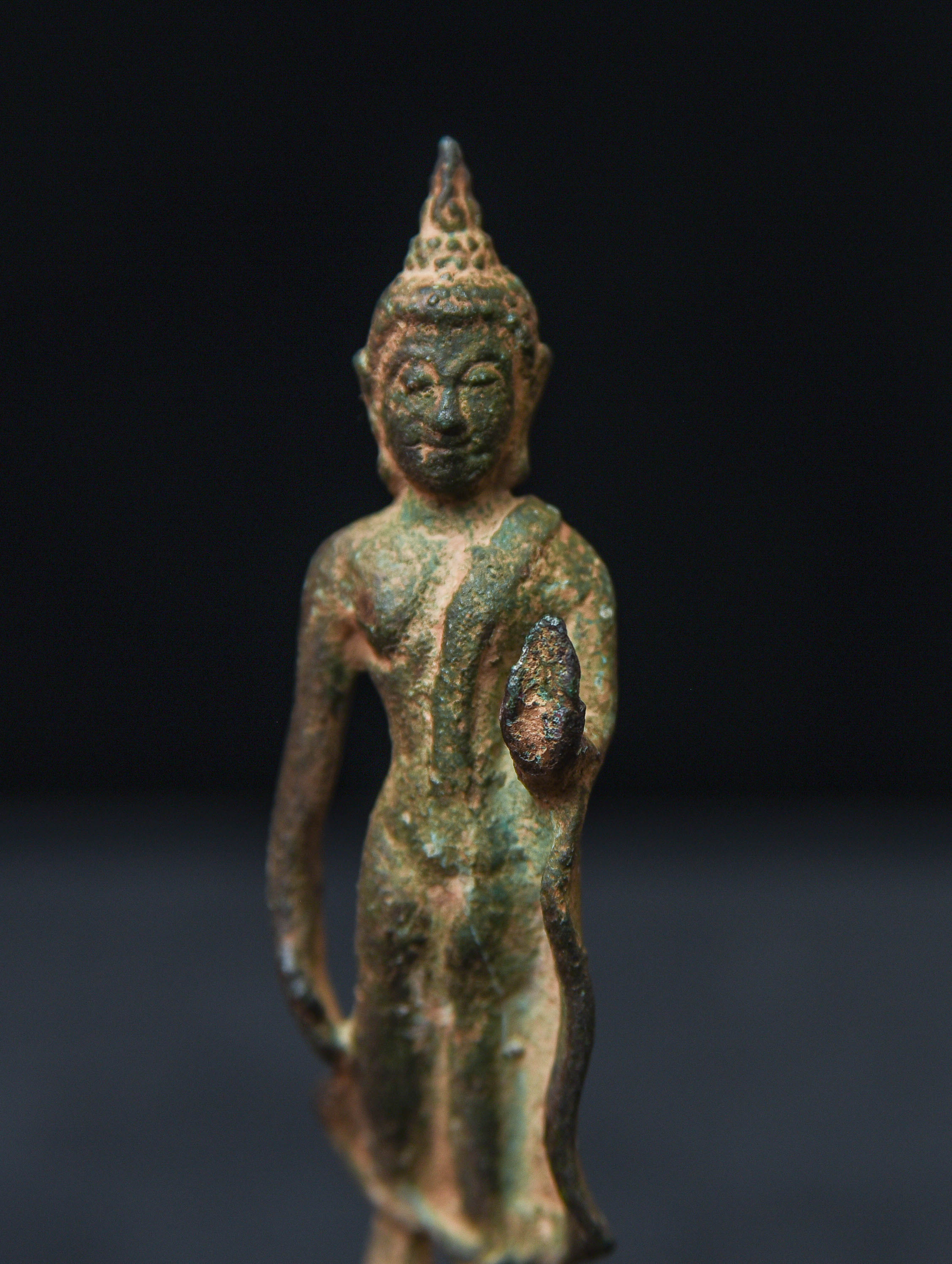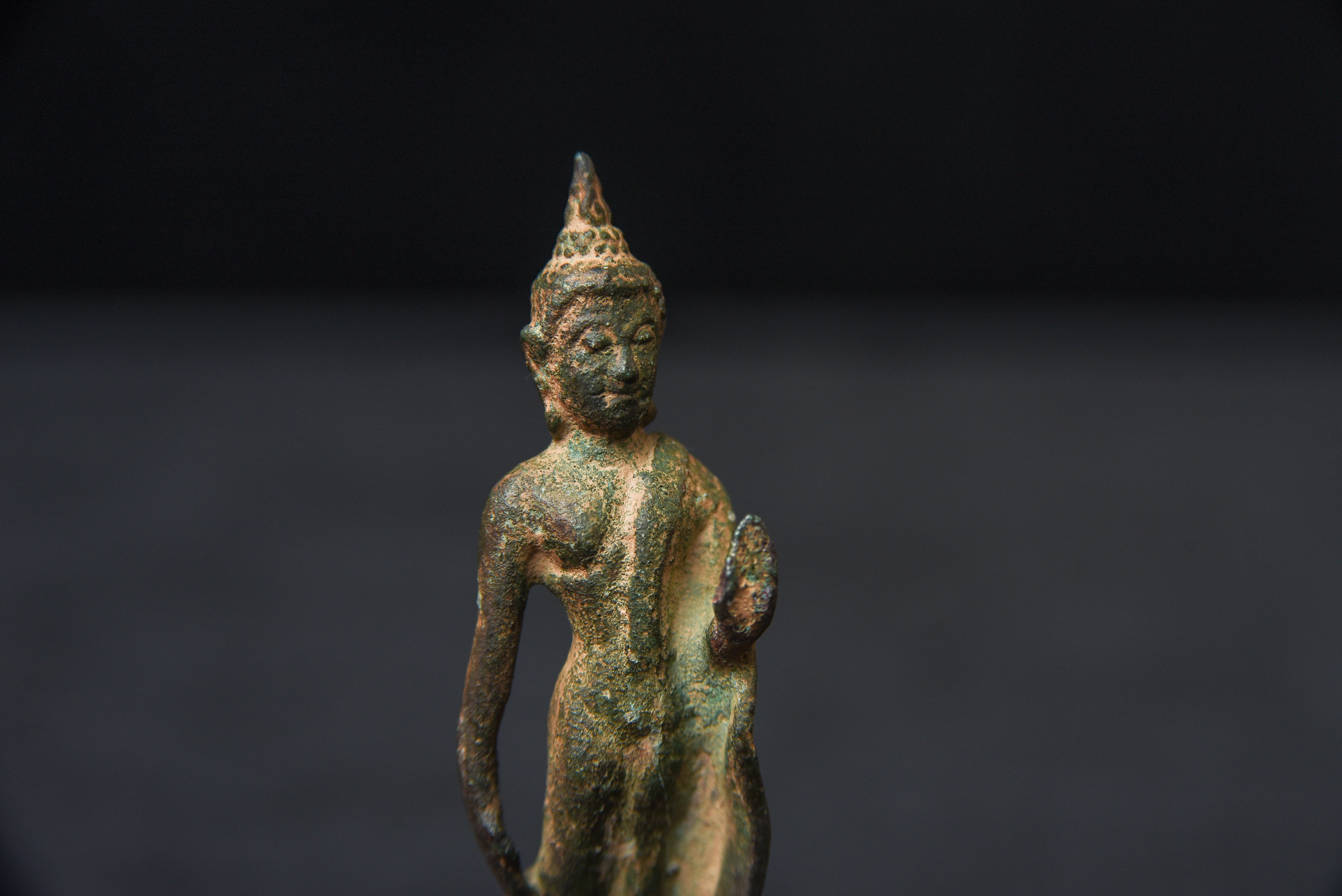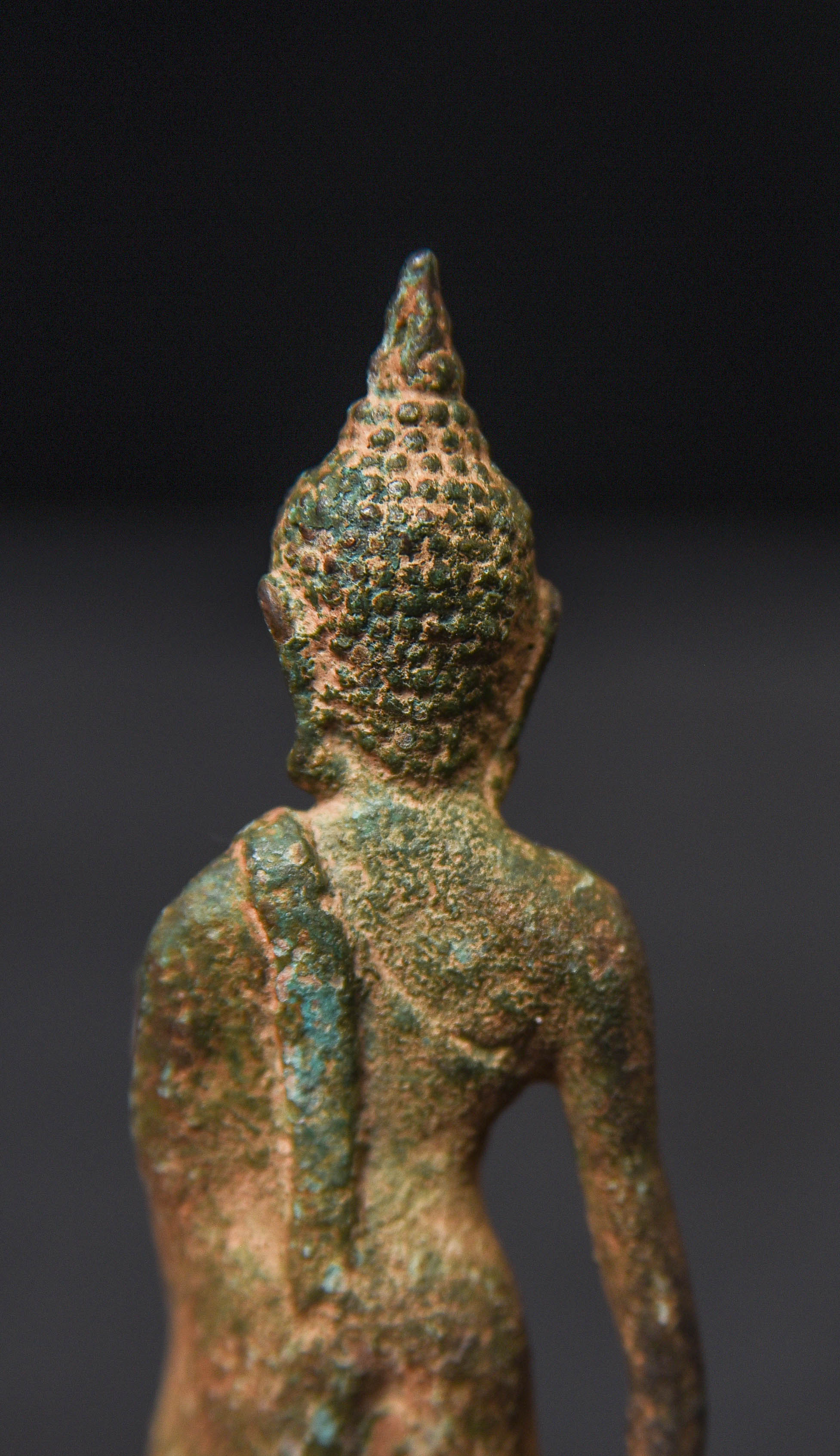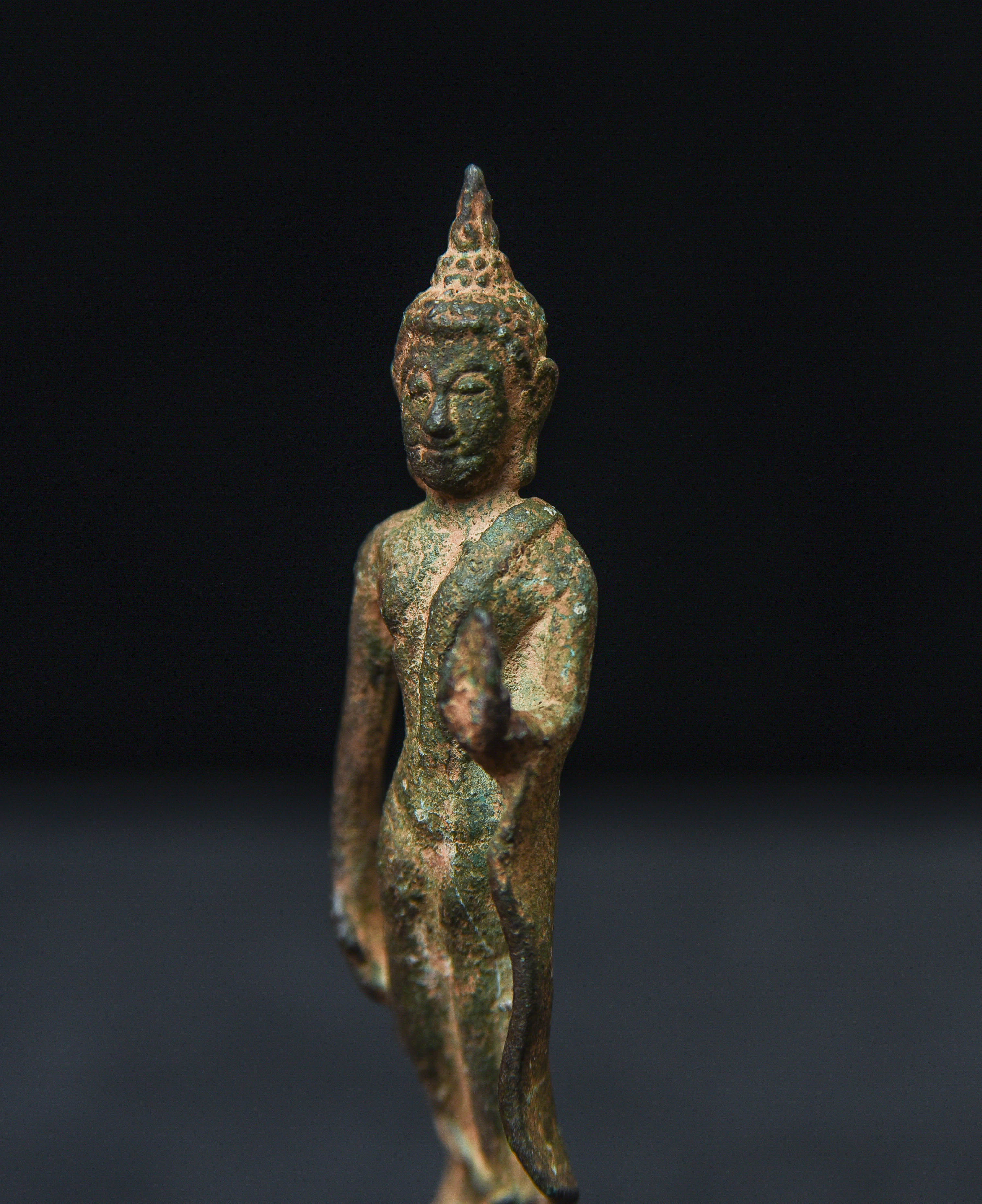 Authentic 15-17thC miniature bronze Sukhothai walking Buddha from Thailand. This is a true period piece, and nota 19th or 20th-century emulation like the vast majority of walking Buddhas that you will ever see. Authentic ones (including miniature examples) are very rare. Domestic Insurance included. International shipping will be $50 including packing, shipping, and insurance.