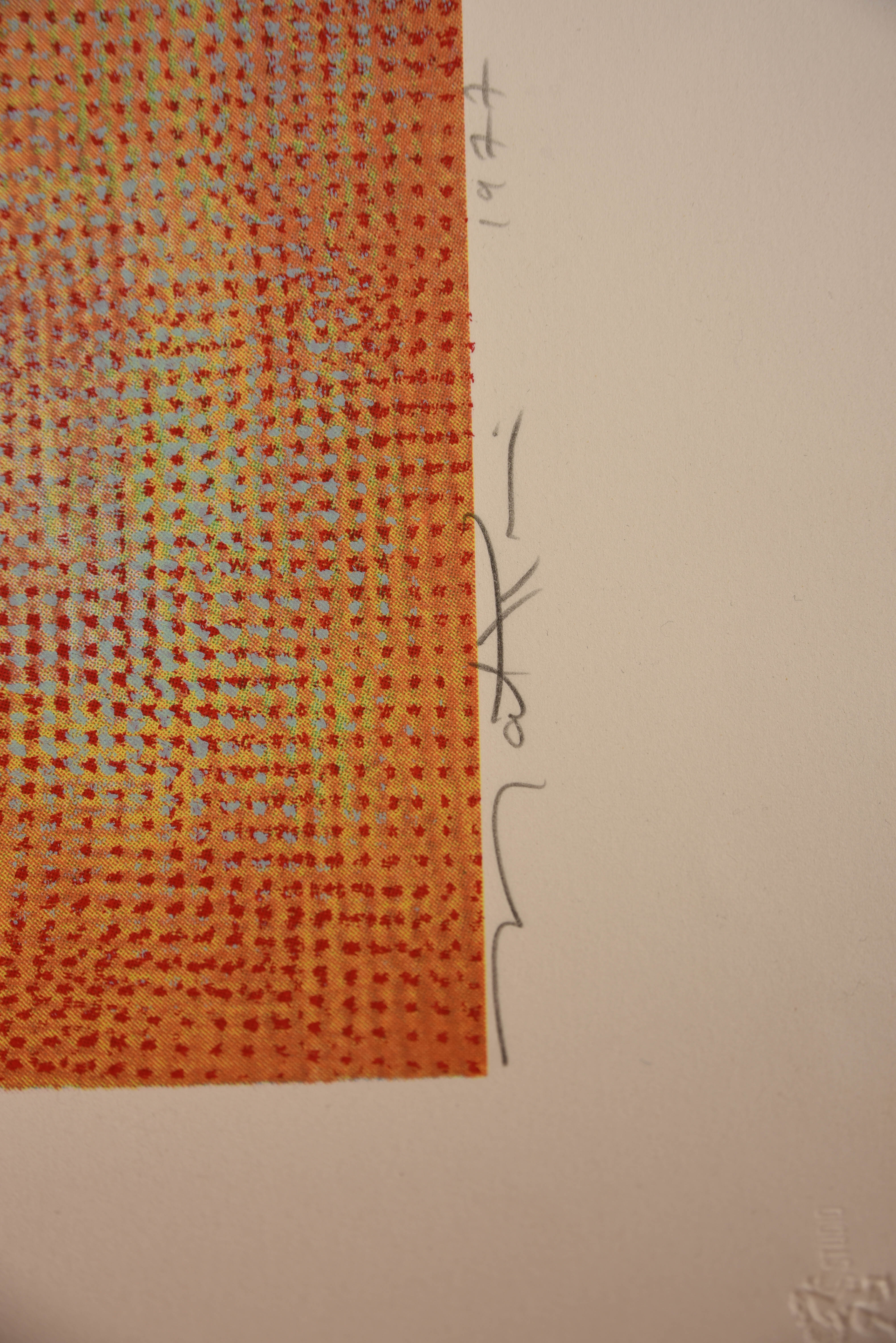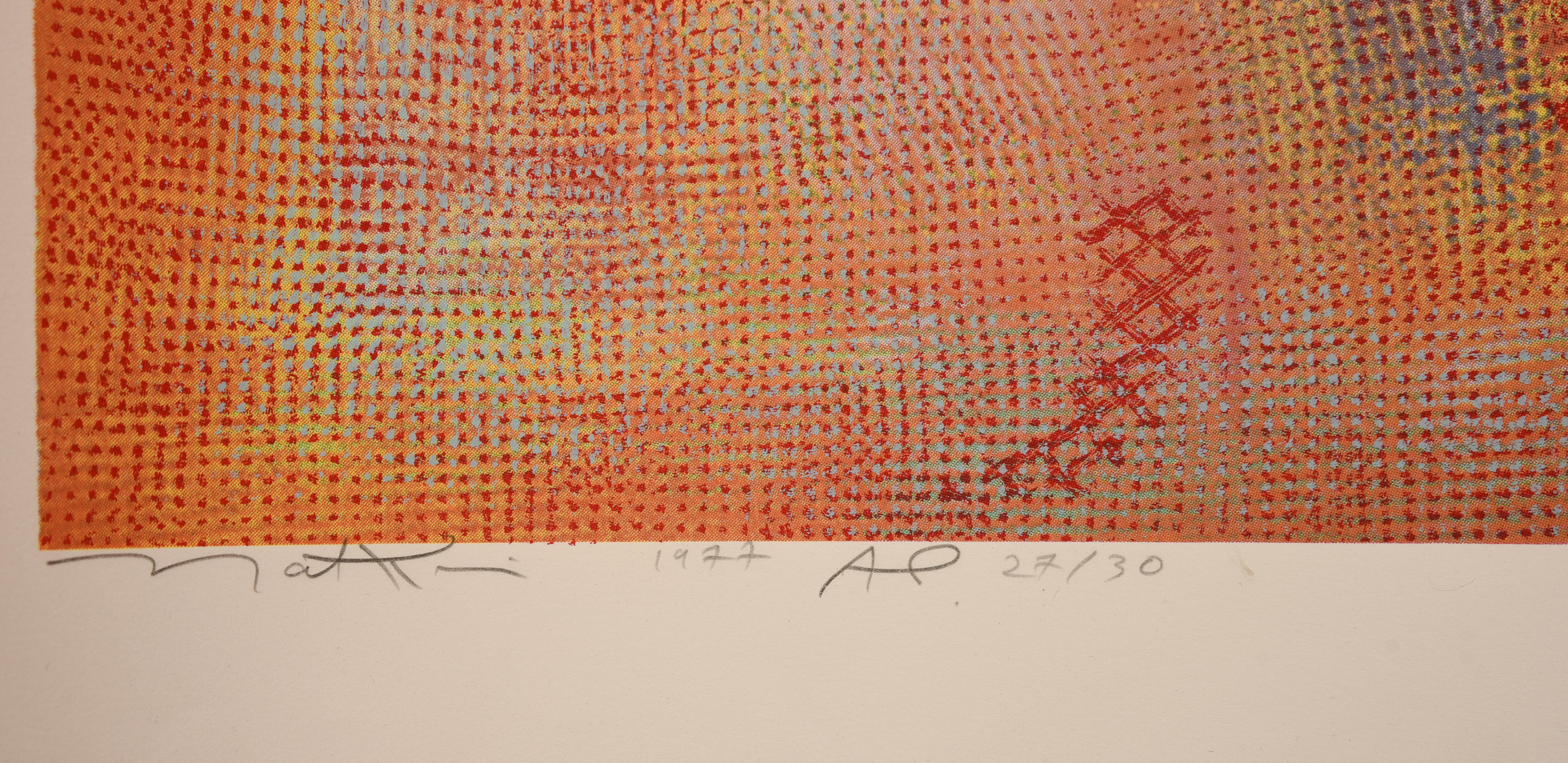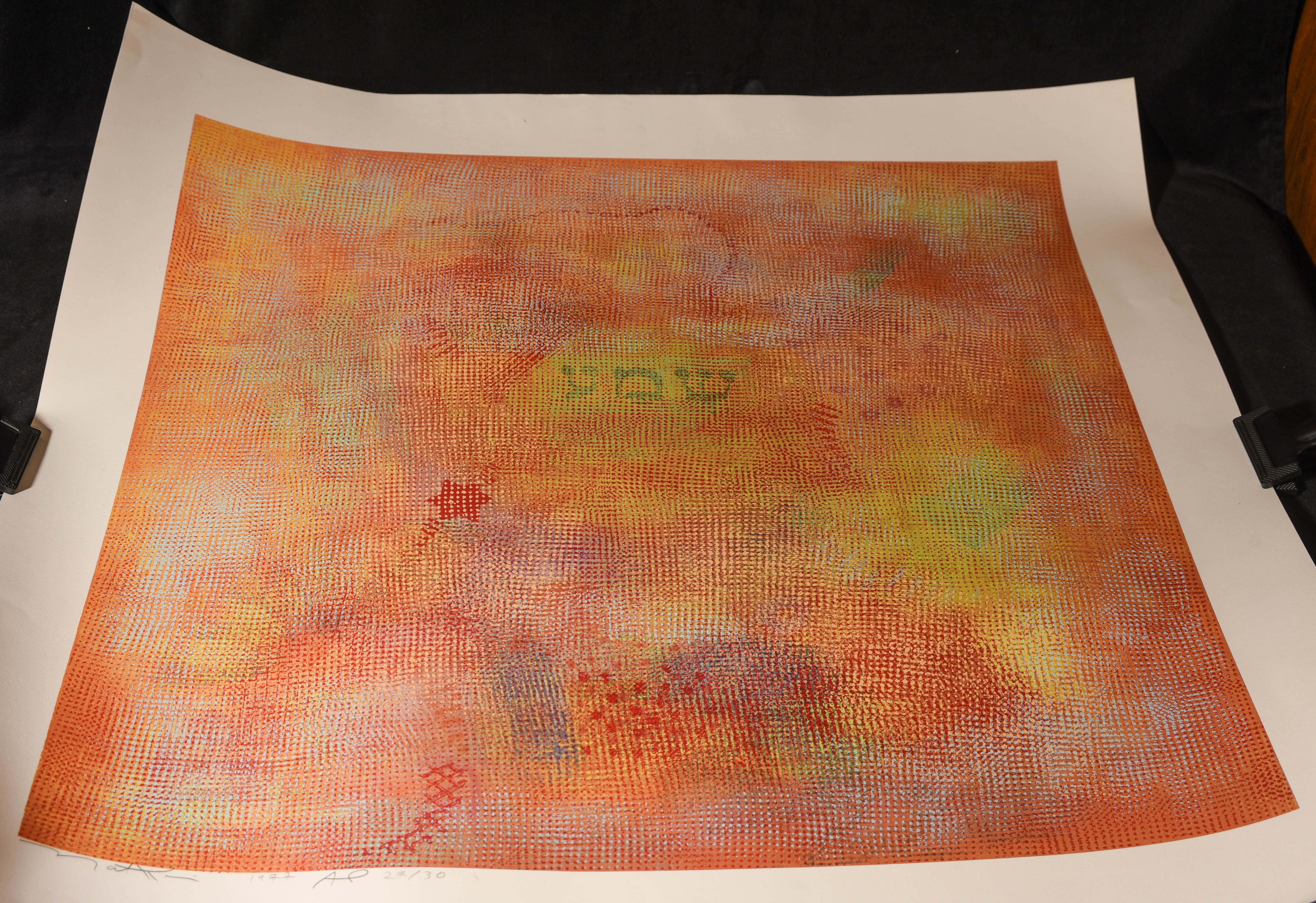 Clean, crisp, and vibrant- looks like it could have been made yesterday. Notice the "Shema" written in Hebrew (Robert Natkin Rare Limited Edition, "Shema". One of the most important prayers in Judaism.). From an old and large Northern California collection of Natkin Paintings, prints, and other works. Pencil signed, with an edition of. 27/30, 1977. Spent all but the last 6 months laying flat. The size of the paper is 36"x 36, Image is 30"x 30")