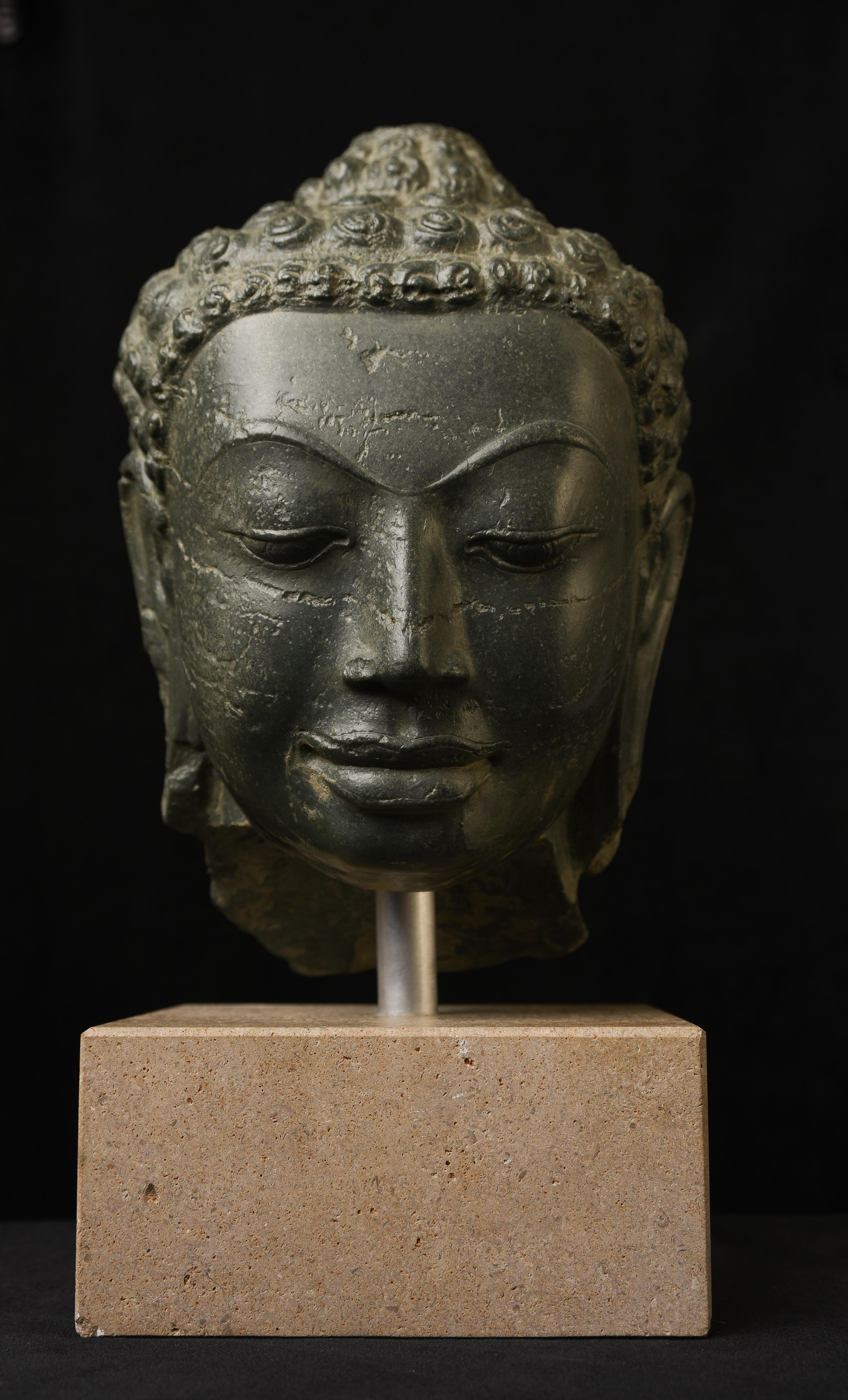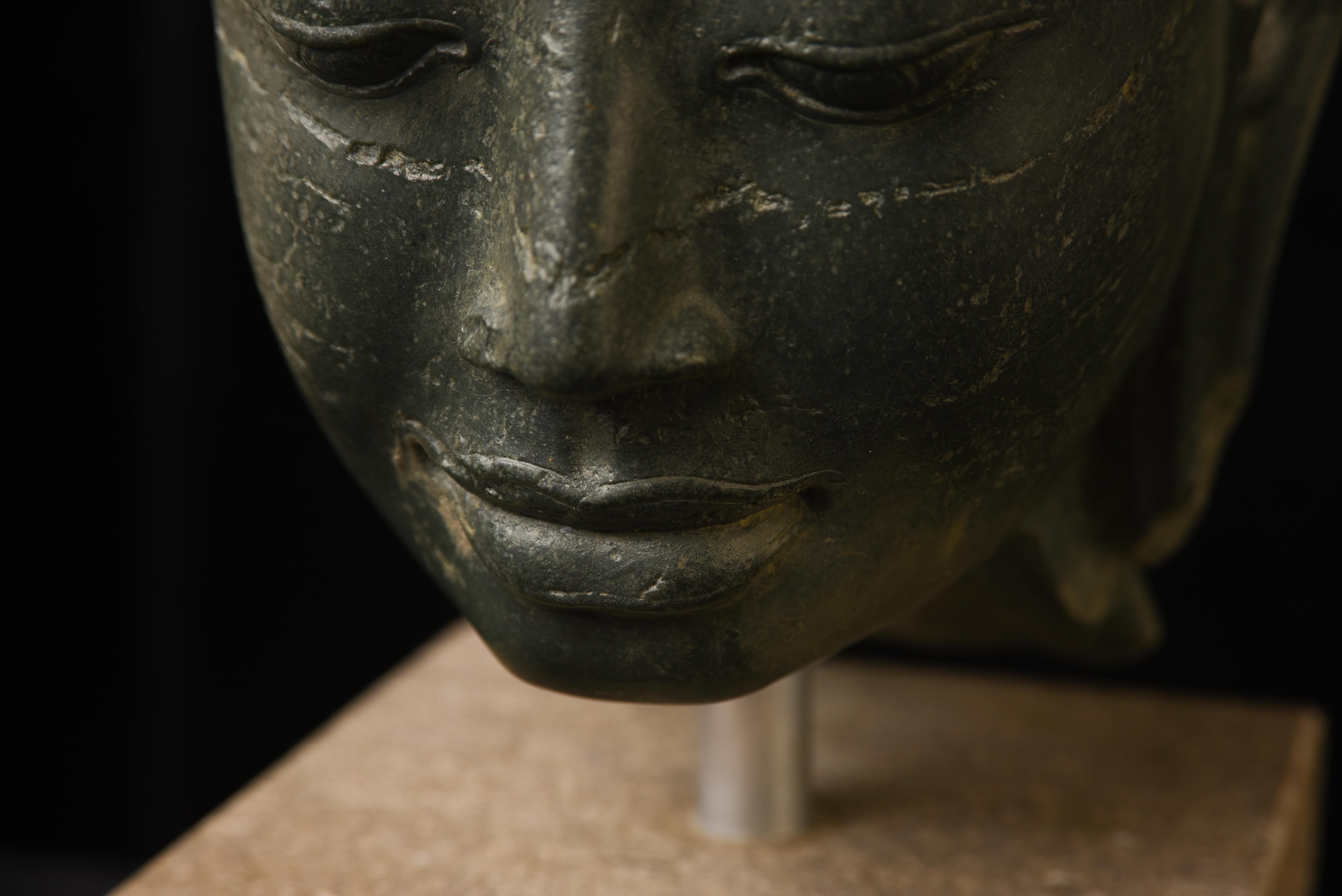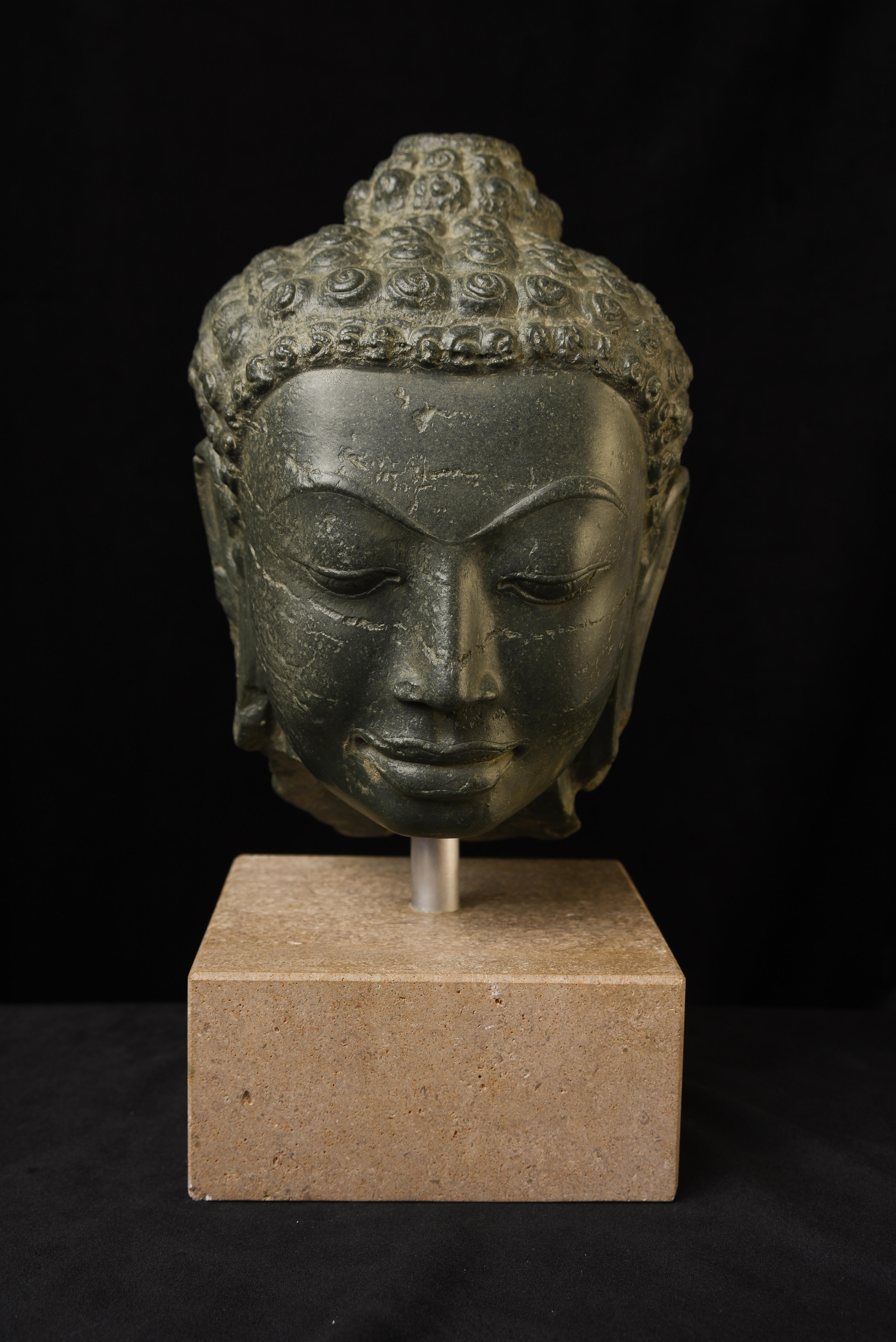Museum emulation, Buddha head Supanburi, ars mundi collection, treasures of world art, green stone, (original in the State Museum of Ethnology in Munich. Supanburi style. (original greenstone sculpture in National Museum für Völkerkunde Munich, Thailand, 7th-9th century AD),H Approx.. 32.5 cm not including the base.