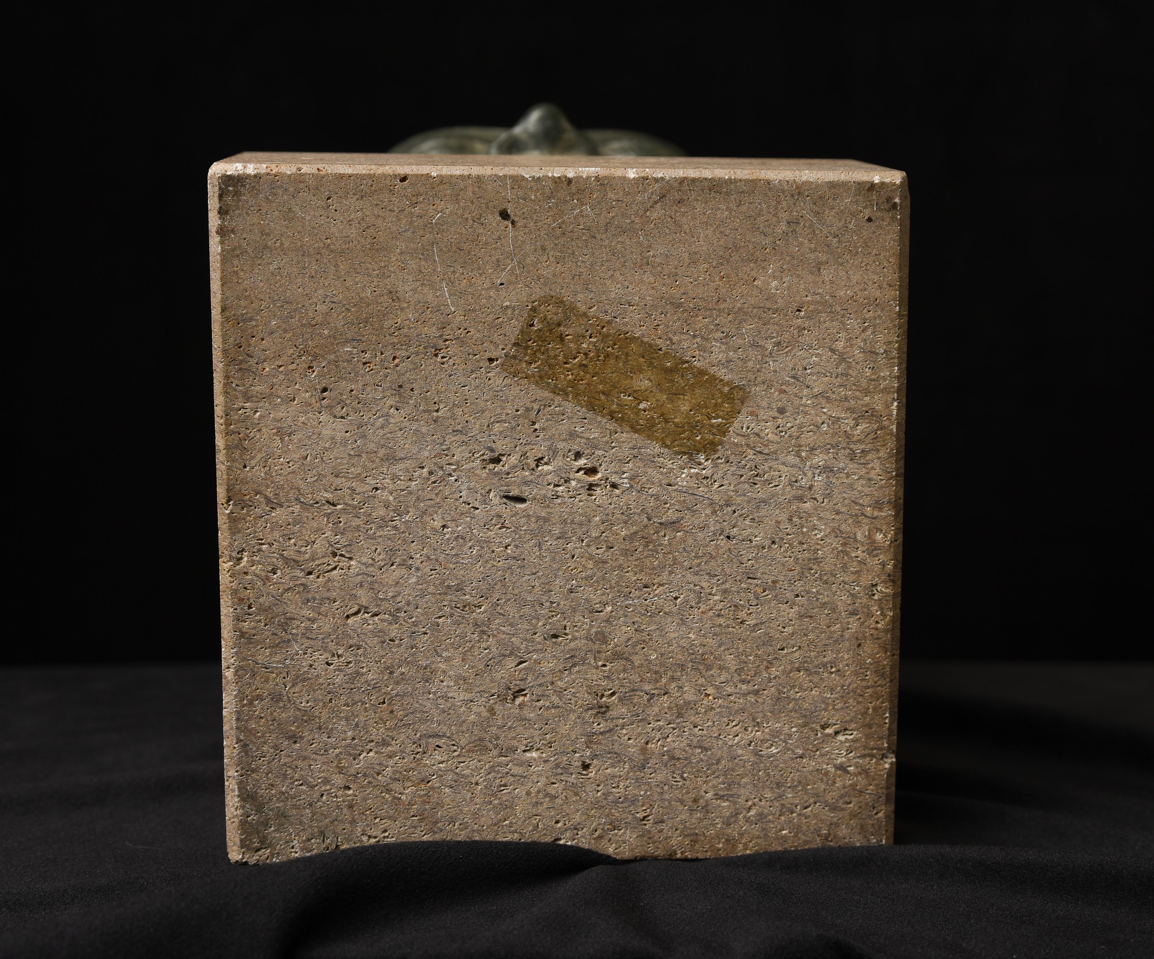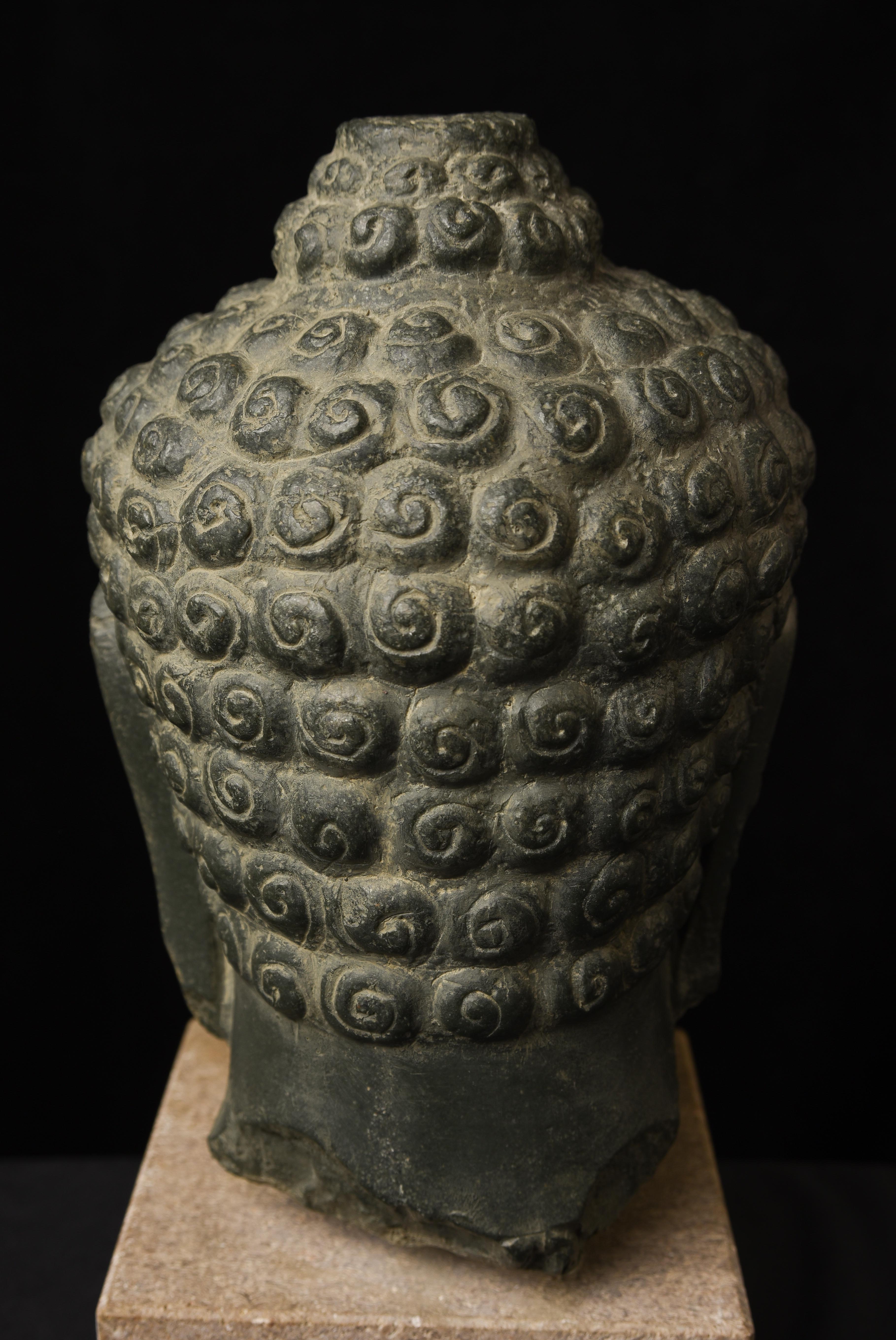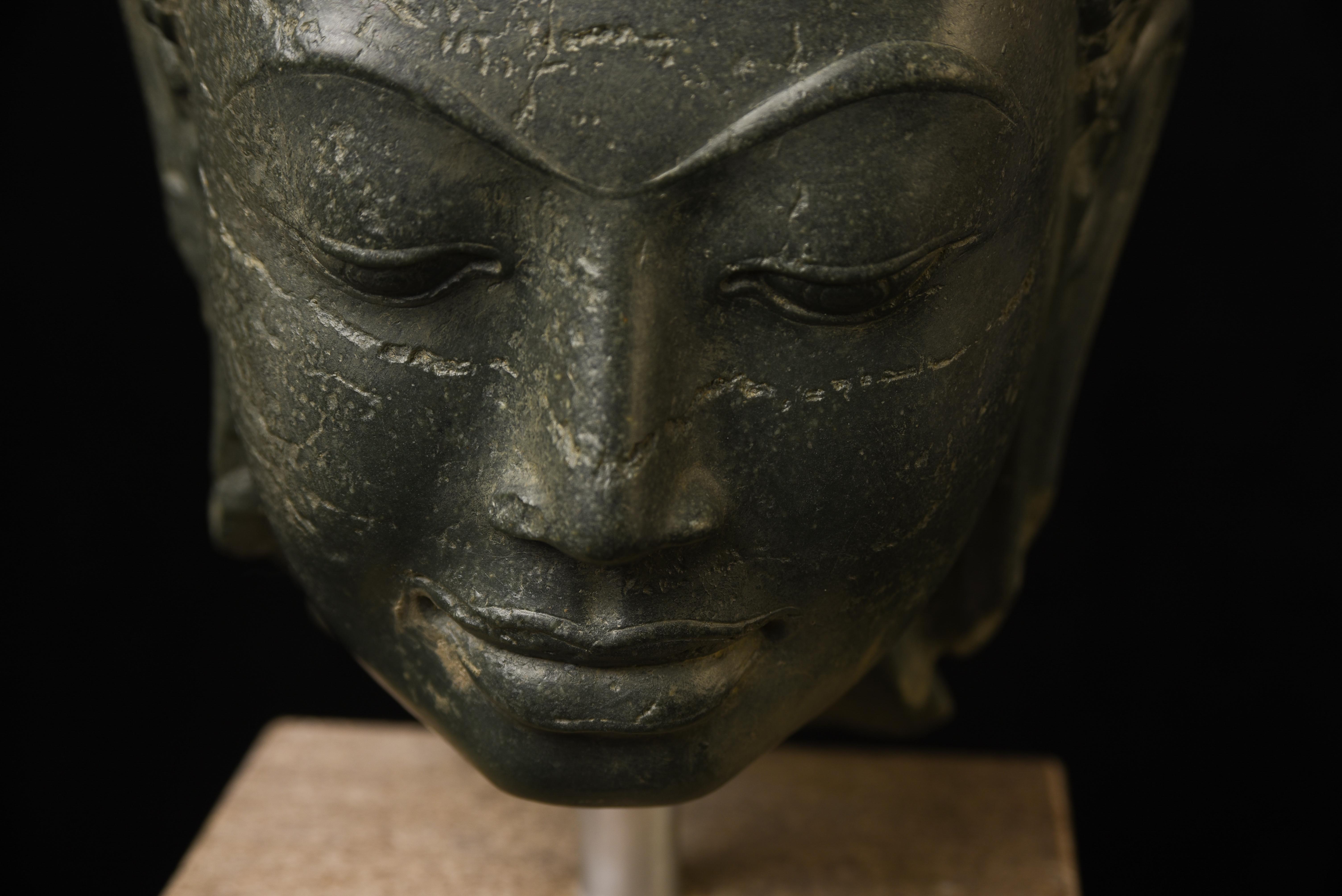 Museum emulation, Buddha head Supanburi, ars mundi collection, treasures of world art, green stone, (original in the State Museum of Ethnology in Munich. Supanburi style. (original greenstone sculpture in National Museum für Völkerkunde Munich, Thailand, 7th-9th century AD),H Approx.. 32.5 cm not including the base.