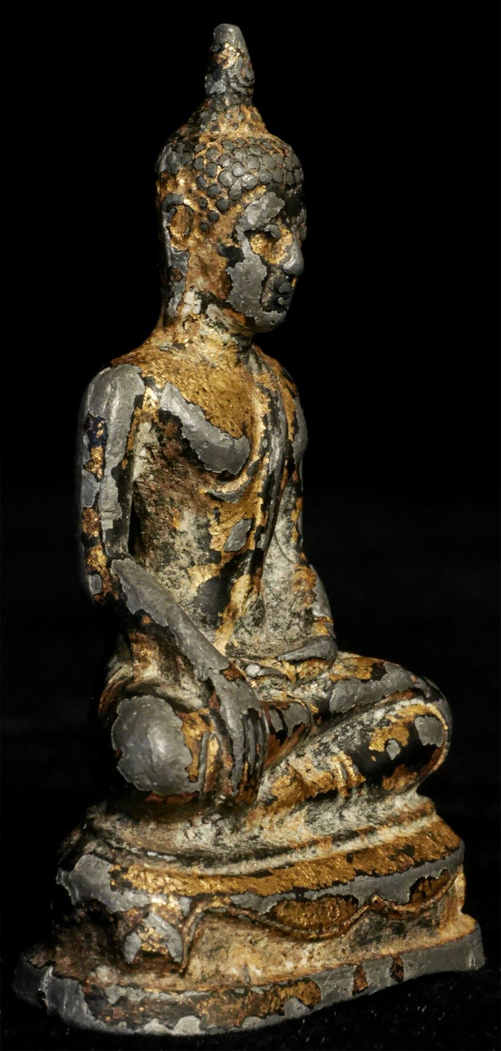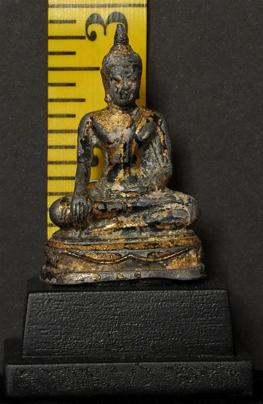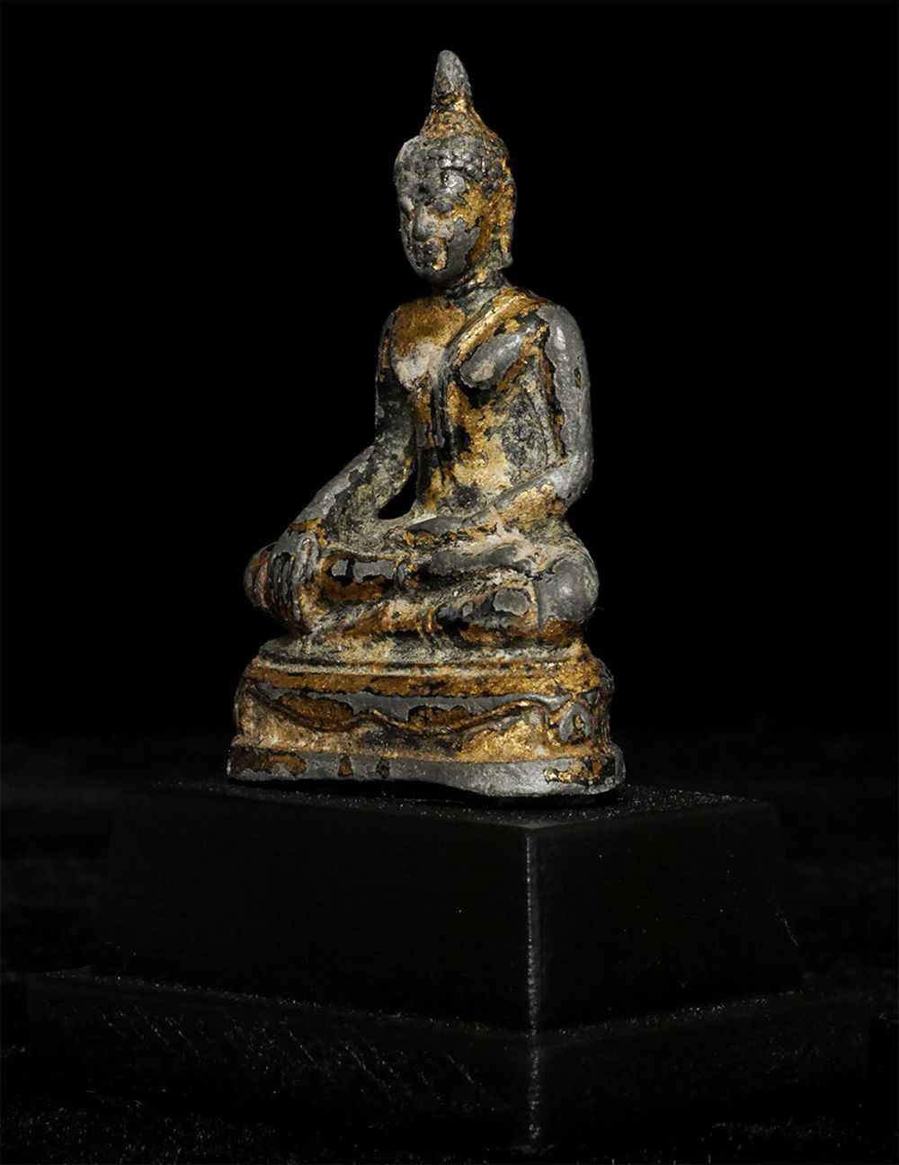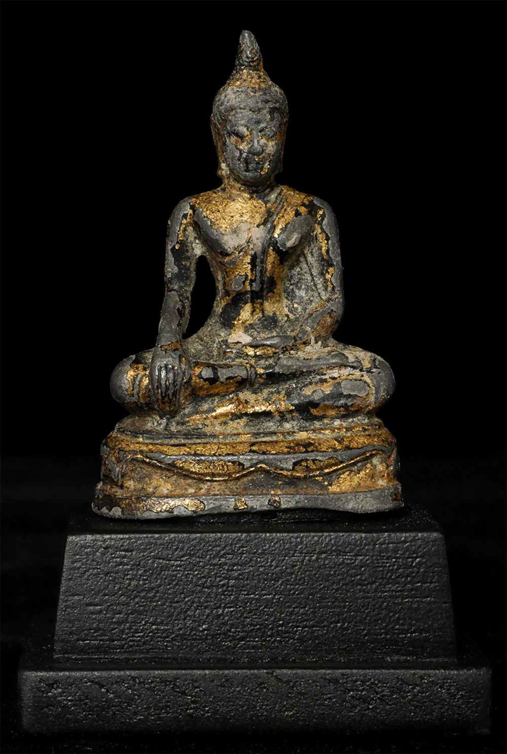 Thai Bronze Bronze Buddha- A true late Sukothai (16/17thC.) example-possibly a bit earlier). Very rare- especially as a true miniature. Some original lacquer and gilding remain. 1 7/8" tall, 2 7/8 inches on a custom stand. RARE in this size (Many copies- this is a very fine old one)