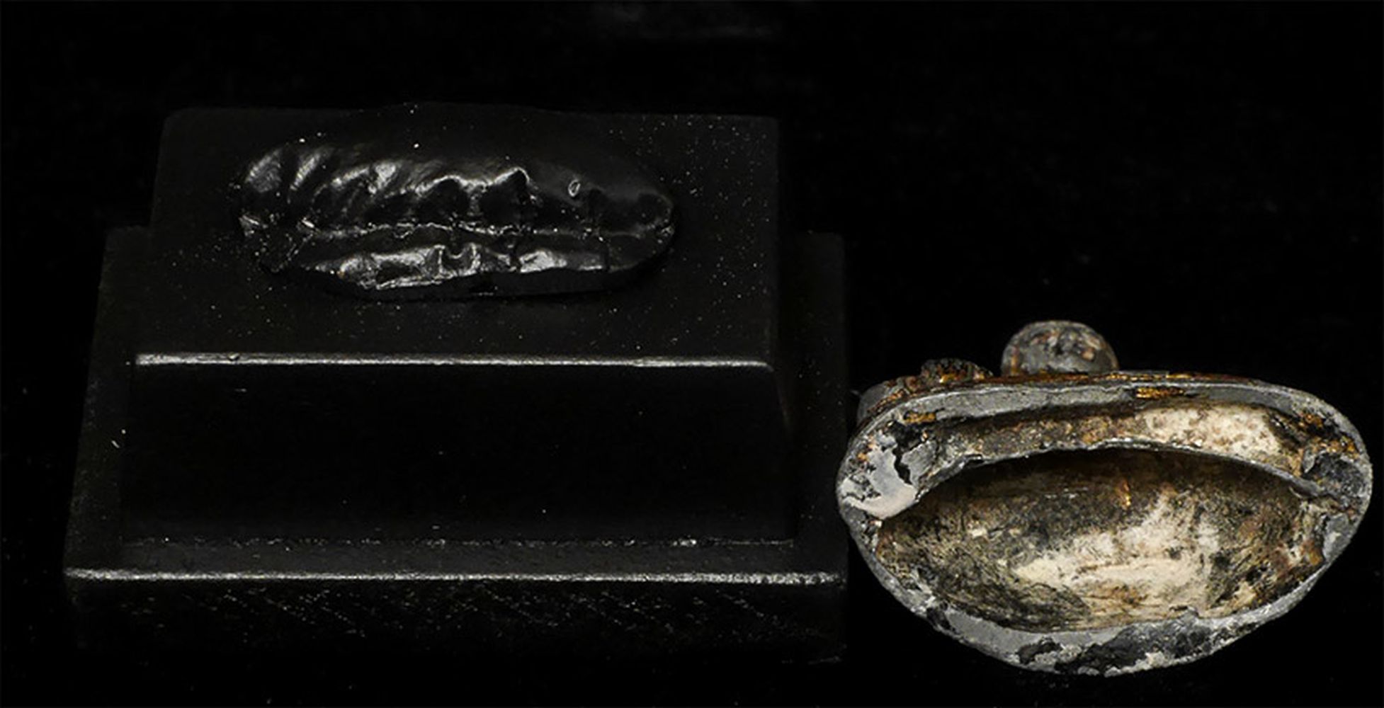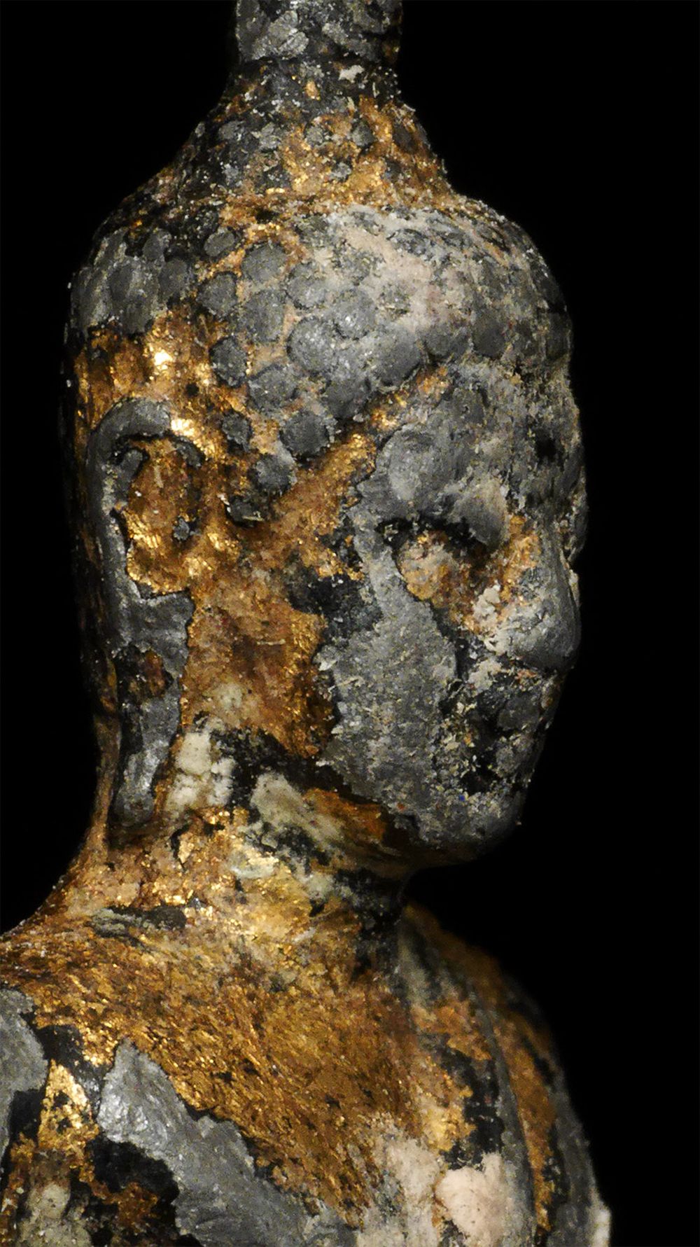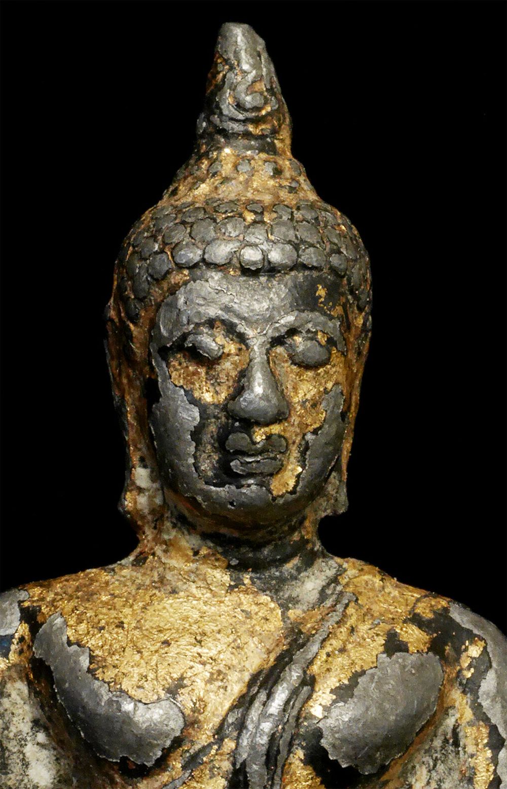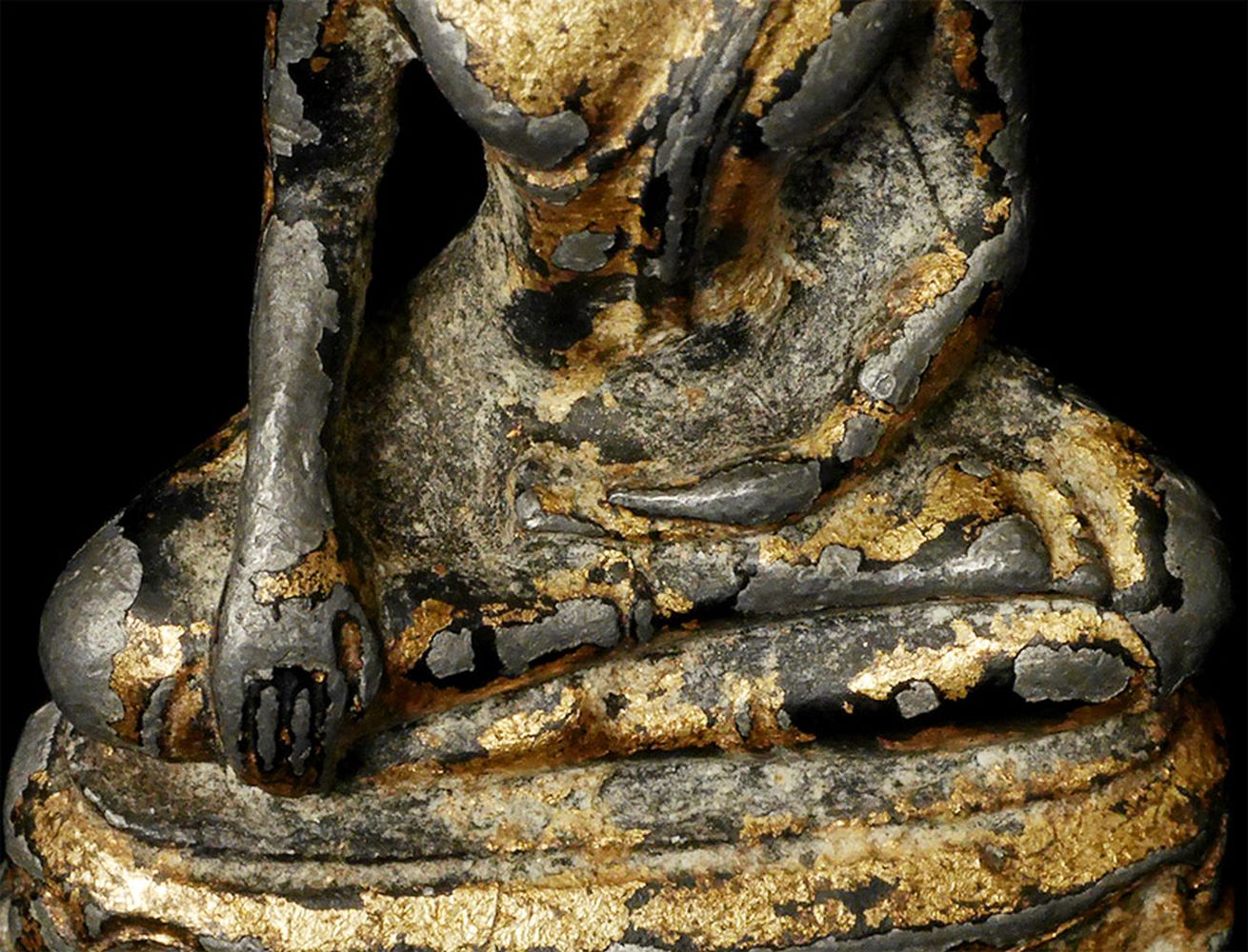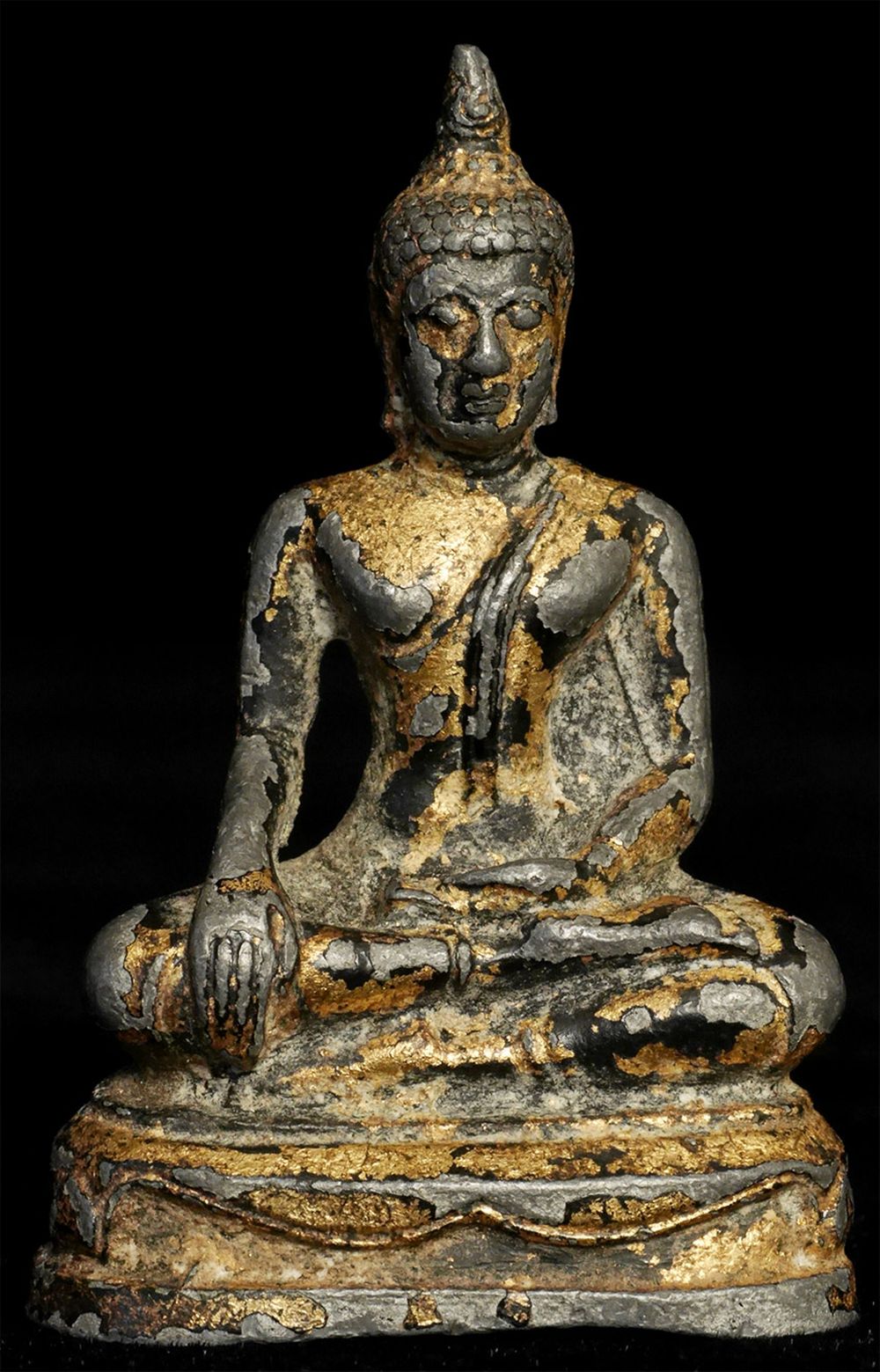 Thai Bronze Bronze Buddha- A true late Sukothai (16/17thC.) example-possibly a bit earlier). Very rare- especially as a true miniature. Some original lacquer and gilding remain. 1 7/8" tall, 2 7/8 inches on a custom stand. RARE in this size (Many copies- this is a very fine old one)
