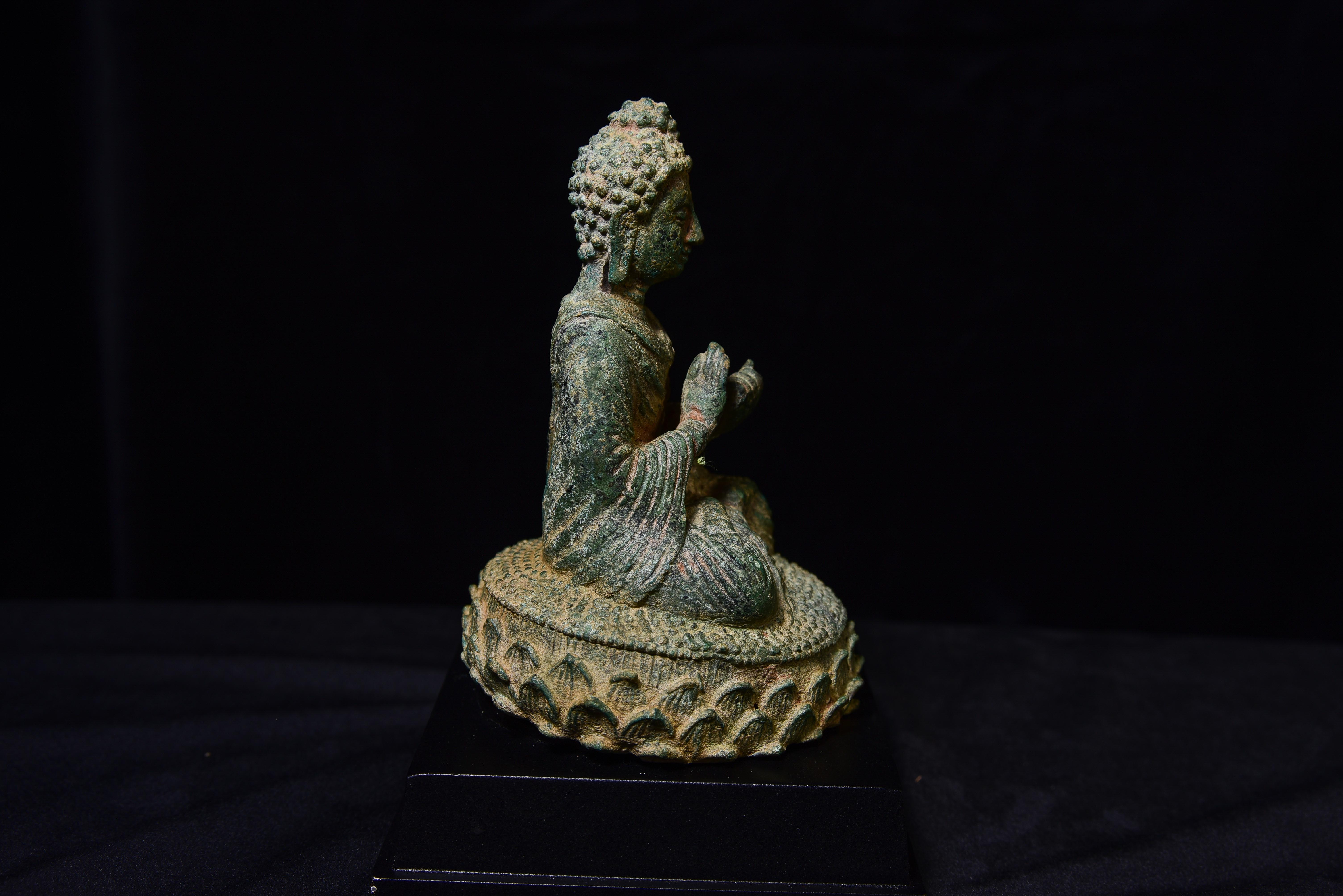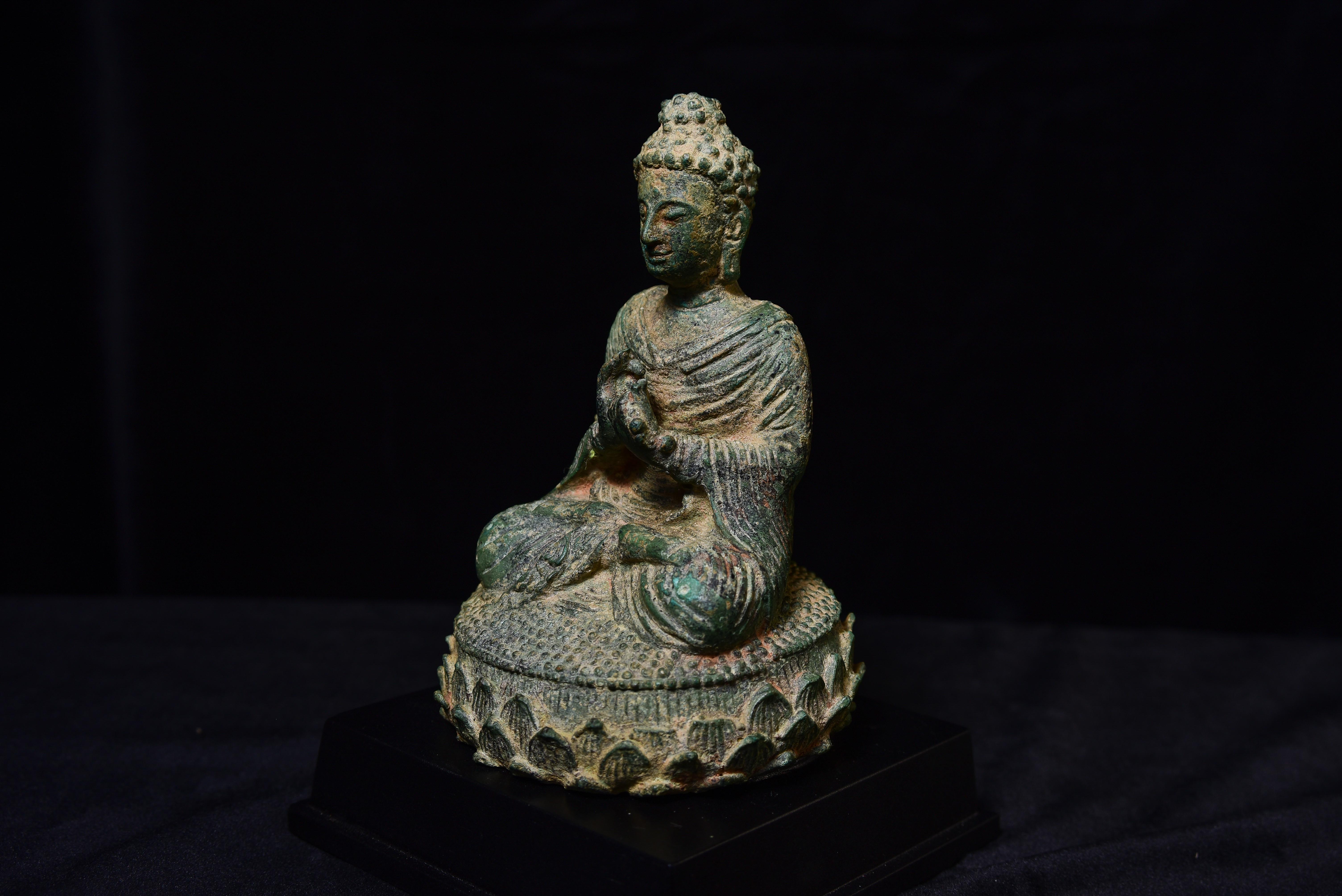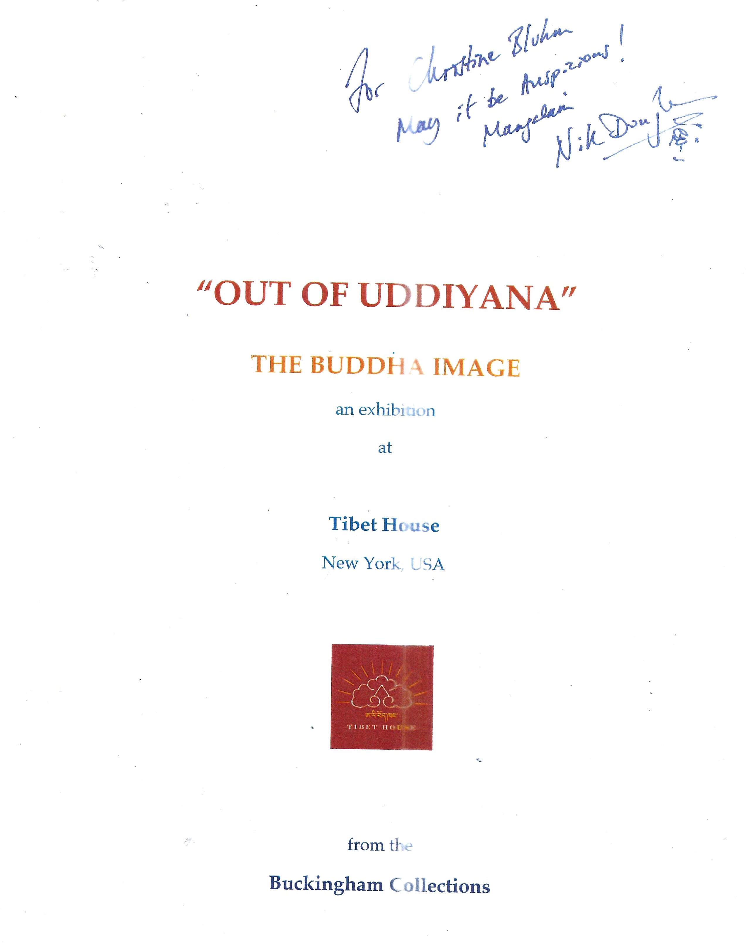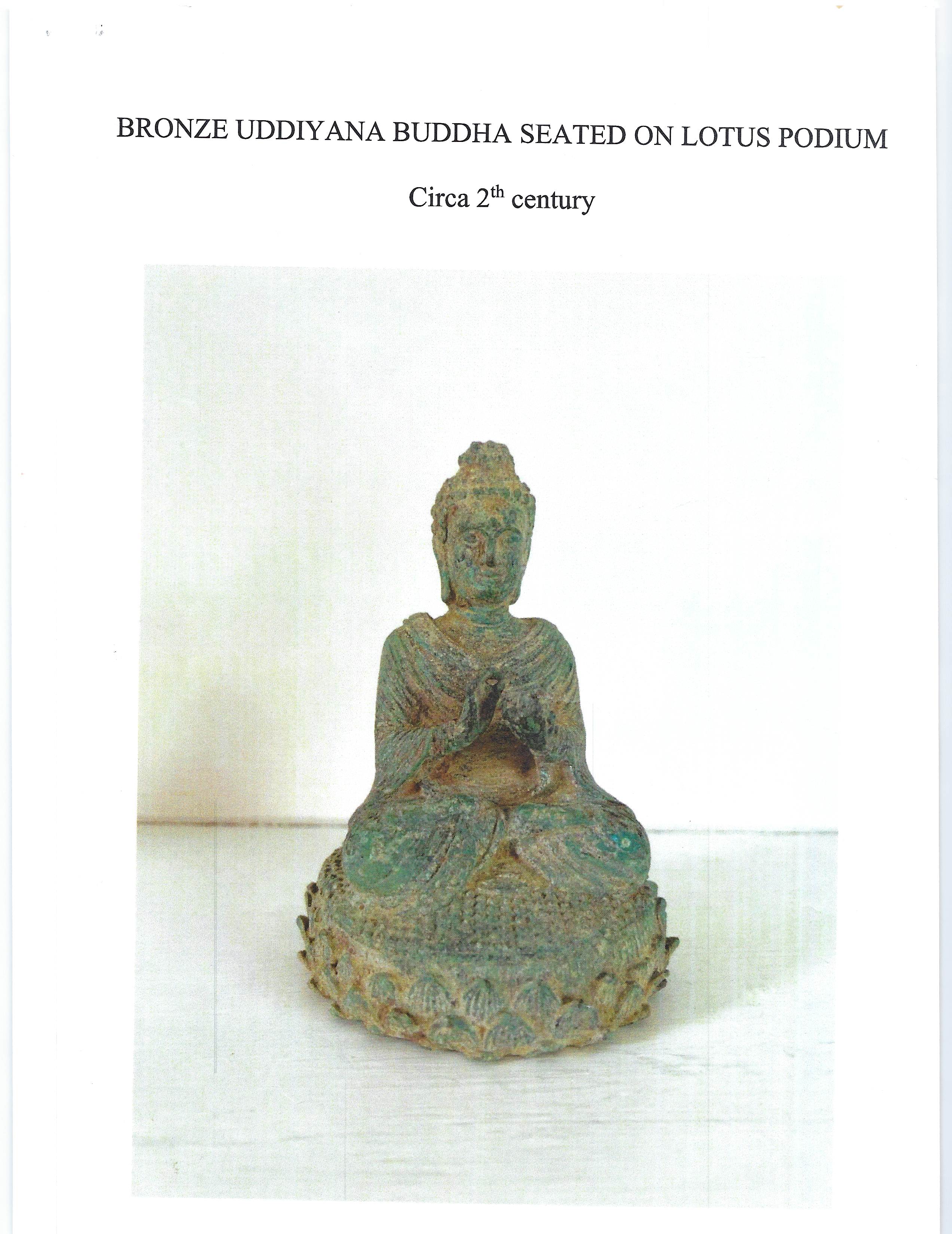 This piece, as per the catalog of the exhibition was formerly displayed at Tibet House in New York City as c.2nd century A.D. as a bronze Uddiyana Buddha (early central Asian) modeled in the round seated on a lotus flower, hands held in a teaching mudra, with detailing to the hair, face, garments, and floral base. It weighs 520 grams, 13.5 cm high (5 1/4 in."). Acquired 1996 by Dr. Paul Singer, New Jersey, USA. from the ‘Buckingham Collection’, from the late Nik Douglas (1944-2012), renowned author, curator, and Asian art expert. Accompanied by a copy of Nik Douglas's collection cataloging document, with a note with the price (US$43,000). I was in touch with the auction house that helped disperse Part of this collection and asked them why these pieces were sold through a smaller auction house and not through one of the major auction houses given what they were, and they said that Nick Douglas strongly disliked the major auction houses based on several experiences he had in his later life, so he directed his (Now Widow, Living in the Caribbean), To use only smaller venues to disperse his remaining collection.