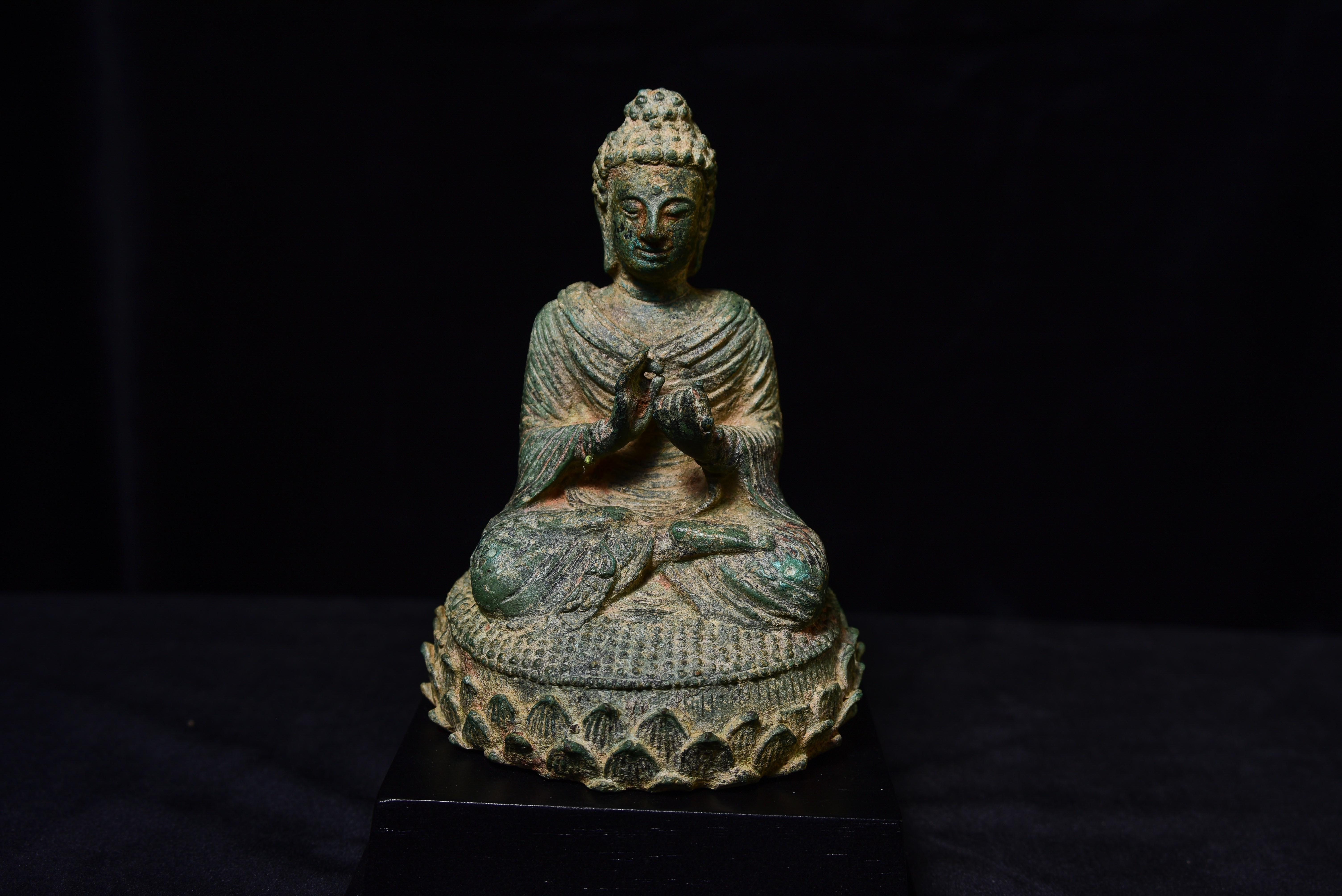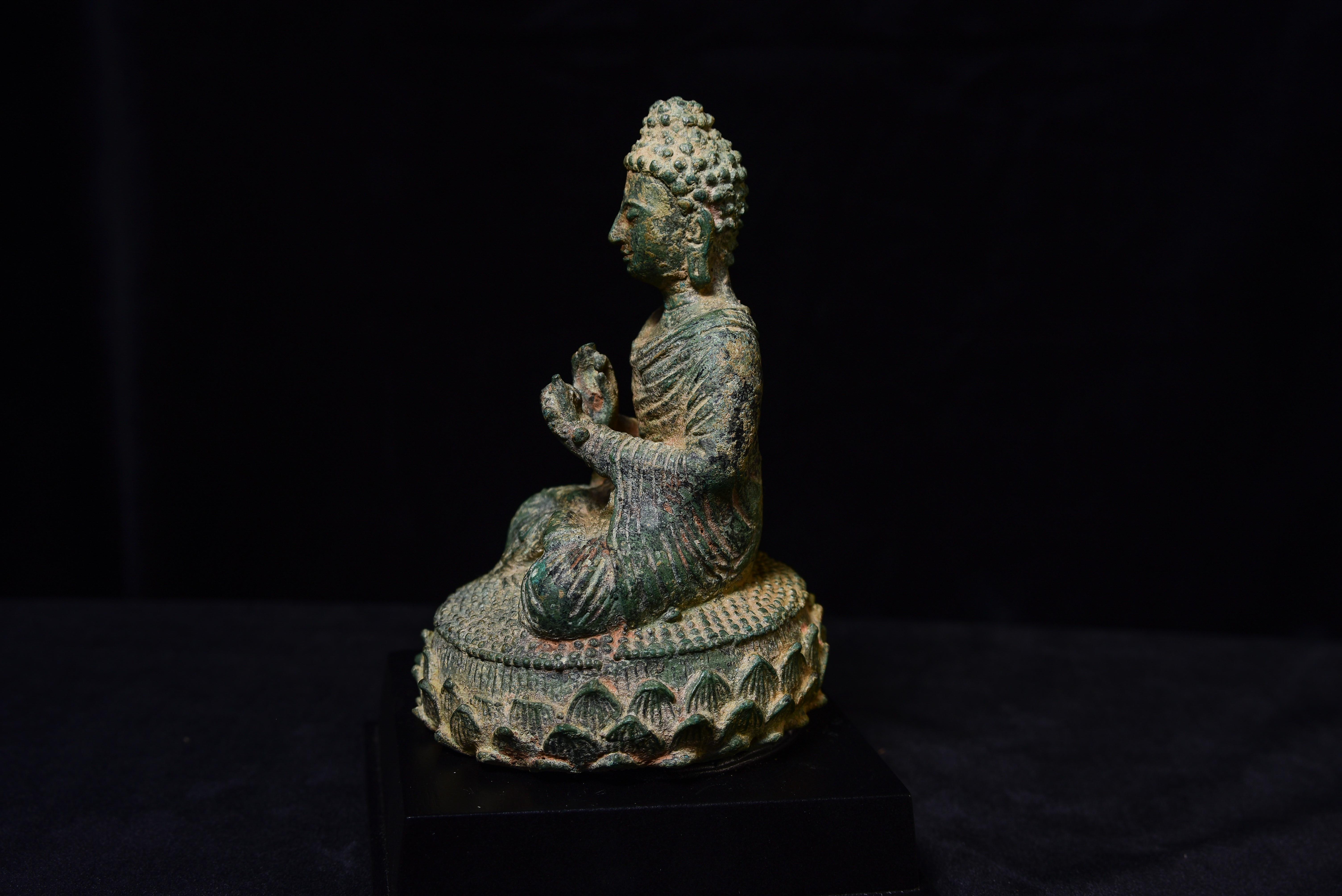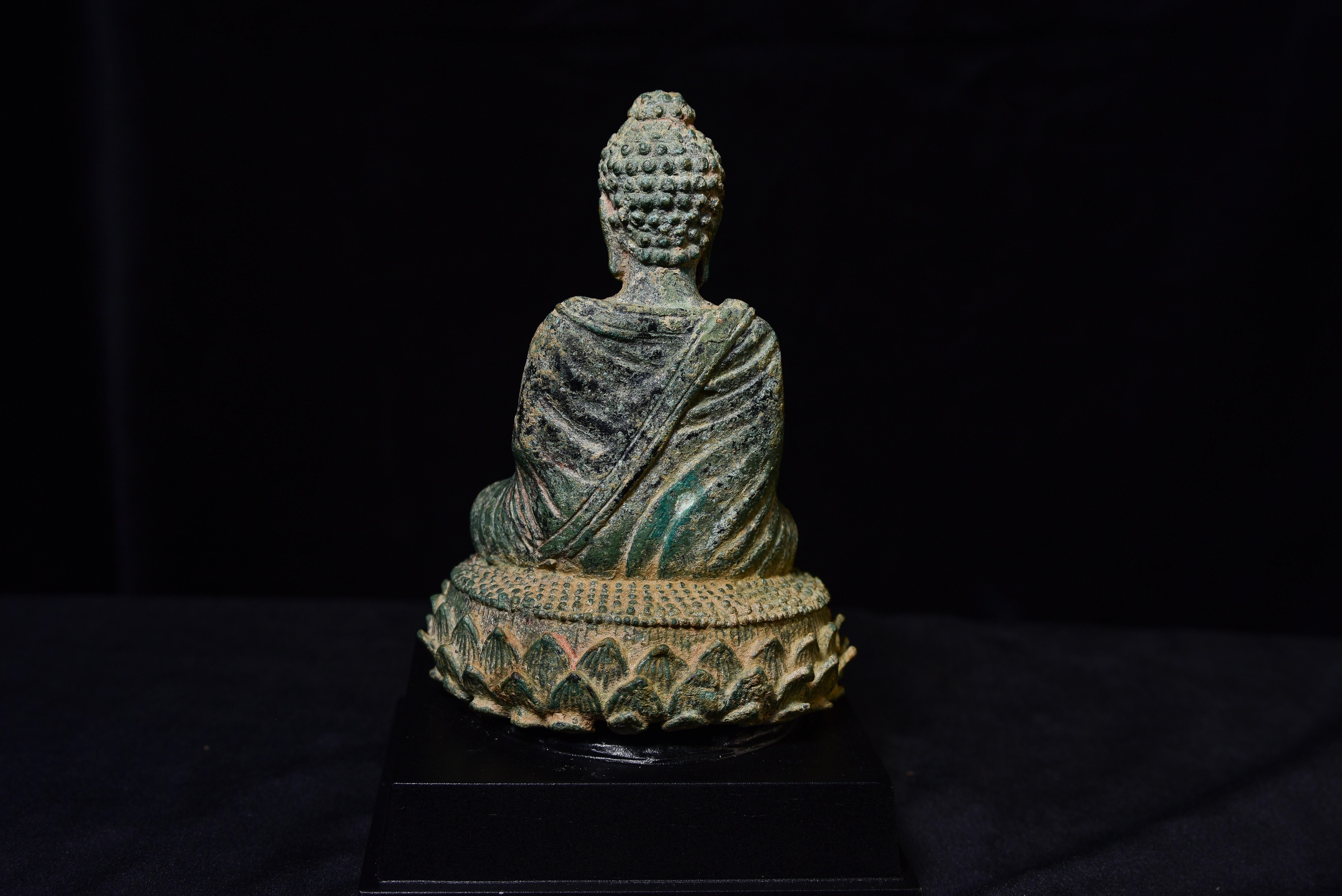 This piece, as per the catalog of the exhibition was formerly displayed at Tibet House in New York City as c.2nd century A.D. as a bronze Uddiyana Buddha (early central Asian) modeled in the round seated on a lotus flower, hands held in a teaching mudra, with detailing to the hair, face, garments, and floral base. It weighs 520 grams, 13.5 cm high (5 1/4 in."). Acquired 1996 by Dr. Paul Singer, New Jersey, USA. from the ‘Buckingham Collection’, from the late Nik Douglas (1944-2012), renowned author, curator, and Asian art expert. Accompanied by a copy of Nik Douglas's collection cataloging document, with a note with the price (US$43,000). I was in touch with the auction house that helped disperse Part of this collection and asked them why these pieces were sold through a smaller auction house and not through one of the major auction houses given what they were, and they said that Nick Douglas strongly disliked the major auction houses based on several experiences he had in his later life, so he directed his (Now Widow, Living in the Caribbean), To use only smaller venues to disperse his remaining collection.