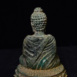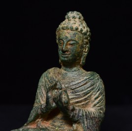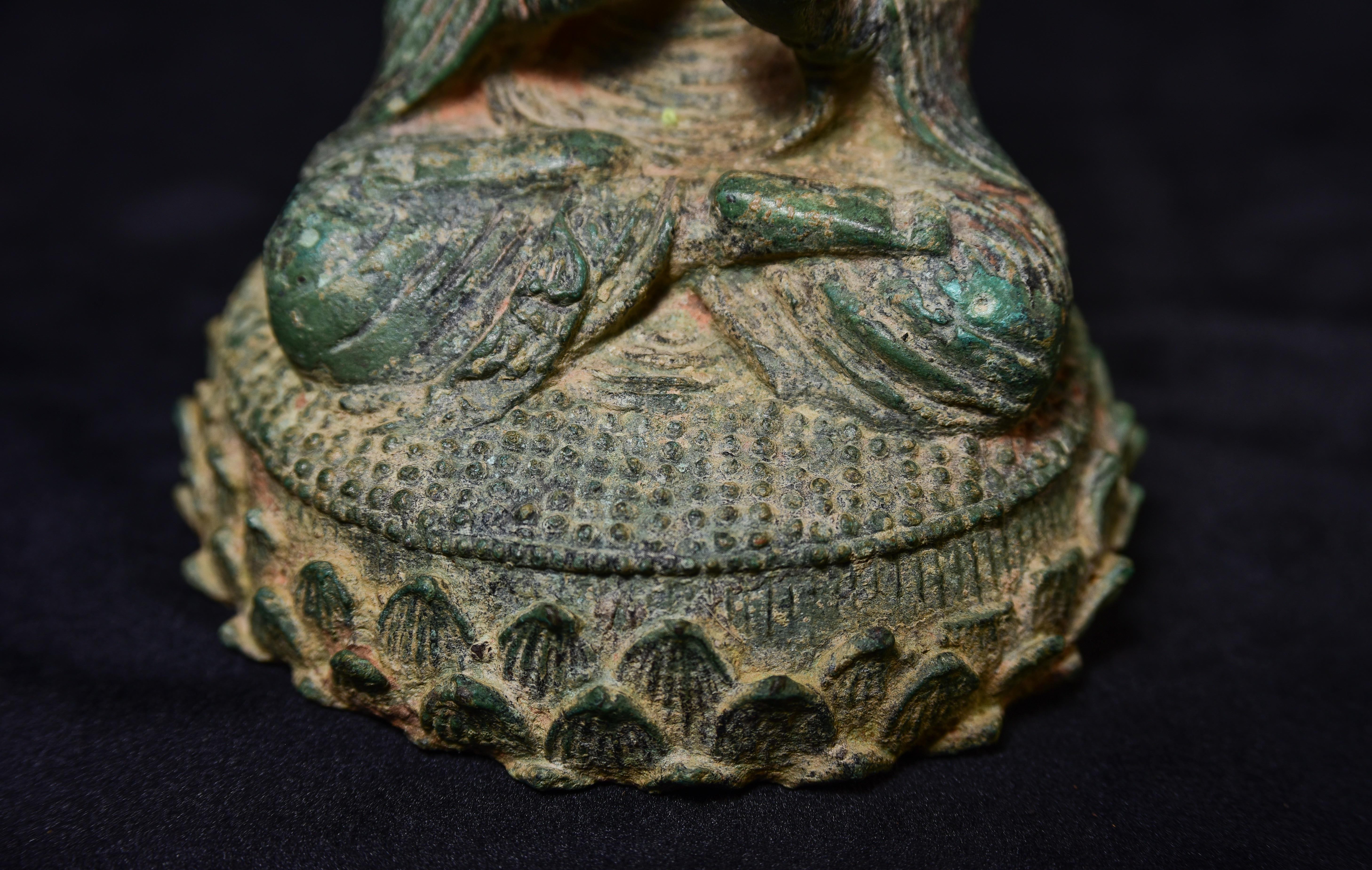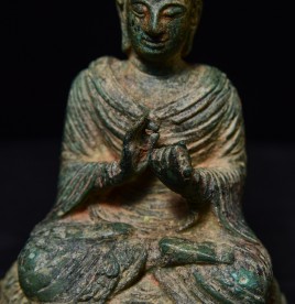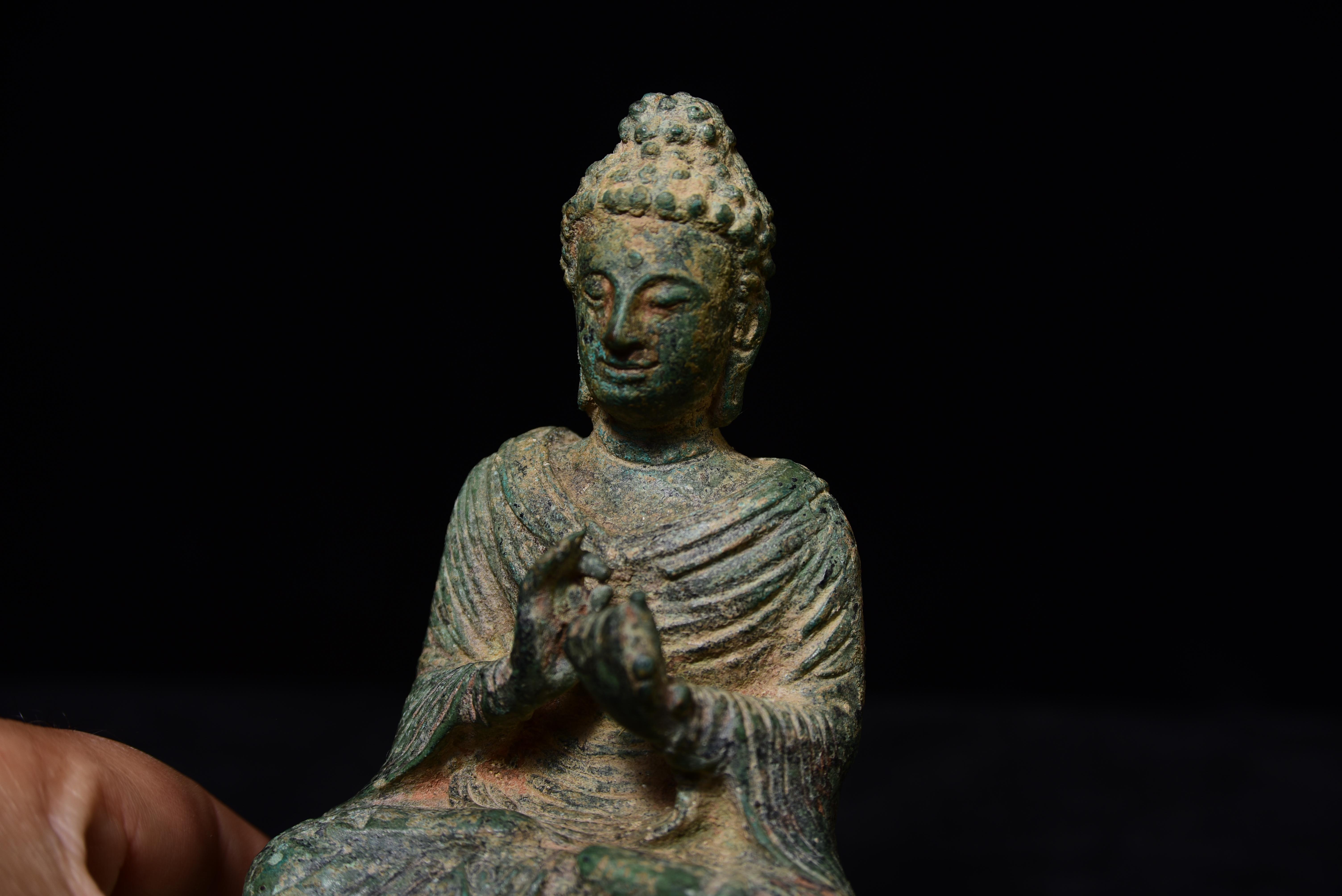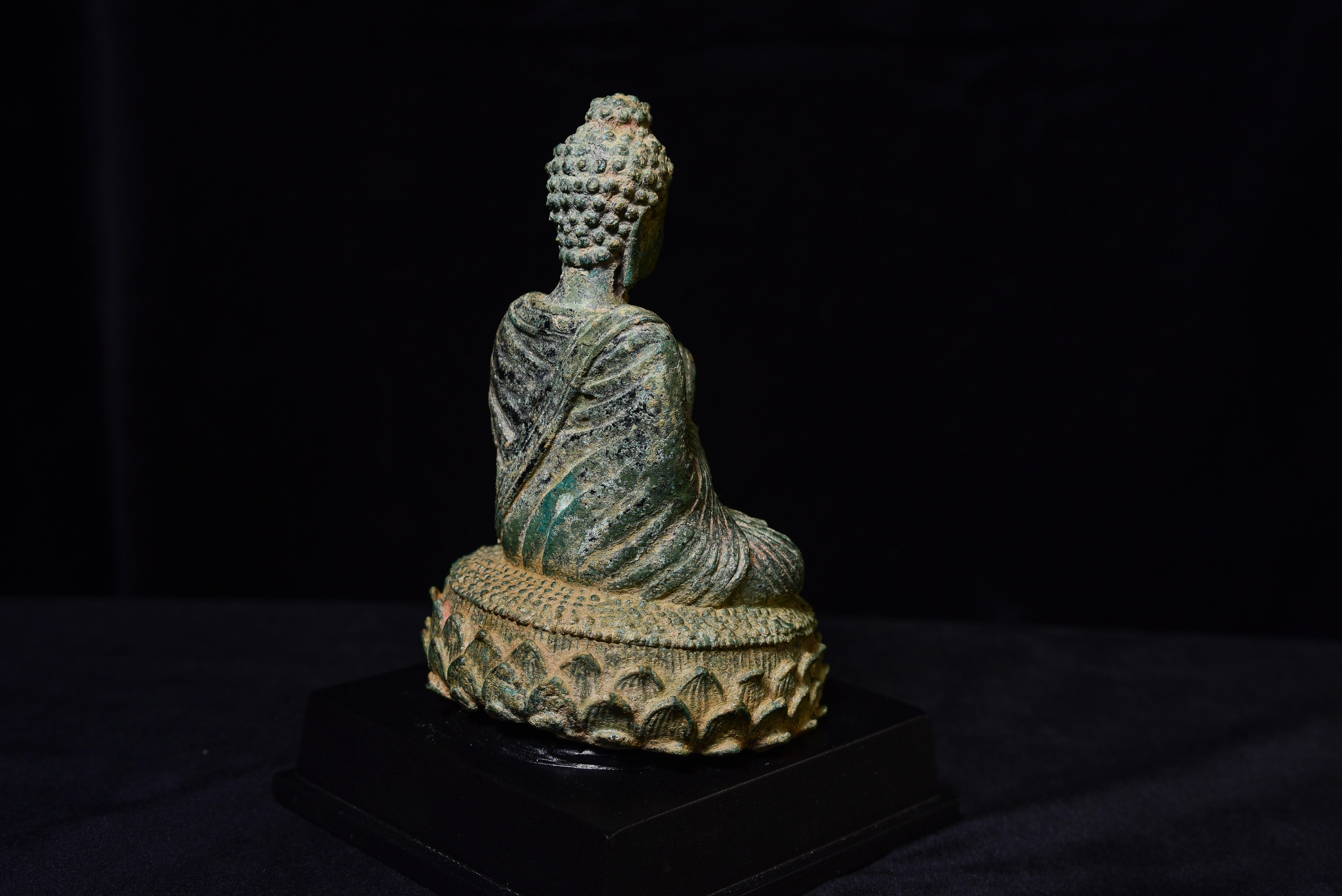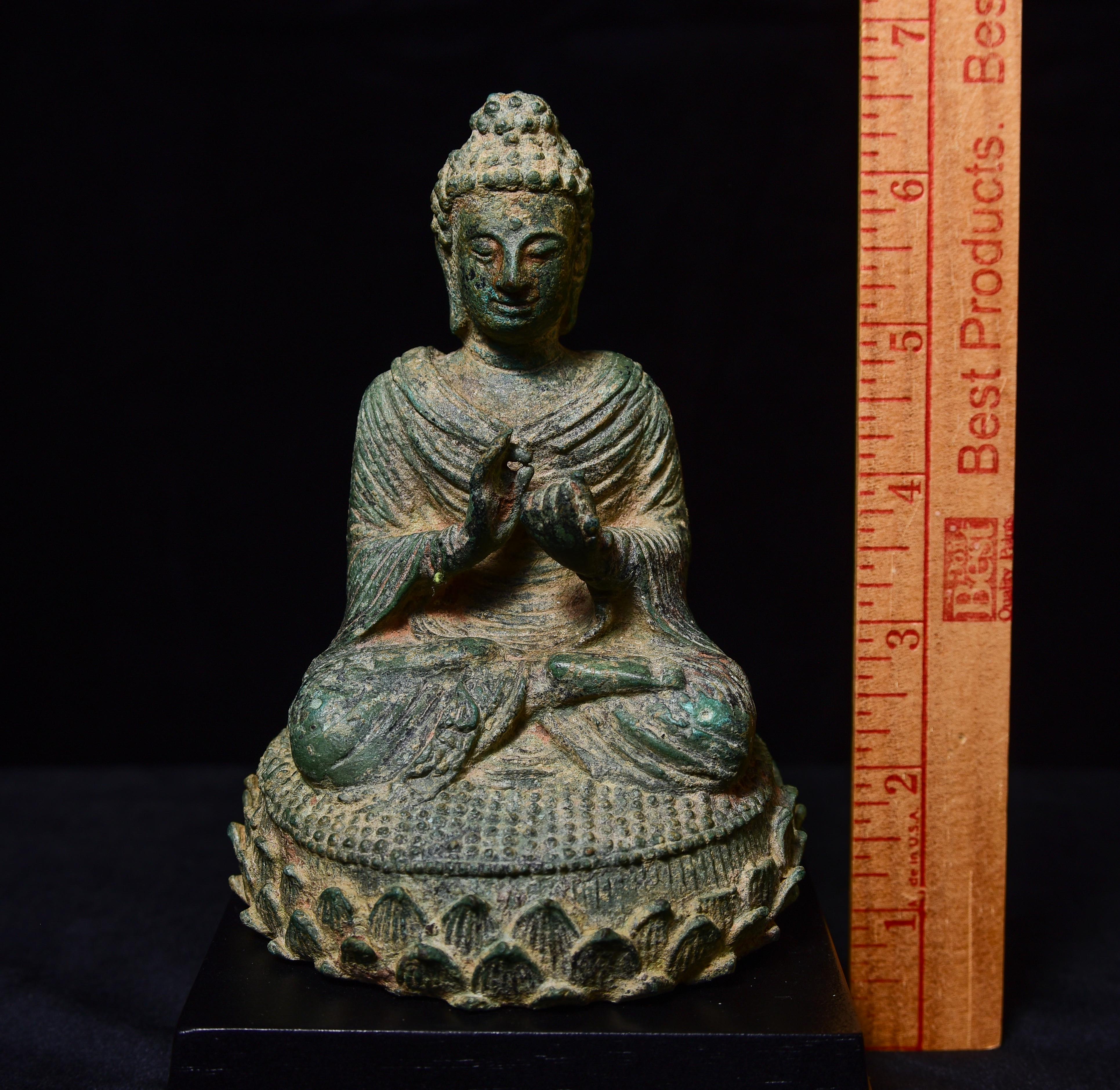 This piece, as per the catalog of the exhibition was formerly displayed at Tibet House in New York City as c.2nd century A.D. as a bronze Uddiyana Buddha (early central Asian) modeled in the round seated on a lotus flower, hands held in a teaching mudra, with detailing to the hair, face, garments, and floral base. It weighs 520 grams, 13.5 cm high (5 1/4 in."). Acquired 1996 by Dr. Paul Singer, New Jersey, USA. from the ‘Buckingham Collection’, from the late Nik Douglas (1944-2012), renowned author, curator, and Asian art expert. Accompanied by a copy of Nik Douglas's collection cataloging document, with a note with the price (US$43,000). I was in touch with the auction house that helped disperse Part of this collection and asked them why these pieces were sold through a smaller auction house and not through one of the major auction houses given what they were, and they said that Nick Douglas strongly disliked the major auction houses based on several experiences he had in his later life, so he directed his (Now Widow, Living in the Caribbean), To use only smaller venues to disperse his remaining collection.