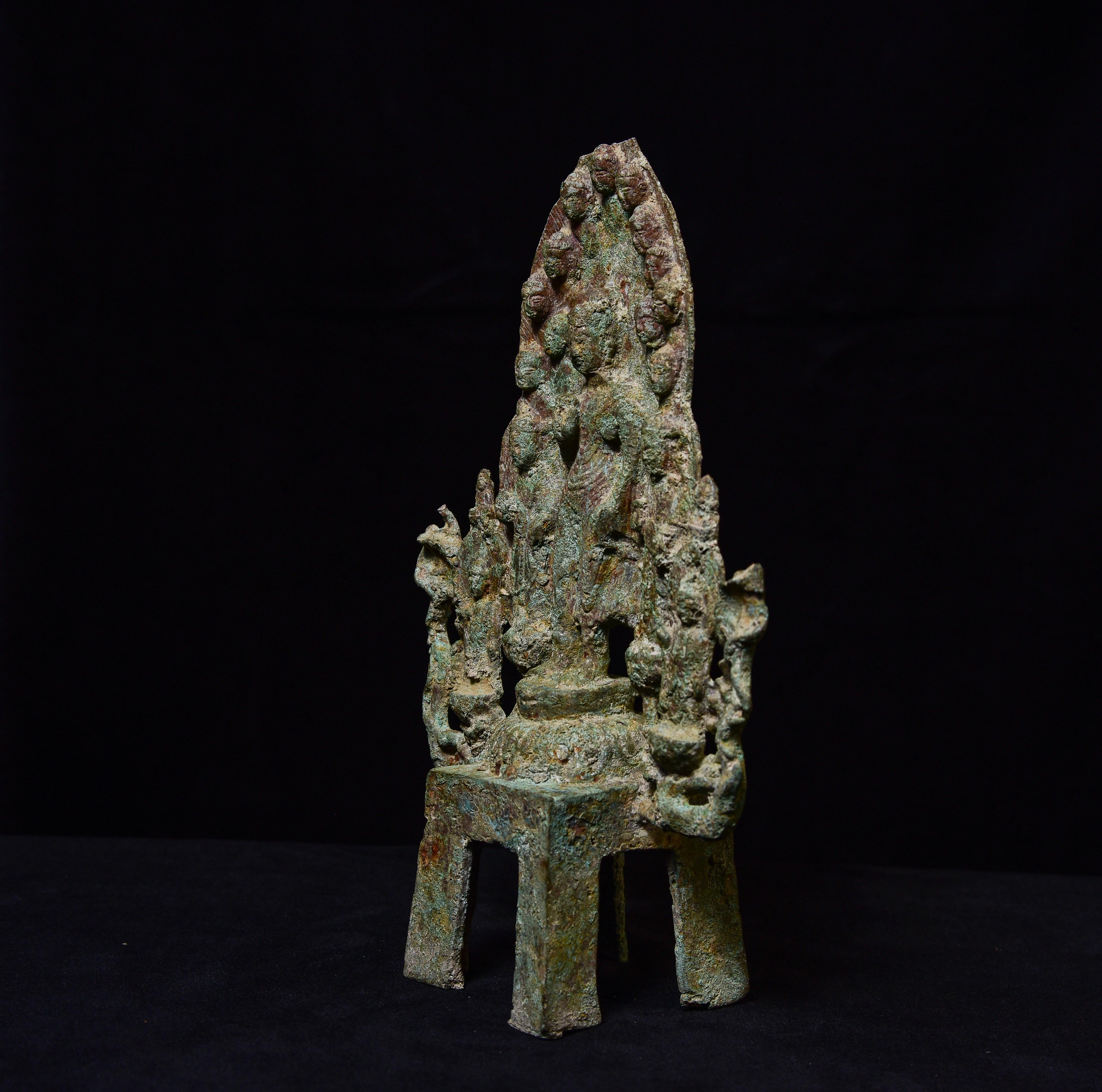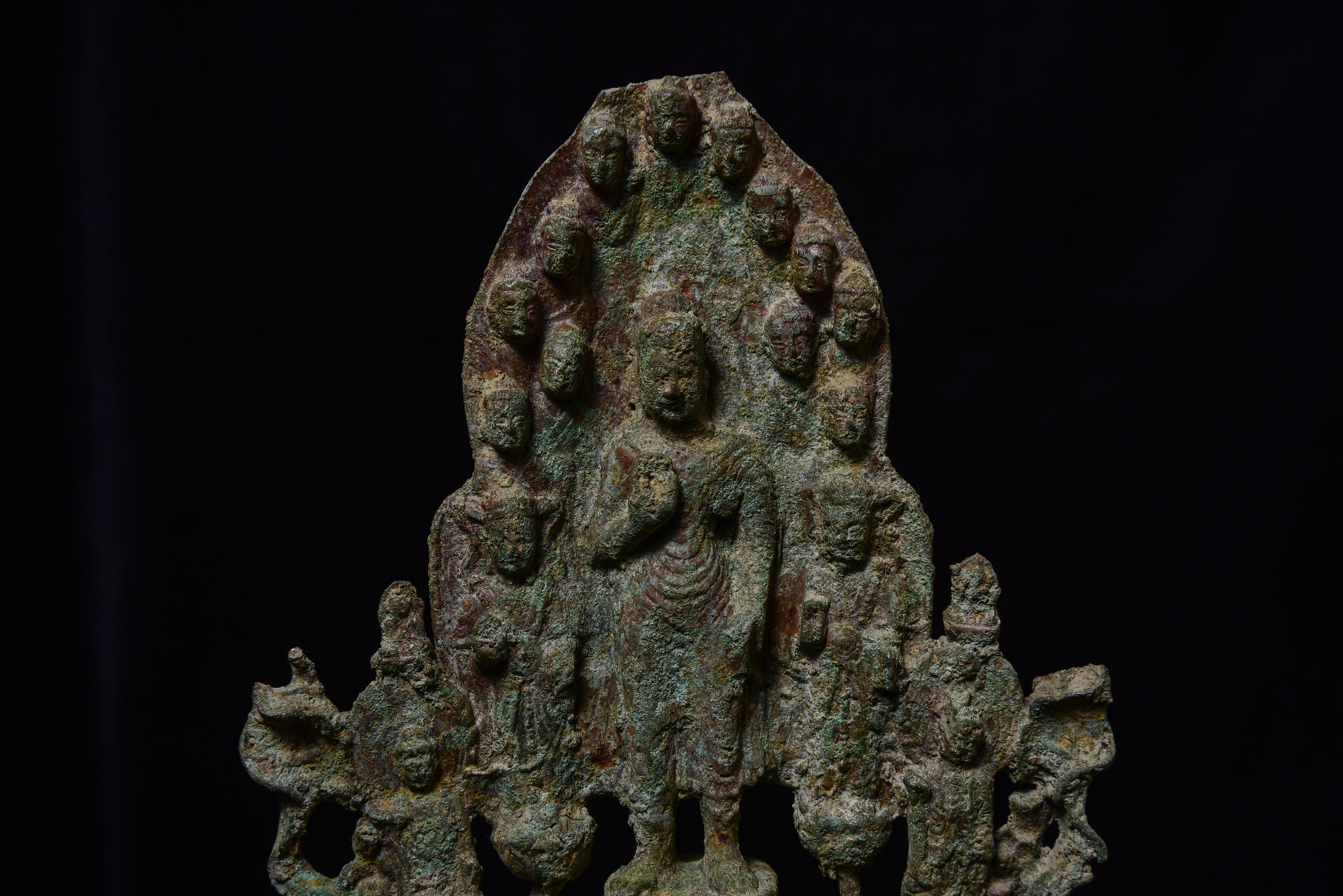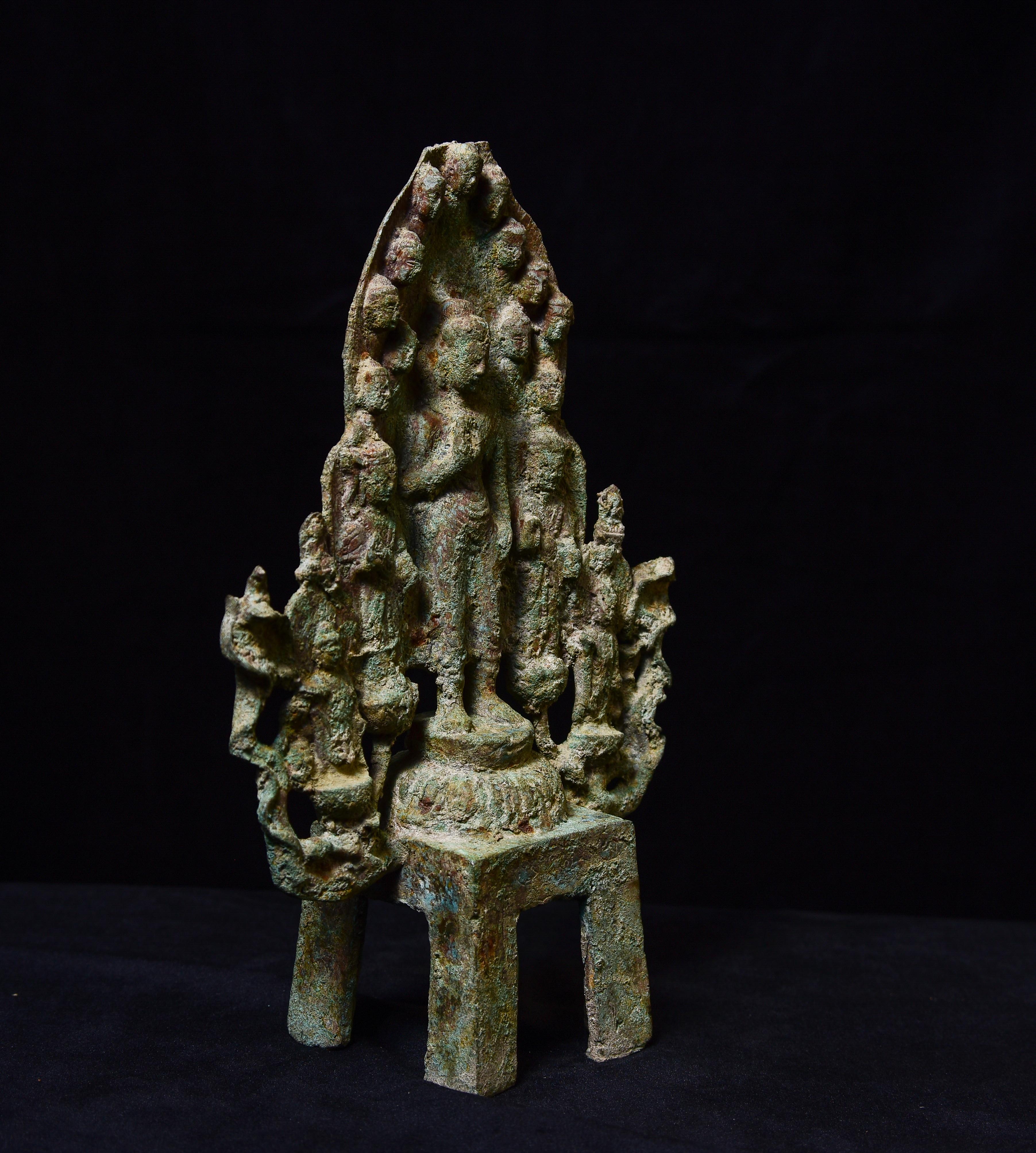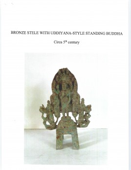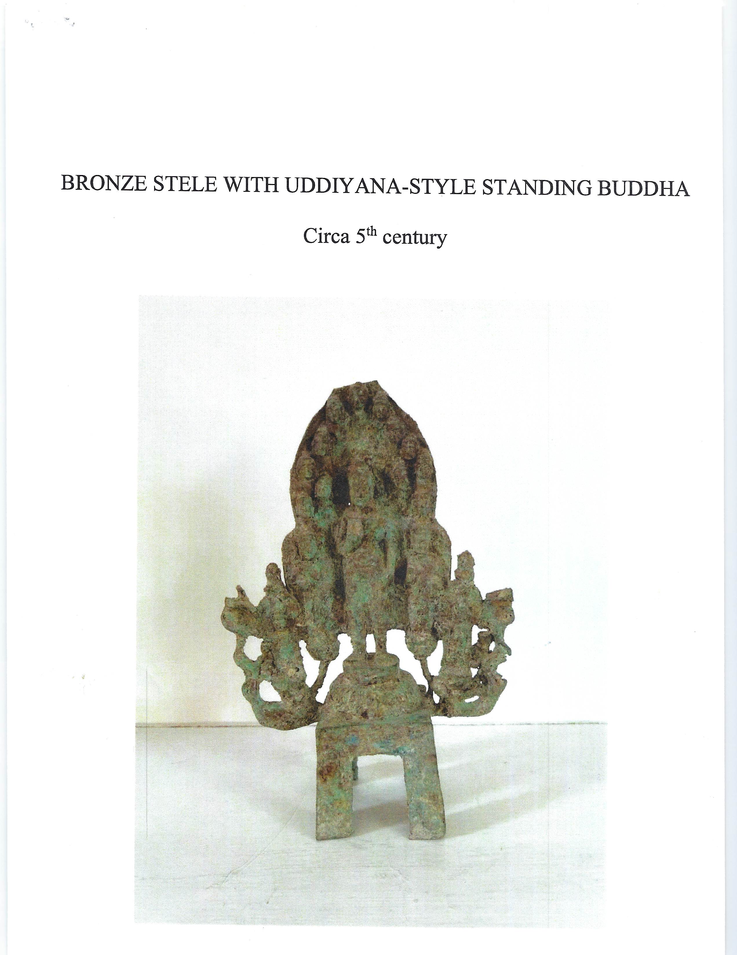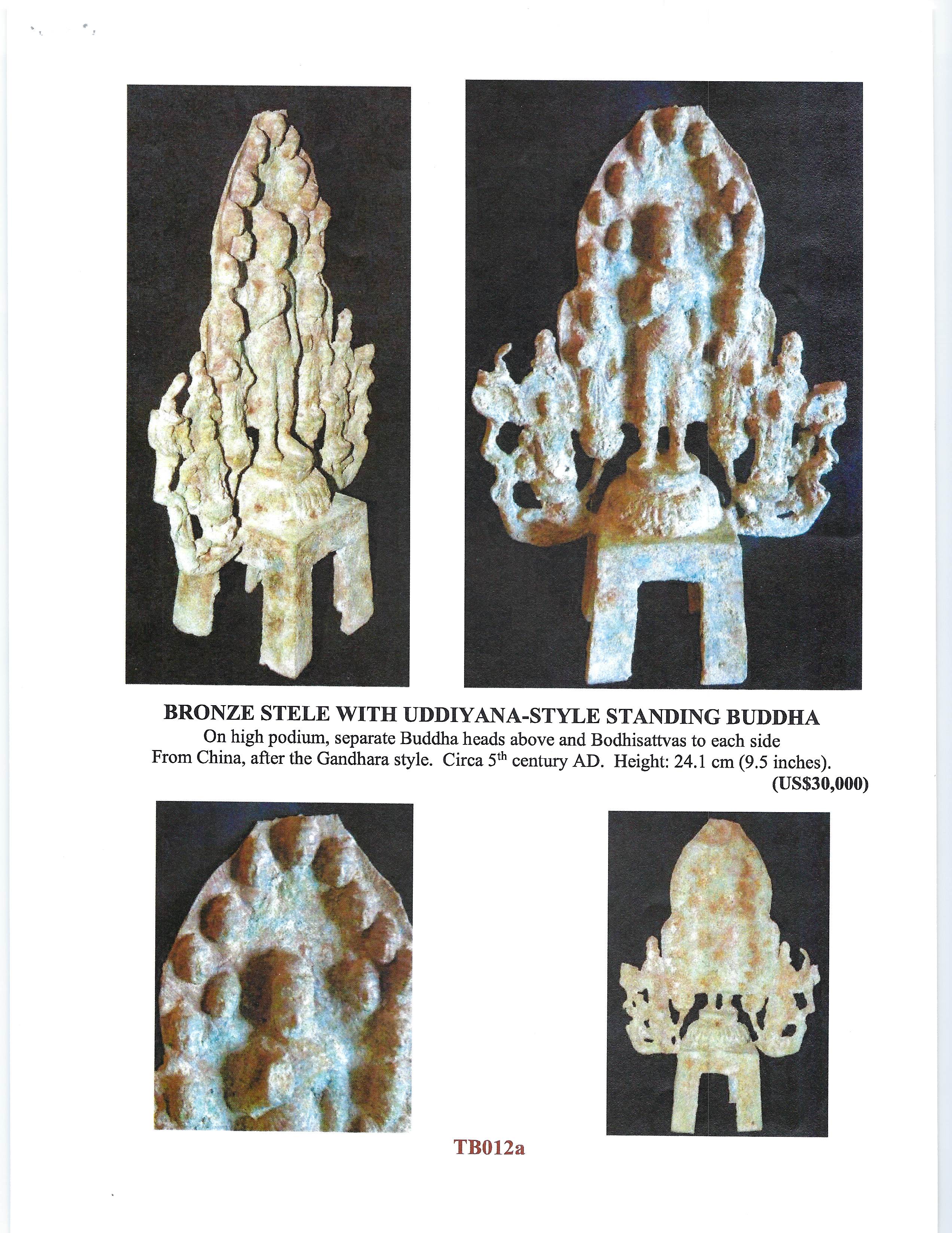 Purchased at an exhibition at Tibet House in New York, Where it was on display as part of the Buckingham Collection. As per the Exhibition Catalogue: A bronze stele with a trefoil body, mounted on a four-legged base, Uddiyana-style Buddha standing at the center, Bodhisattvas to each side; after the Gandharan style." 1.04 kg, 23.8 cm high (9 3/8 in.")". Acquired from the Buckingham Collection by the late Nik Douglas (1944-2012), a renowned author, curator, and Asian art expert.?Accompanied by a copy of the relevant Uddiyana exhibition catalog pages (I only have a copy of the photo-copied pages which are shown in the listing), including an image of this lot featured in one of the display cases (p.176): Exhibition catalog cat.no.UD-28, p.30 & TB012, p.162. Accompanied by a copy of Nik Douglas's collection cataloging document and notes with price (US$30,000), see photos of this in the listing). Given what they were, I was in touch with the auction house that helped disperse Part of this collection and asked them why these pieces were sold through a smaller auction house and not through one of the major auction houses. They said that Nick Douglas strongly disliked the major auction houses based on several experiences he had in his later life, so he directed his (Now Widow, Living in the Caribbean) To use only smaller venues to disperse his remaining collection. Please see the photos to see these documents. I also have a photo of the cover of the exhibition catalog. This type of piece is outside my usual area of expertise. I purchased the three pieces mainly on the reputation of Nick Douglas, the Buckingham Collection, and the Tibet House. I feel the piece later, as the patina and form are so unusual. It might have some age but is not a period piece, though the people who vetted the Buckingham collection are far more knowledgeable than I in this area. The start price was significantly reduced.