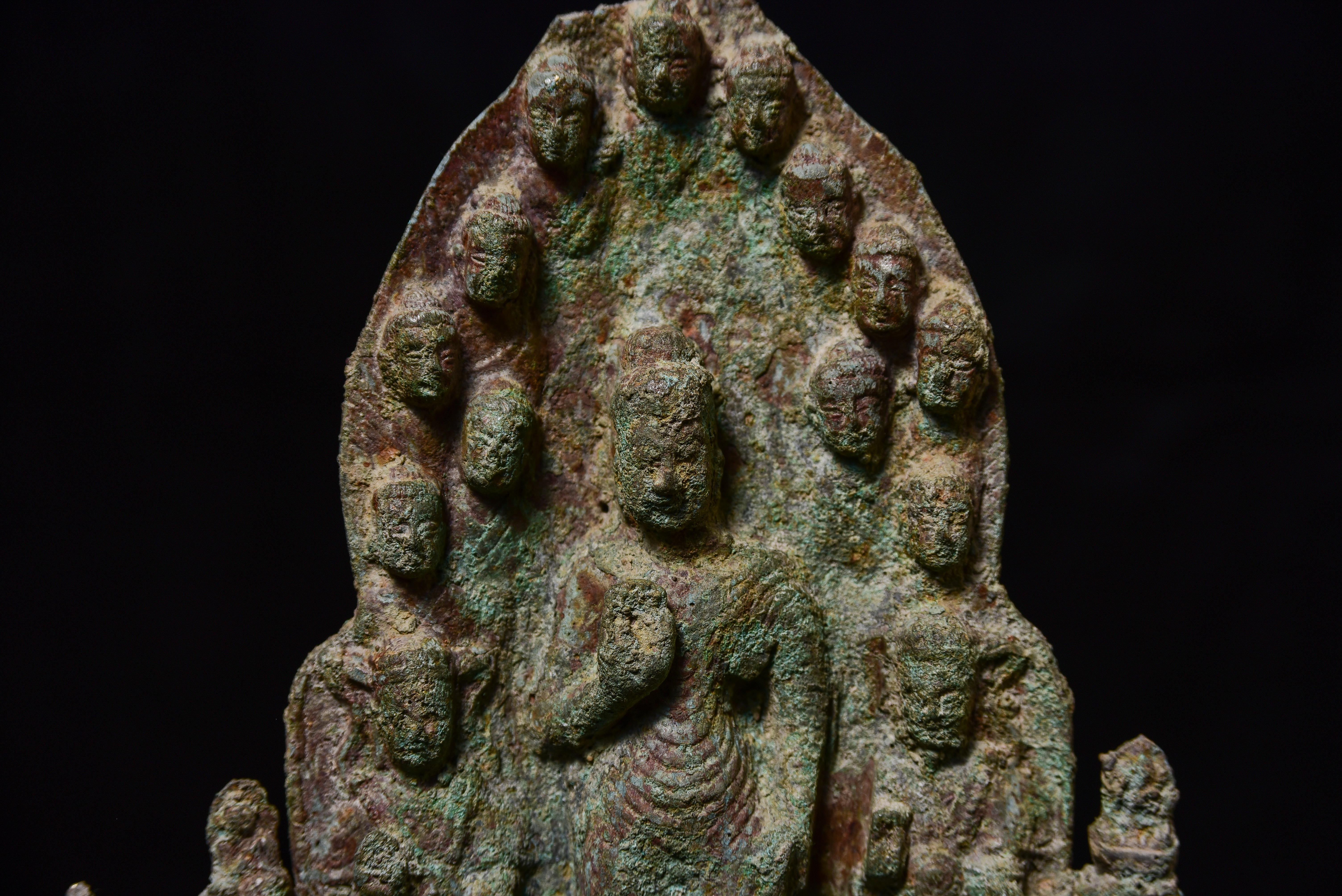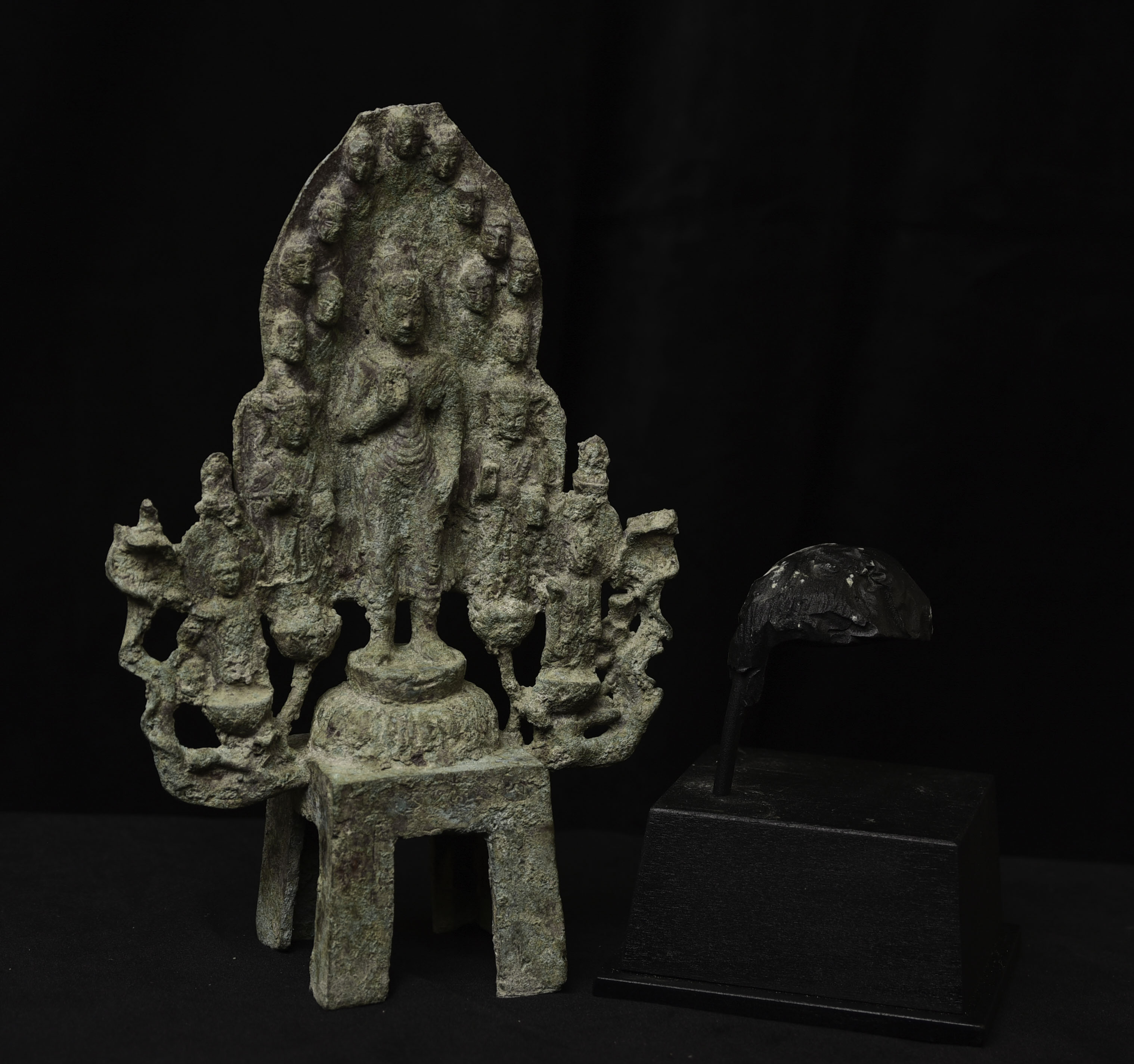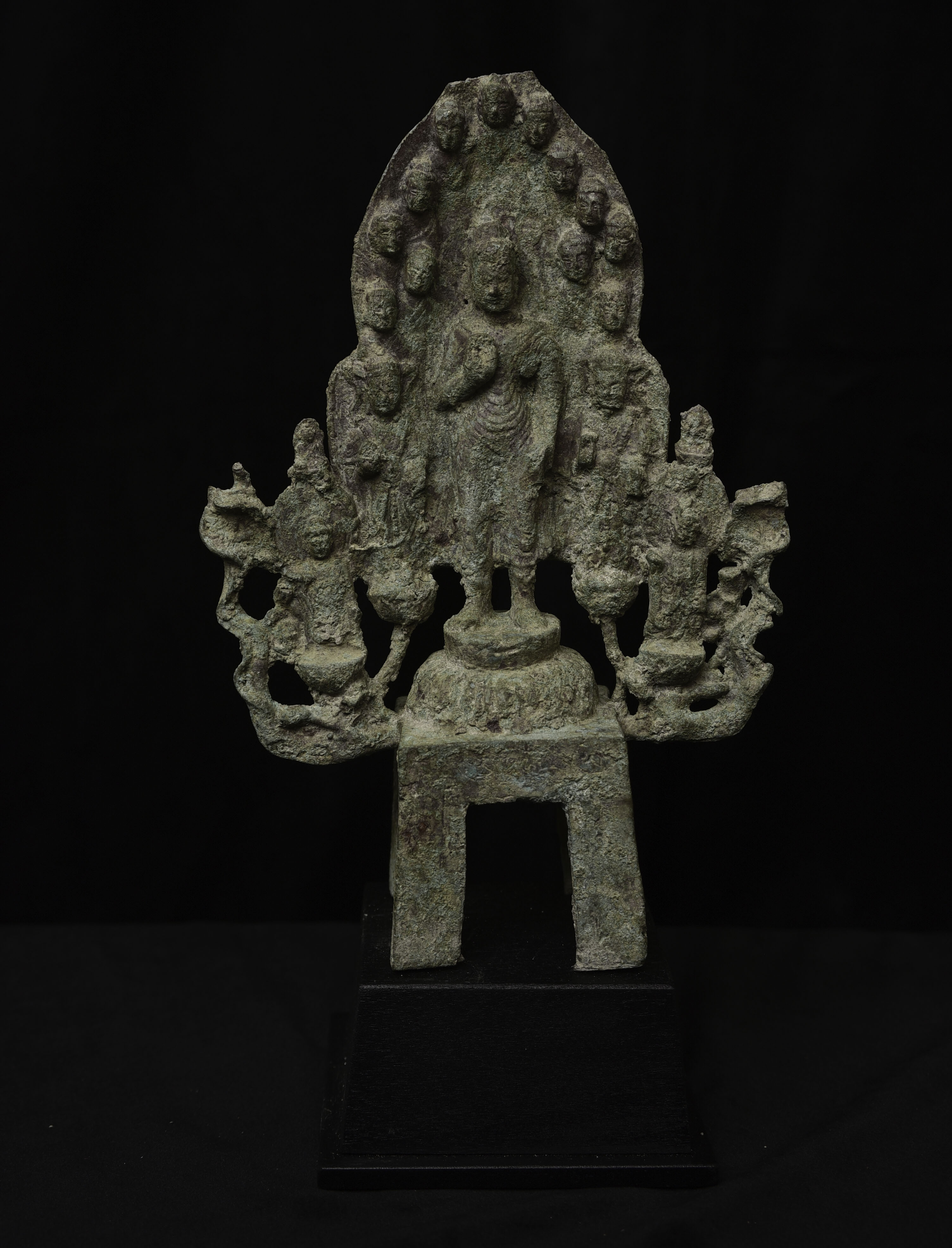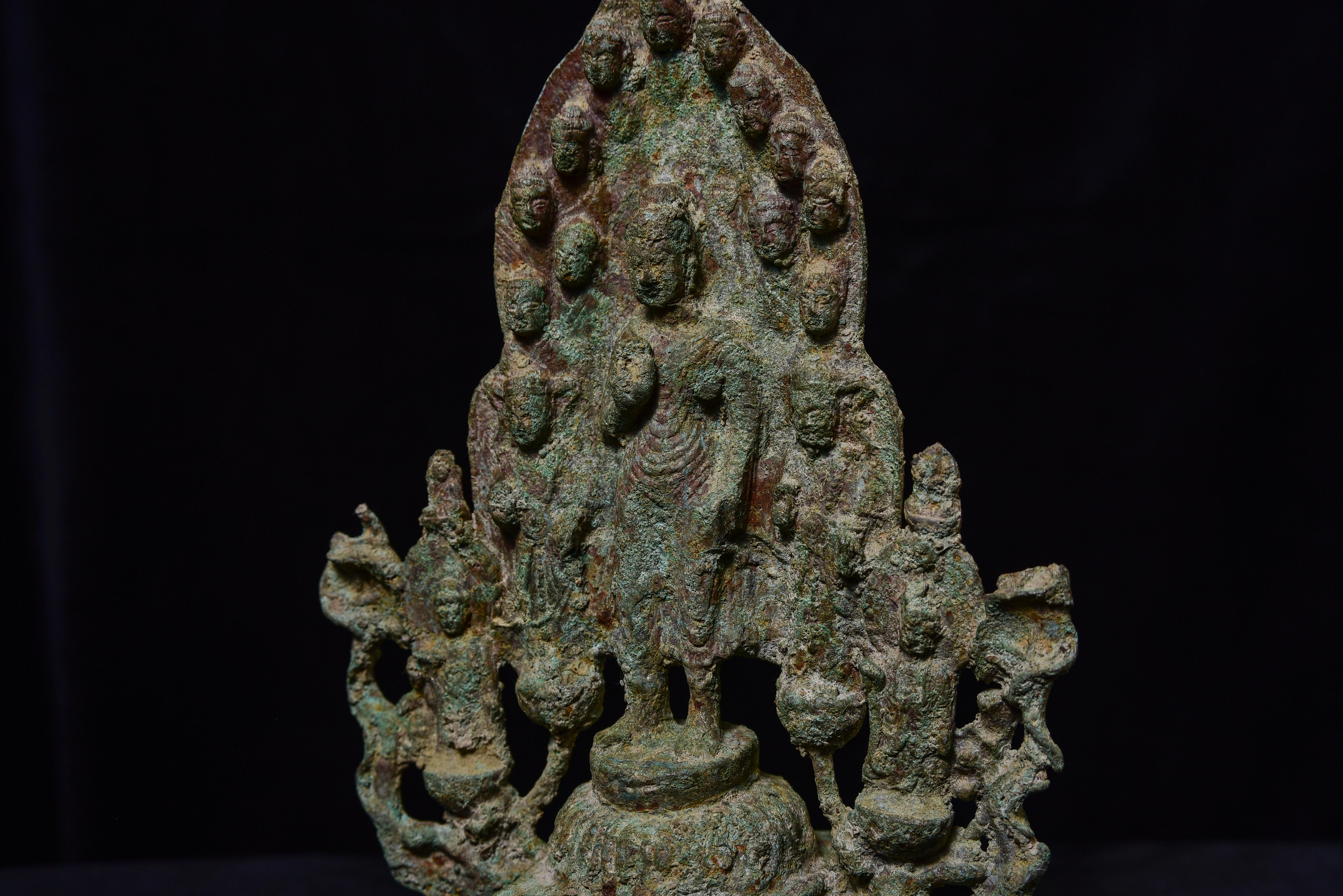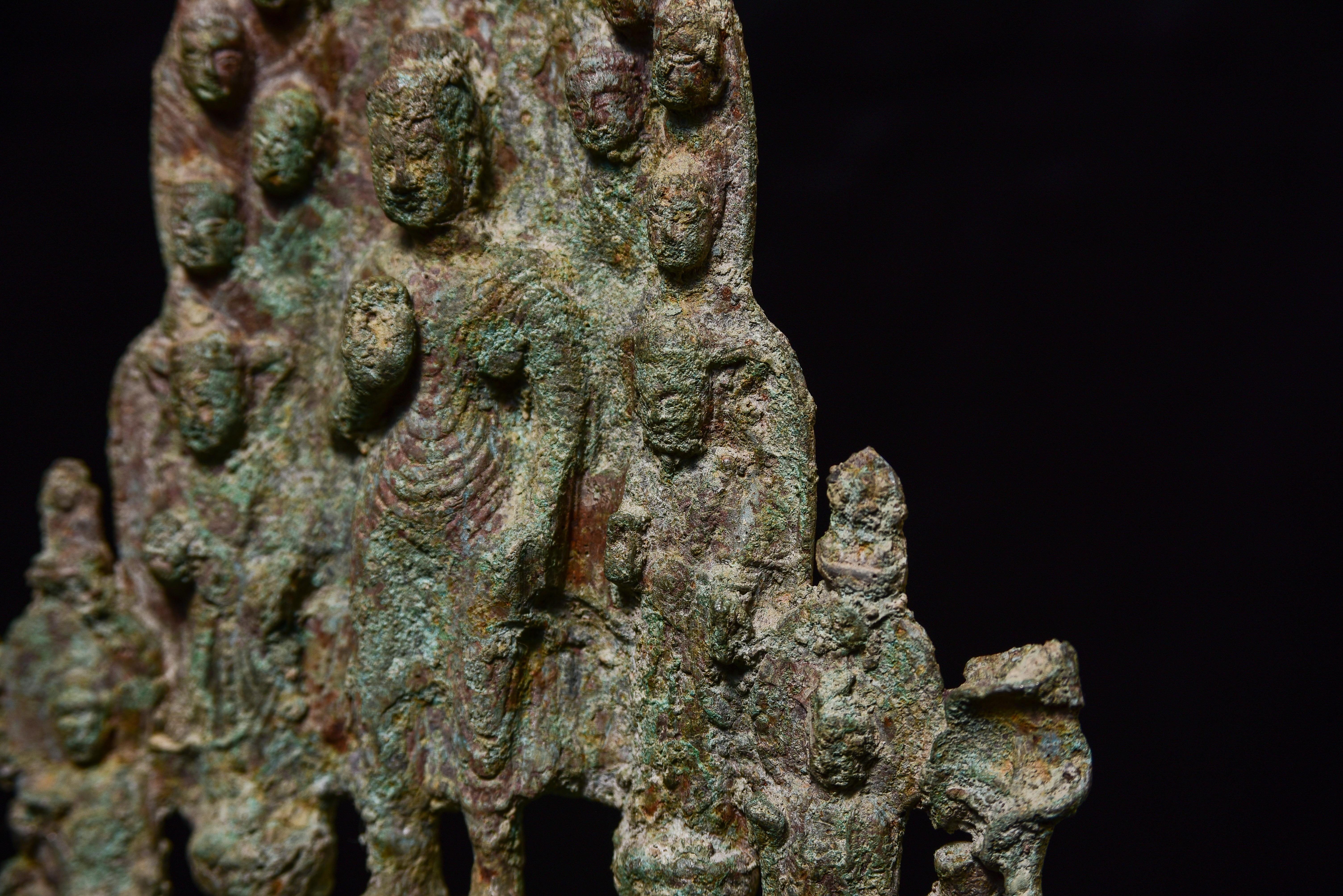Purchased at an exhibition at Tibet House in New York, Where it was on display as part of the Buckingham Collection. As per the Exhibition Catalogue: A bronze stele with a trefoil body, mounted on a four-legged base, Uddiyana-style Buddha standing at the center, Bodhisattvas to each side; after the Gandharan style." 1.04 kg, 23.8 cm high (9 3/8 in.")". Acquired from the Buckingham Collection by the late Nik Douglas (1944-2012), a renowned author, curator, and Asian art expert.?Accompanied by a copy of the relevant Uddiyana exhibition catalog pages (I only have a copy of the photo-copied pages which are shown in the listing), including an image of this lot featured in one of the display cases (p.176): Exhibition catalog cat.no.UD-28, p.30 & TB012, p.162. Accompanied by a copy of Nik Douglas's collection cataloging document and notes with price (US$30,000), see photos of this in the listing). Given what they were, I was in touch with the auction house that helped disperse Part of this collection and asked them why these pieces were sold through a smaller auction house and not through one of the major auction houses. They said that Nick Douglas strongly disliked the major auction houses based on several experiences he had in his later life, so he directed his (Now Widow, Living in the Caribbean) To use only smaller venues to disperse his remaining collection. Please see the photos to see these documents. I also have a photo of the cover of the exhibition catalog. This type of piece is outside my usual area of expertise. I purchased the three pieces mainly on the reputation of Nick Douglas, the Buckingham Collection, and the Tibet House. I feel the piece later, as the patina and form are so unusual. It might have some age but is not a period piece, though the people who vetted the Buckingham collection are far more knowledgeable than I in this area. The start price was significantly reduced.
