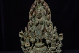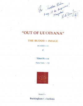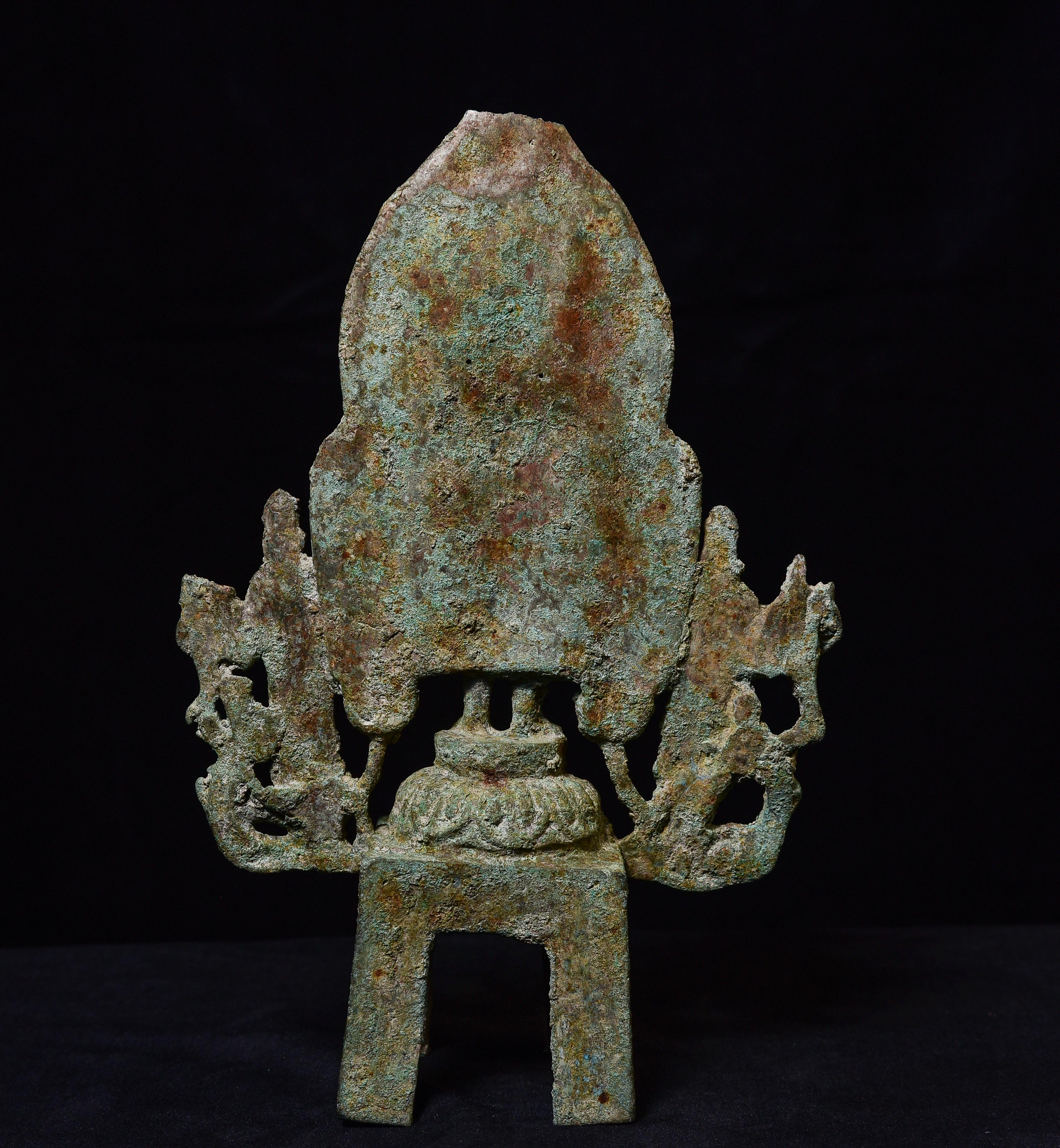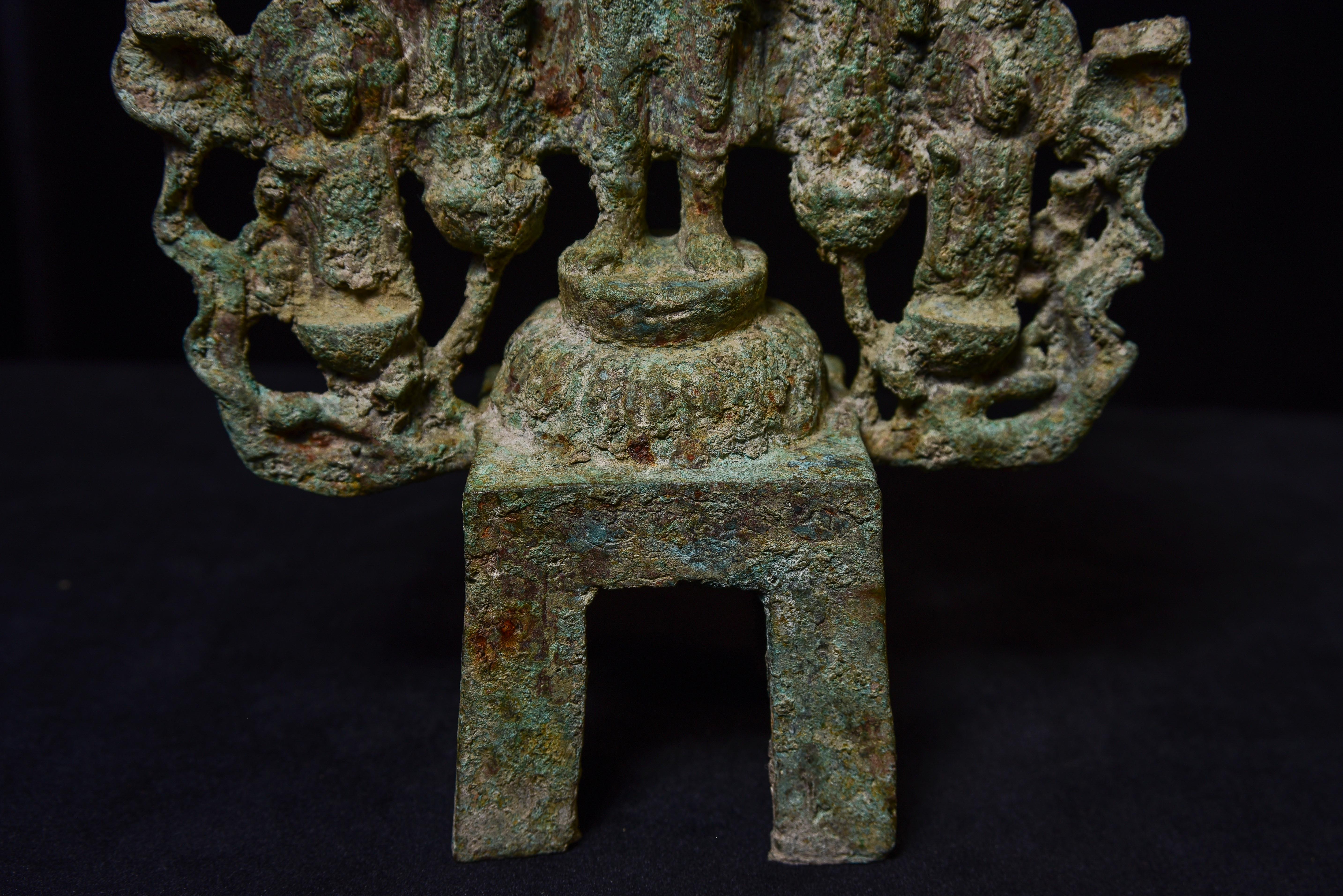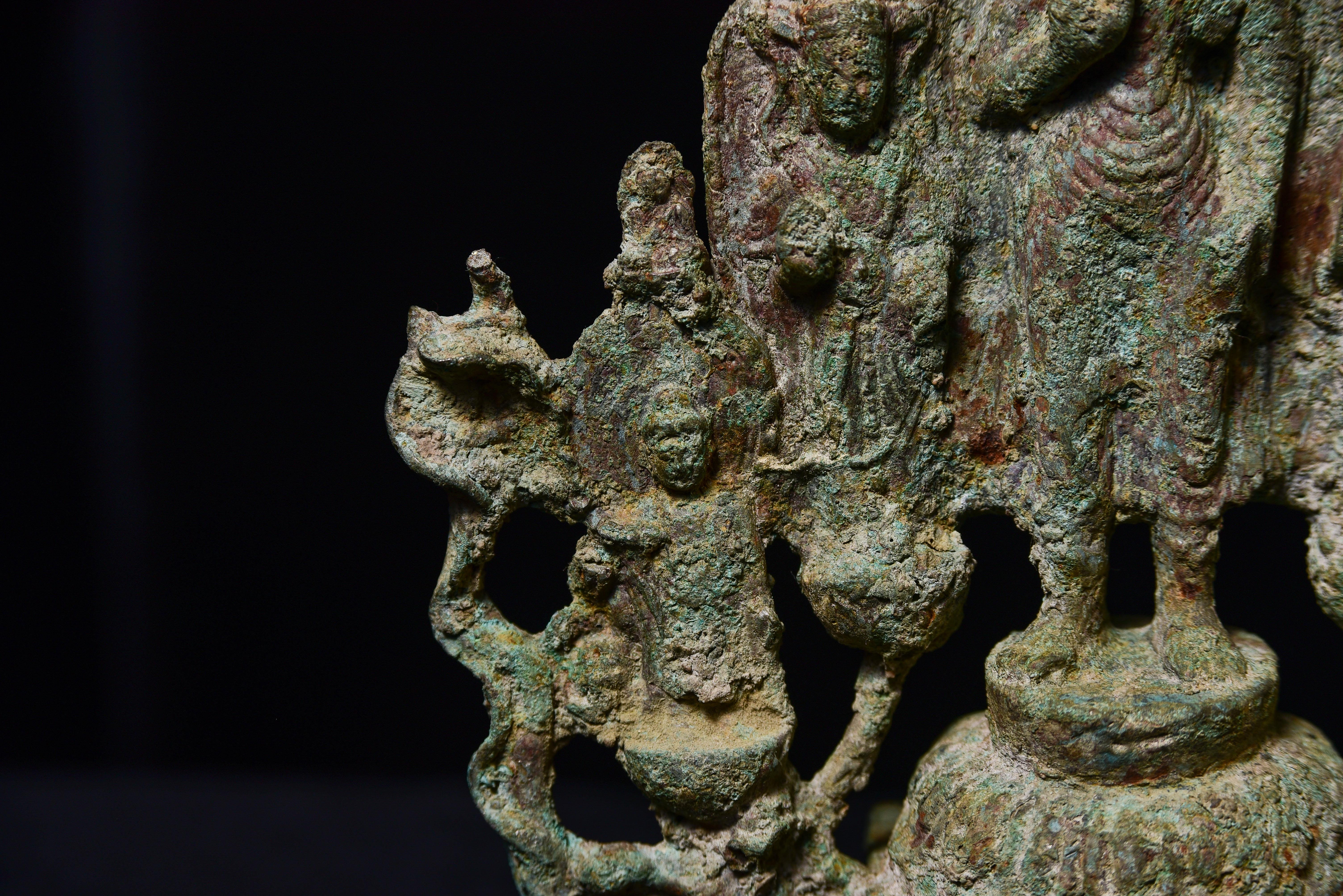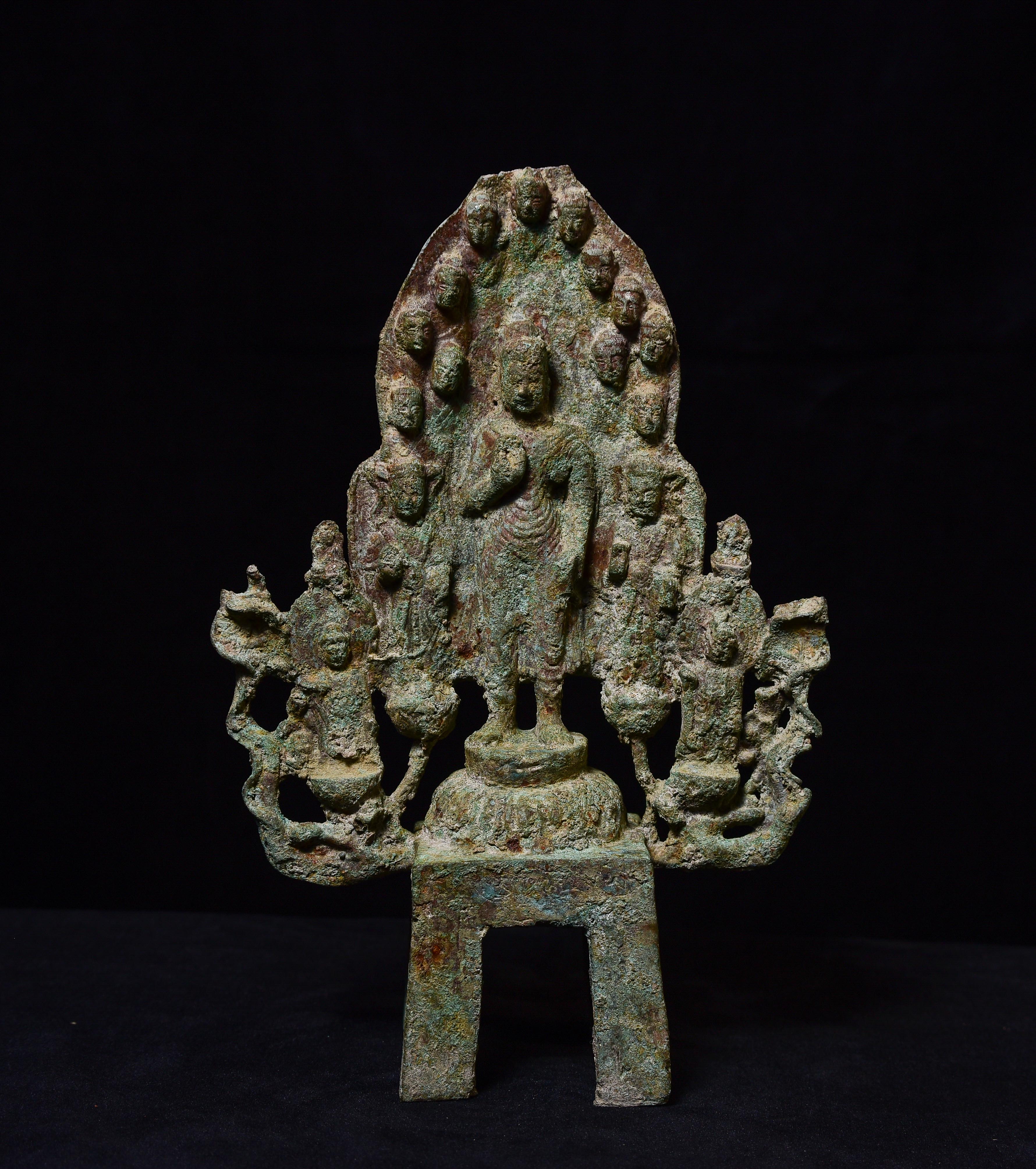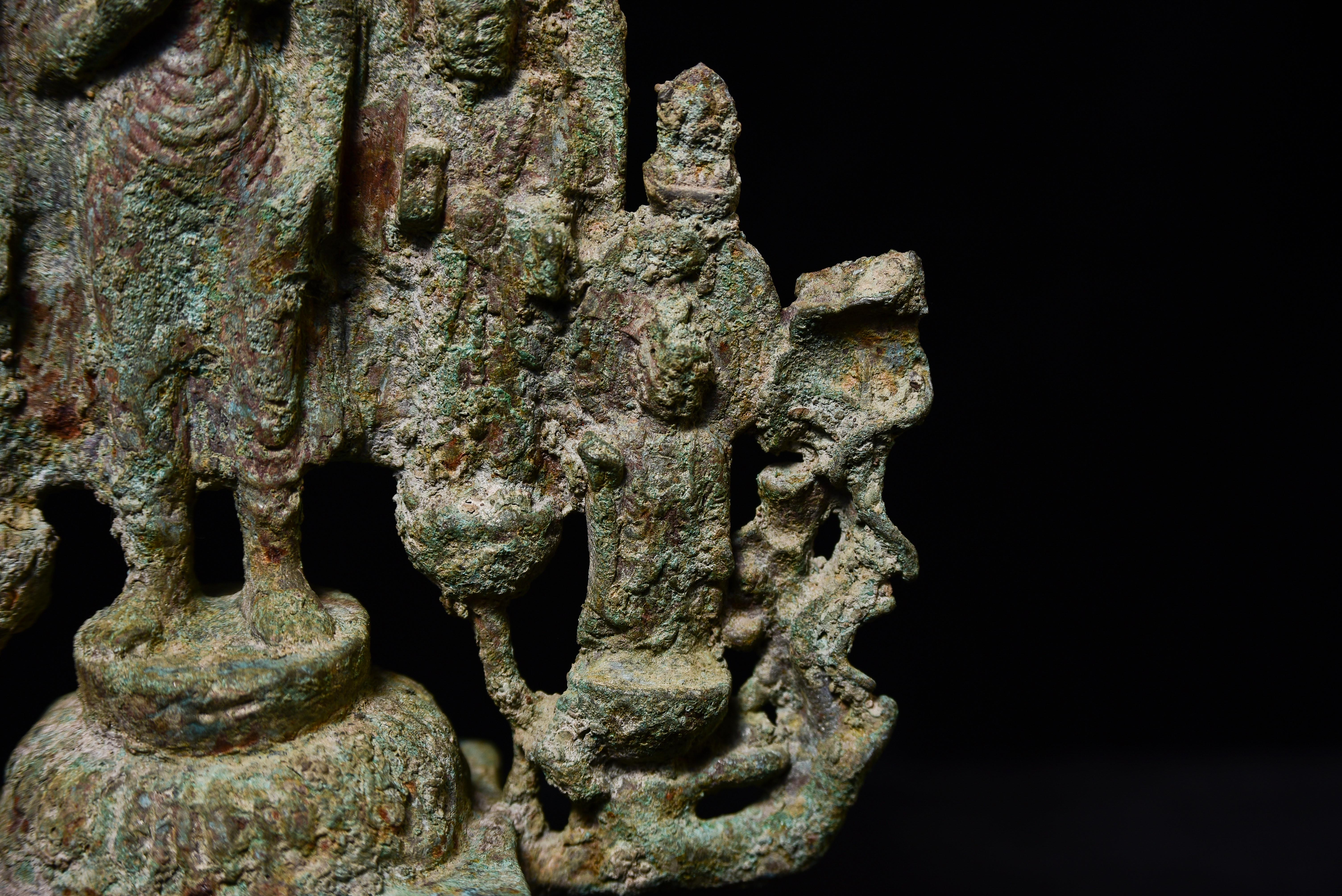 Purchased at an exhibition at Tibet House in New York, Where it was on display as part of the Buckingham Collection. As per the Exhibition Catalogue: A bronze stele with a trefoil body, mounted on a four-legged base, Uddiyana-style Buddha standing at the center, Bodhisattvas to each side; after the Gandharan style." 1.04 kg, 23.8 cm high (9 3/8 in.")". Acquired from the Buckingham Collection by the late Nik Douglas (1944-2012), a renowned author, curator, and Asian art expert.?Accompanied by a copy of the relevant Uddiyana exhibition catalog pages (I only have a copy of the photo-copied pages which are shown in the listing), including an image of this lot featured in one of the display cases (p.176): Exhibition catalog cat.no.UD-28, p.30 & TB012, p.162. Accompanied by a copy of Nik Douglas's collection cataloging document and notes with price (US$30,000), see photos of this in the listing). Given what they were, I was in touch with the auction house that helped disperse Part of this collection and asked them why these pieces were sold through a smaller auction house and not through one of the major auction houses. They said that Nick Douglas strongly disliked the major auction houses based on several experiences he had in his later life, so he directed his (Now Widow, Living in the Caribbean) To use only smaller venues to disperse his remaining collection. Please see the photos to see these documents. I also have a photo of the cover of the exhibition catalog. This type of piece is outside my usual area of expertise. I purchased the three pieces mainly on the reputation of Nick Douglas, the Buckingham Collection, and the Tibet House. I feel the piece later, as the patina and form are so unusual. It might have some age but is not a period piece, though the people who vetted the Buckingham collection are far more knowledgeable than I in this area. The start price was significantly reduced.