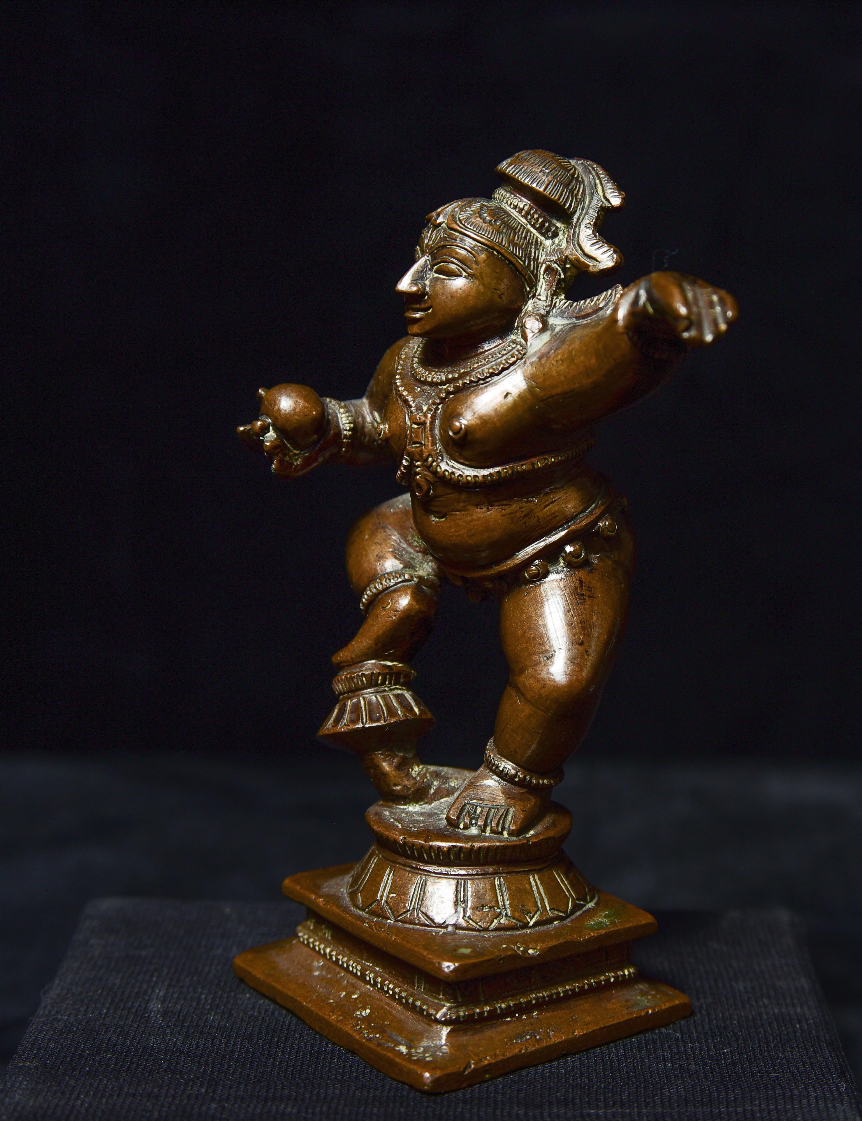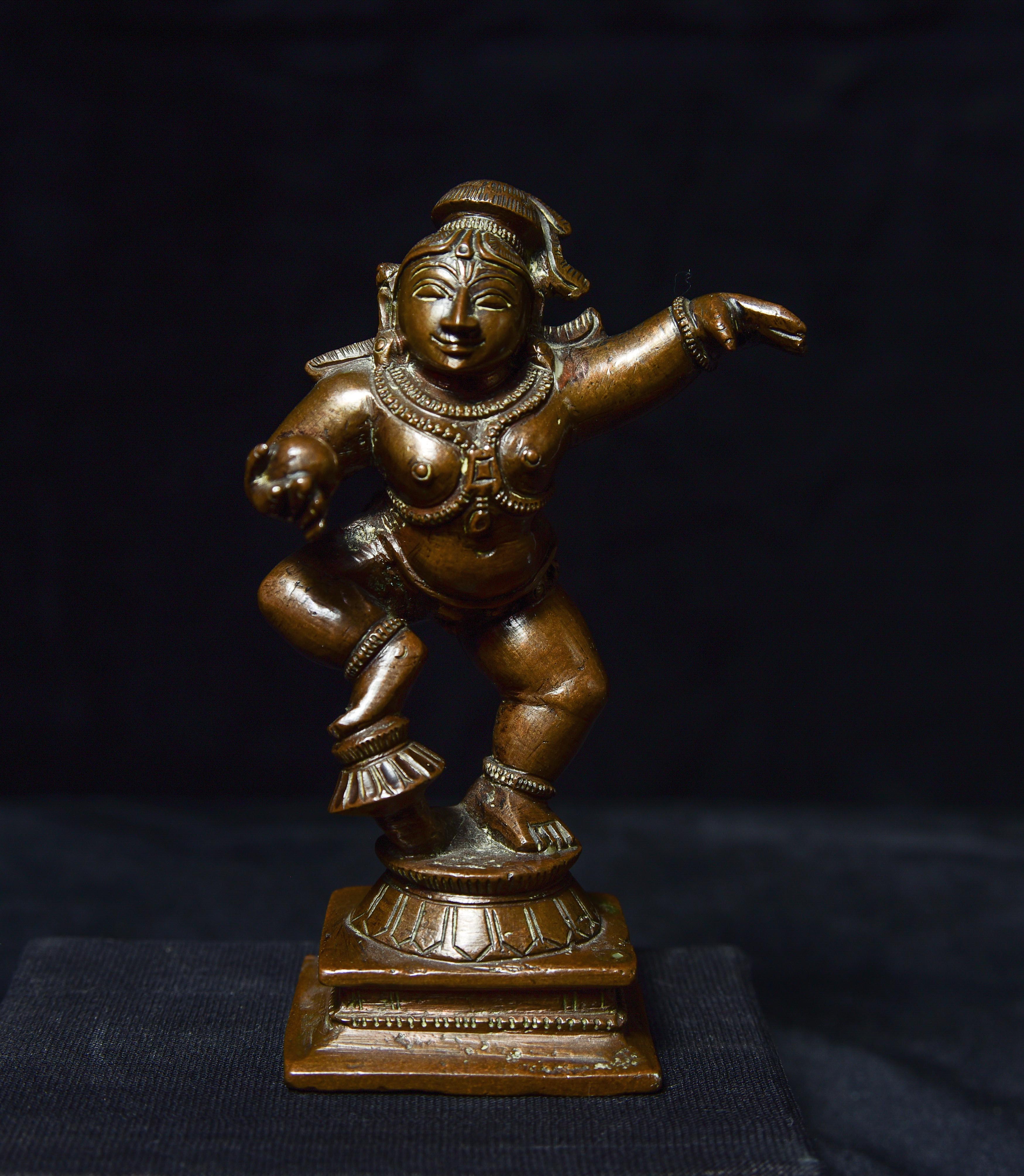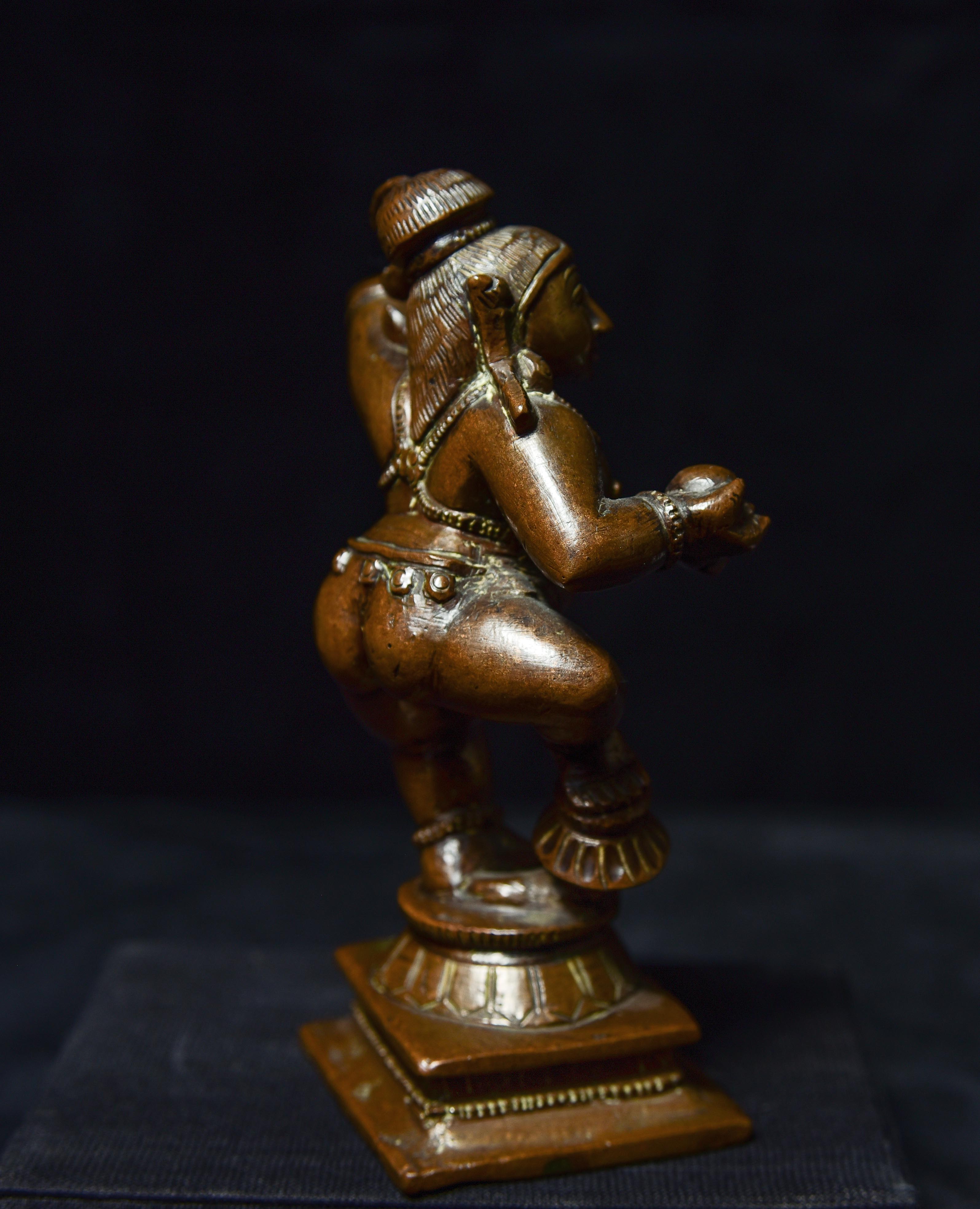 Antique Solid-Cast Hindu Bronze from India. 4.25" tall, base measures approximately 1.75" square. Very joyous!