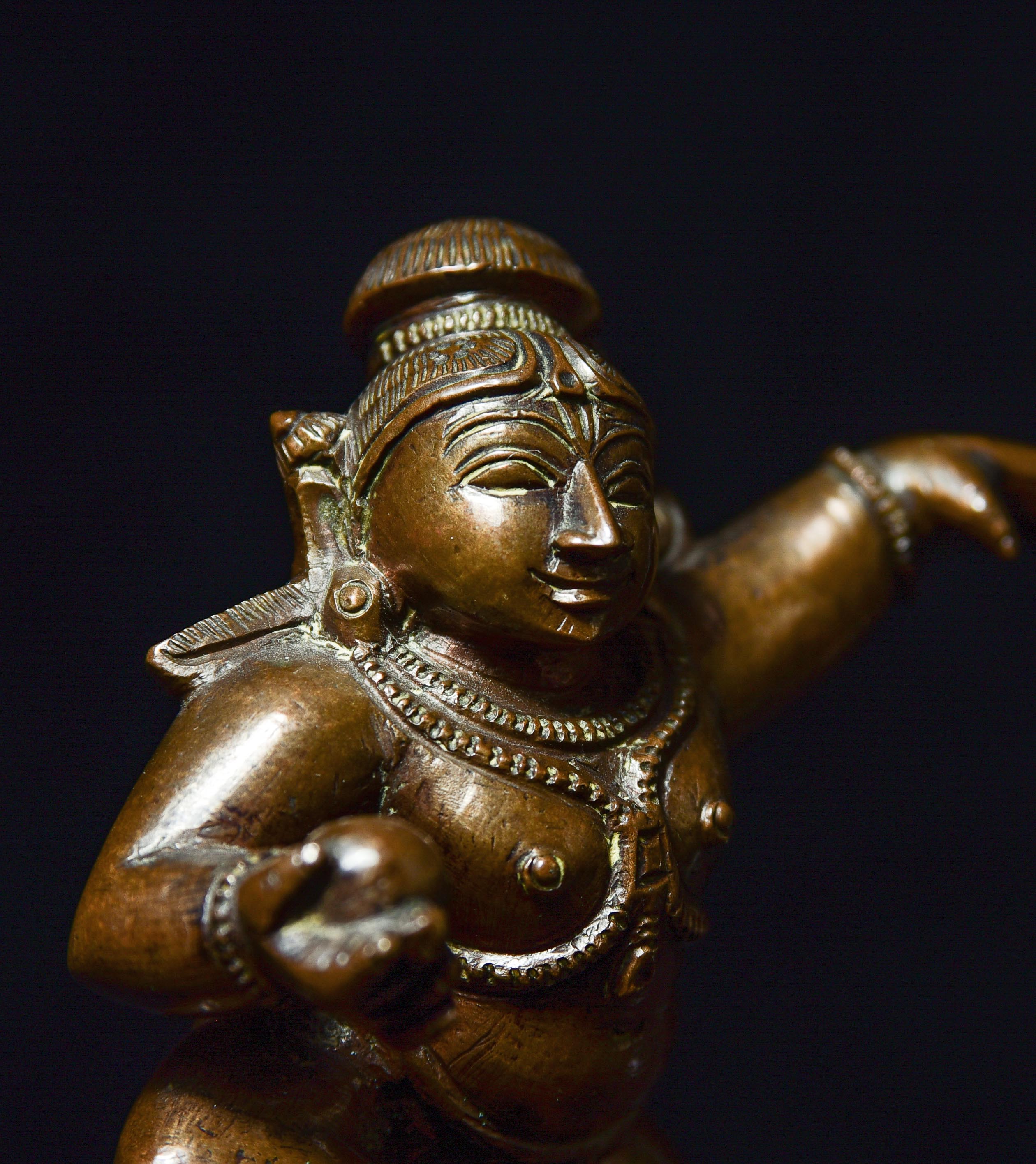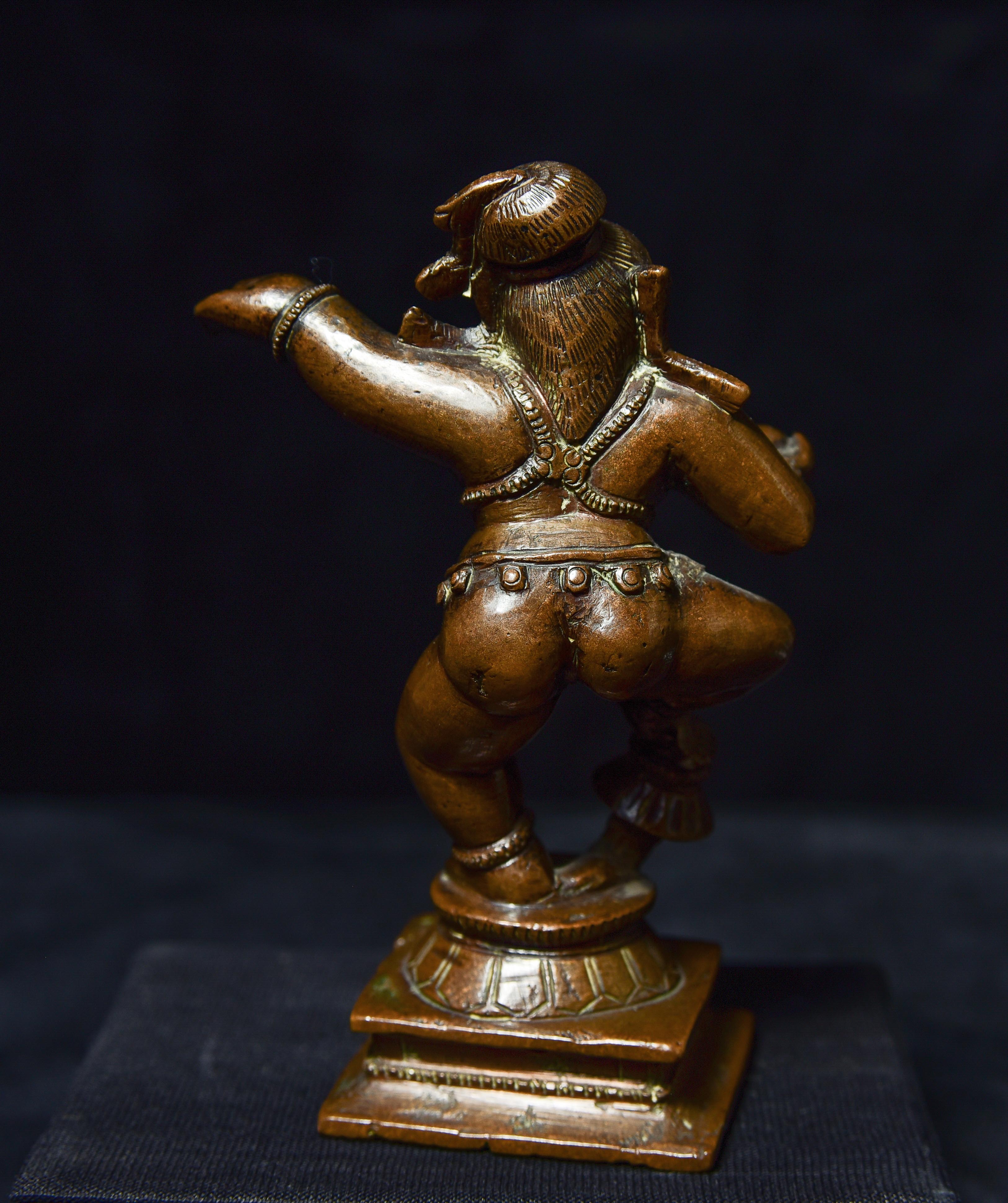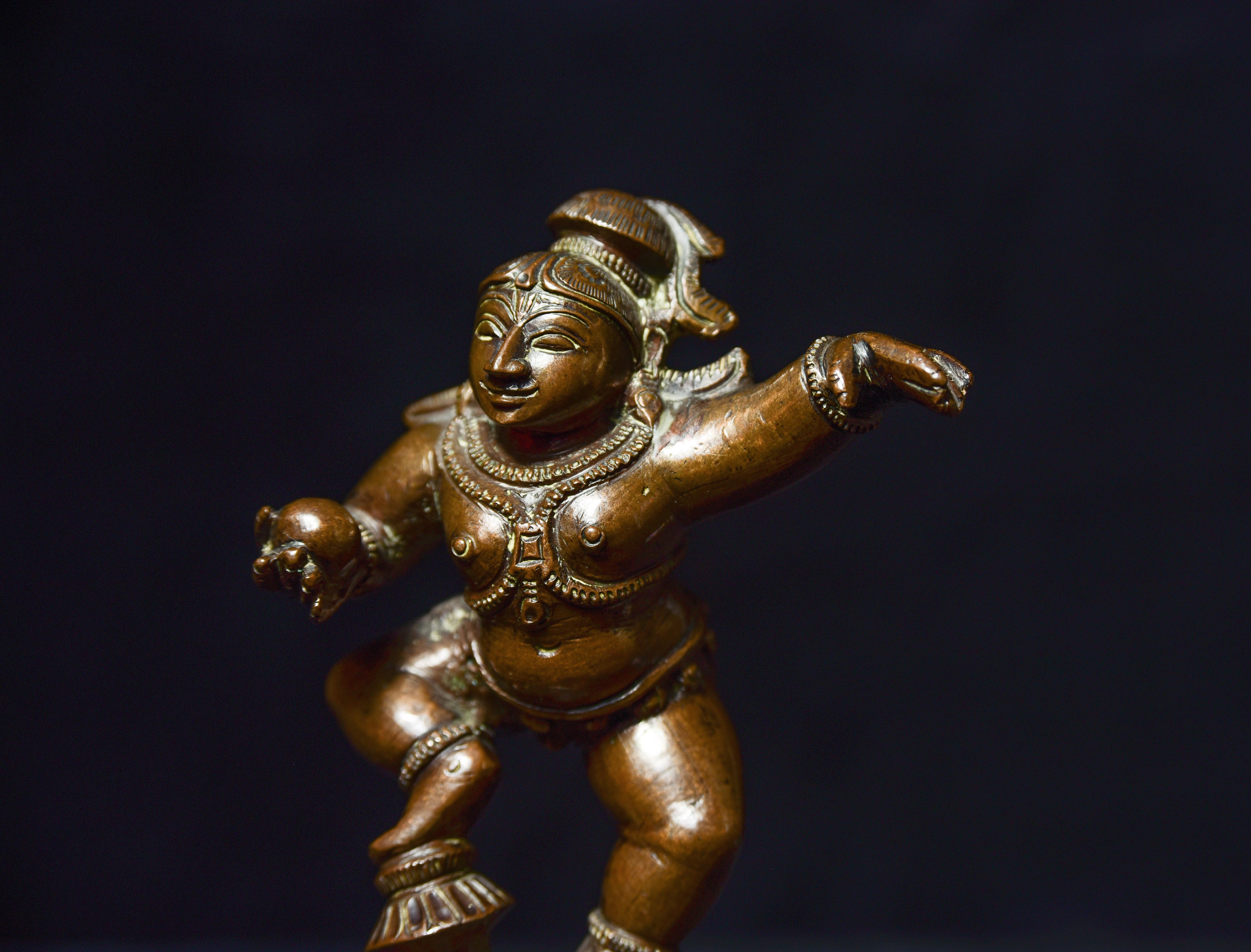 Antique Solid-Cast Hindu Bronze from India. 4.25" tall, base measures approximately 1.75" square. Very joyous!