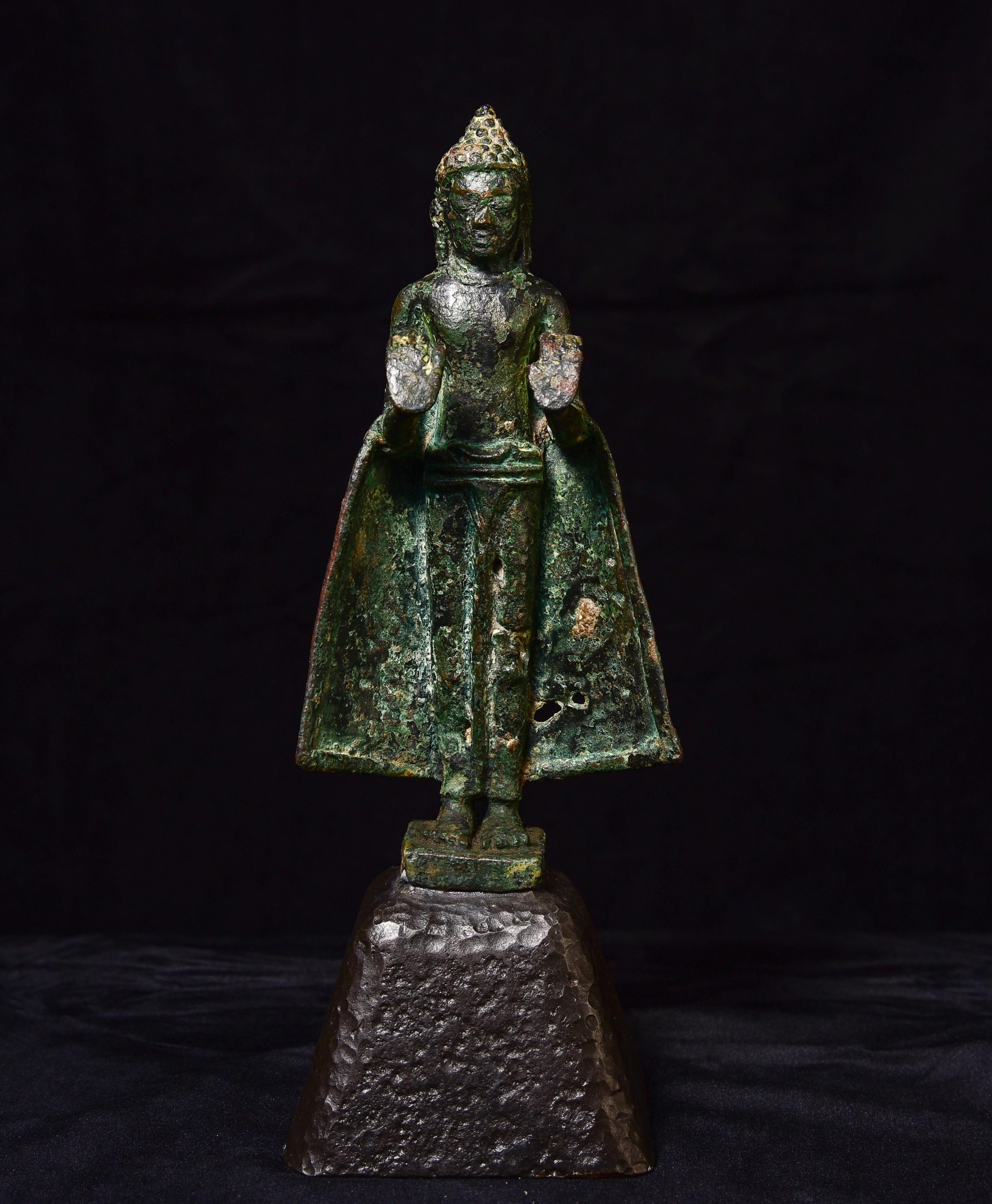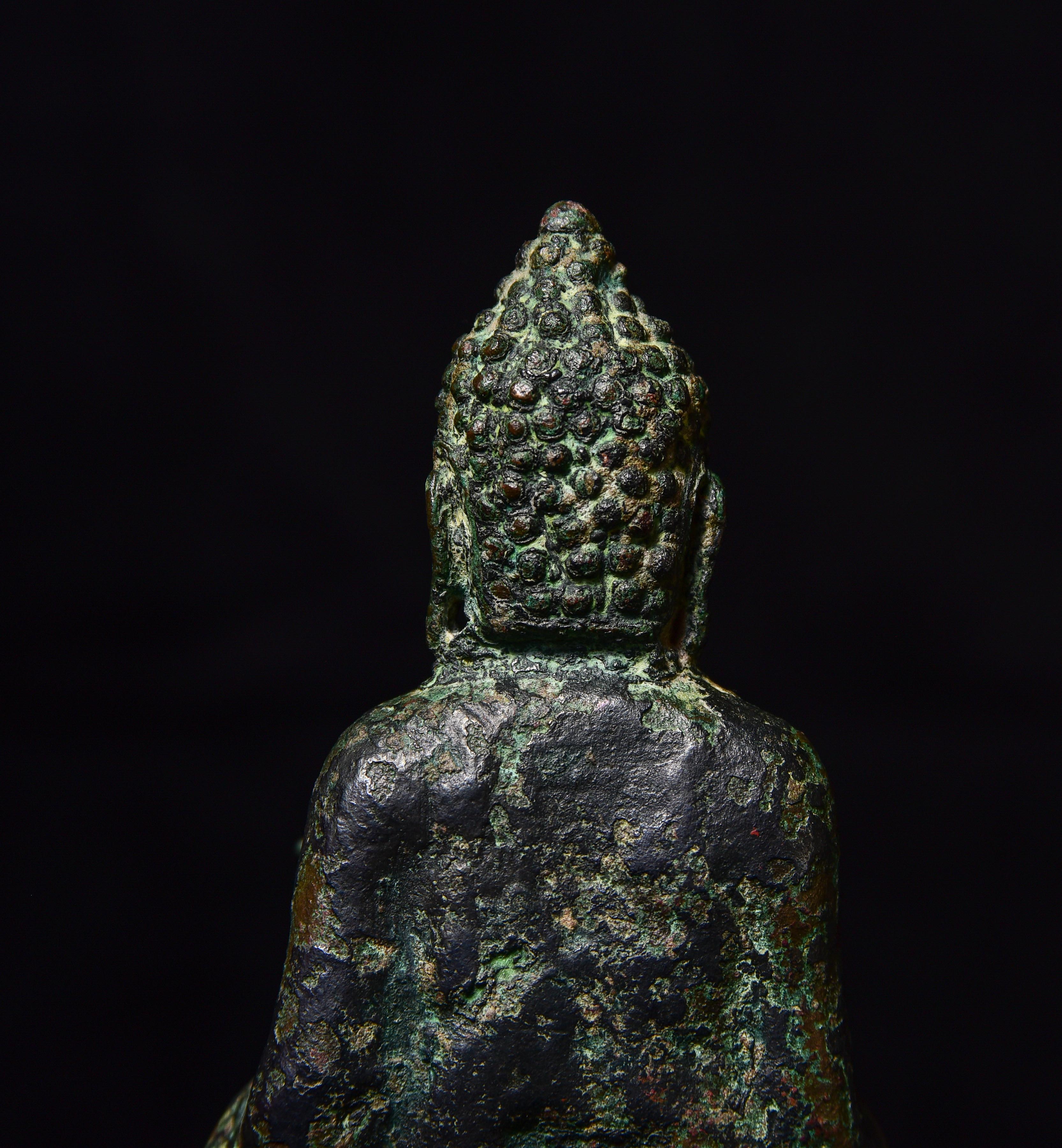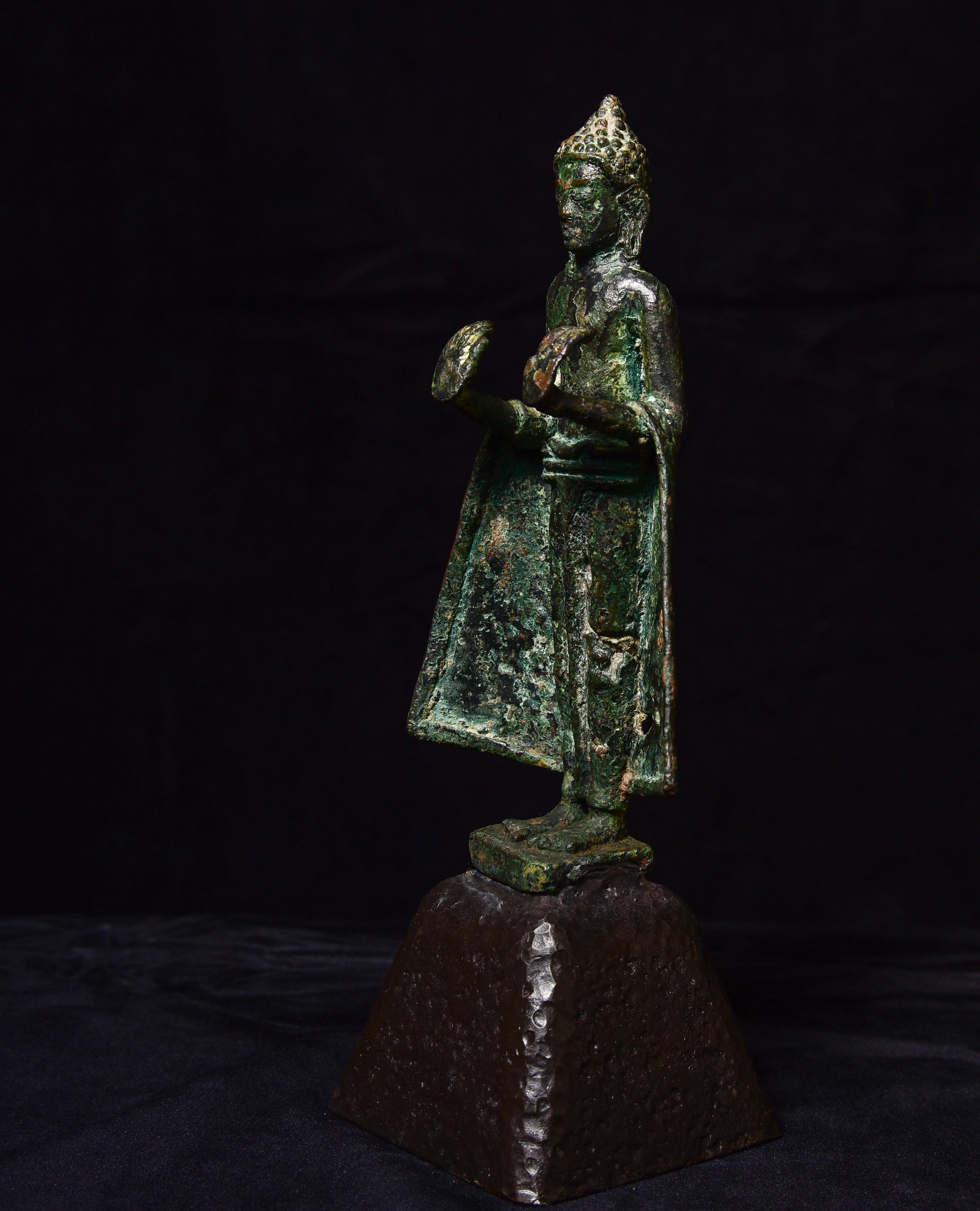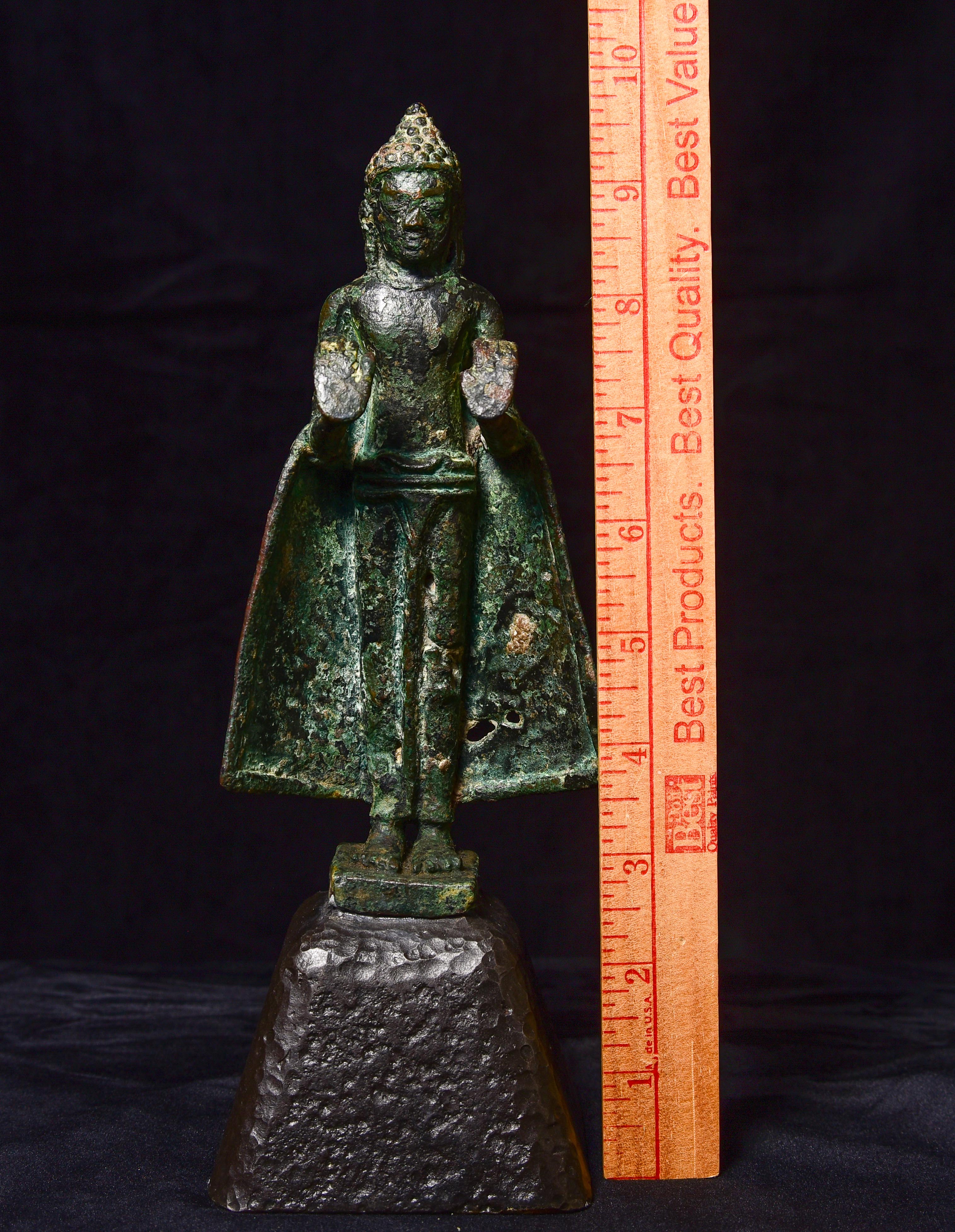 10thC or Earlie Thai Buddha. Solid cast in a very early method. Rare trope. Stands 7.5 inches tall, height on custom stand is 9.5 inches. Very rare type. Significant wear. The base was made by a well regarded sculptor who treated each base as a sculpture itself. He created a patina and shape and proportion for the base that complemented the particular sculpture he was making it for. Because he worked in thickly cast metal, it took a considerable amount of time to craft each base. If he would’ve charged the full cost of making it particularly for this sculpture, and I had to pay for his time to sculpt something comparable I would’ve paid more than $1000 for the base alone. He enjoyed the process of making them, and would work on making them when he did not have other projects, so he let them go for a fraction of what they would’ve gone for if they were a small sculpture.