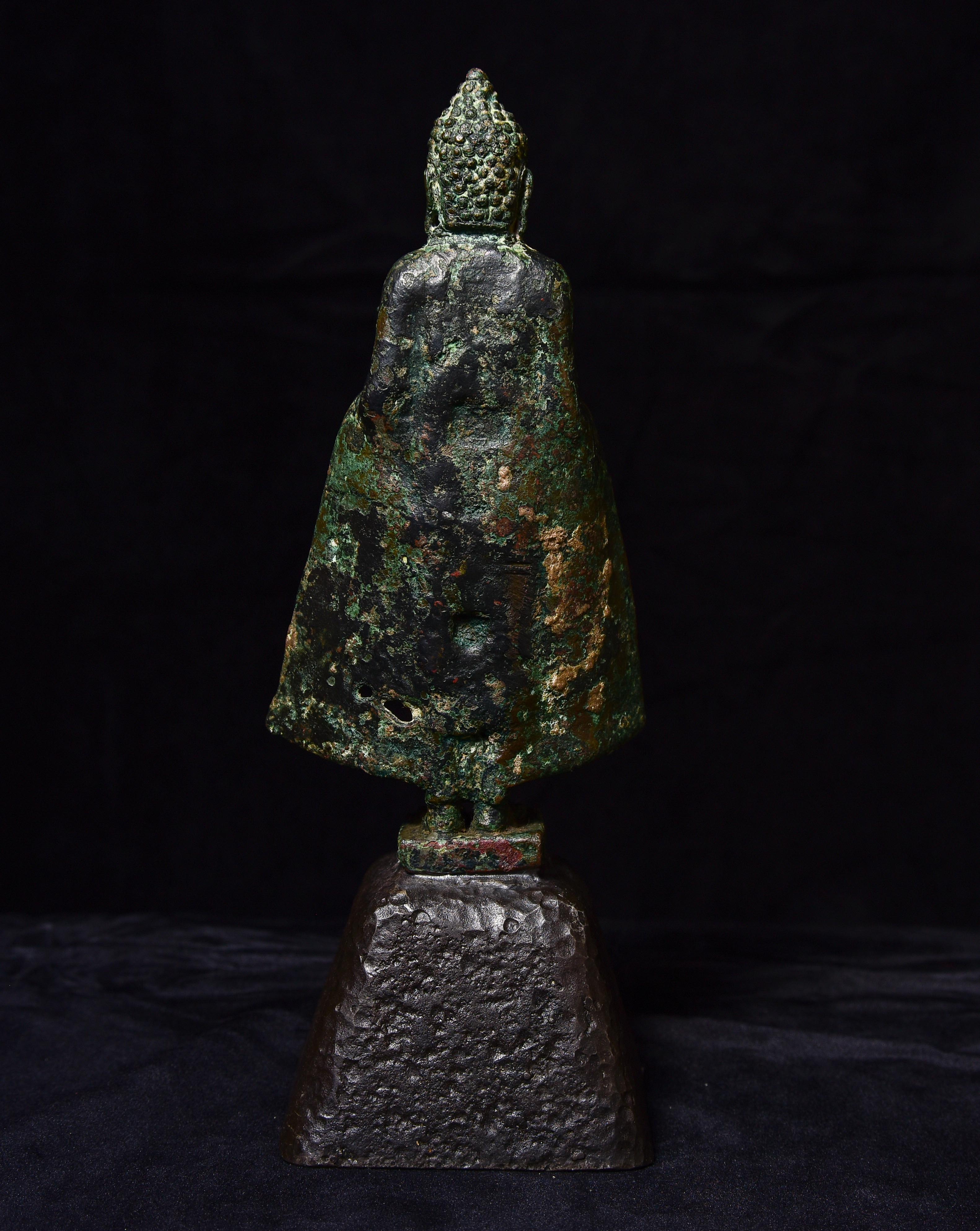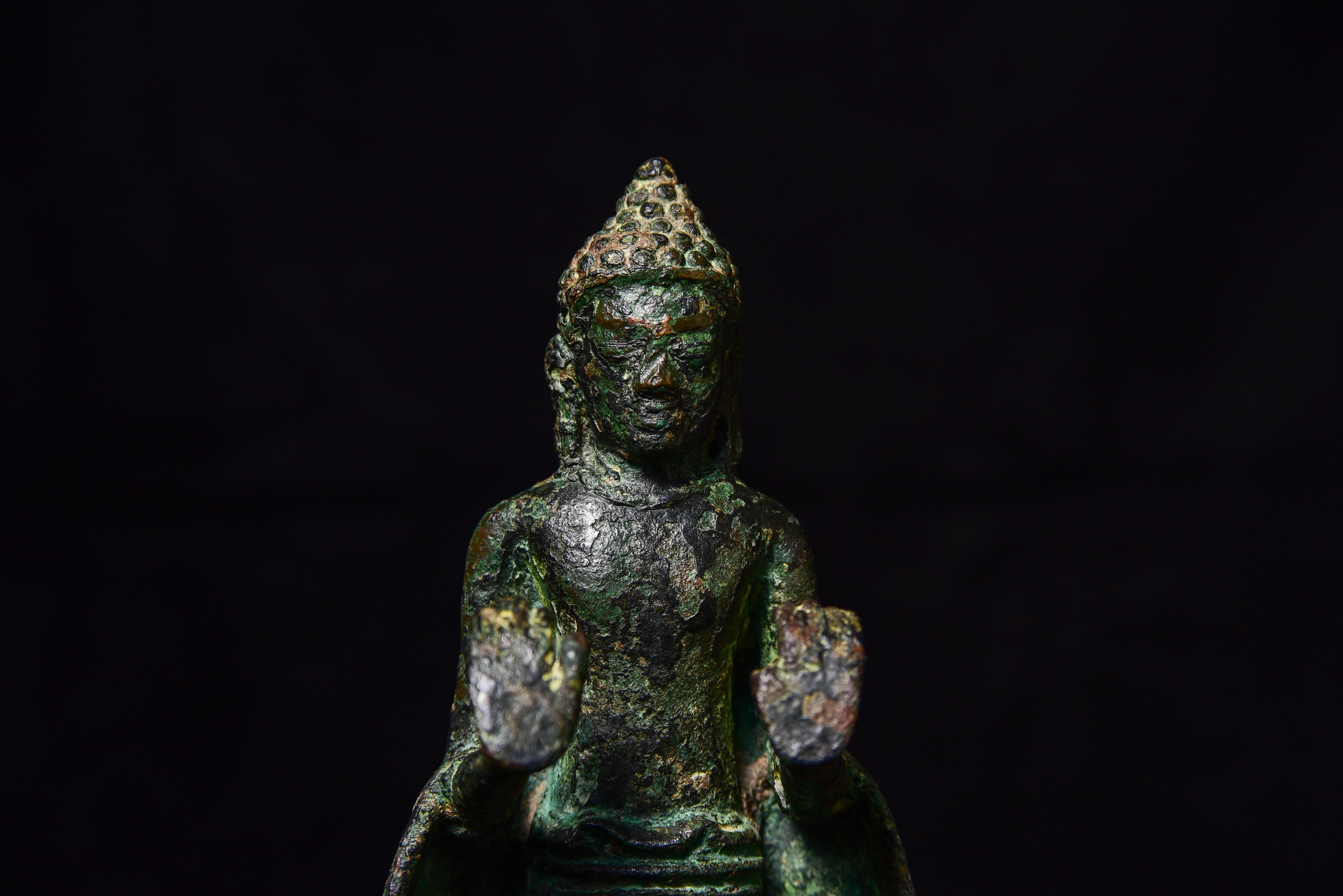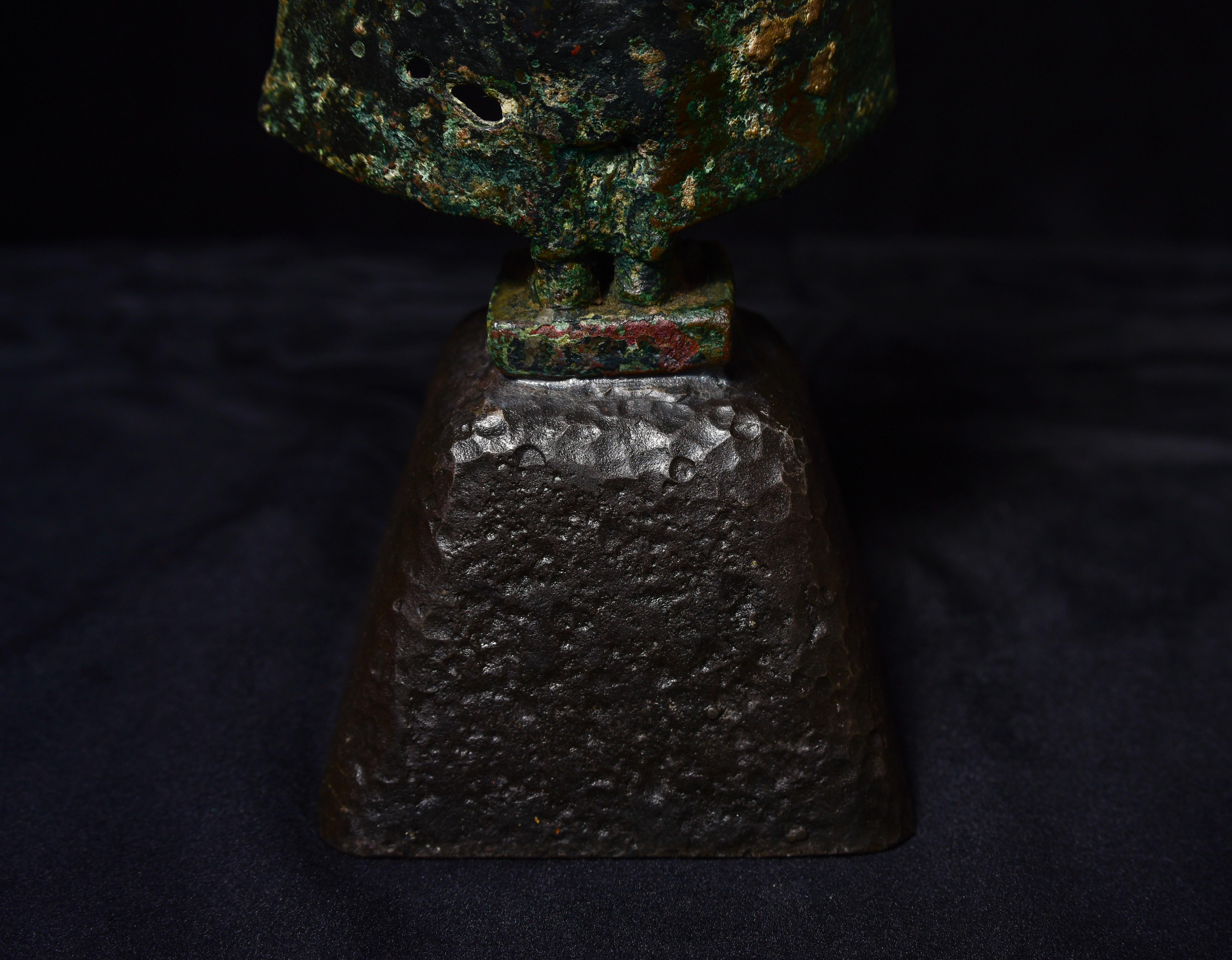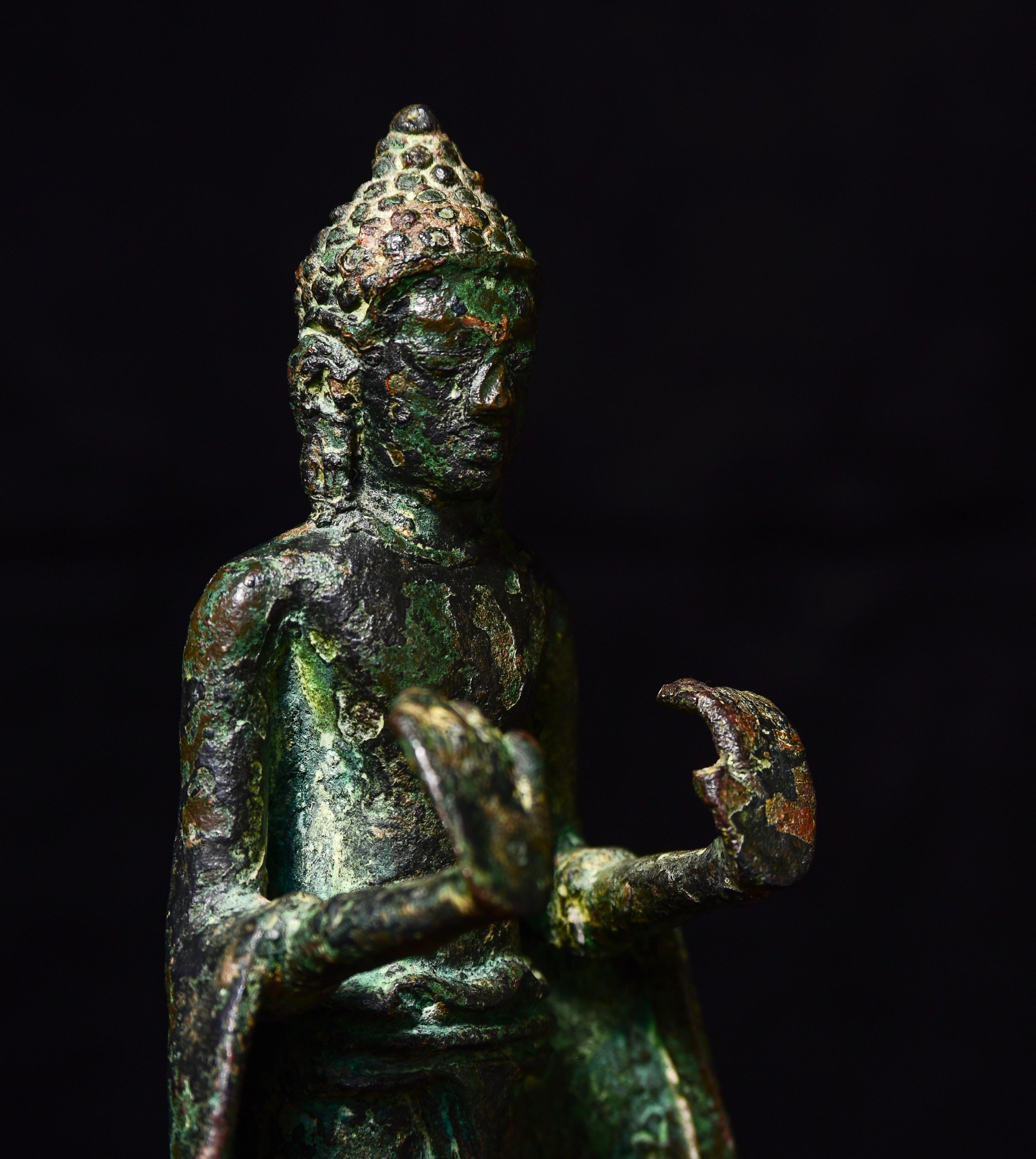 10thC or Earlie Thai Buddha. Solid cast in a very early method. Rare trope. Stands 7.5 inches tall, height on custom stand is 9.5 inches. Very rare type. Significant wear. The base was made by a well regarded sculptor who treated each base as a sculpture itself. He created a patina and shape and proportion for the base that complemented the particular sculpture he was making it for. Because he worked in thickly cast metal, it took a considerable amount of time to craft each base. If he would’ve charged the full cost of making it particularly for this sculpture, and I had to pay for his time to sculpt something comparable I would’ve paid more than $1000 for the base alone. He enjoyed the process of making them, and would work on making them when he did not have other projects, so he let them go for a fraction of what they would’ve gone for if they were a small sculpture.