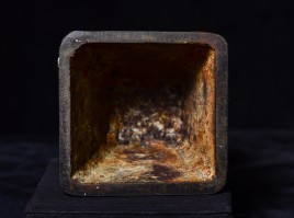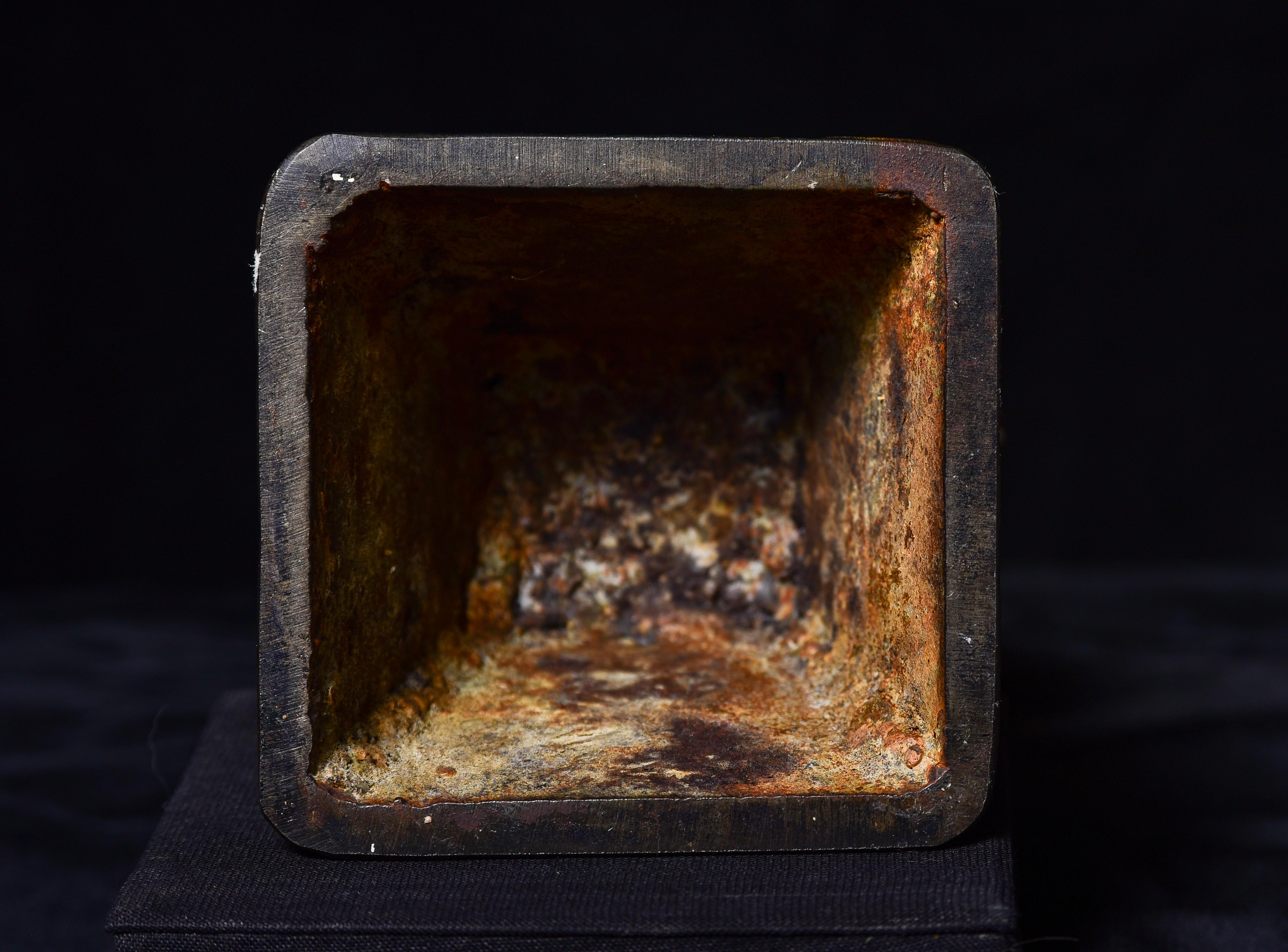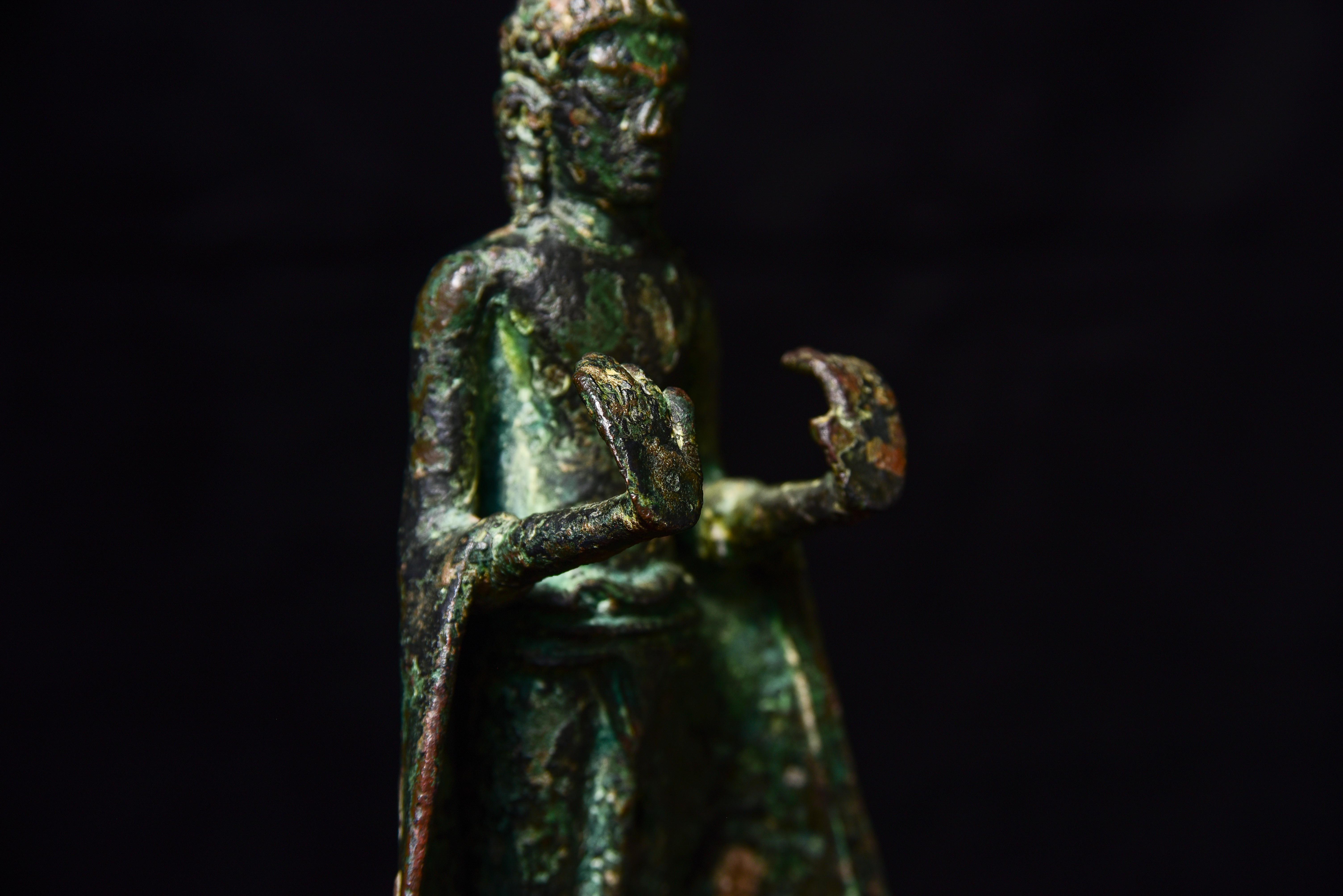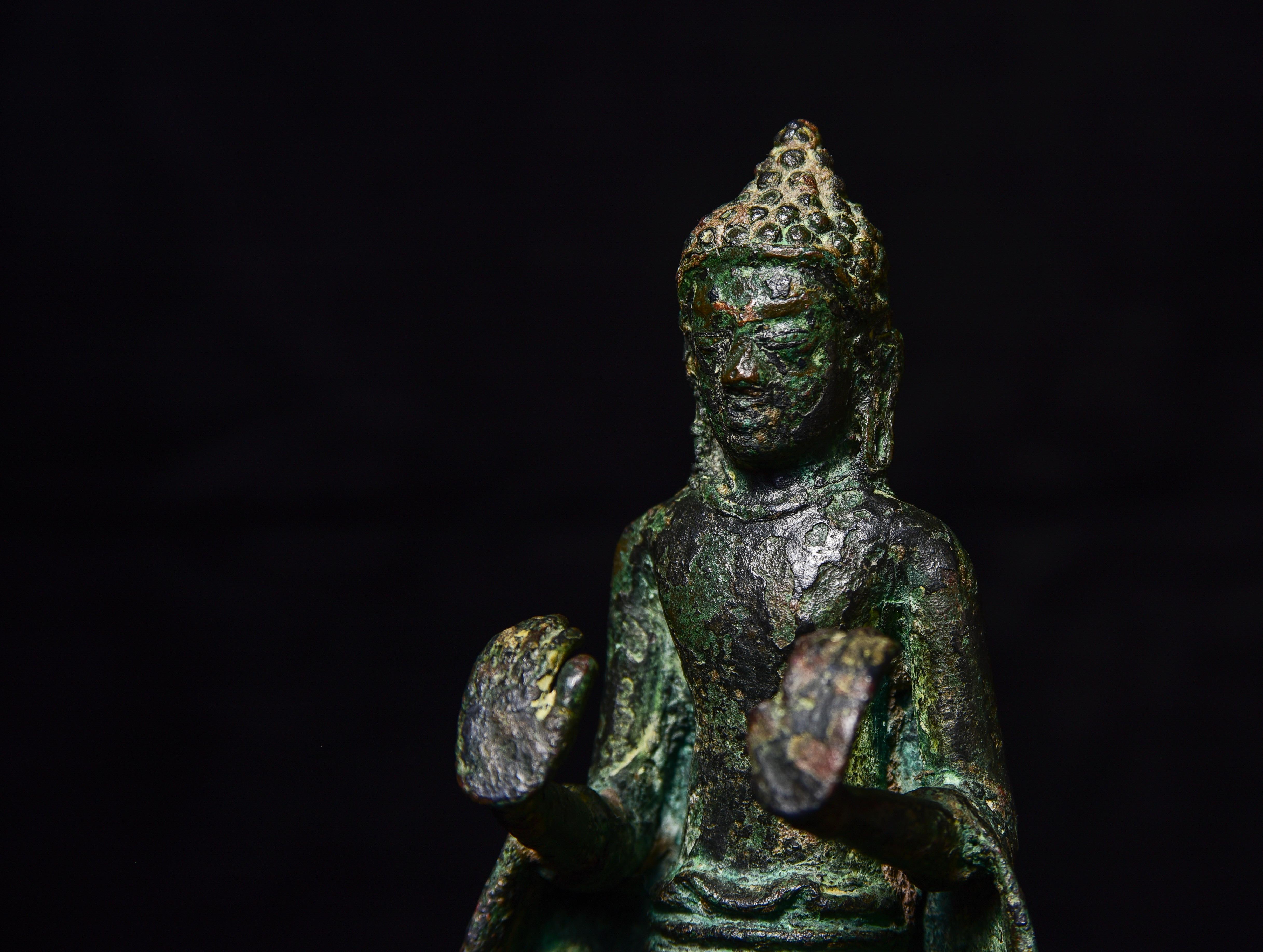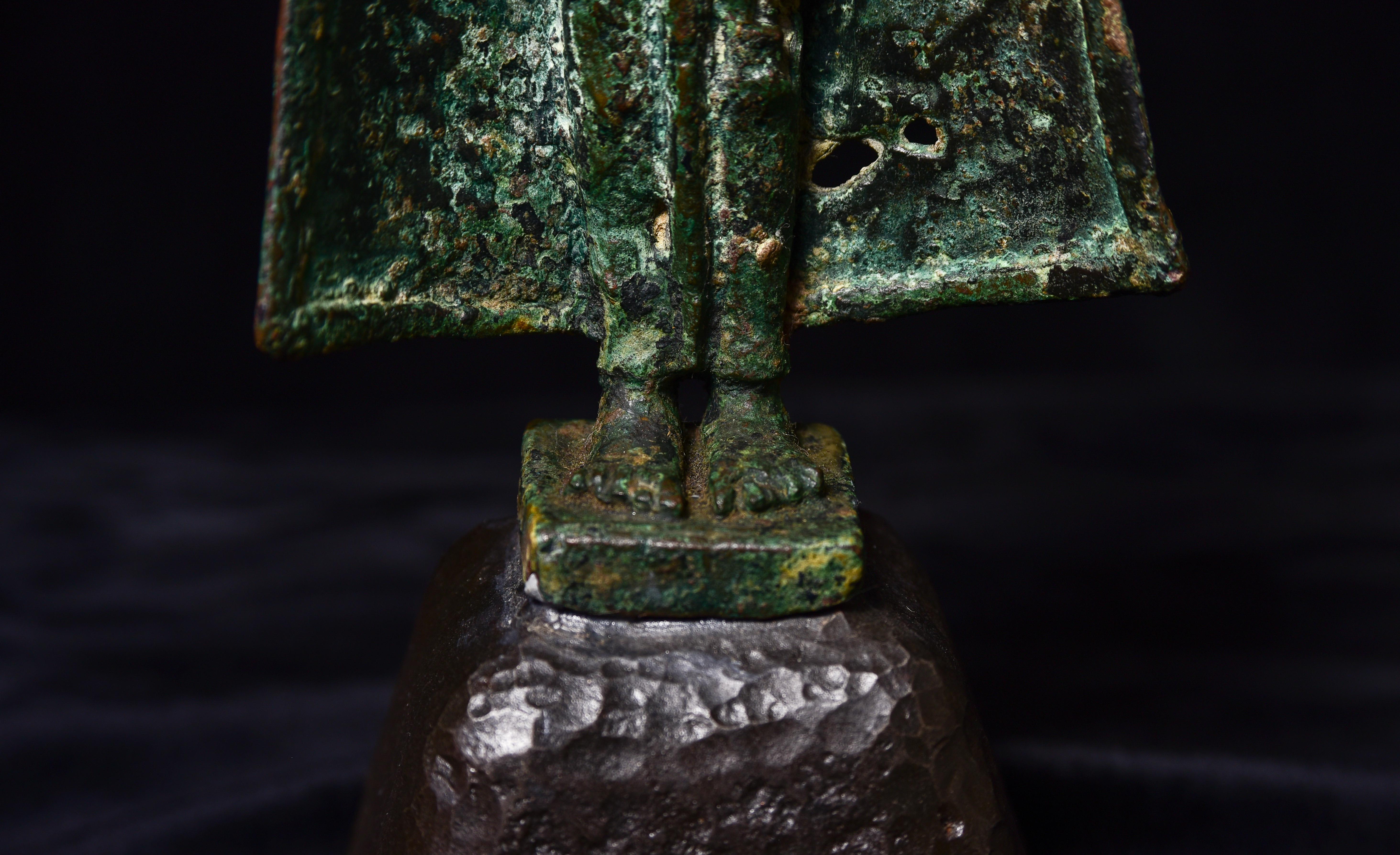 10thC or Earlie Thai Buddha. Solid cast in a very early method. Rare trope. Stands 7.5 inches tall, height on custom stand is 9.5 inches. Very rare type. Significant wear. The base was made by a well regarded sculptor who treated each base as a sculpture itself. He created a patina and shape and proportion for the base that complemented the particular sculpture he was making it for. Because he worked in thickly cast metal, it took a considerable amount of time to craft each base. If he would’ve charged the full cost of making it particularly for this sculpture, and I had to pay for his time to sculpt something comparable I would’ve paid more than $1000 for the base alone. He enjoyed the process of making them, and would work on making them when he did not have other projects, so he let them go for a fraction of what they would’ve gone for if they were a small sculpture.