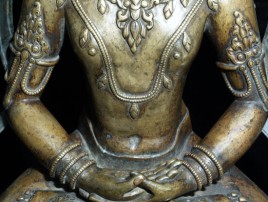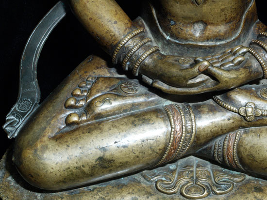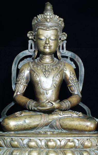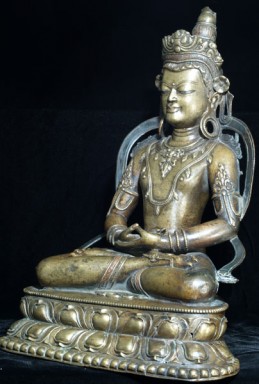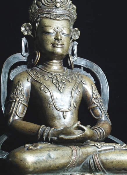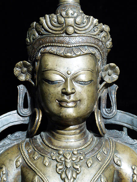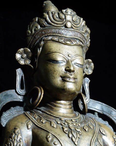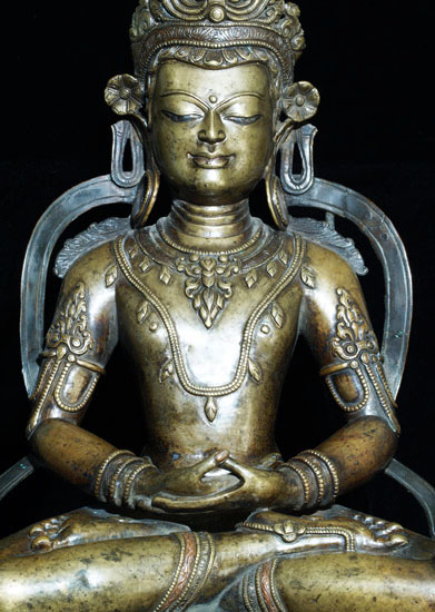 This is the best of my collection- a masterpiece 13th or possibly early 14thC Tibetan Buddha with inlaid copper, and inlaid silver eyes This Buddha is a very good size at 13 and 5/8 inches tall by 10 inches wide at the base. There is some repair to the ribbons on the sides and there is some loss to the crown, as you can see in the photos, but generally it is in excellent condition for a 700 year old Buddha. It comes from a an extremely wealthy US philanthropist/collector/dealer who has had it for 30 years. It has been examined by many experts- no question at all about the authenticity of this Buddha. The face, quality and feel of this piece are world class.