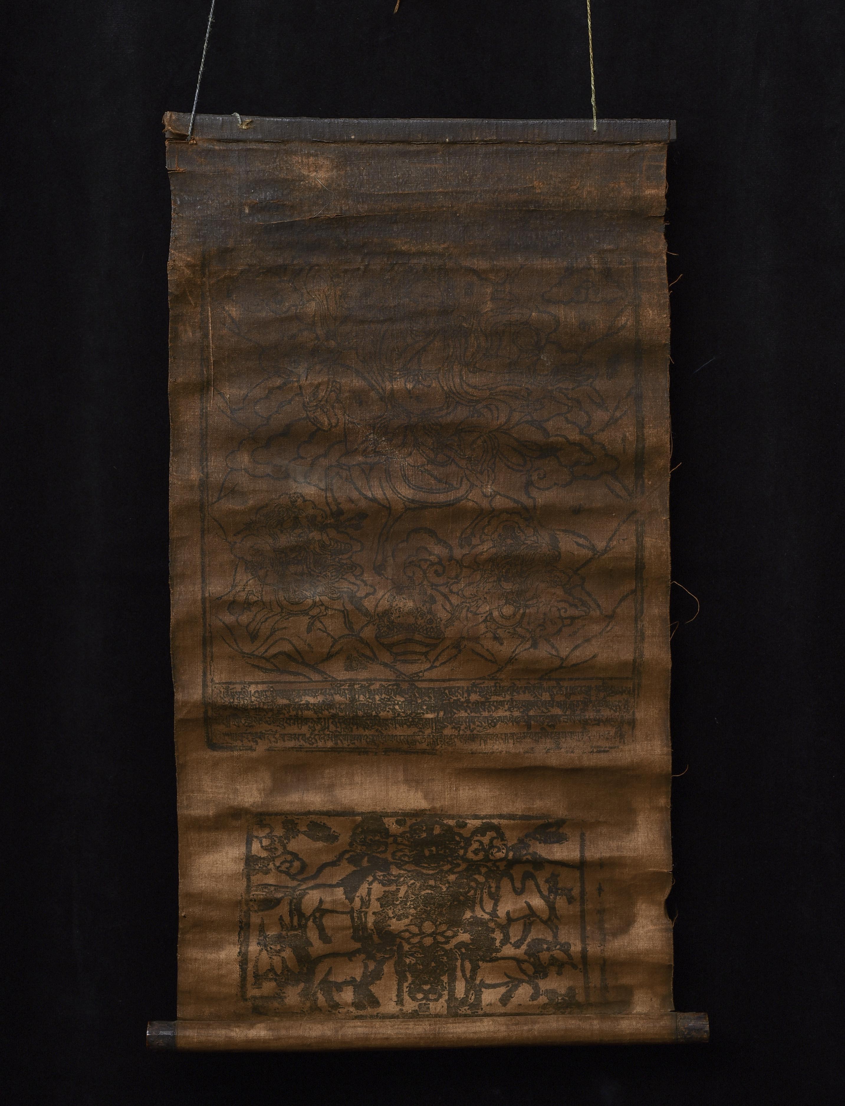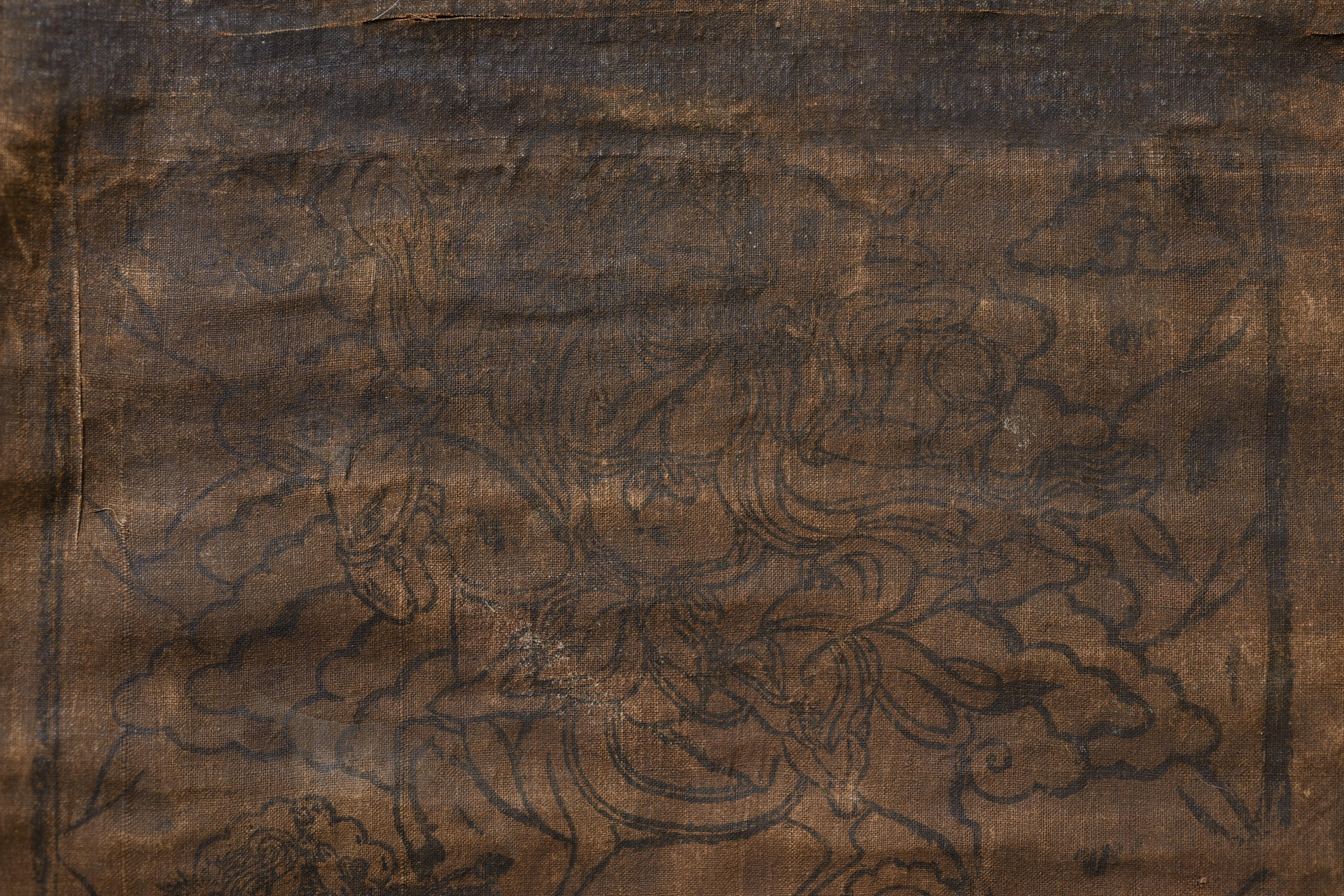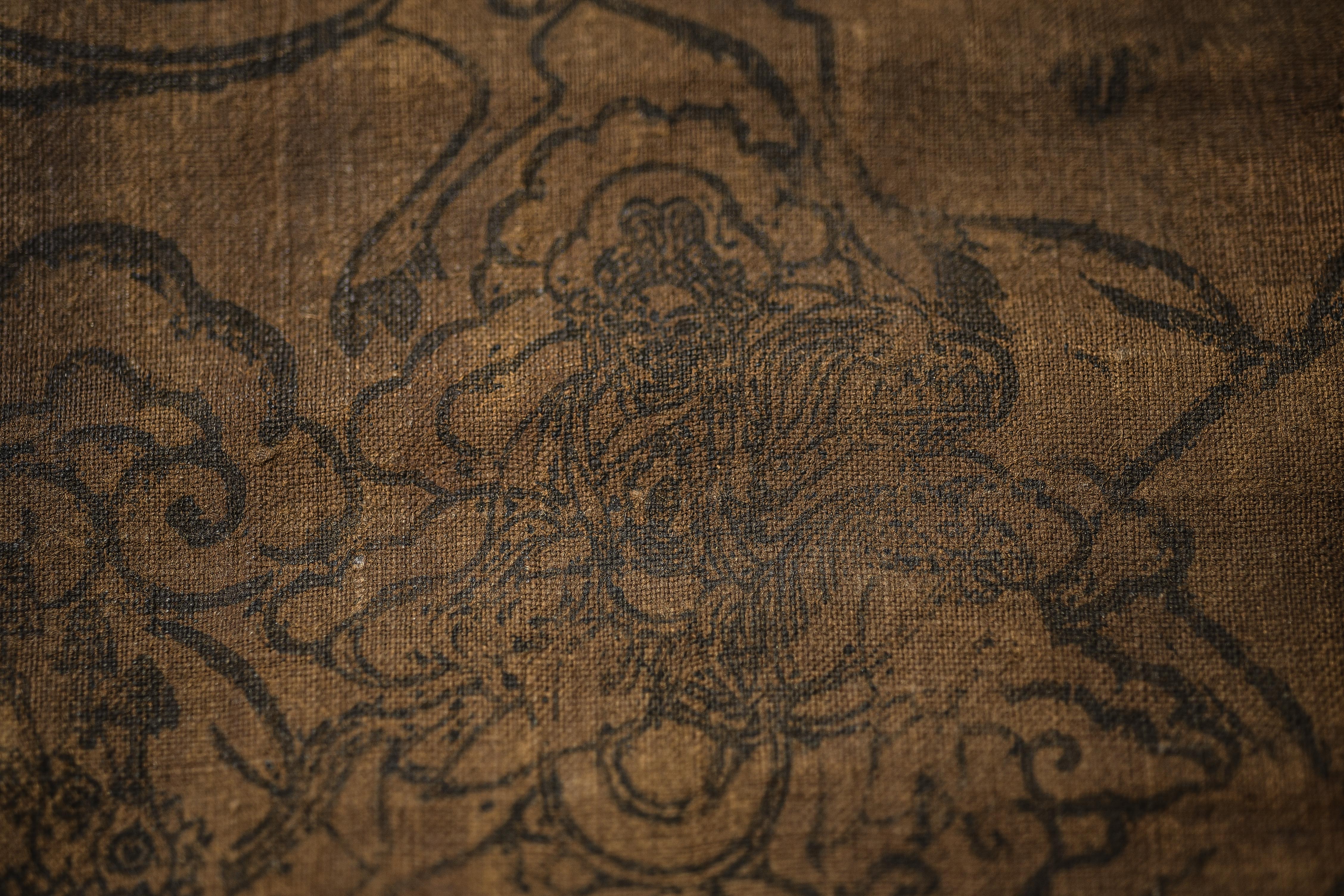 This antique Mongolian block-printed thangka, created on homespun cloth, is a rare survivor of a traditional printing practice now seldom encountered. The textile bears the warm patina of age, with devotional wear consistent with long use, yet the imagery—featuring protective deities and accompanying script—remains clearly visible. Its organic, handmade character gives it a distinctive presence, appealing to collectors of early Mongolian and Tibetan ritual art. The cloth measures 9.75 × 18.25 inches. Offered with a lowered starting price, this is an excellent opportunity to acquire an authentic and atmospheric example of Mongolian block-print tradition.