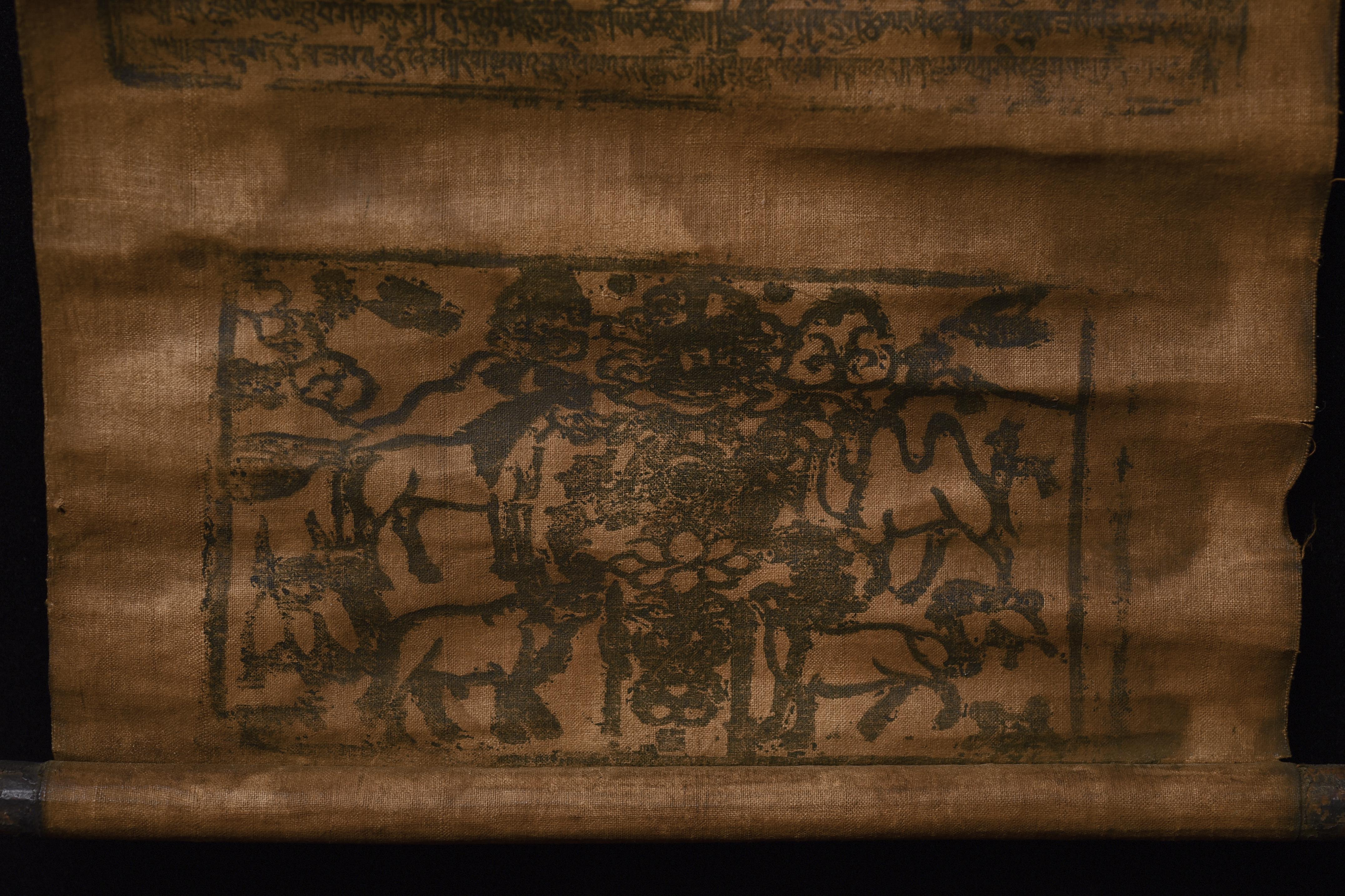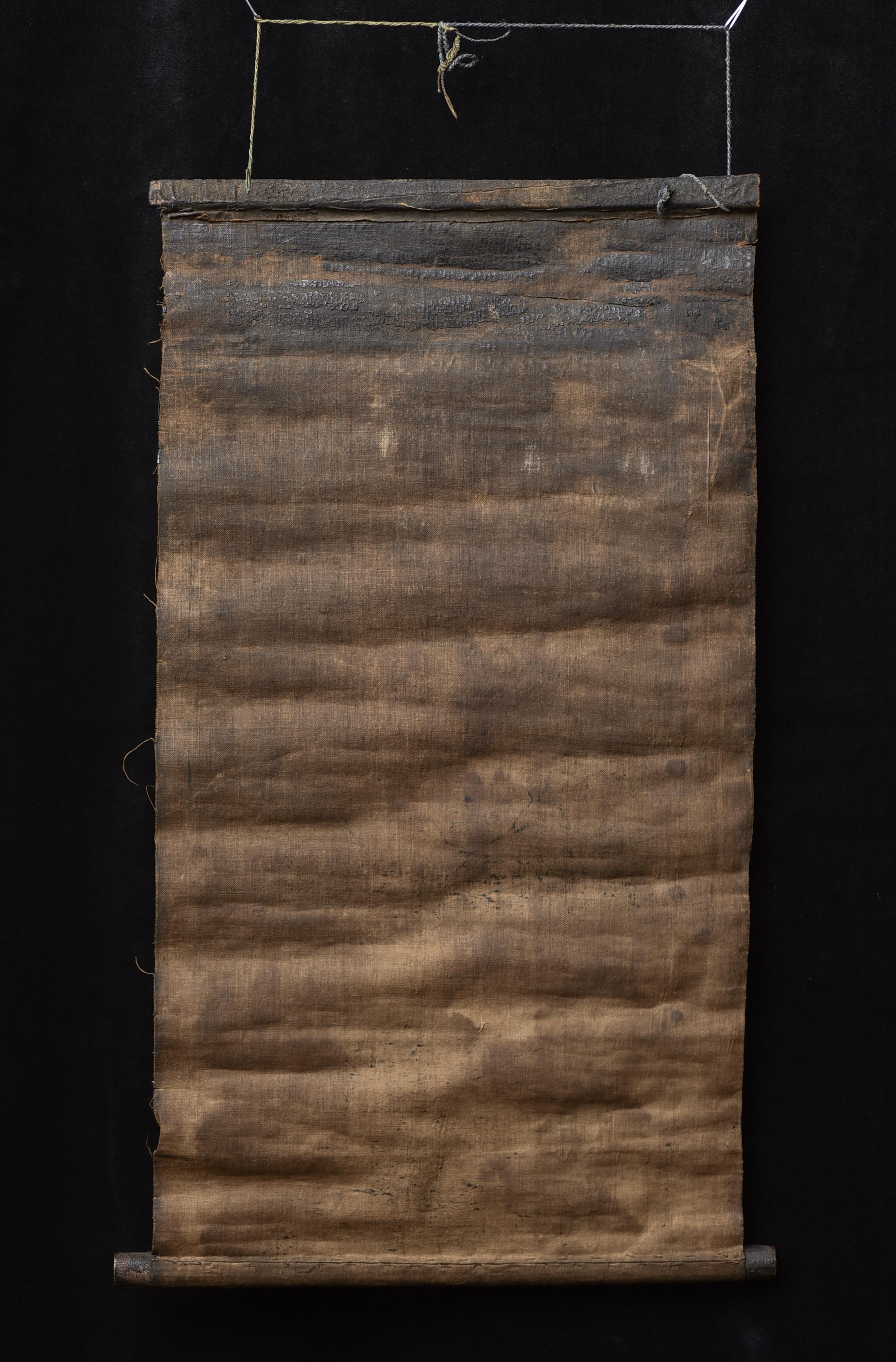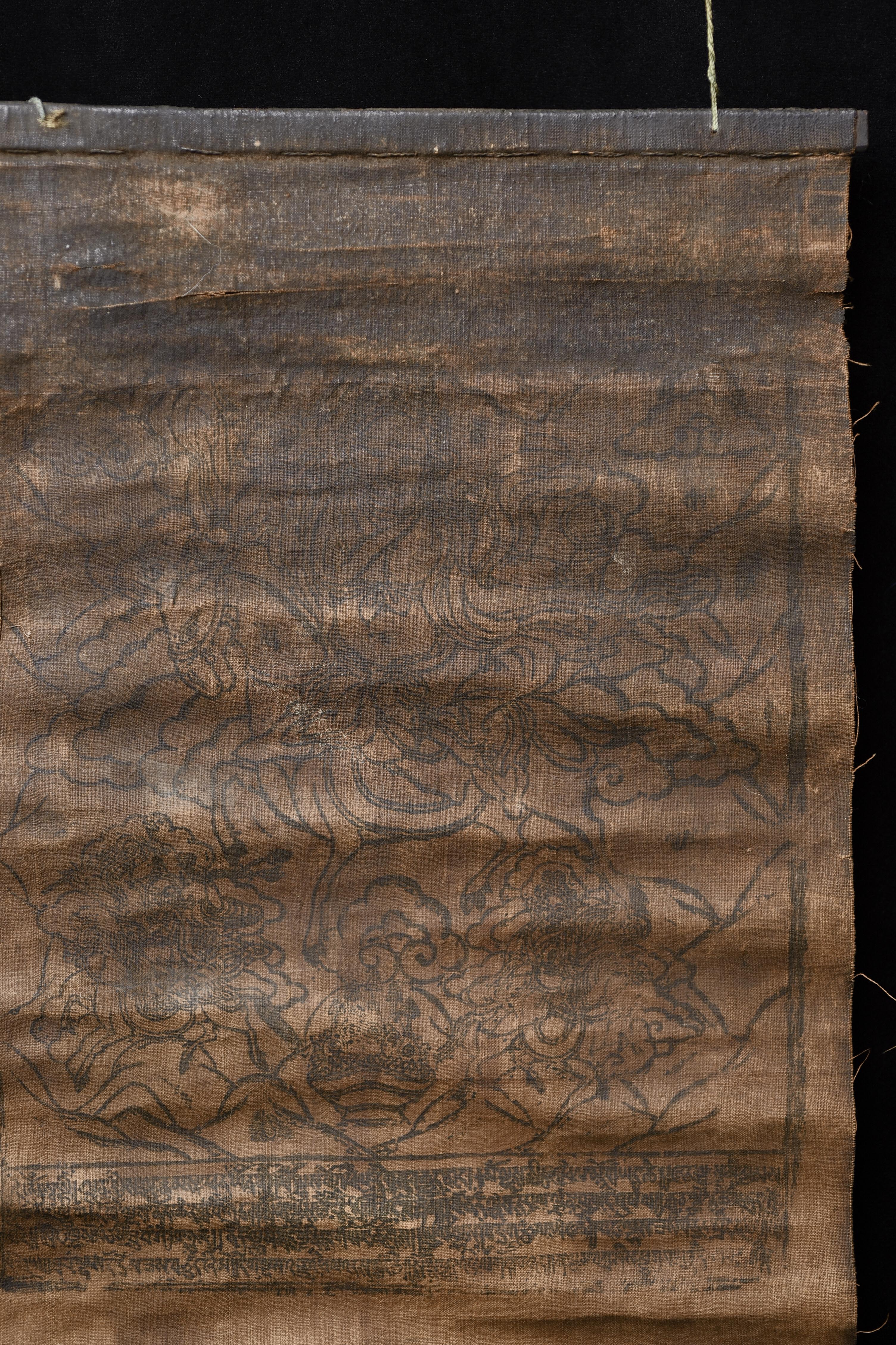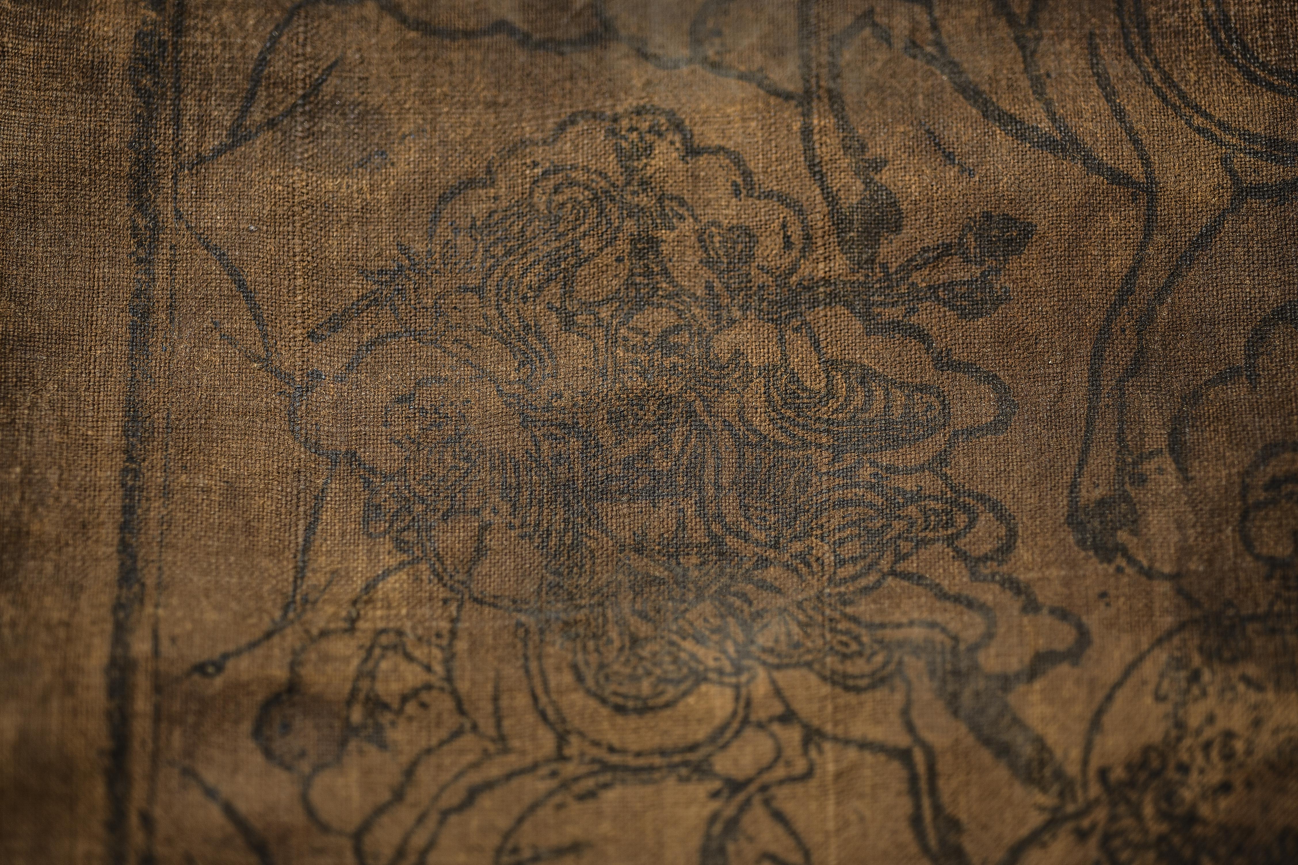 This antique Mongolian block-printed thangka, created on homespun cloth, is a rare survivor of a traditional printing practice now seldom encountered. The textile bears the warm patina of age, with devotional wear consistent with long use, yet the imagery—featuring protective deities and accompanying script—remains clearly visible. Its organic, handmade character gives it a distinctive presence, appealing to collectors of early Mongolian and Tibetan ritual art. The cloth measures 9.75 × 18.25 inches. Offered with a lowered starting price, this is an excellent opportunity to acquire an authentic and atmospheric example of Mongolian block-print tradition.