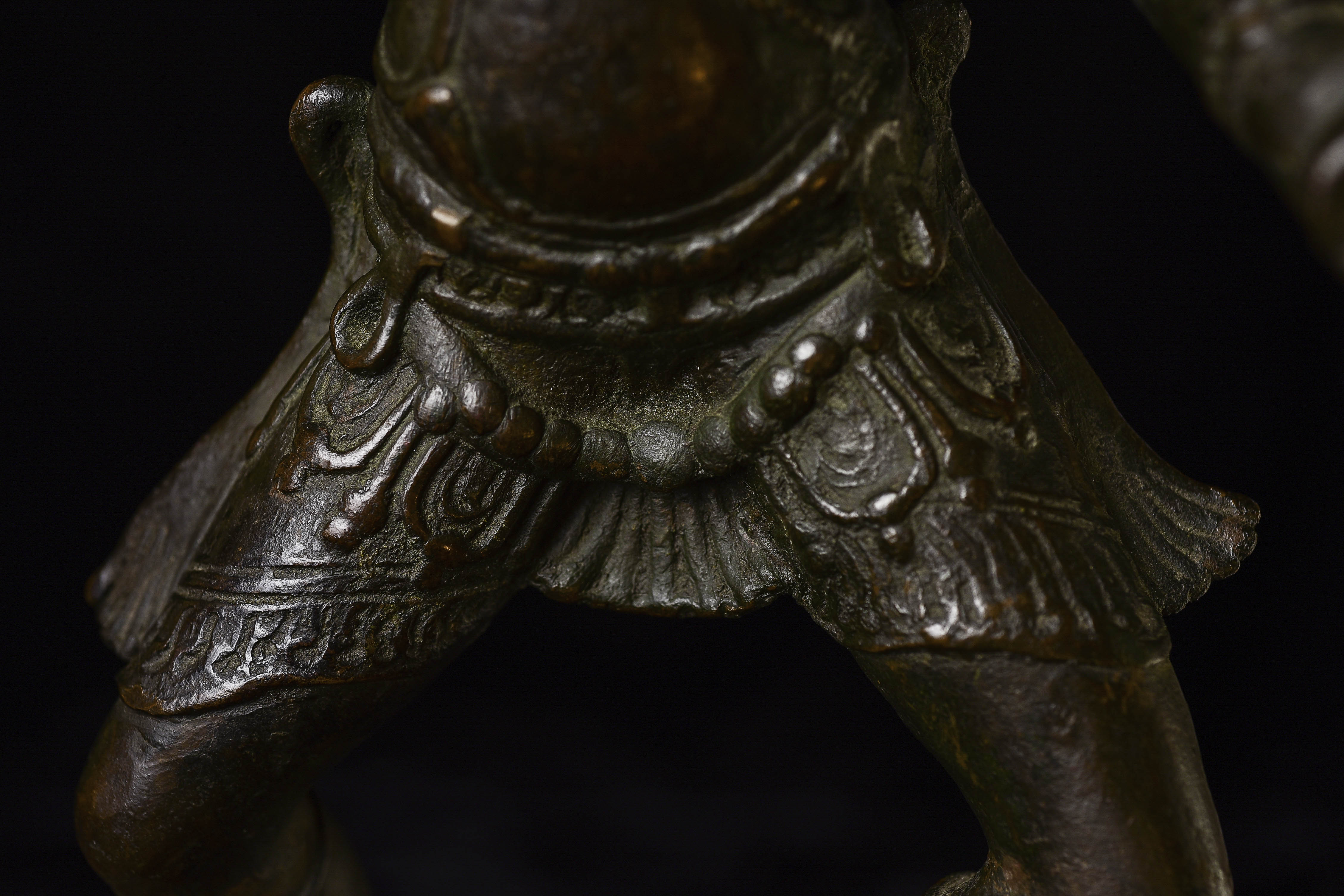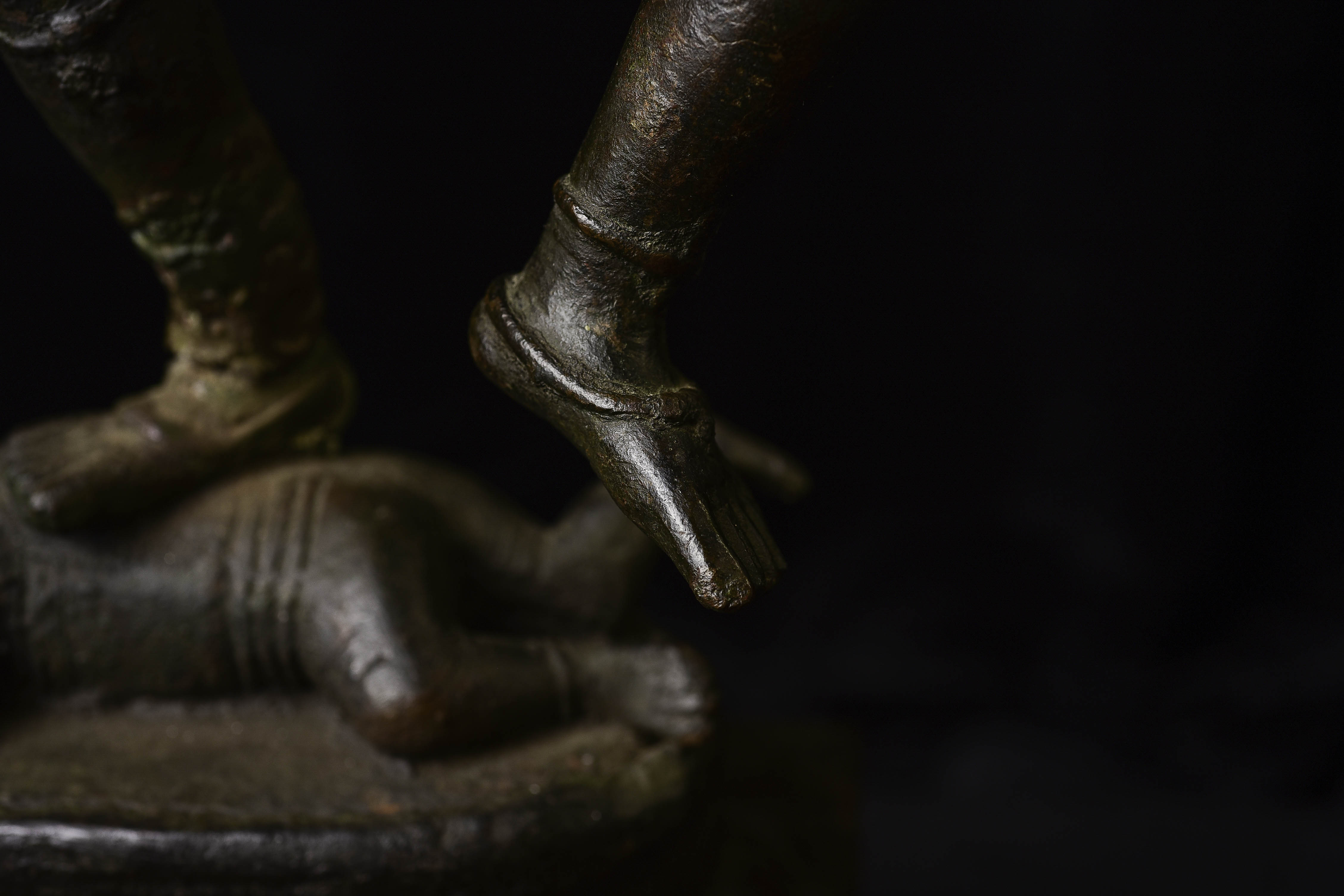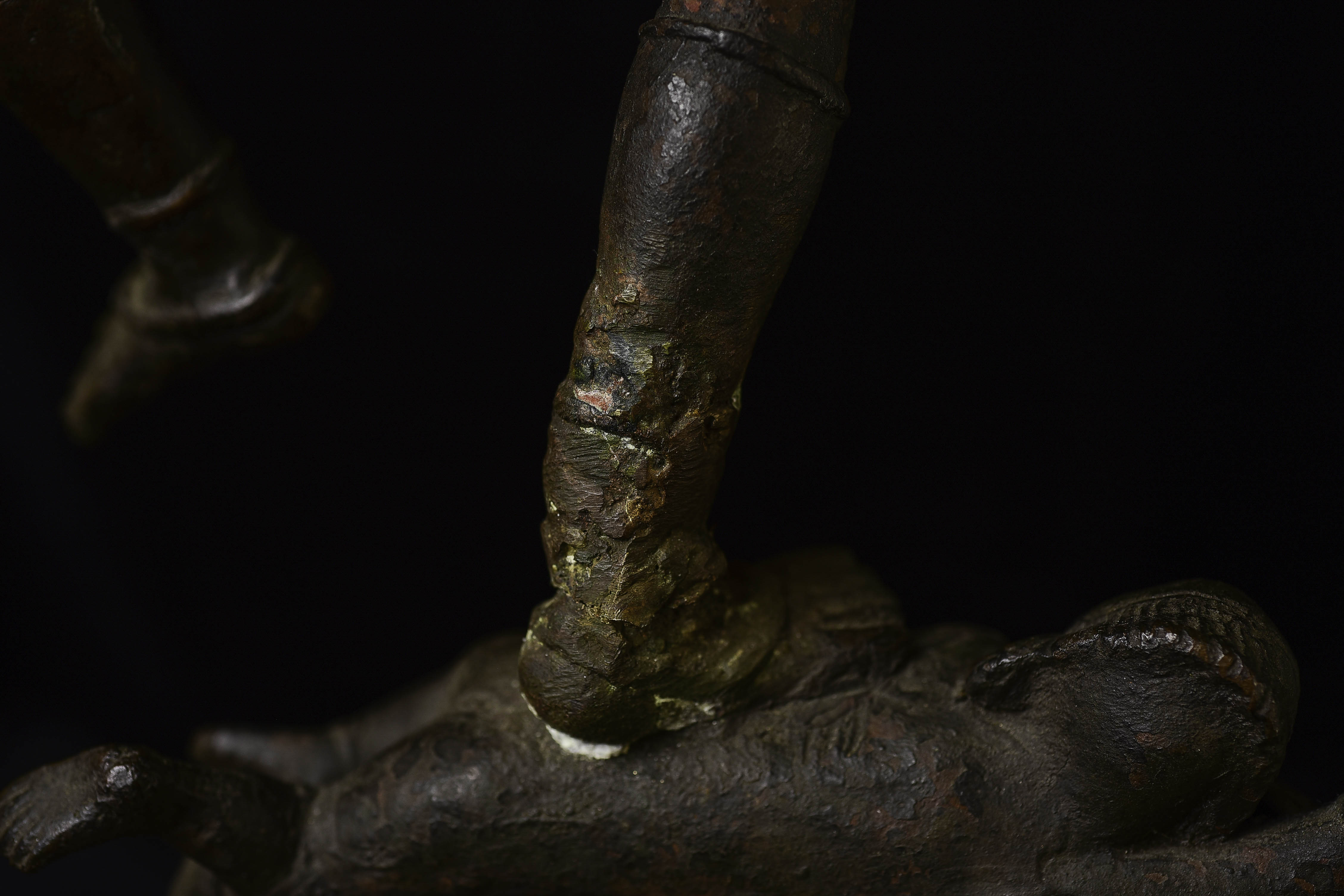 Other than the crude repair to the ankle, which could use to be redone at some point (though it serves just fine right now), the sculpture is in great shape. it may be slowly leaning to the right due to the weight of the sky figure over time. a simple fix to this is to put a small shim under the right Underside of the bottom of the base. this could also be corrected if the ankle was ever repaired.