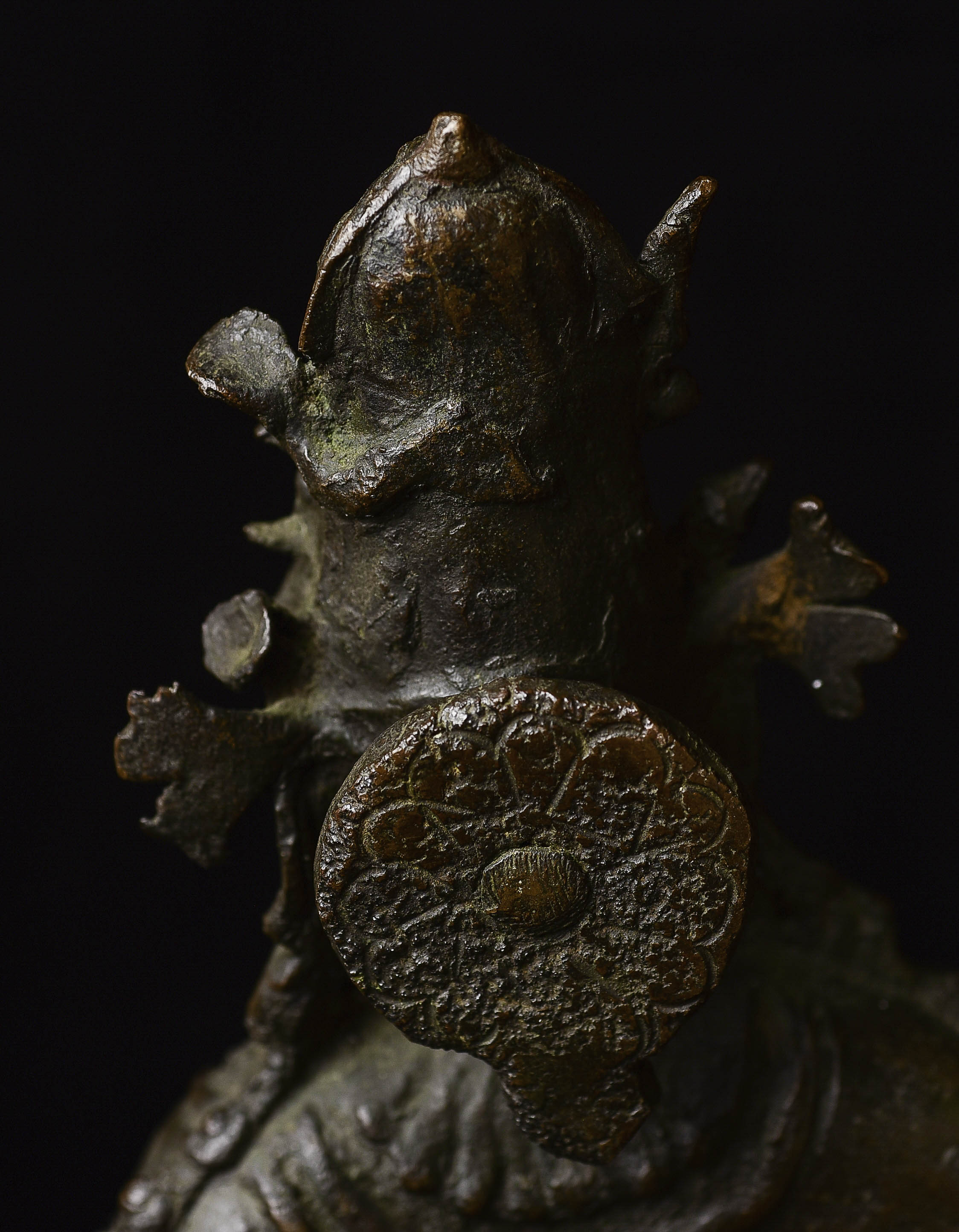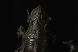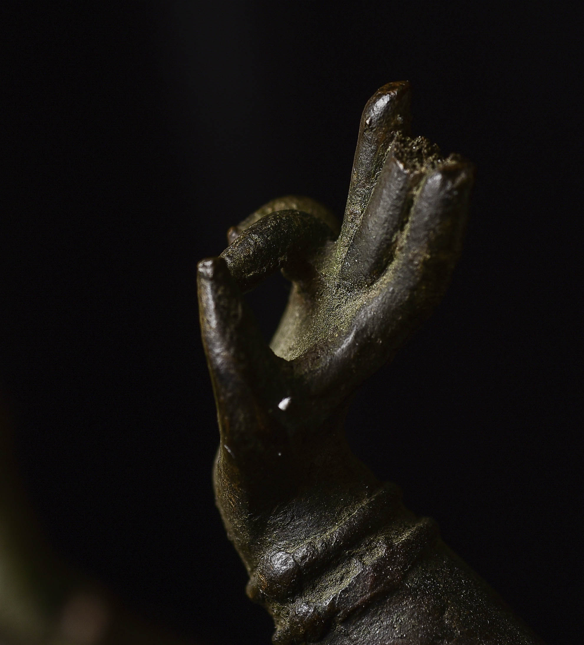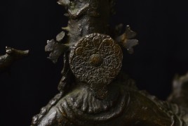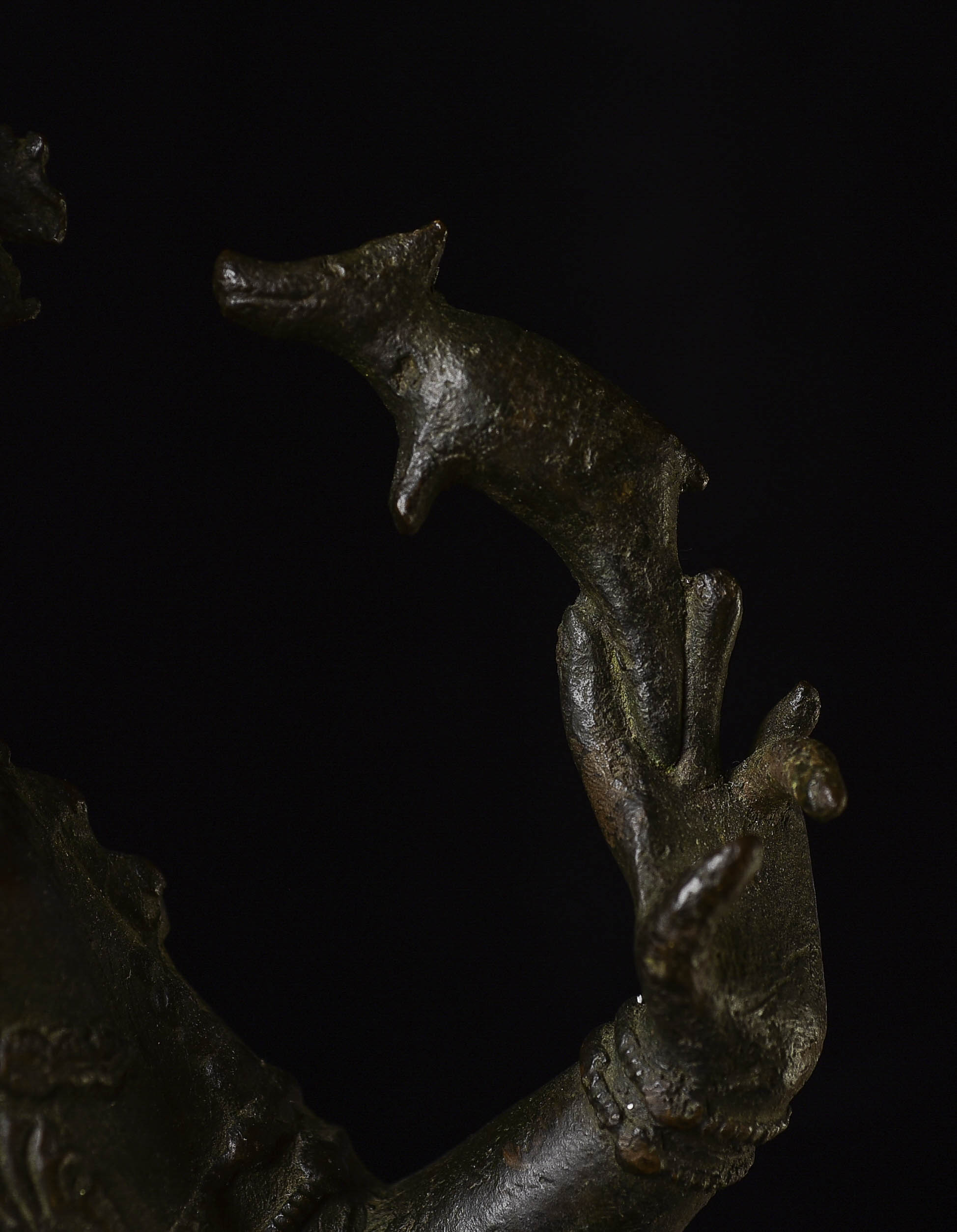 Other than the crude repair to the ankle, which could use to be redone at some point (though it serves just fine right now), the sculpture is in great shape. it may be slowly leaning to the right due to the weight of the sky figure over time. a simple fix to this is to put a small shim under the right Underside of the bottom of the base. this could also be corrected if the ankle was ever repaired.