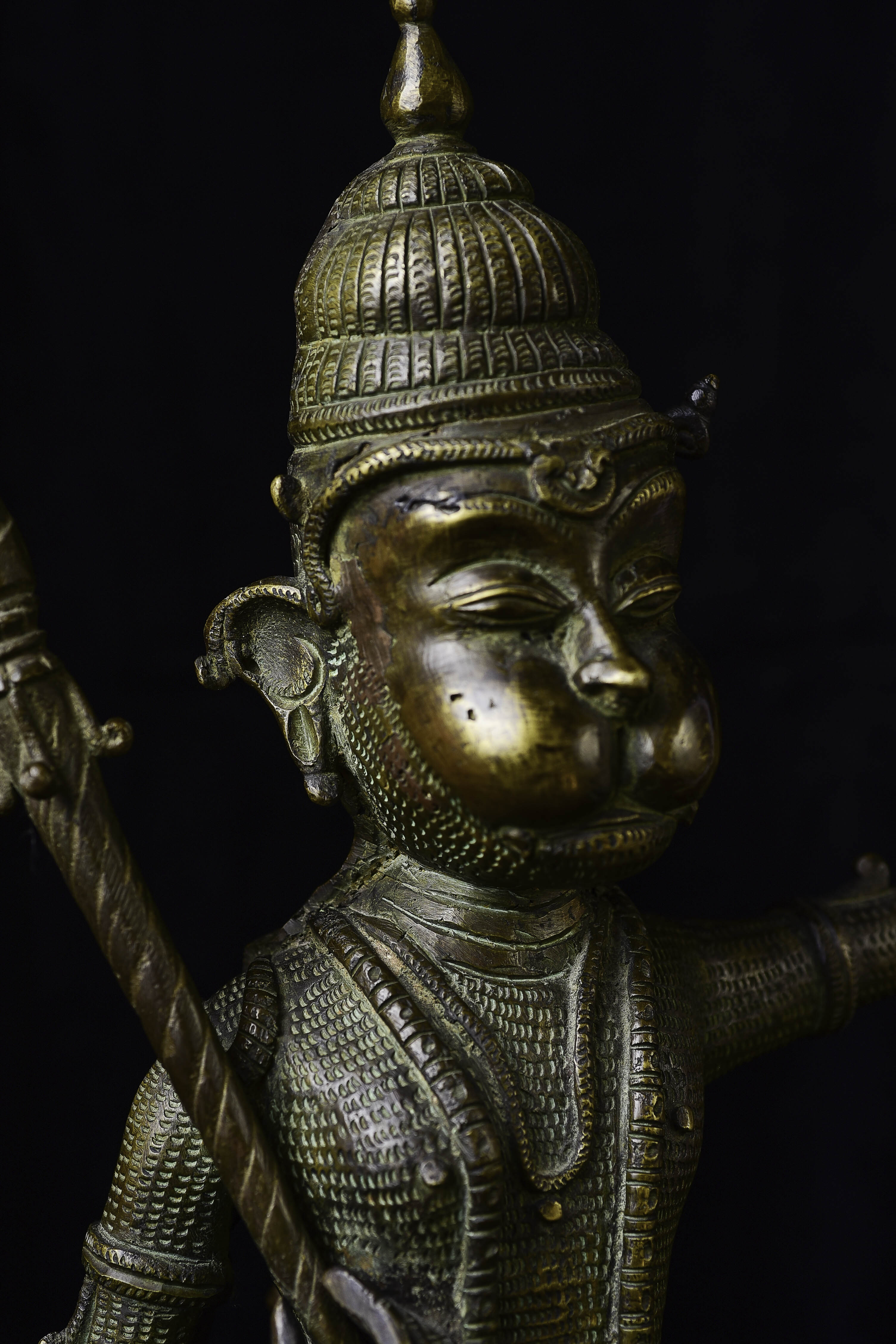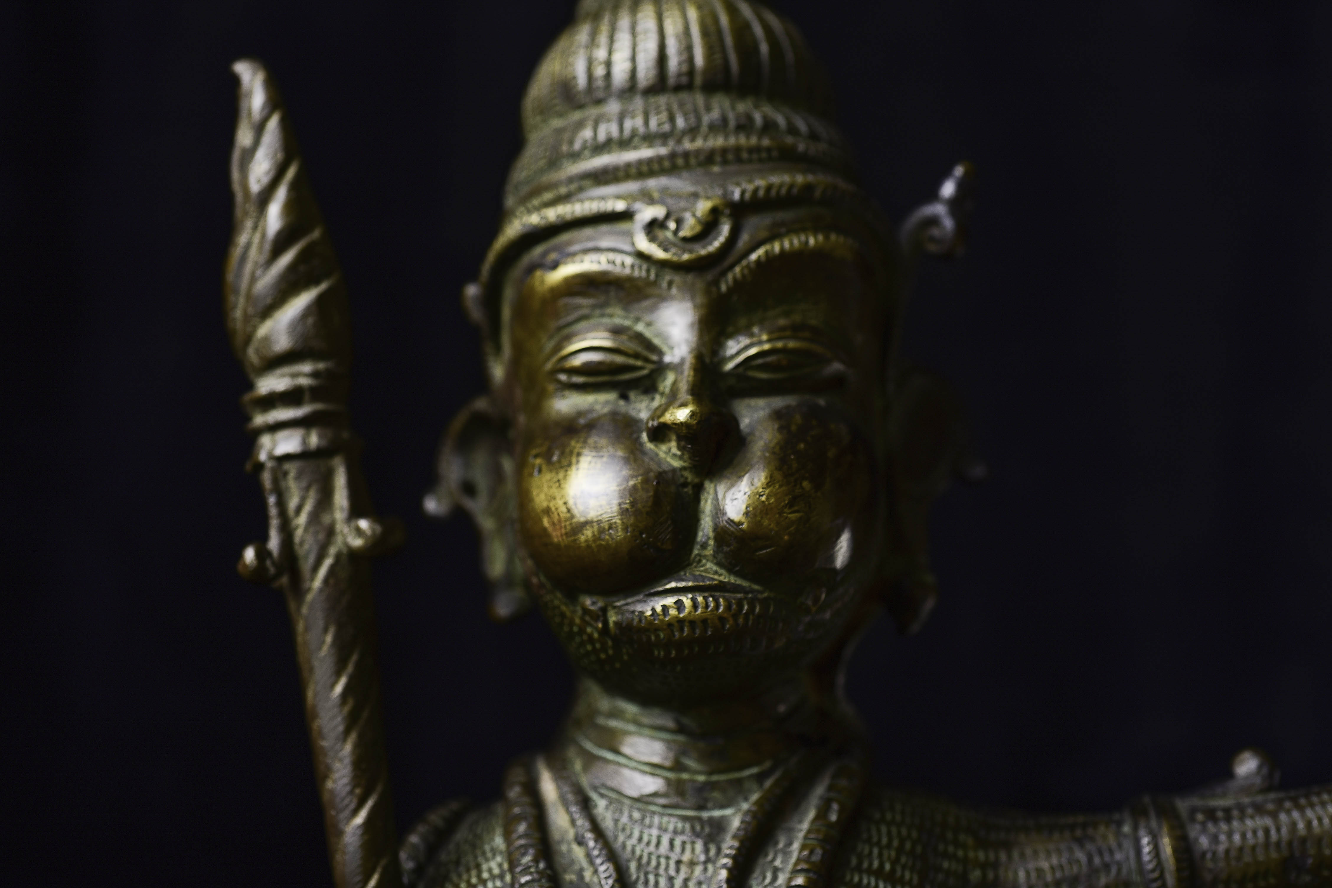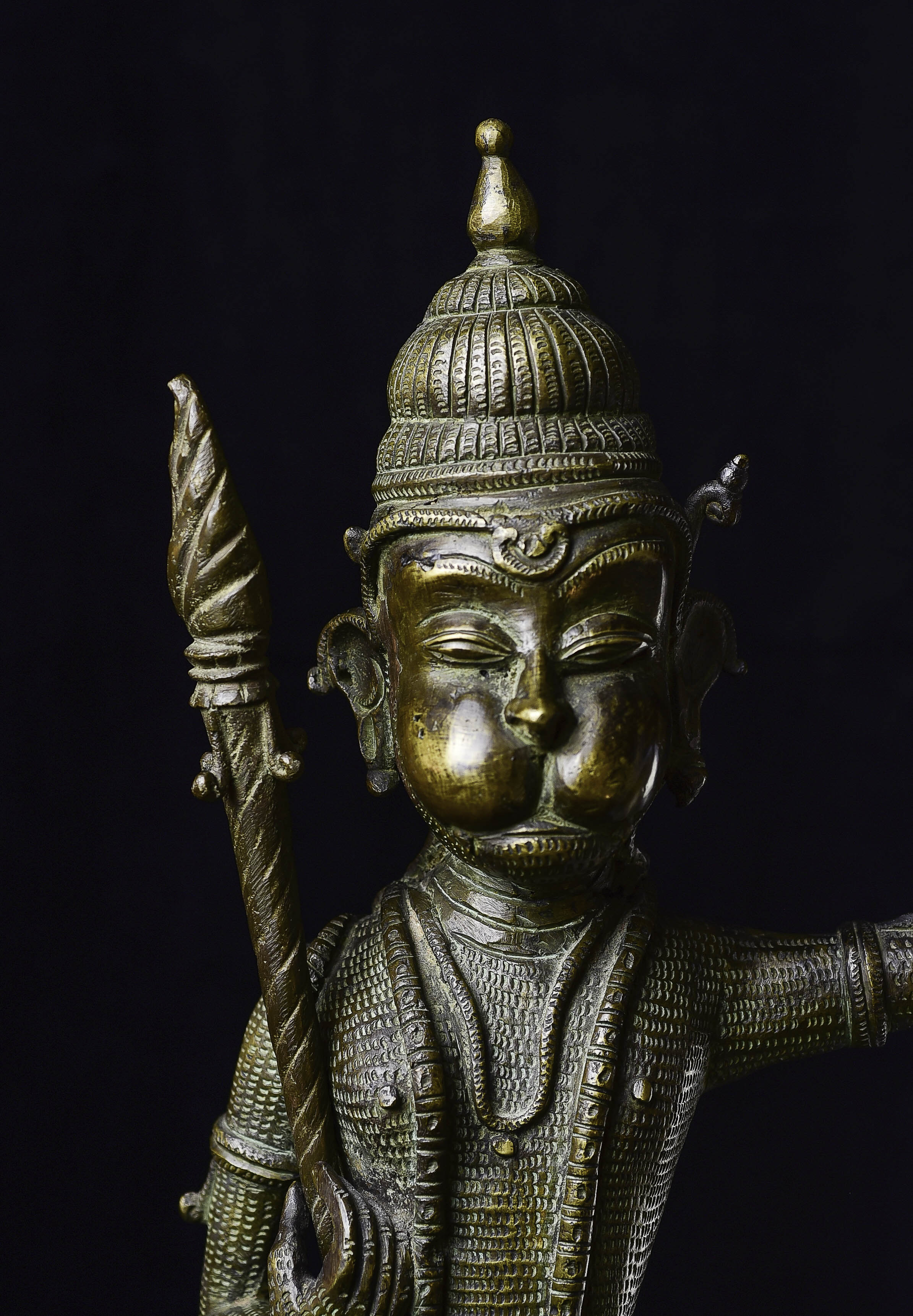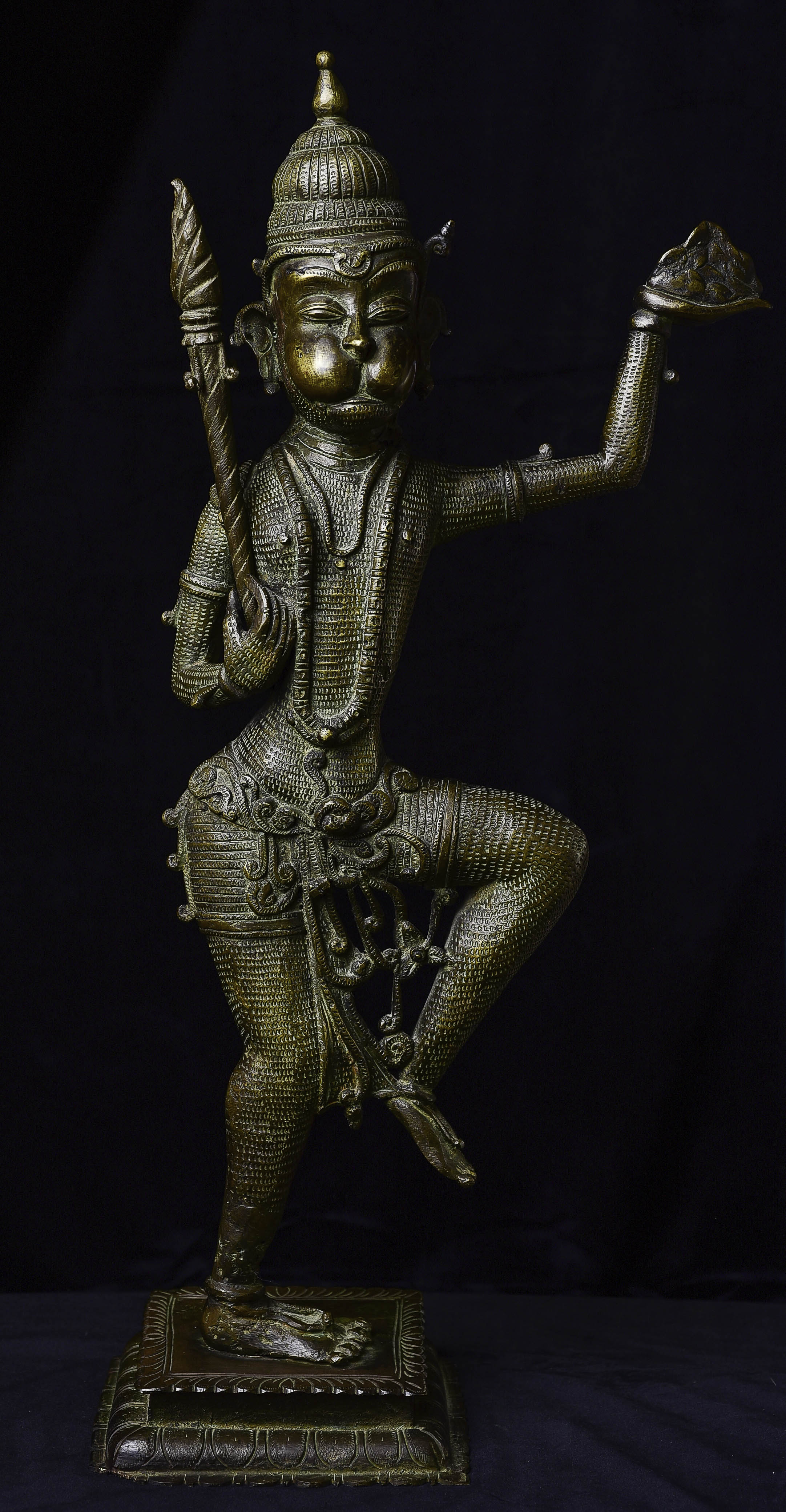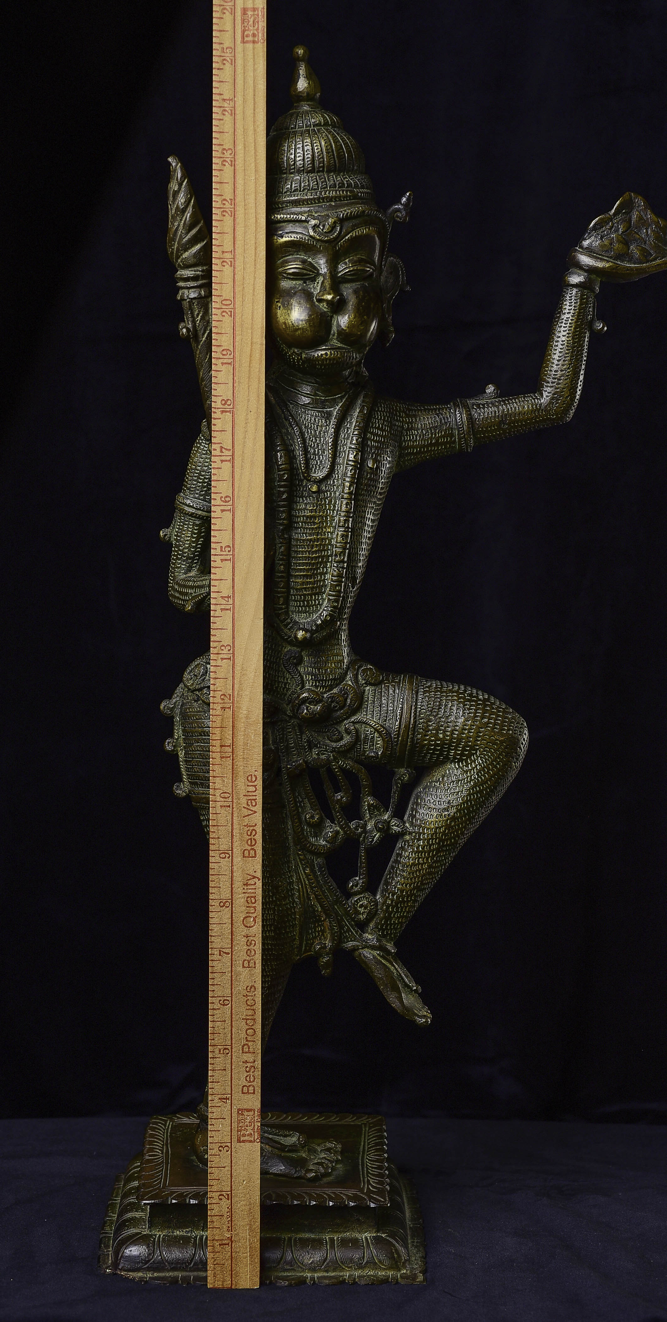Early20thC Hanuman from India. Charismatic and Lively. Makes everyone smile. Very large- see the photo with the ruler for reference. Outstanding condition. One corner of the base is chipped and the figure leans into the base due to time and gravity causing everything to sag a bit. Can be compensated for with a shim under one or 2 feet. Special.