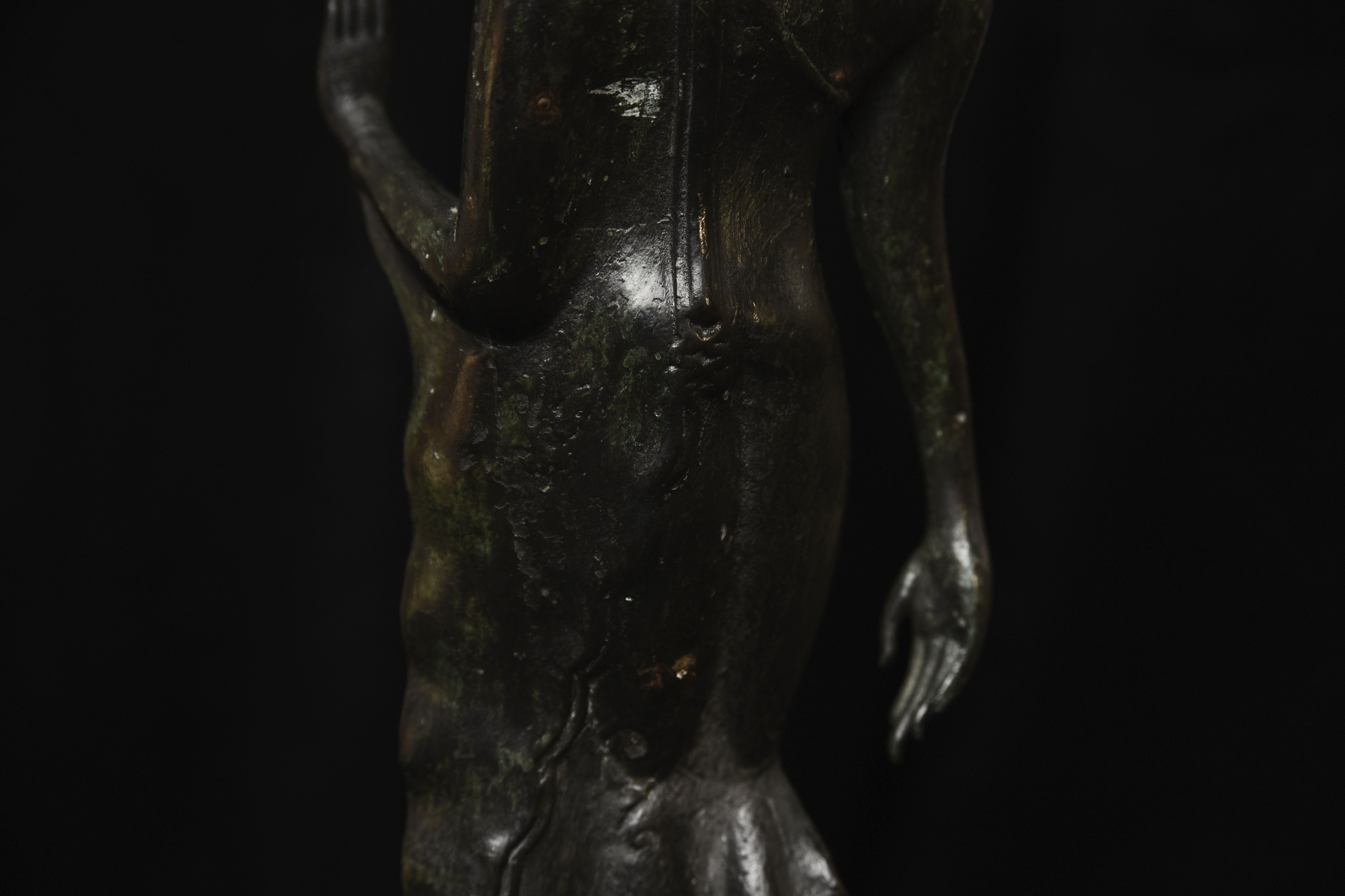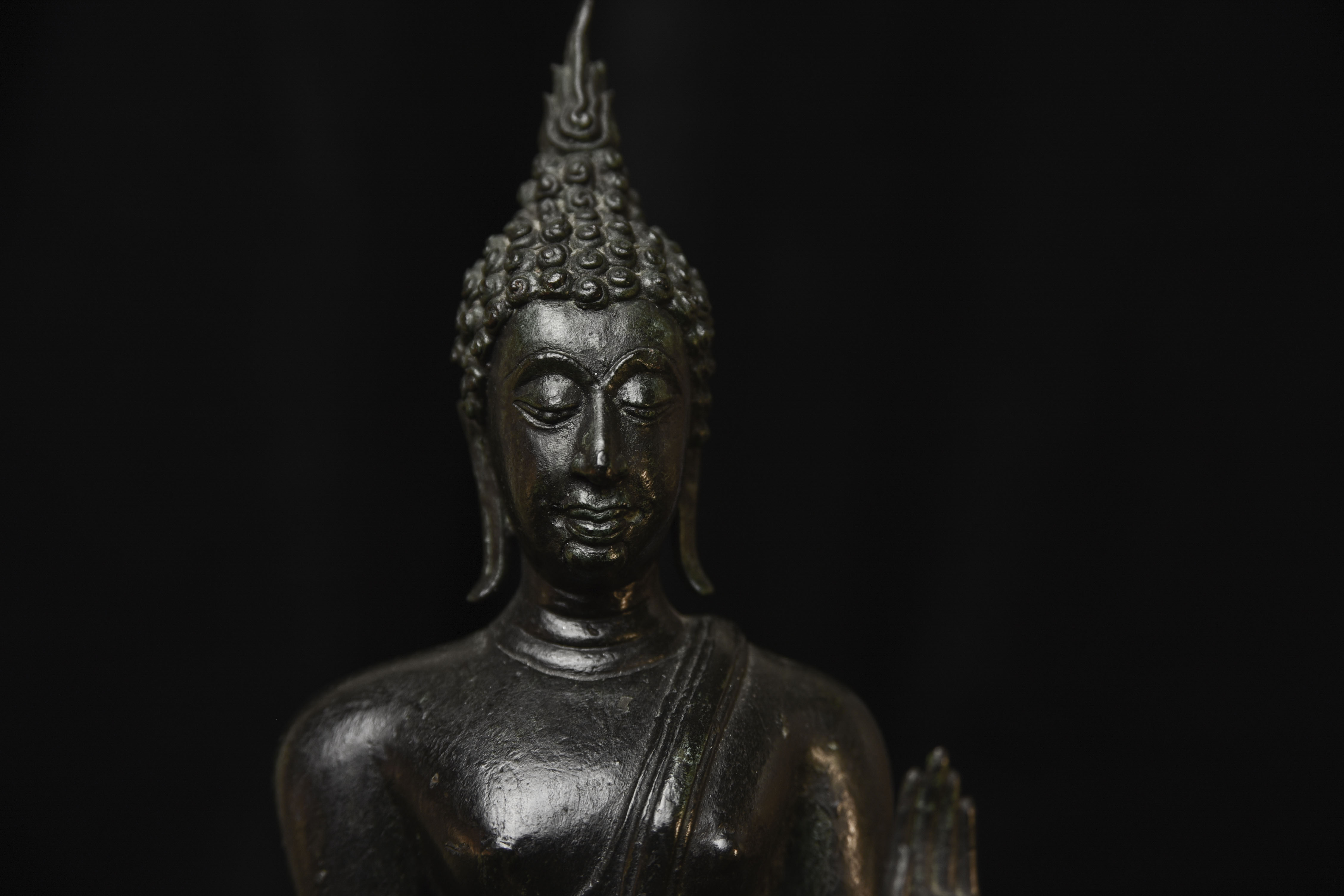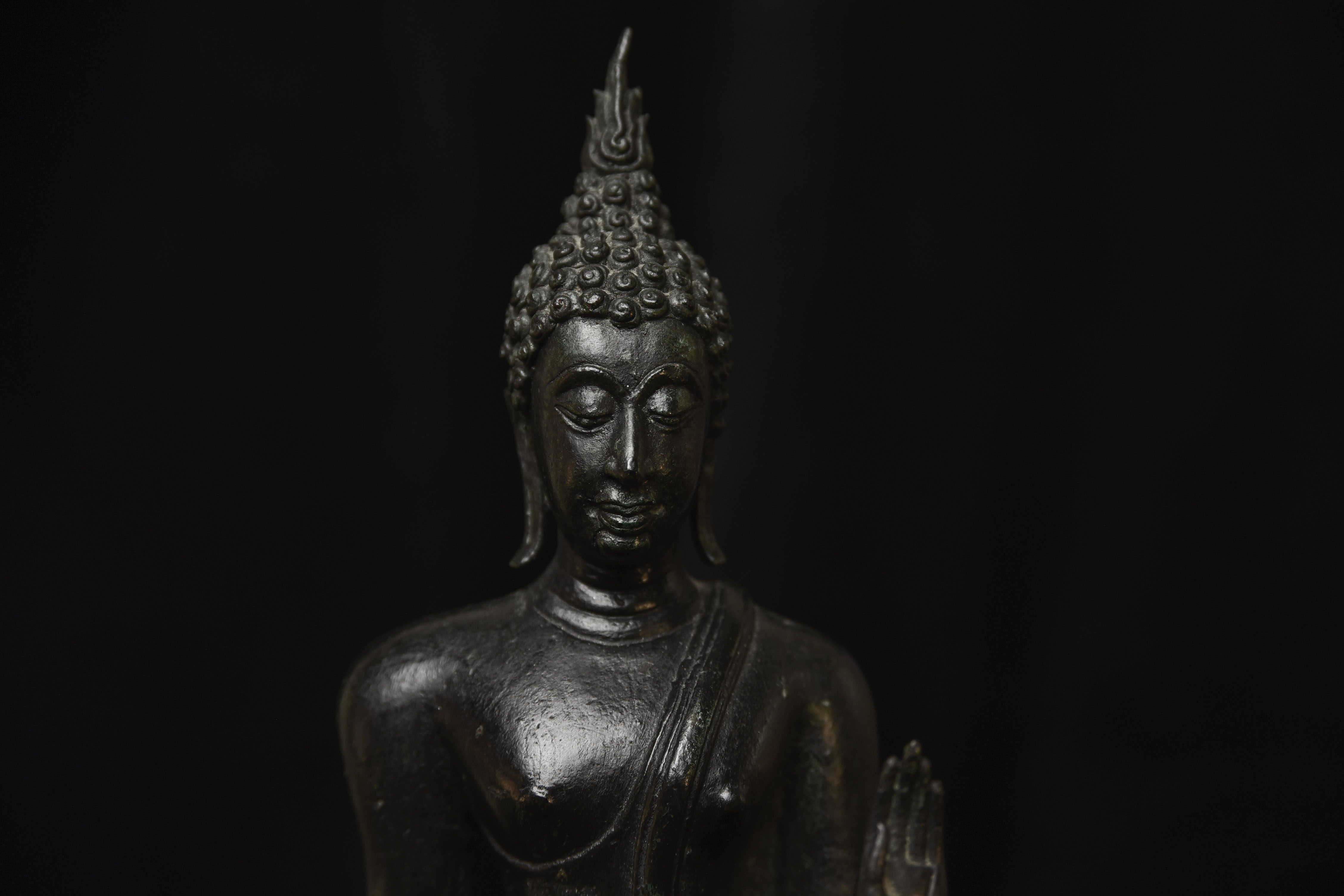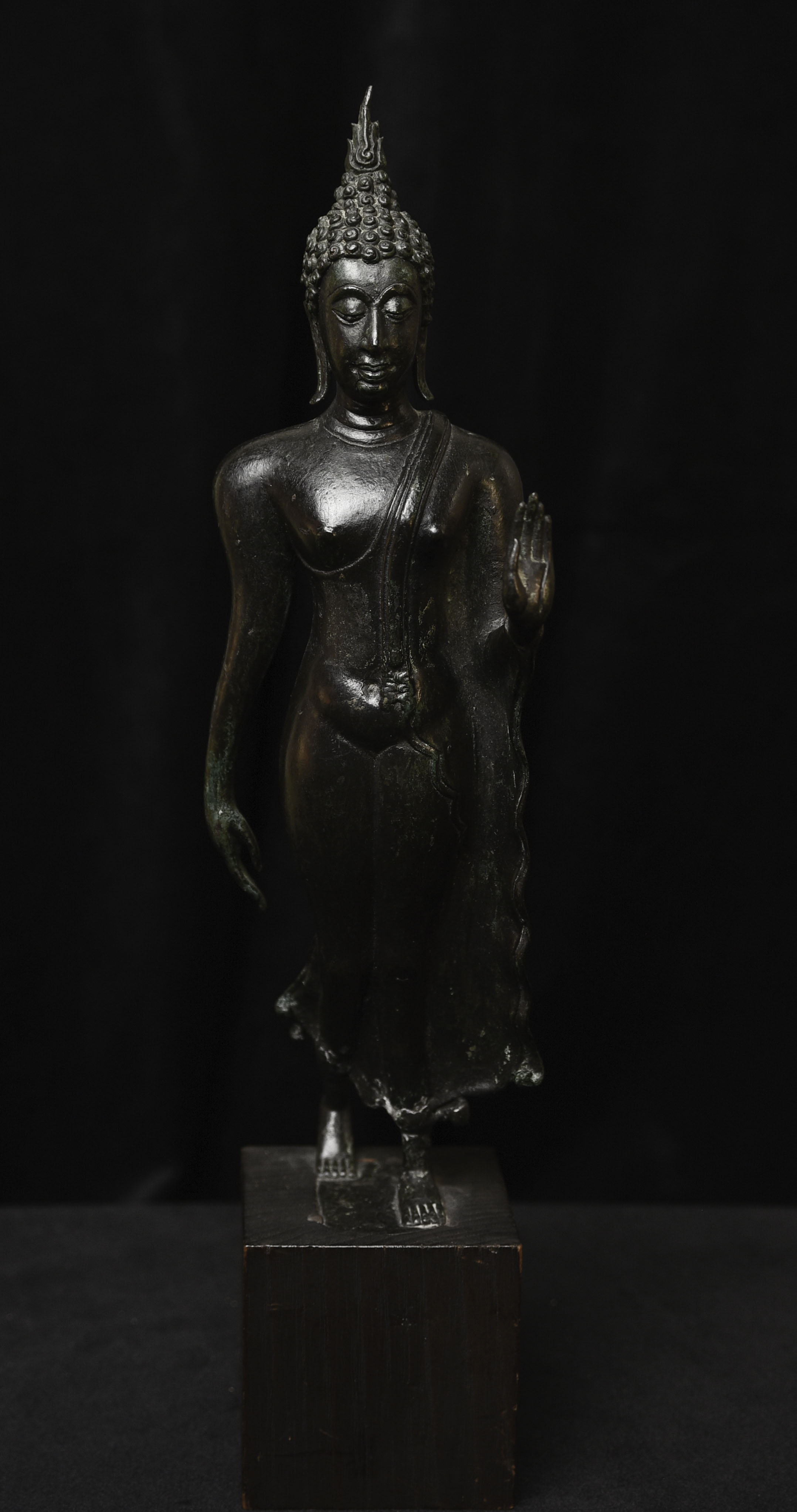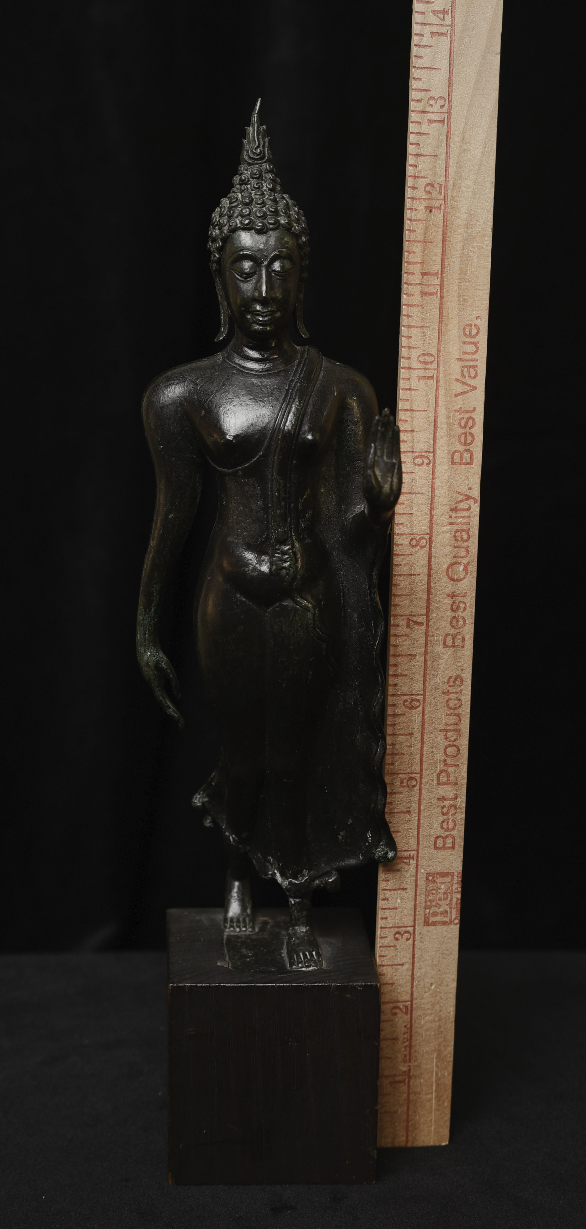 Outstanding Walking Sukothai Buddha. Fifty to seventy-five years old. This is a superb example of its type. Thirteen inches tall, 10.5 inches for the bronze only.
