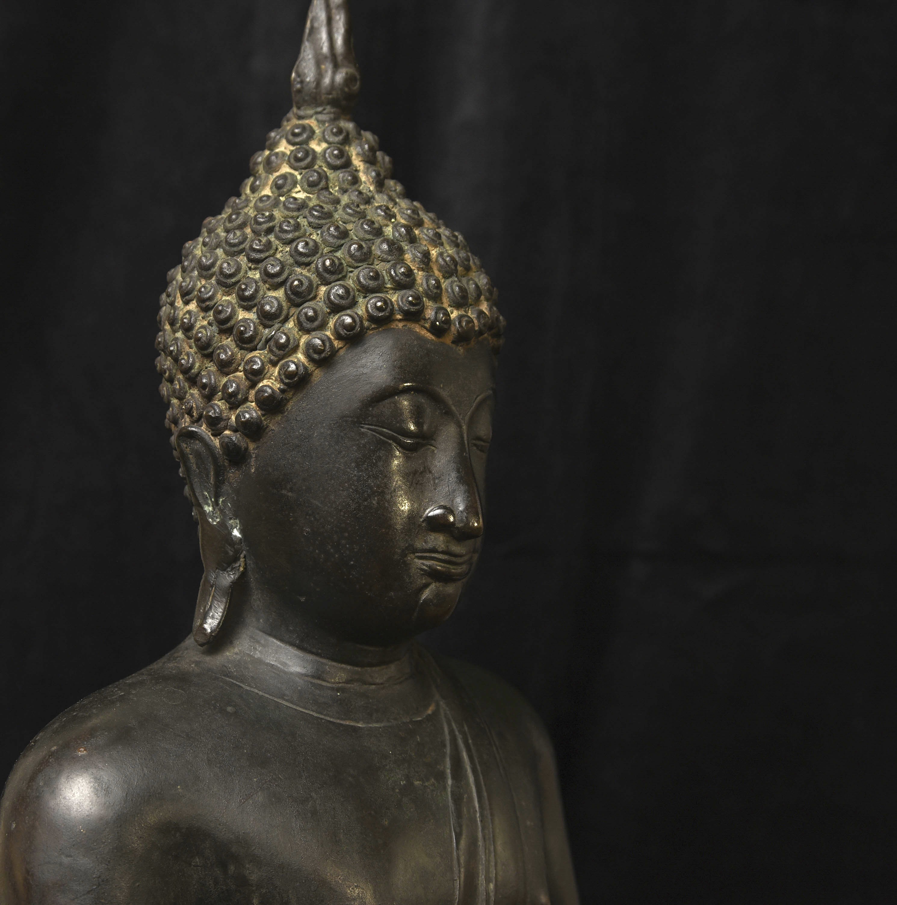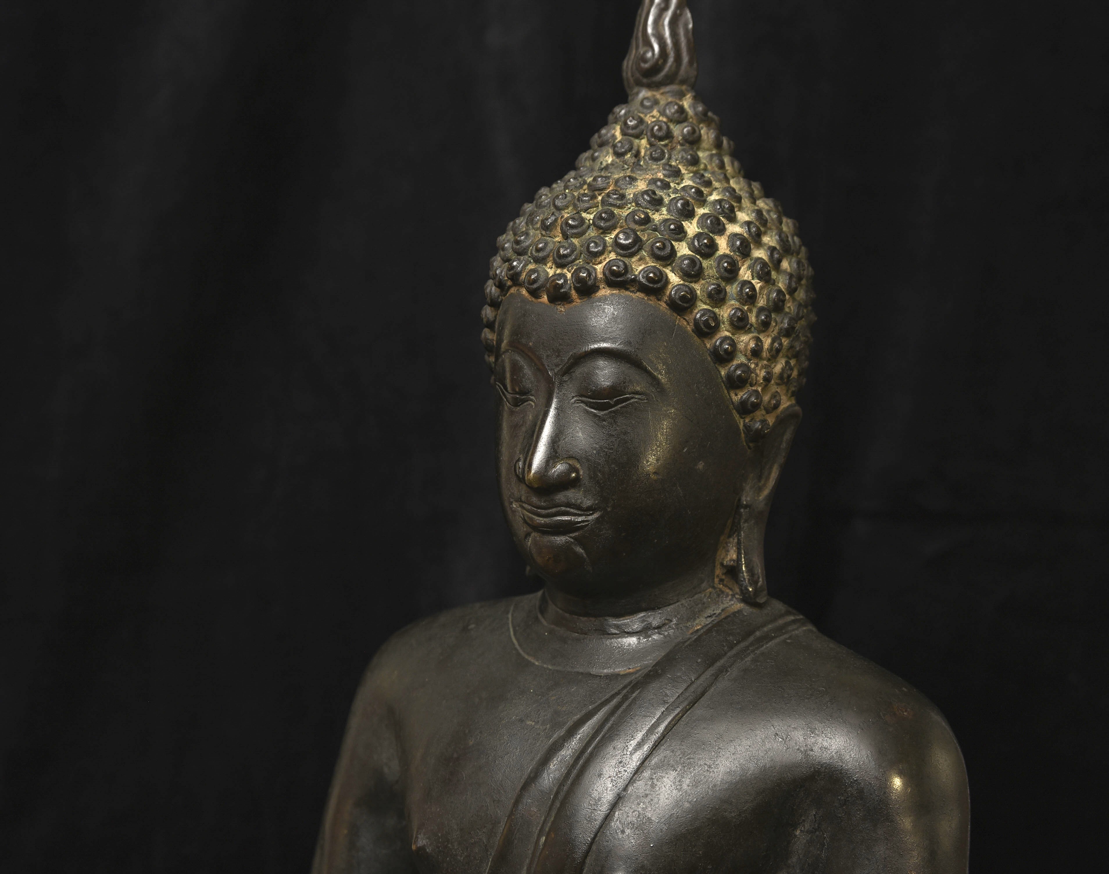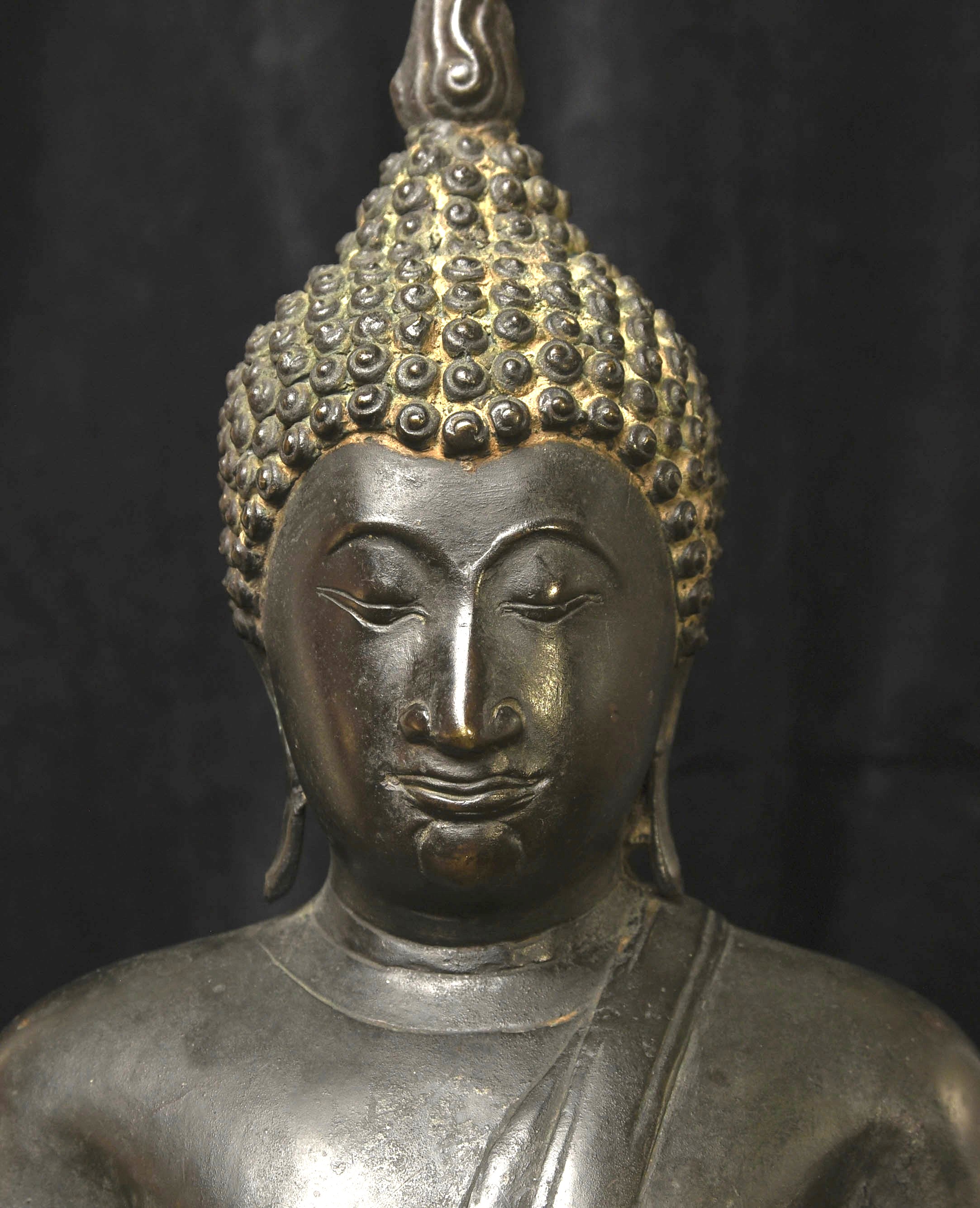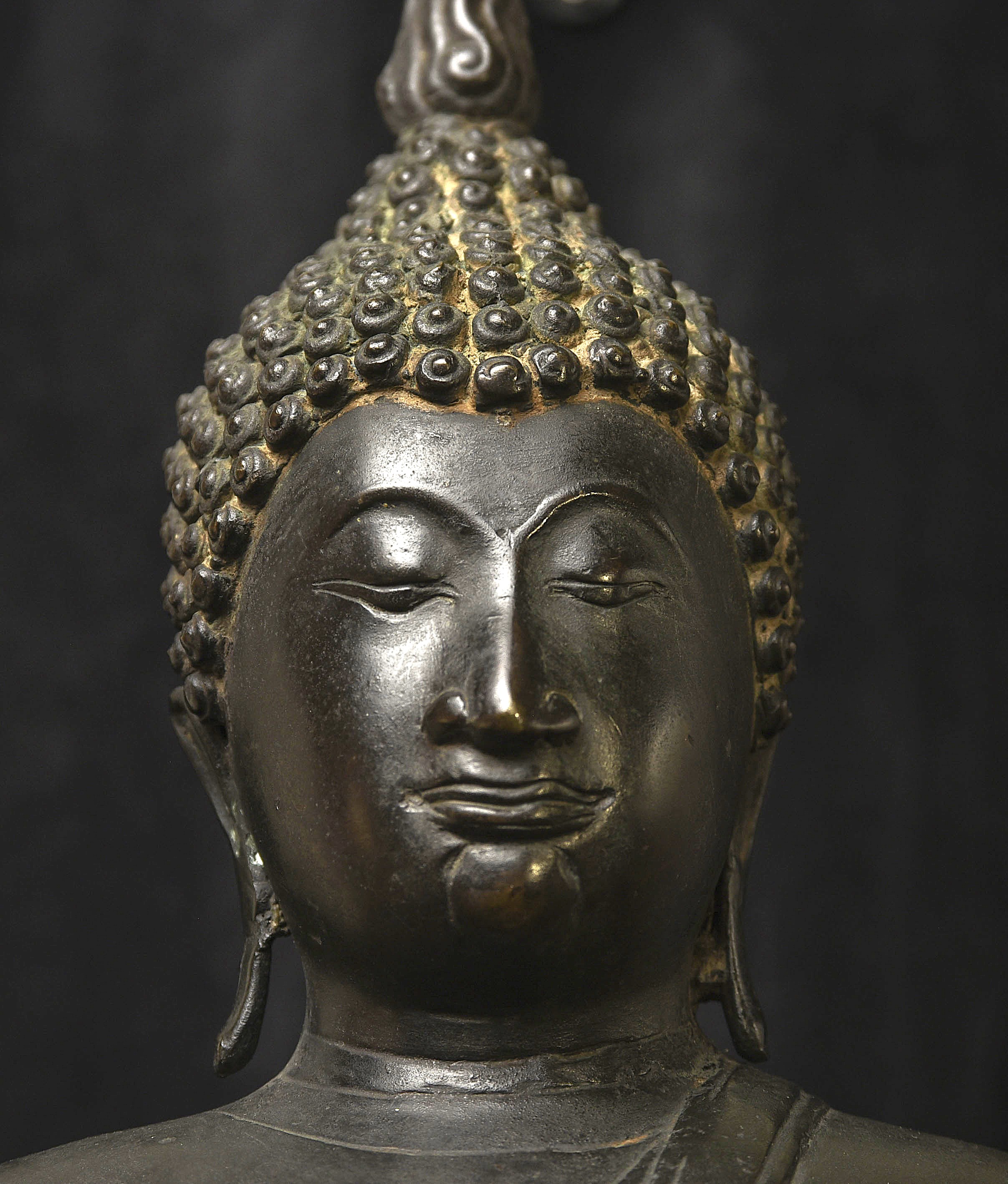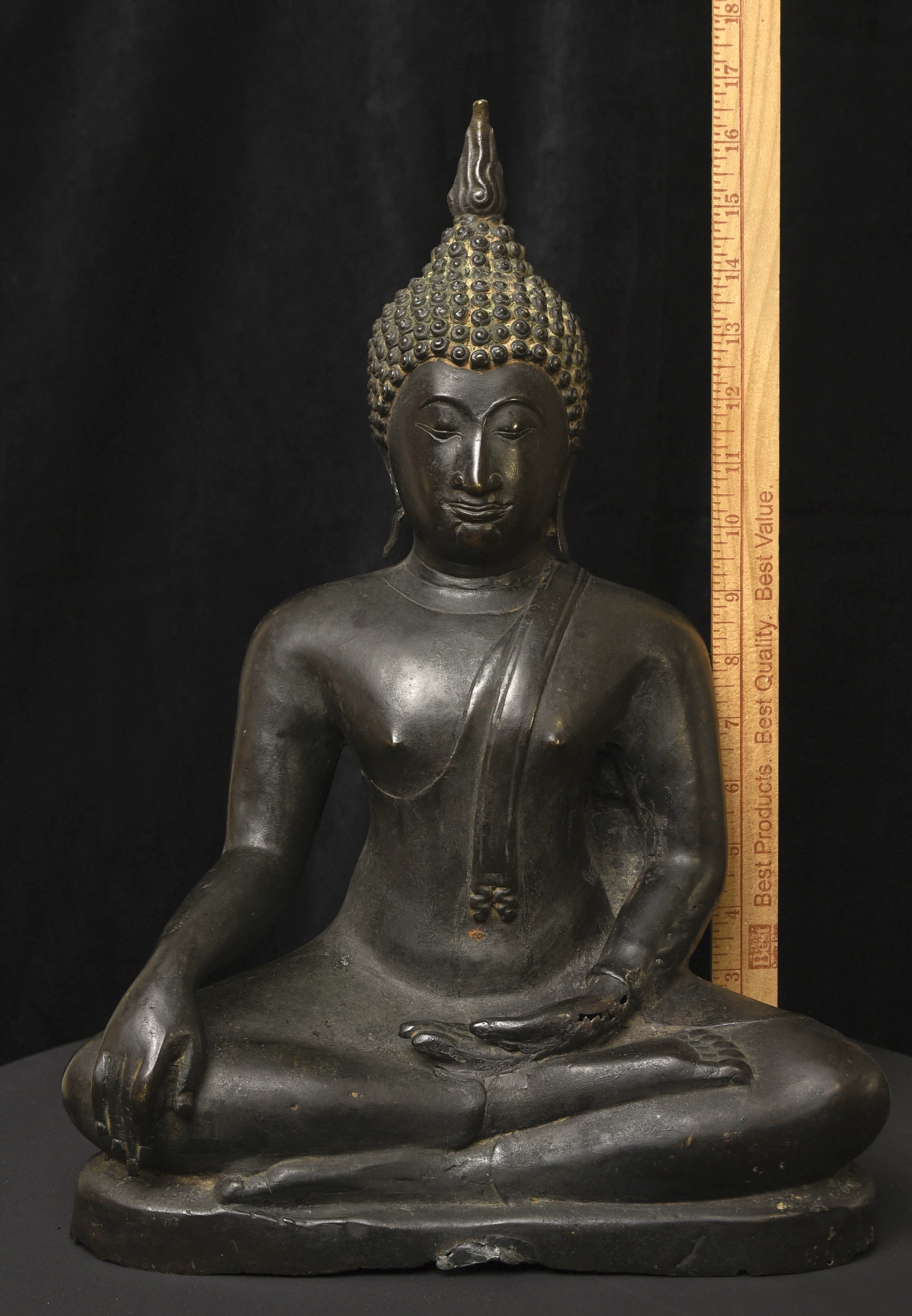 19th century or earlier Large Sukhothai (Thai) Bronze Buddha. Large, Lovely. Serene. This piece has extremely thin casting to the walls, especially for such a large, high-quality Buddha. It may be that it was cast at a time when bronze was in high demand. I have been told this was a reason for casting Buddhas in this way, especially in Thailand during times of War. I have been told that sometimes the bases would also be removed during bronze shortages and melted down to be used for other purposes, especially for making other Buddhas. The main thing was to leave the Buddha's body fully intact. Possible crack at the neck, which would have been part of the original casting process. Entire Buddha, completely solid and head does not look to have then reattached.( 17"H x 11.5"W x 6.25"D ) - 19lbs