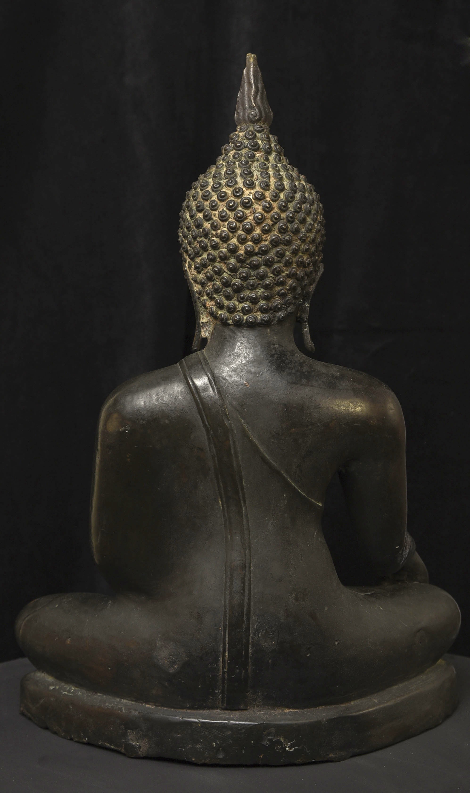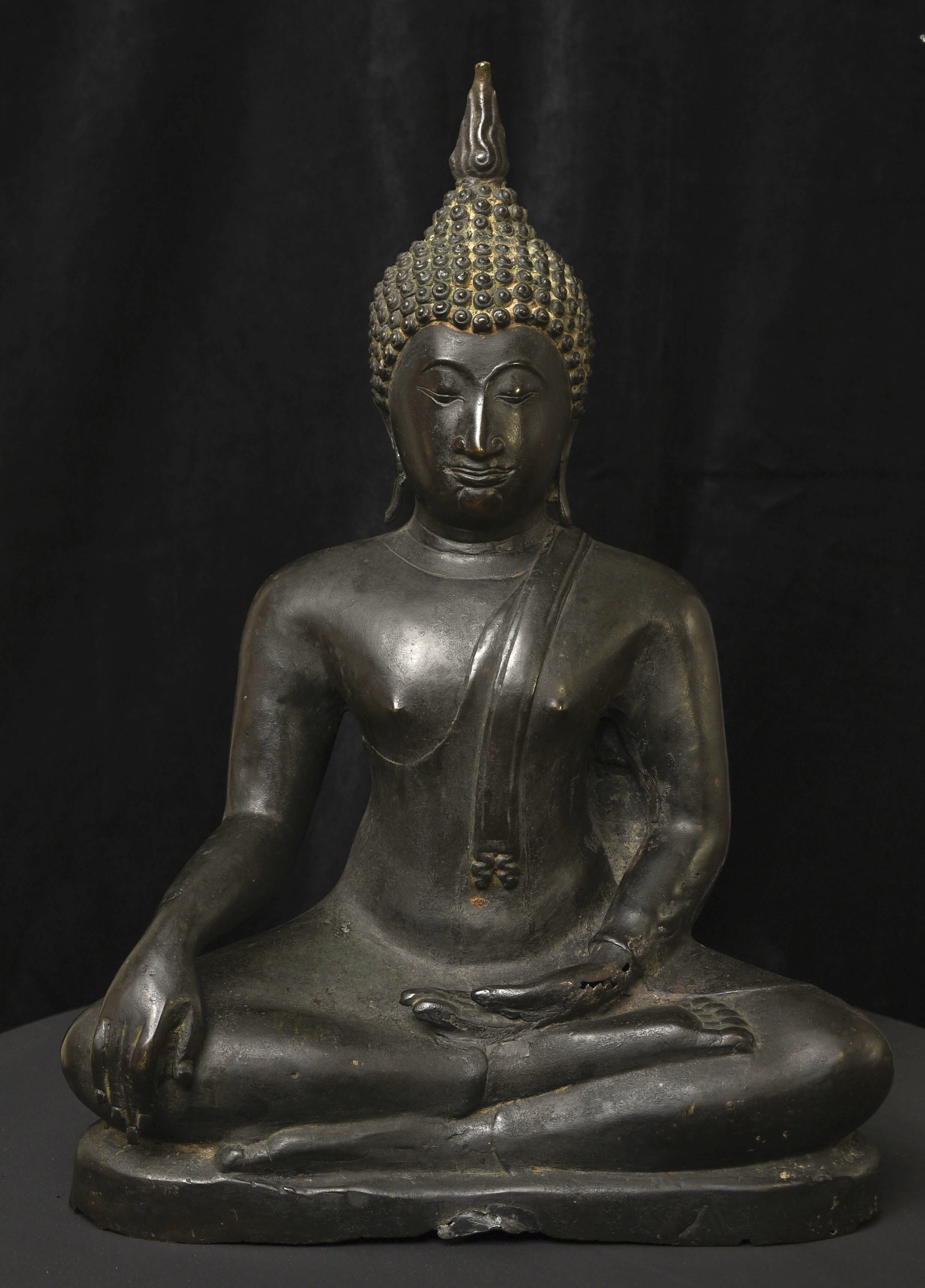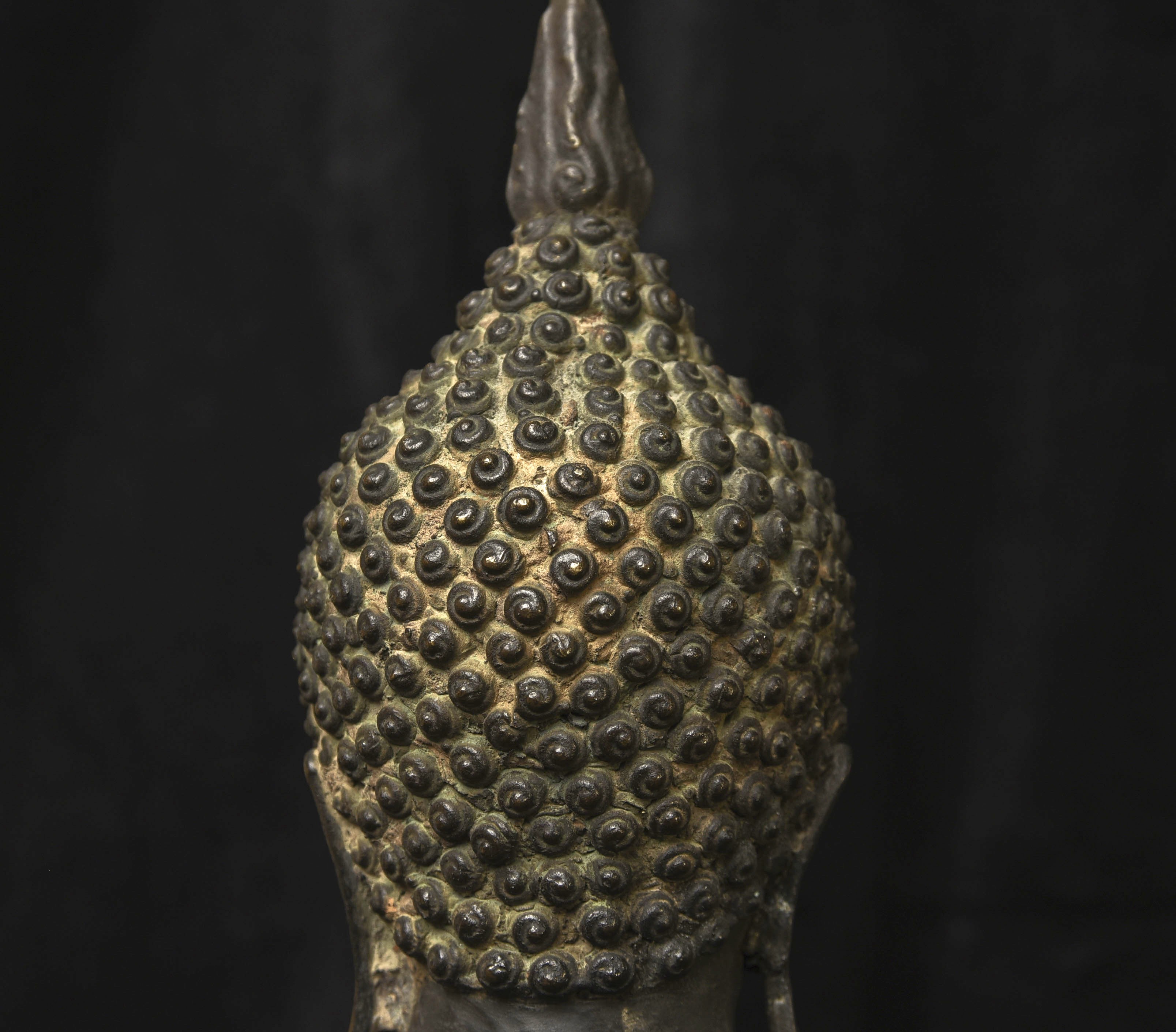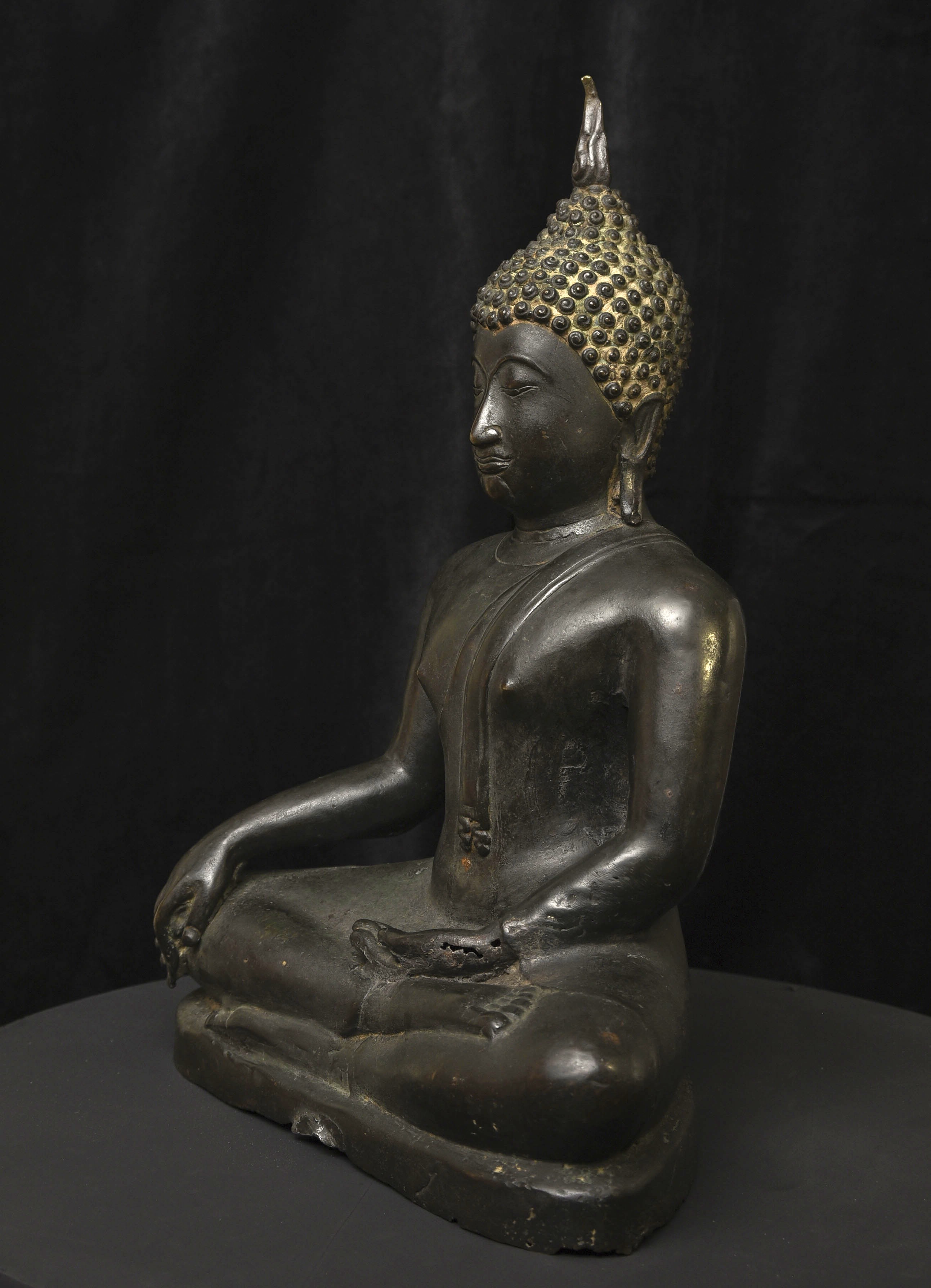 19th century or earlier Large Sukhothai (Thai) Bronze Buddha. Large, Lovely. Serene. This piece has extremely thin casting to the walls, especially for such a large, high-quality Buddha. It may be that it was cast at a time when bronze was in high demand. I have been told this was a reason for casting Buddhas in this way, especially in Thailand during times of War. I have been told that sometimes the bases would also be removed during bronze shortages and melted down to be used for other purposes, especially for making other Buddhas. The main thing was to leave the Buddha's body fully intact. Possible crack at the neck, which would have been part of the original casting process. Entire Buddha, completely solid and head does not look to have then reattached.( 17"H x 11.5"W x 6.25"D ) - 19lbs