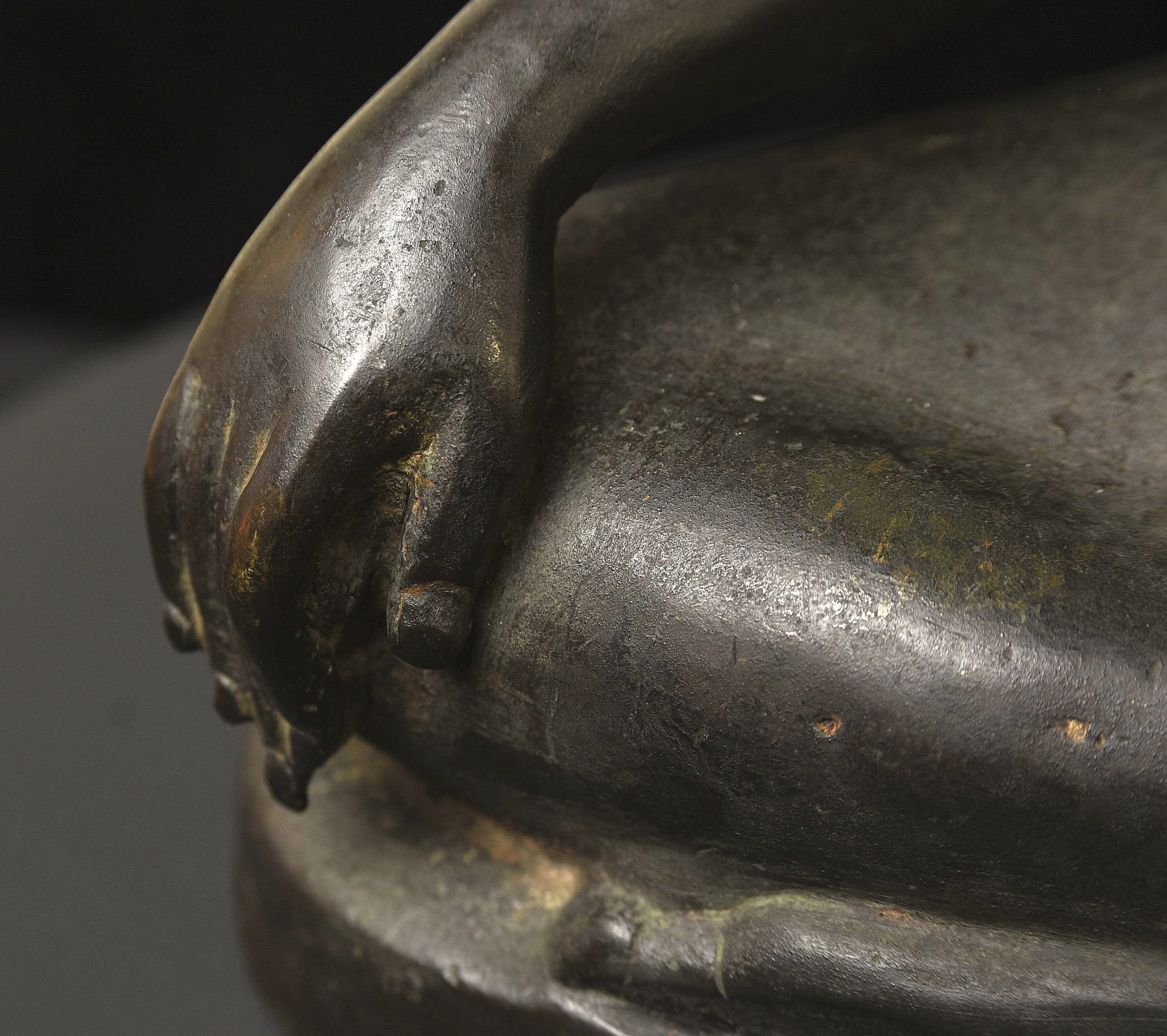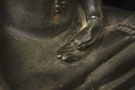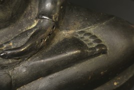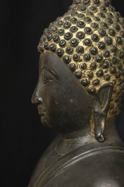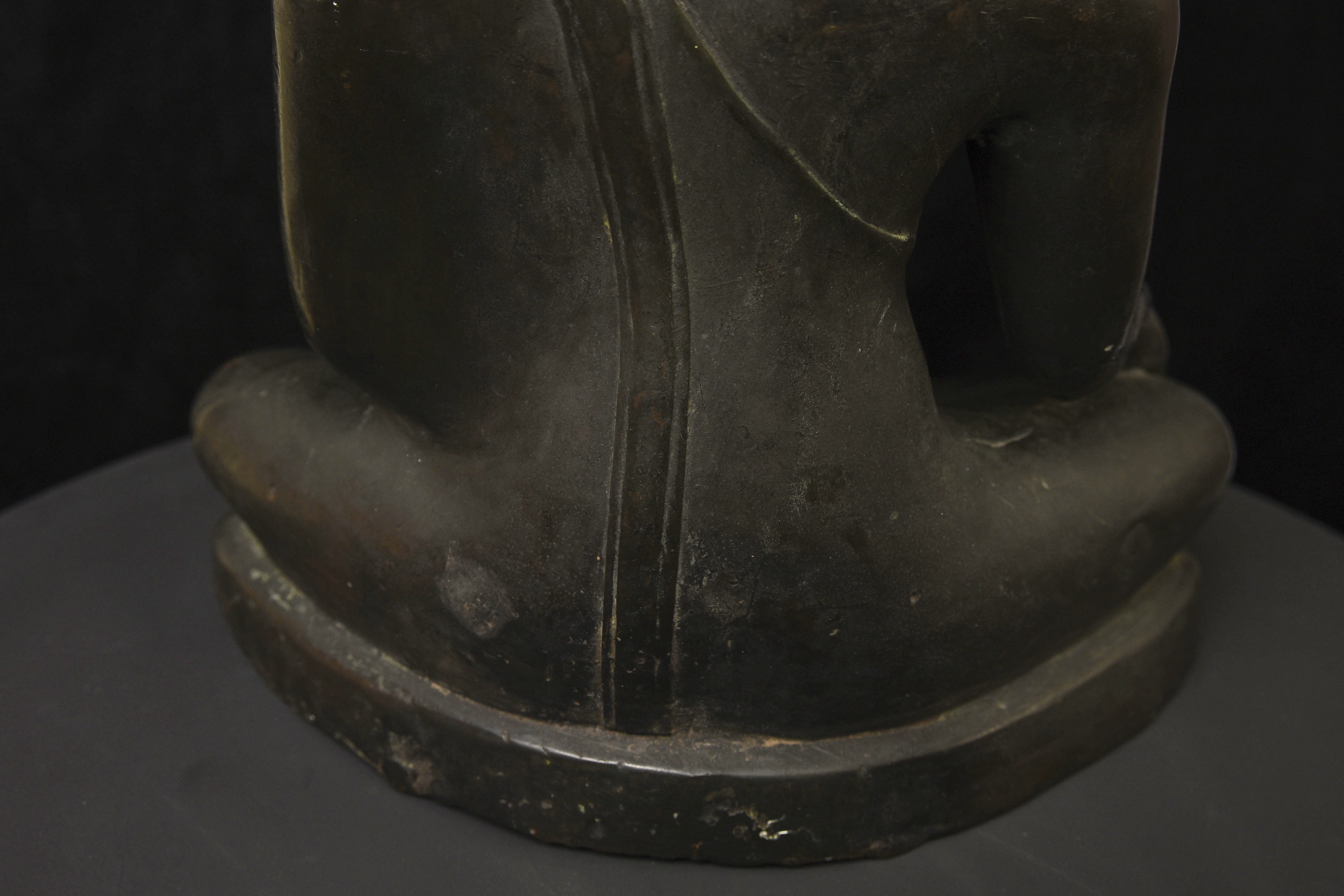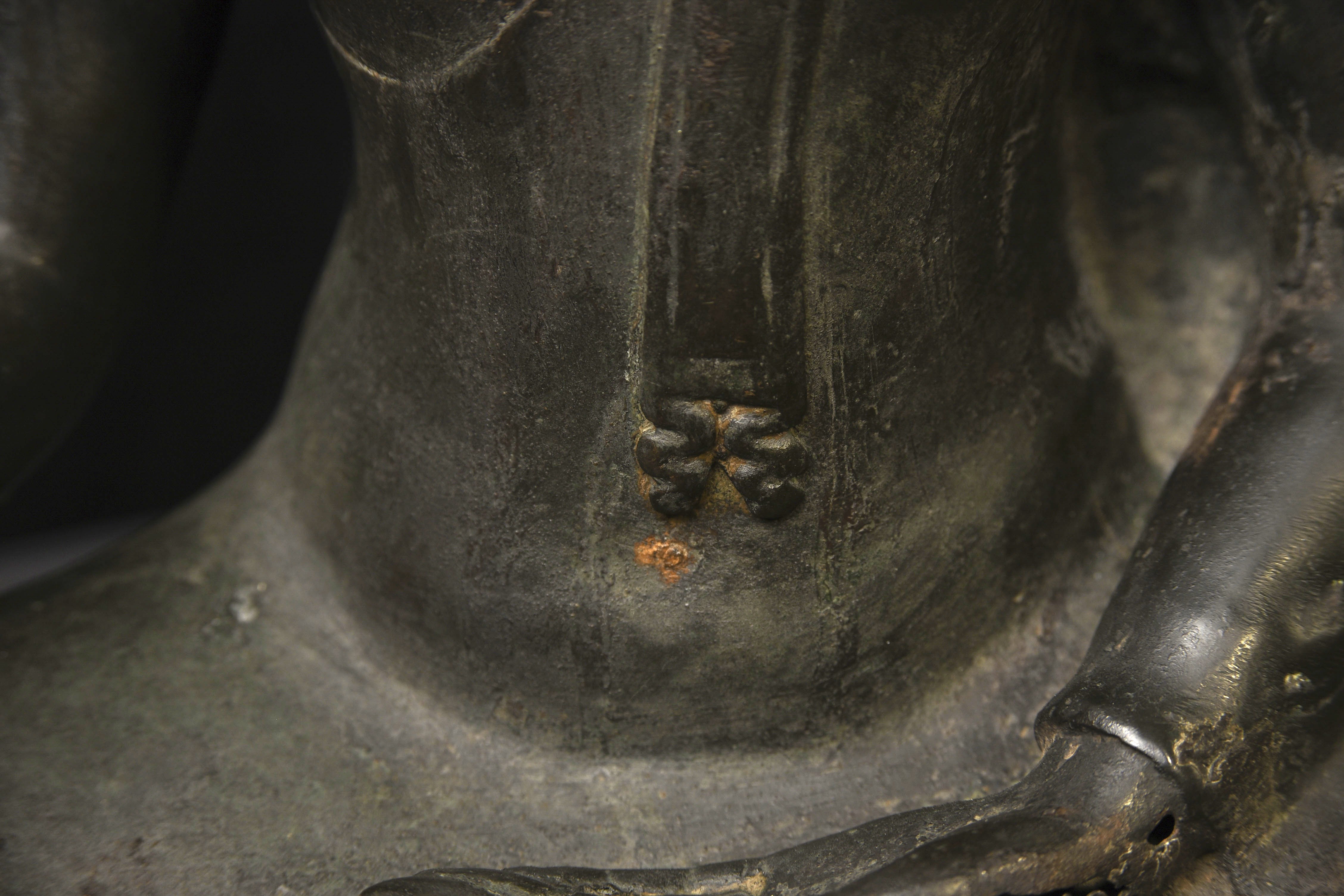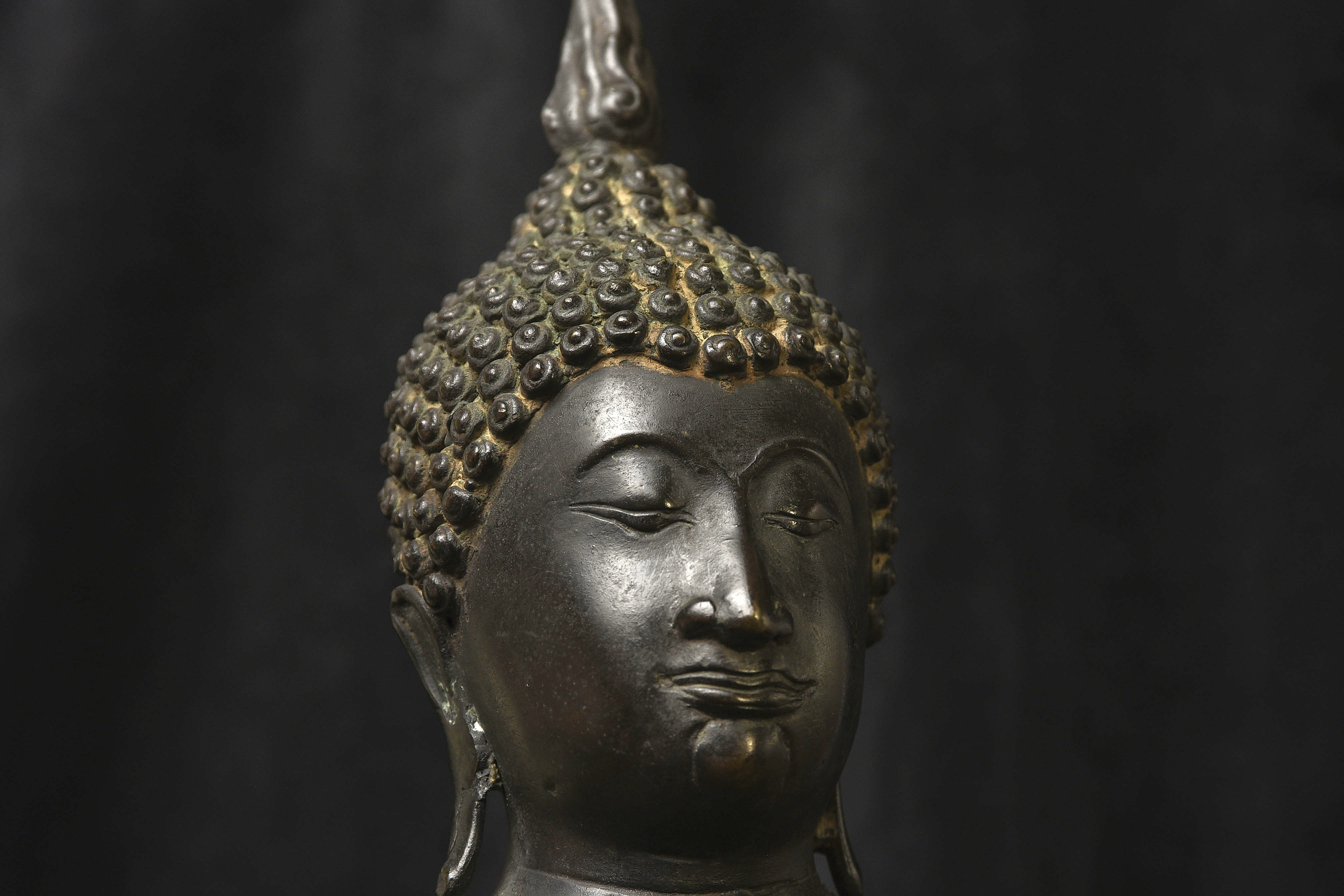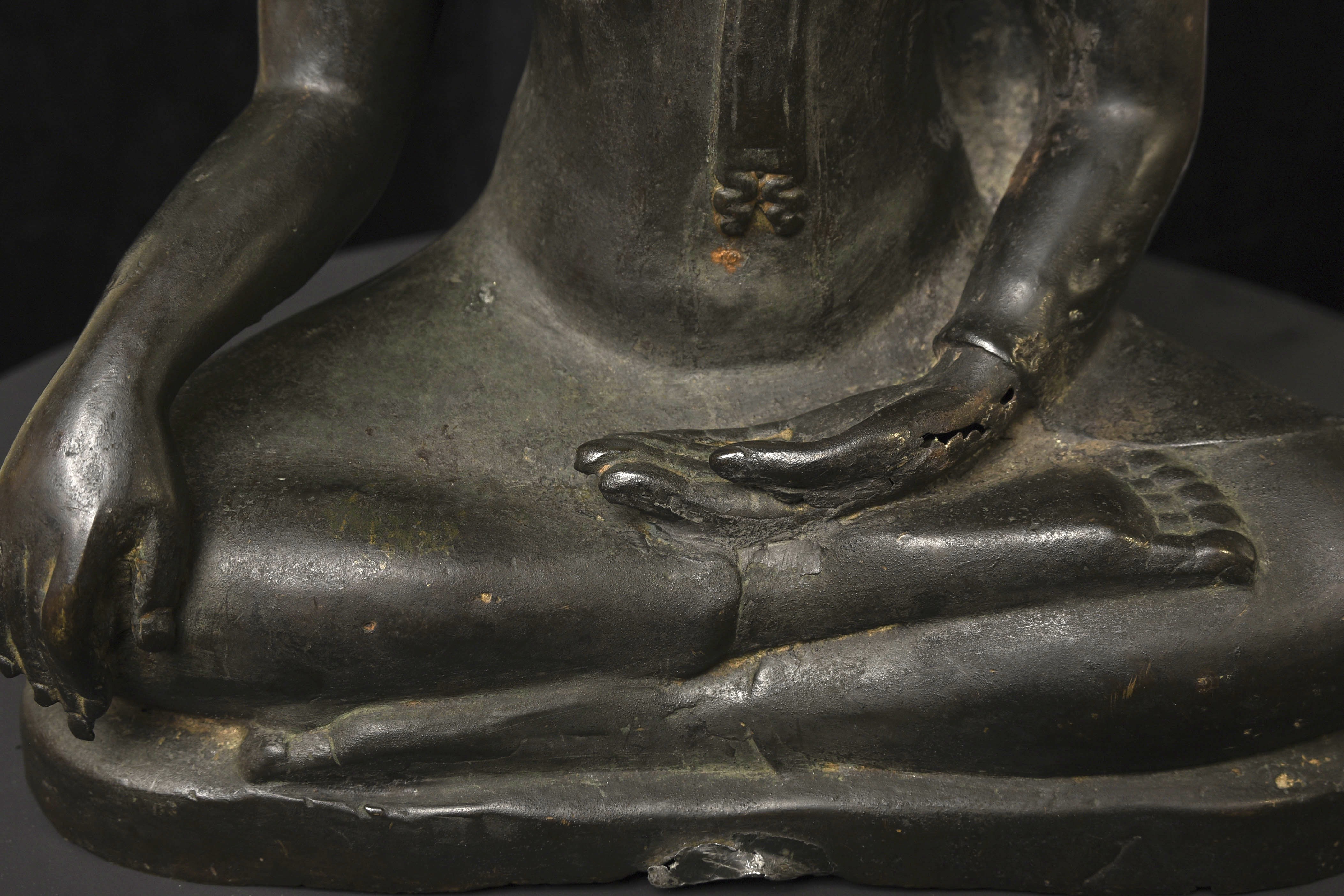 19th century or earlier Large Sukhothai (Thai) Bronze Buddha. Large, Lovely. Serene. This piece has extremely thin casting to the walls, especially for such a large, high-quality Buddha. It may be that it was cast at a time when bronze was in high demand. I have been told this was a reason for casting Buddhas in this way, especially in Thailand during times of War. I have been told that sometimes the bases would also be removed during bronze shortages and melted down to be used for other purposes, especially for making other Buddhas. The main thing was to leave the Buddha's body fully intact. Possible crack at the neck, which would have been part of the original casting process. Entire Buddha, completely solid and head does not look to have then reattached.( 17"H x 11.5"W x 6.25"D ) - 19lbs