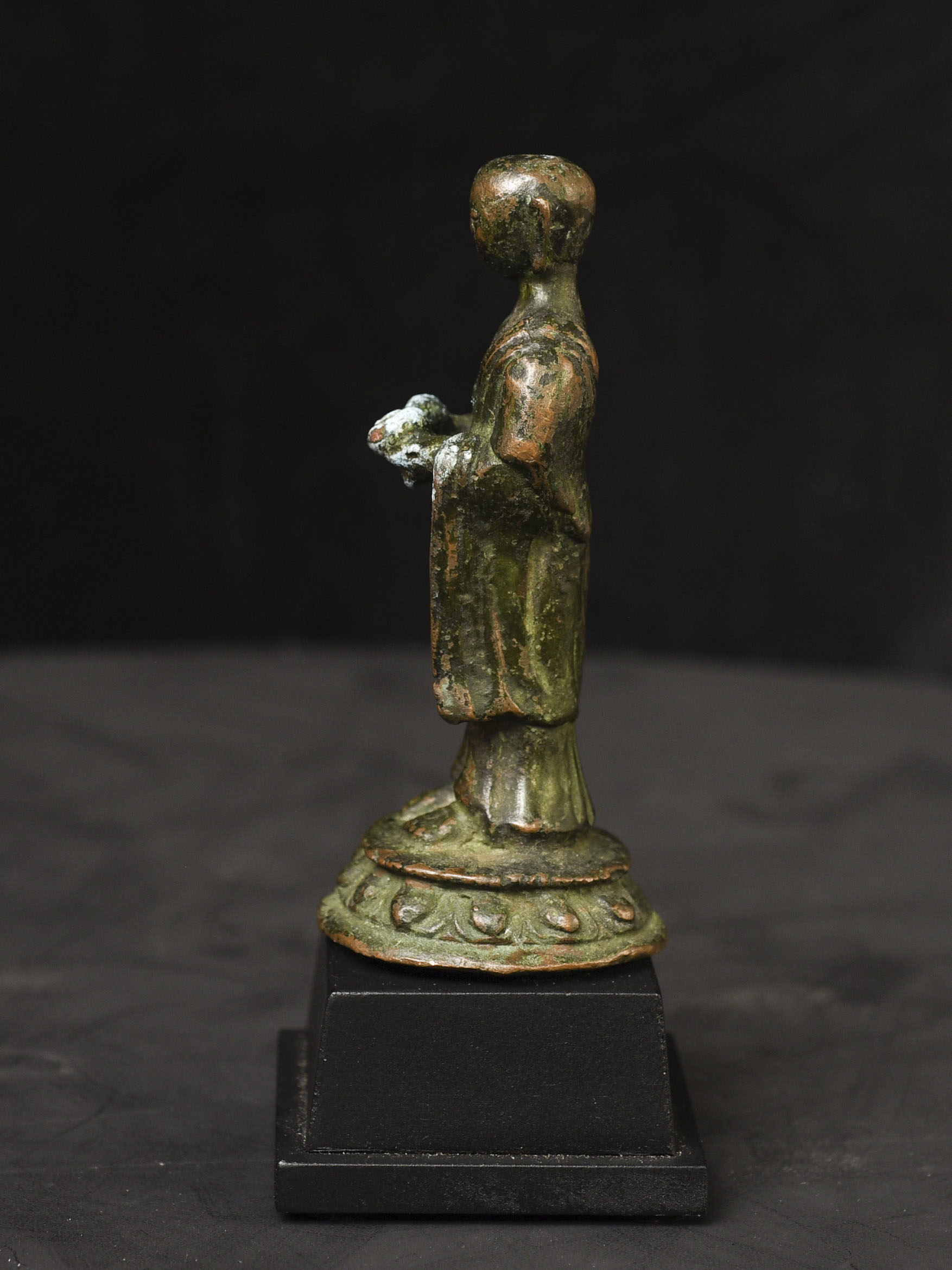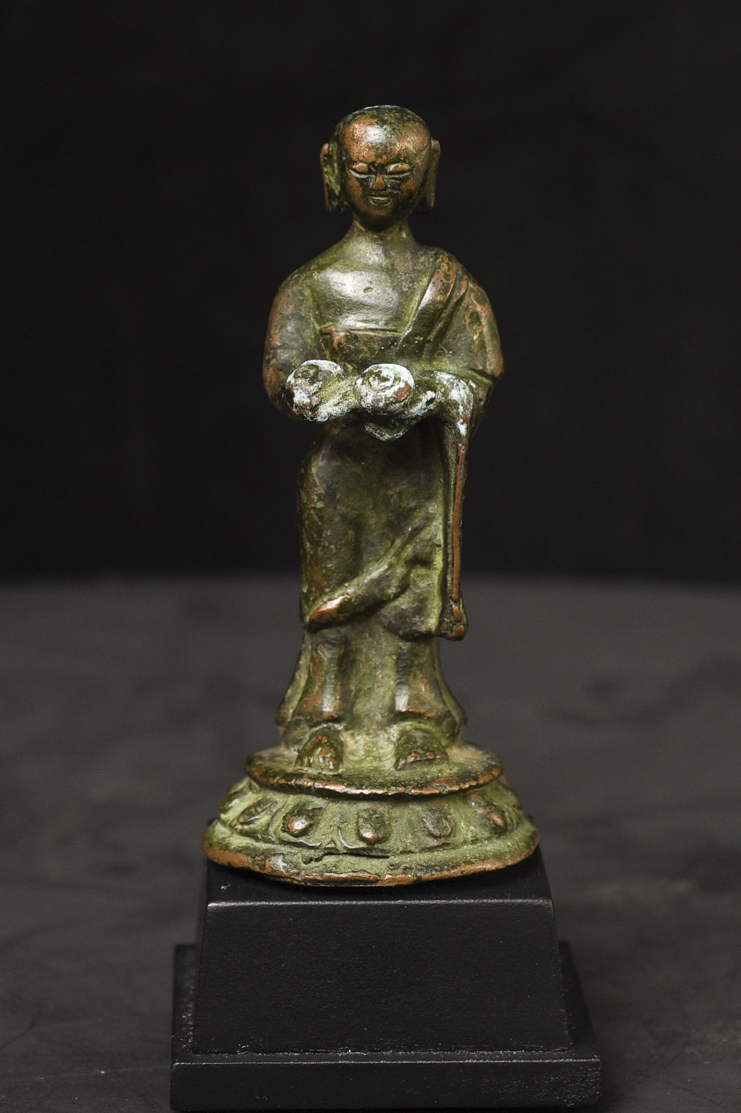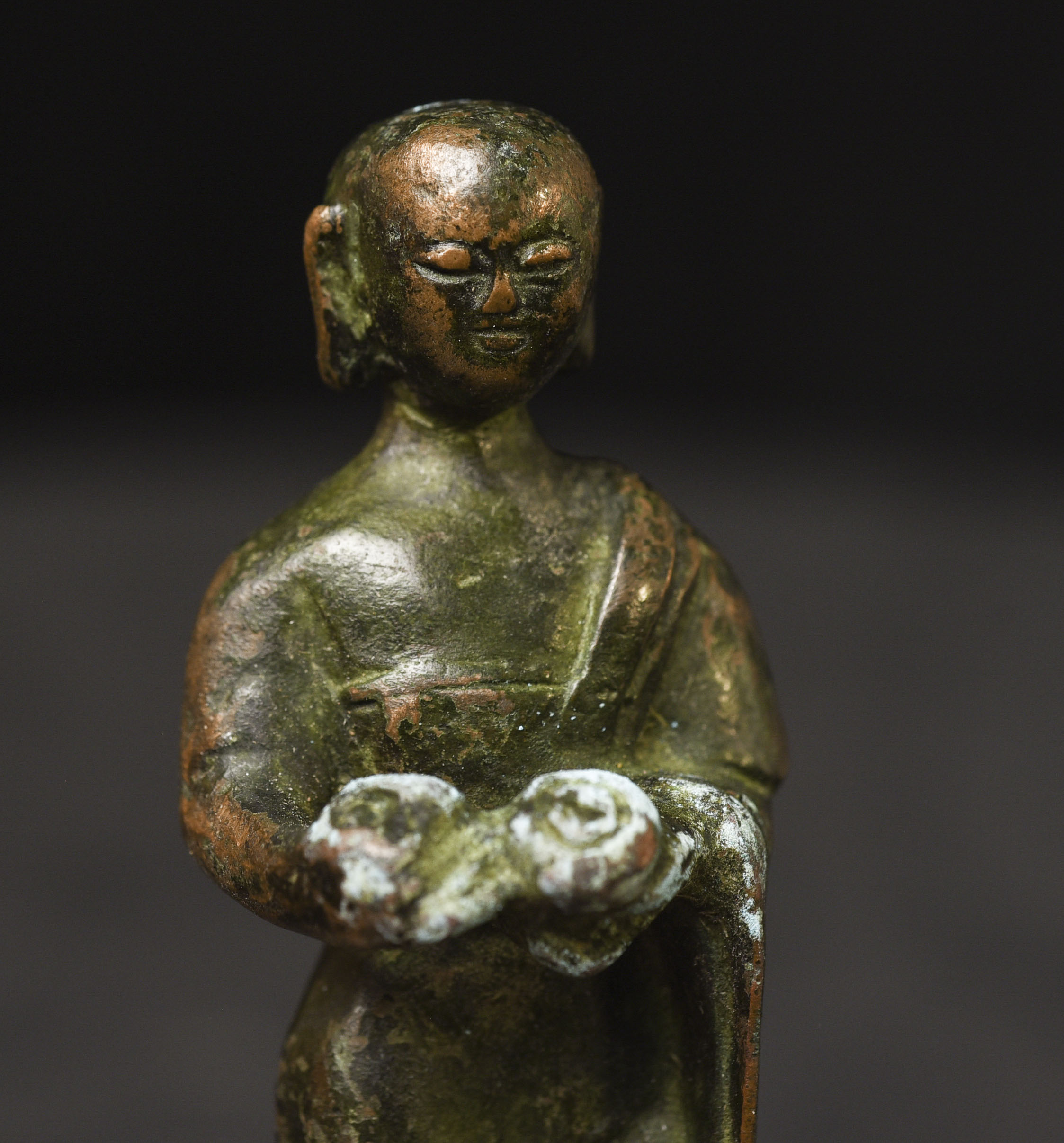 18thC or earlier Tibeto- Chinese Bronze Buddhist Monk. Very sweet face and overall feel. Rare near miniature size, but with all the detail and presence of a much larger example. Measures 3 5/8" tall Not including the new museum-style custom base. Wear and a bit of patina issue on the hands as seen in photos.
