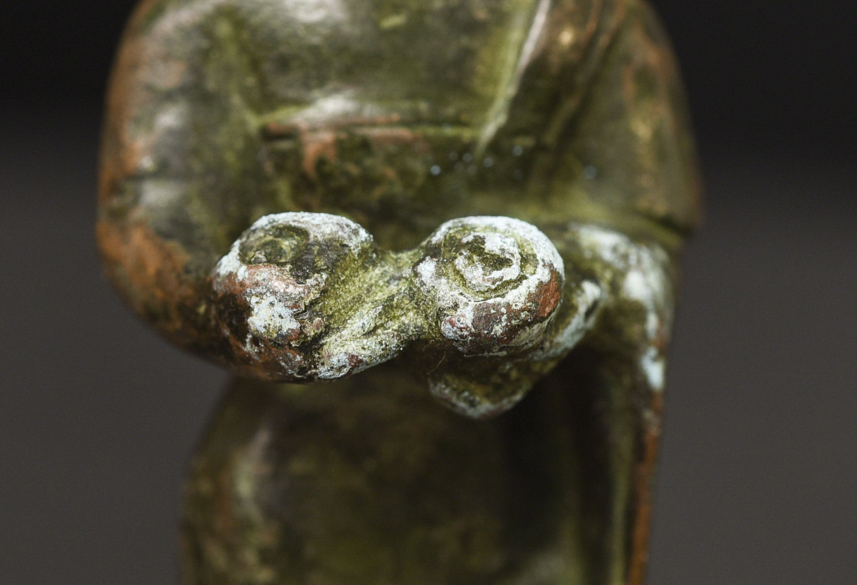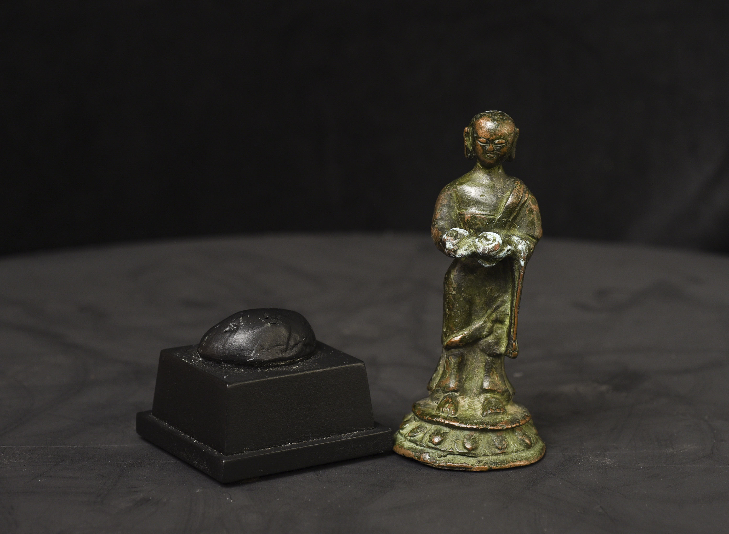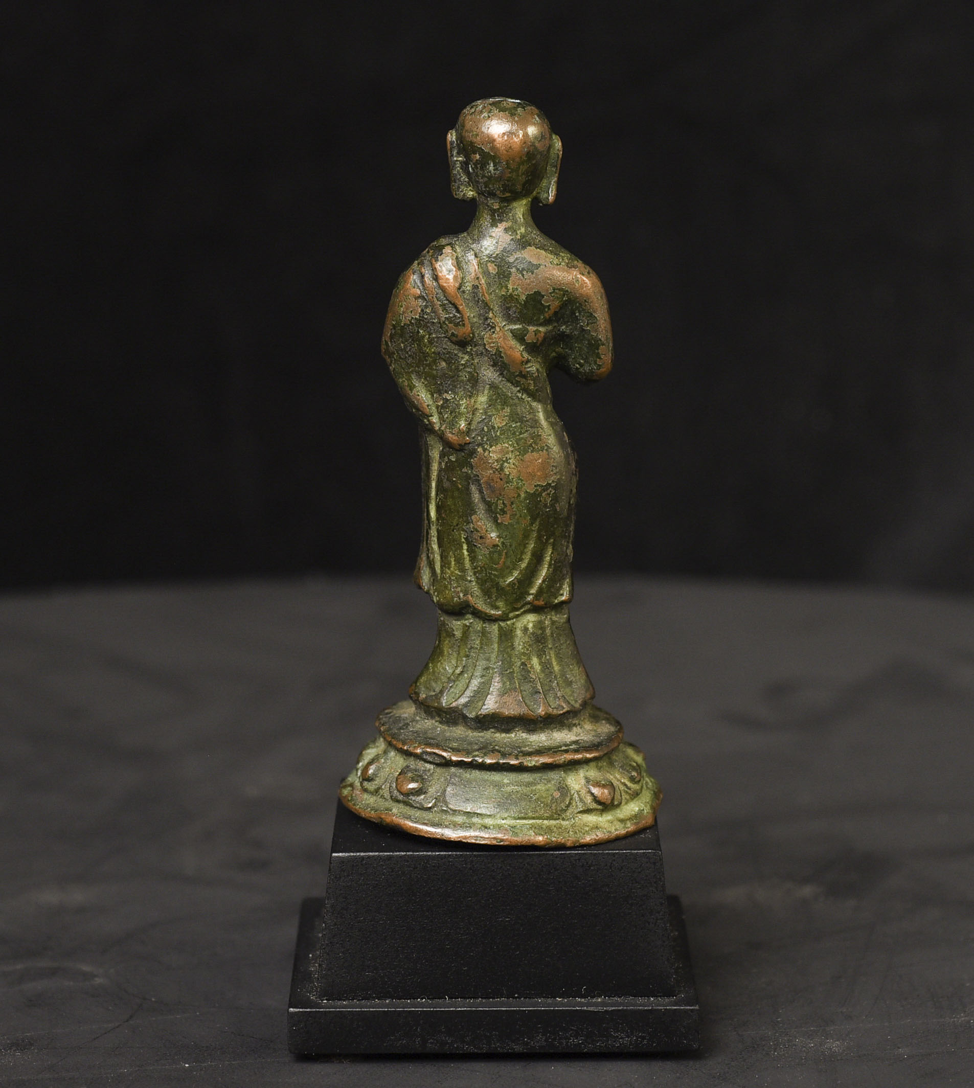 18thC or earlier Tibeto- Chinese Bronze Buddhist Monk. Very sweet face and overall feel. Rare near miniature size, but with all the detail and presence of a much larger example. Measures 3 5/8" tall Not including the new museum-style custom base. Wear and a bit of patina issue on the hands as seen in photos.