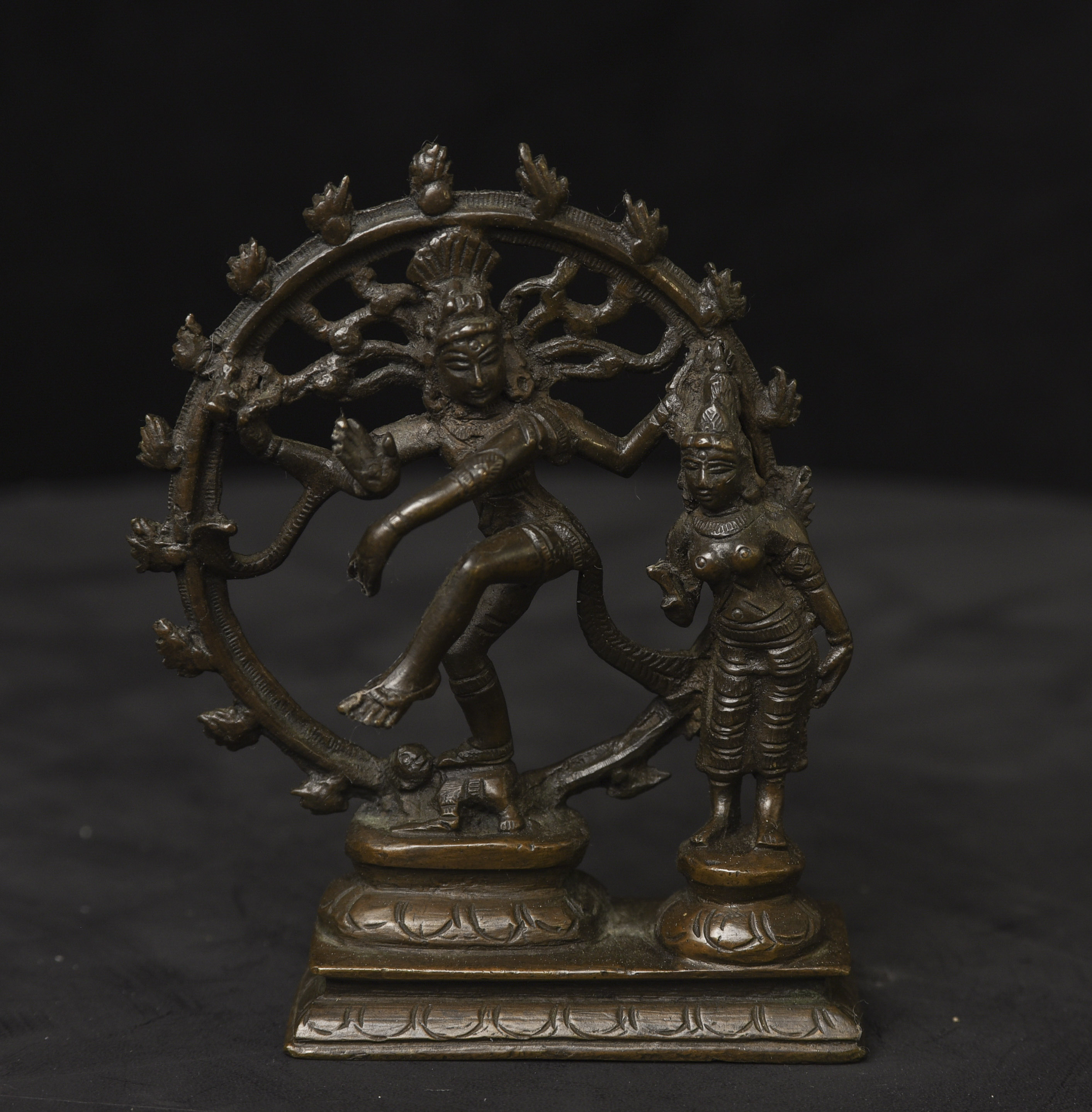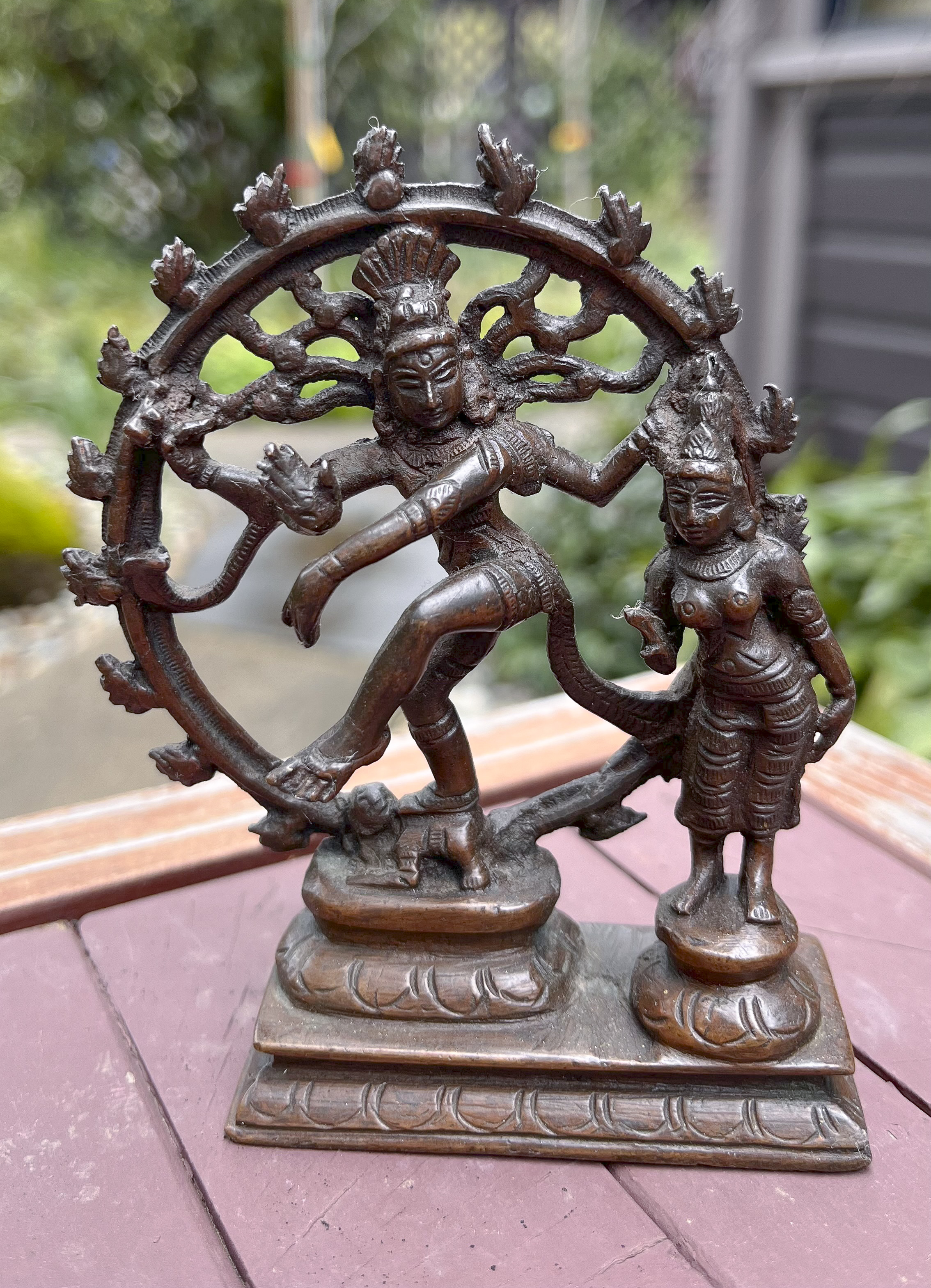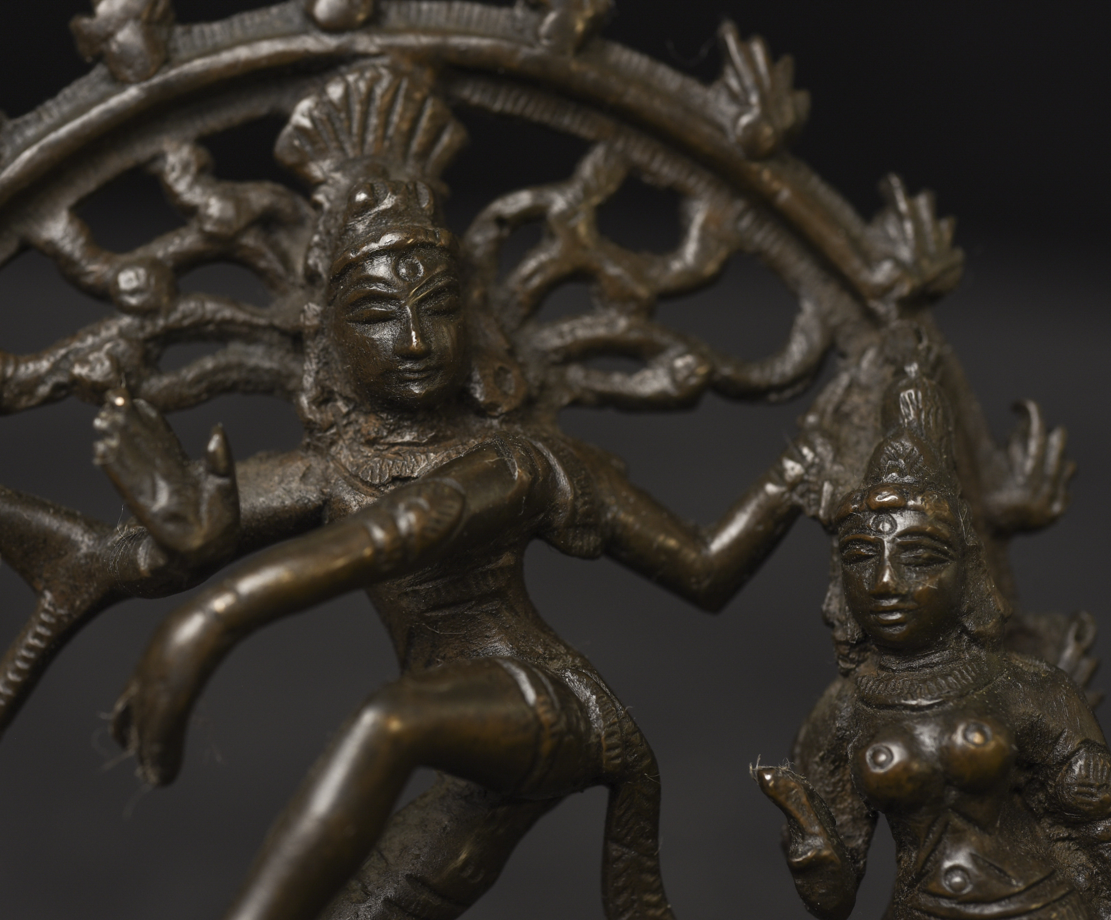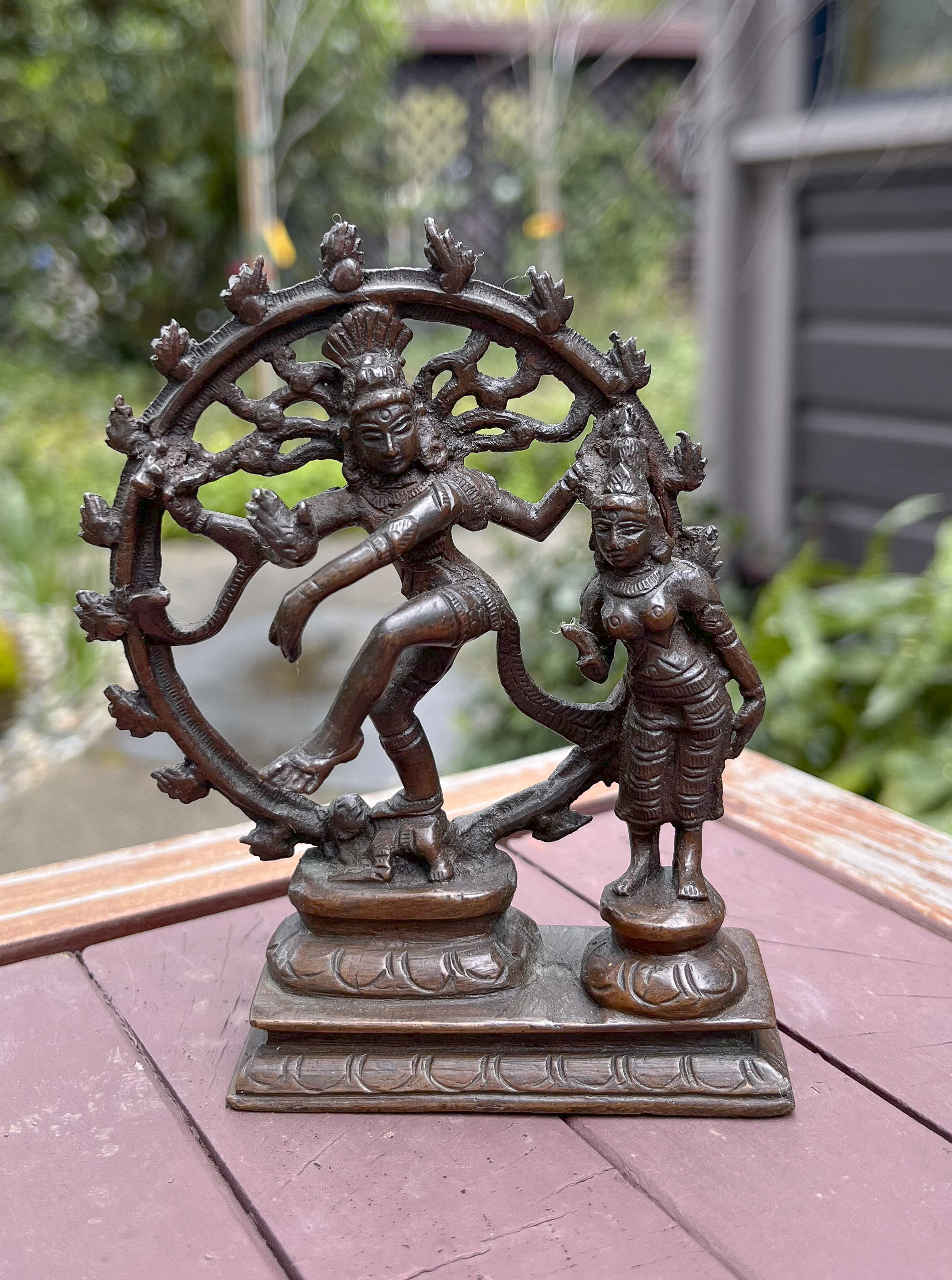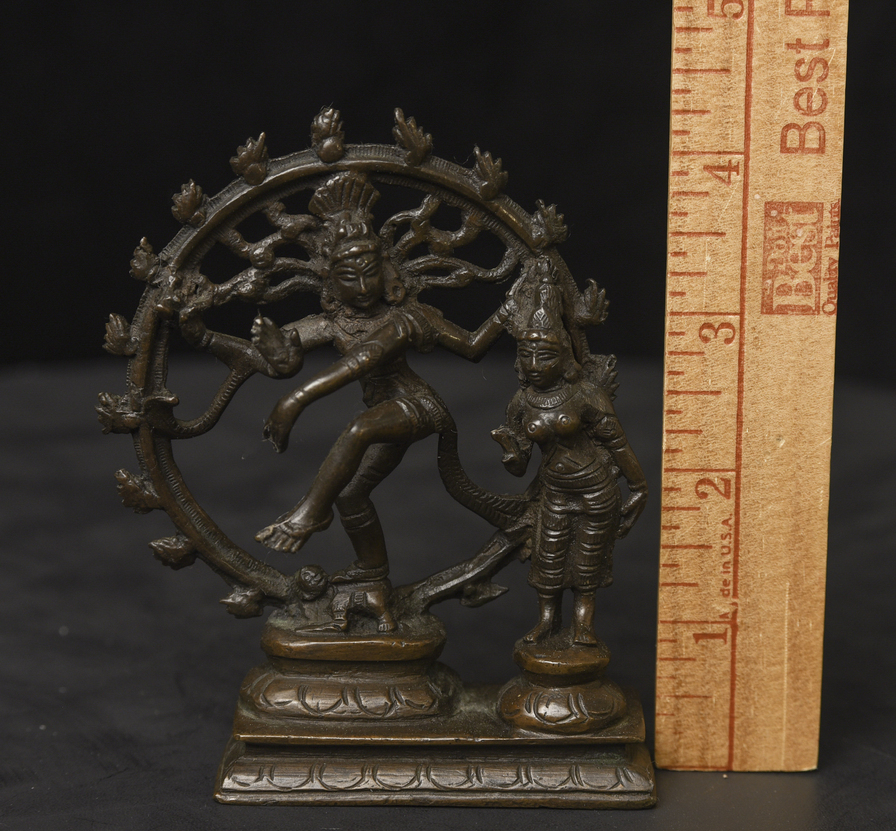 19thC India Bronze Shiva Nataraj-Beautiful lord of the dance. Rare example with consort. Remarkably, only 4.5 inches tall. Hard to find.