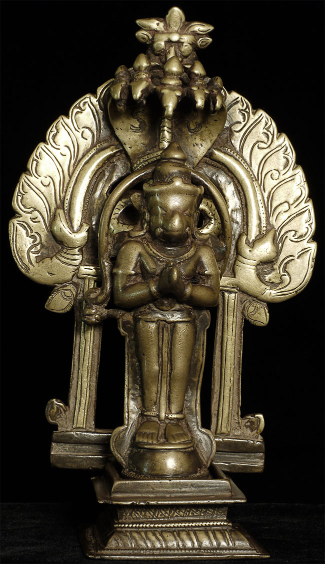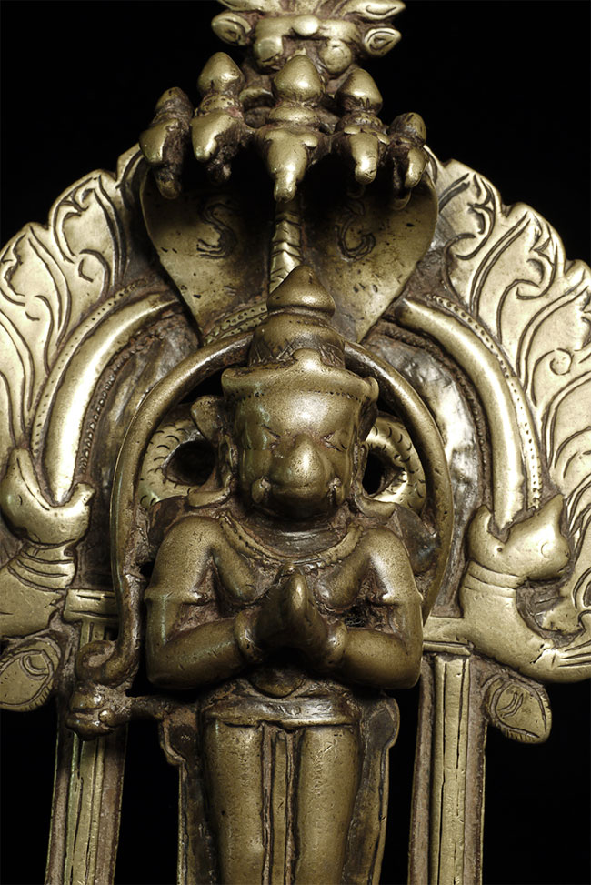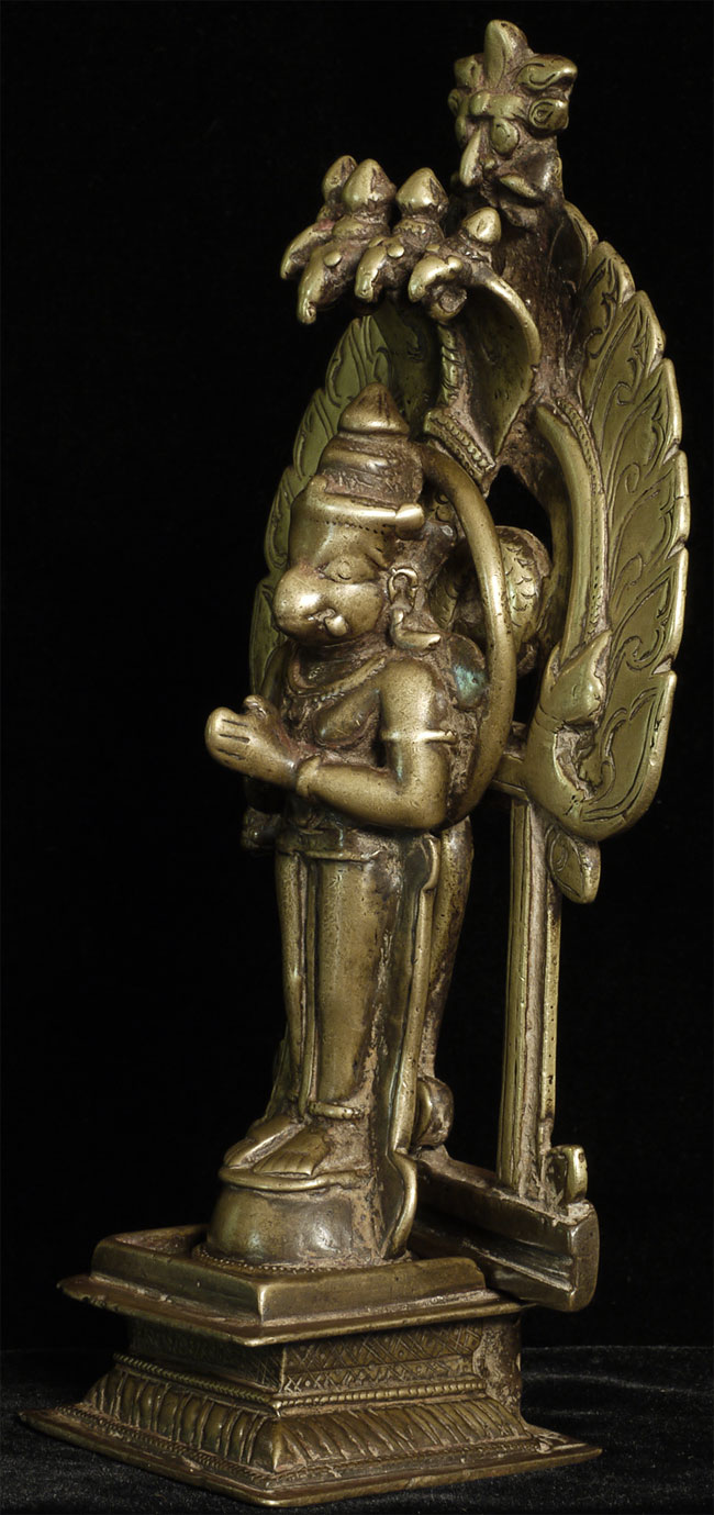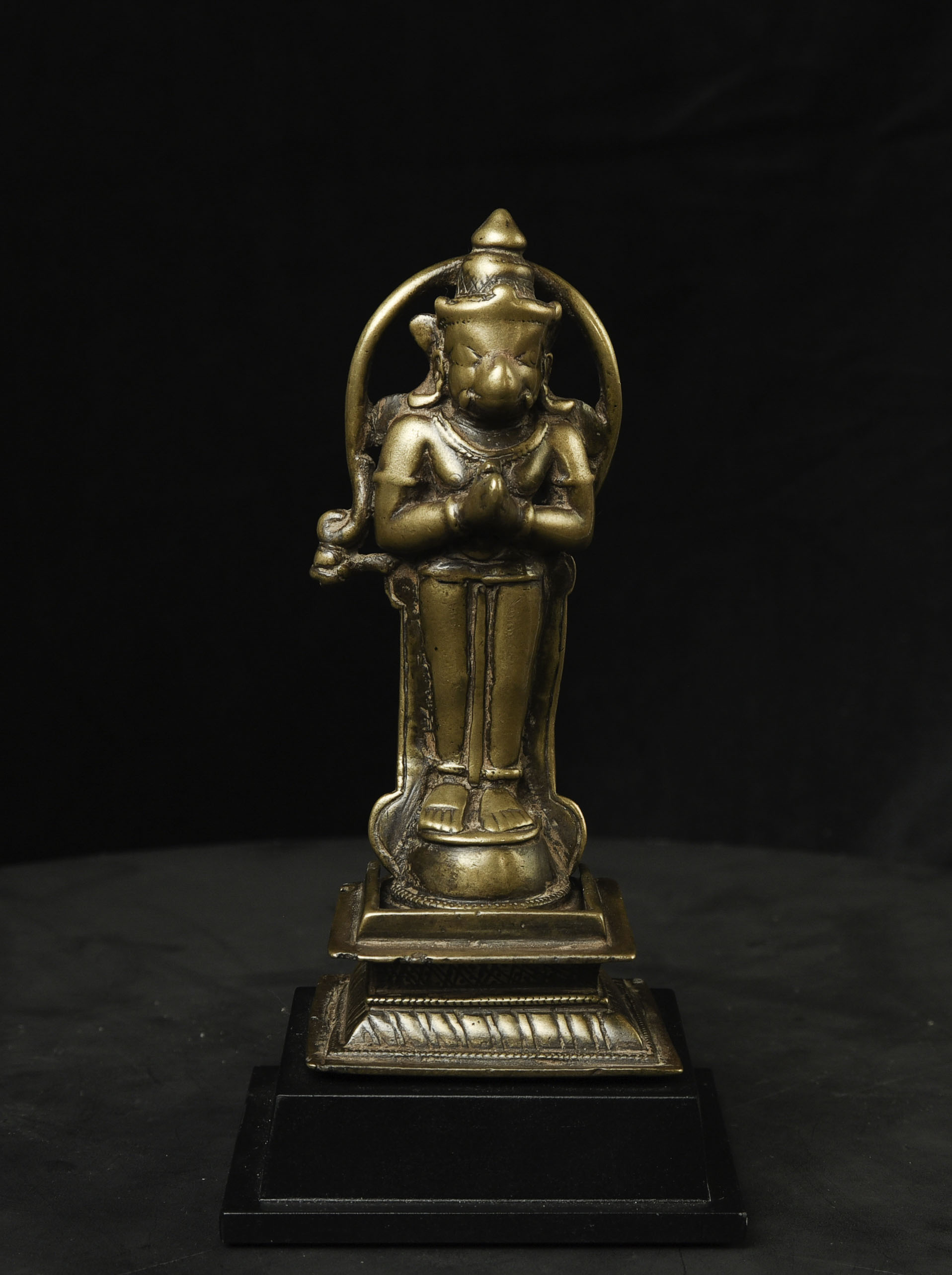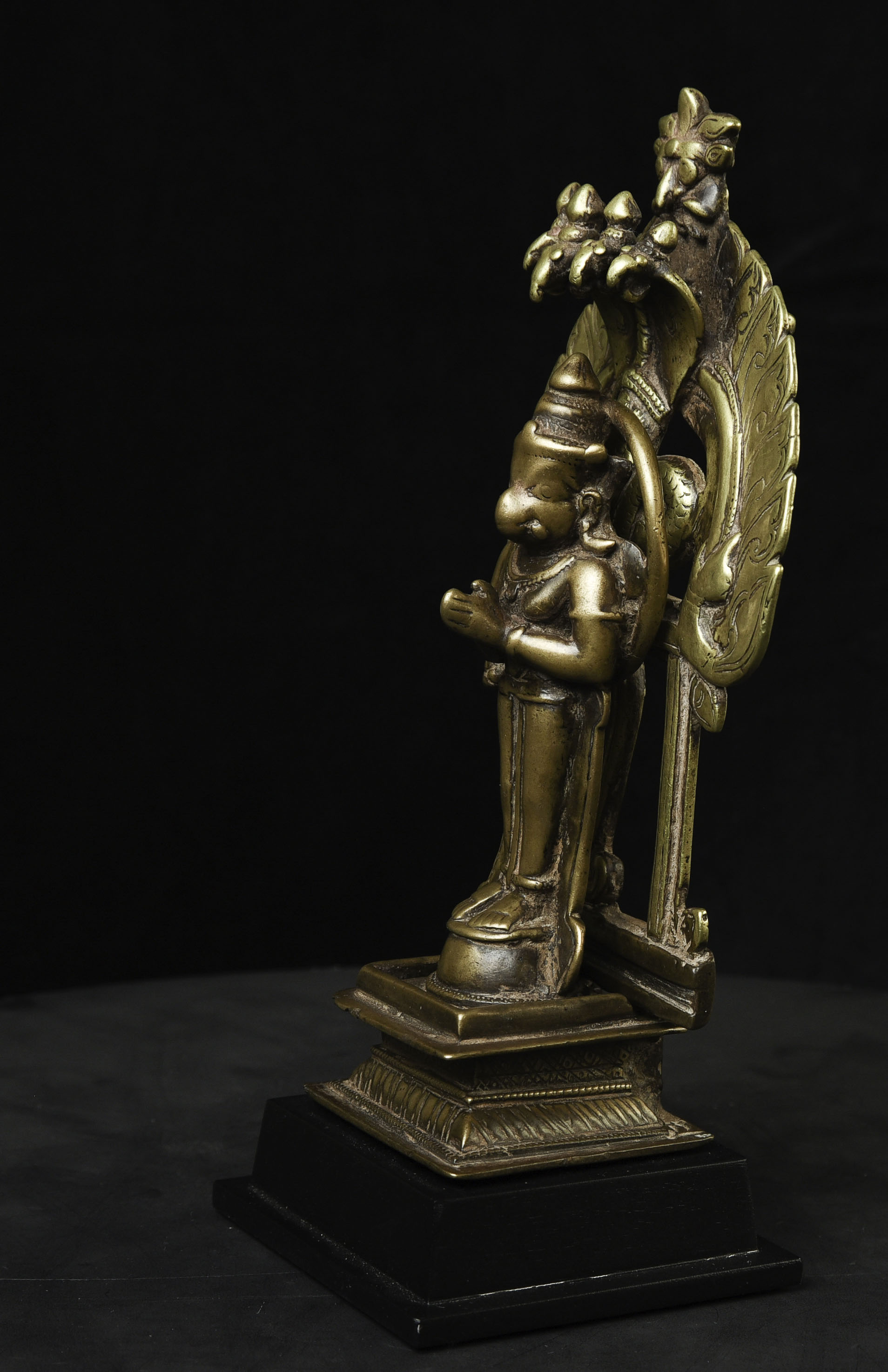 Wonderful 18thC Hanuman protected by nagas. Stands 8.75 inches tall. The widest point is 5-1/8 inches. Purchased by the previous owner from a well-known New York dealer in the 1960s. Note the additional modern base for the backplate(see the recently added photos)