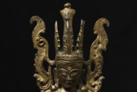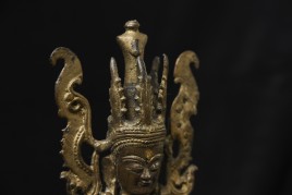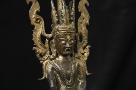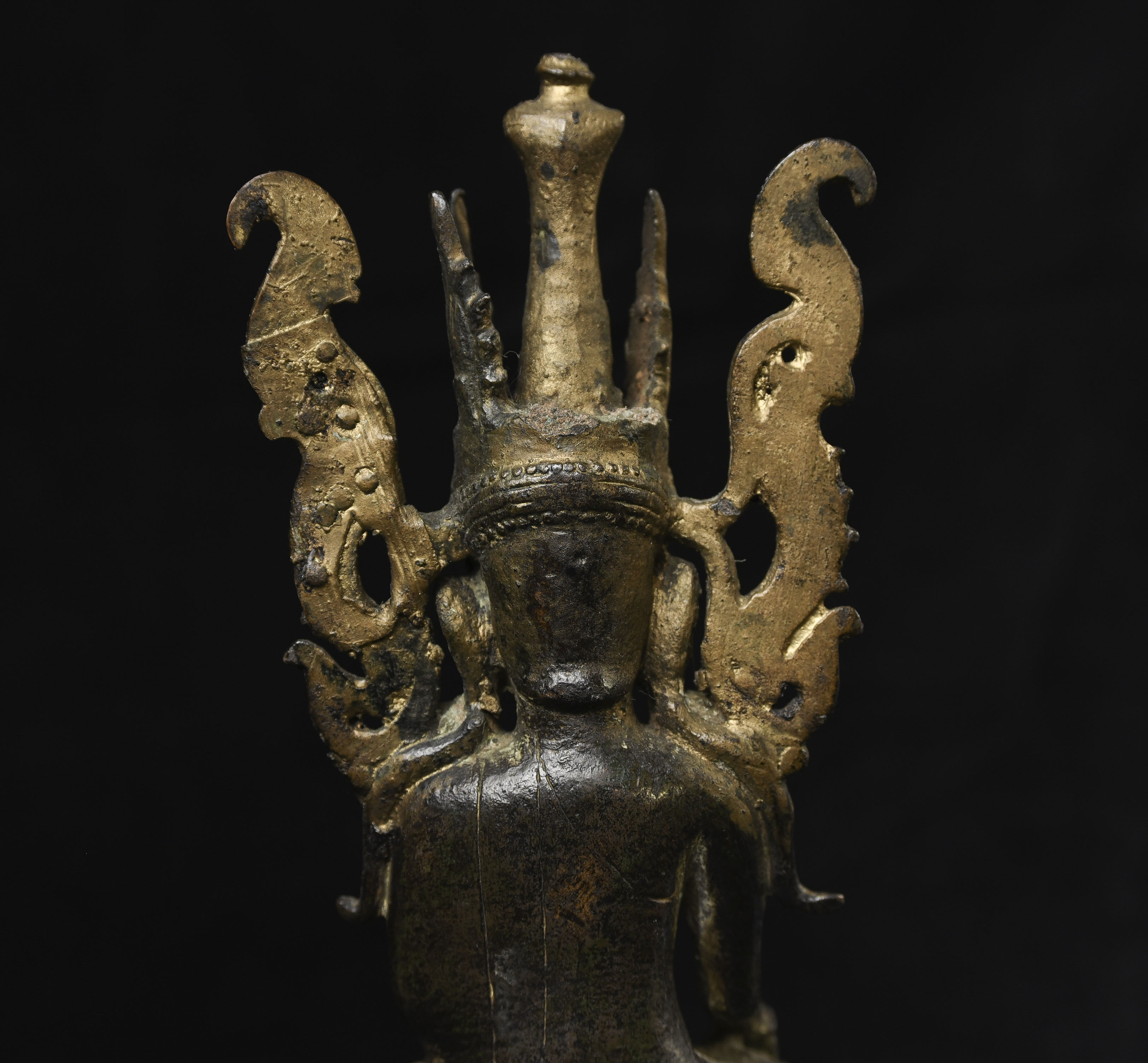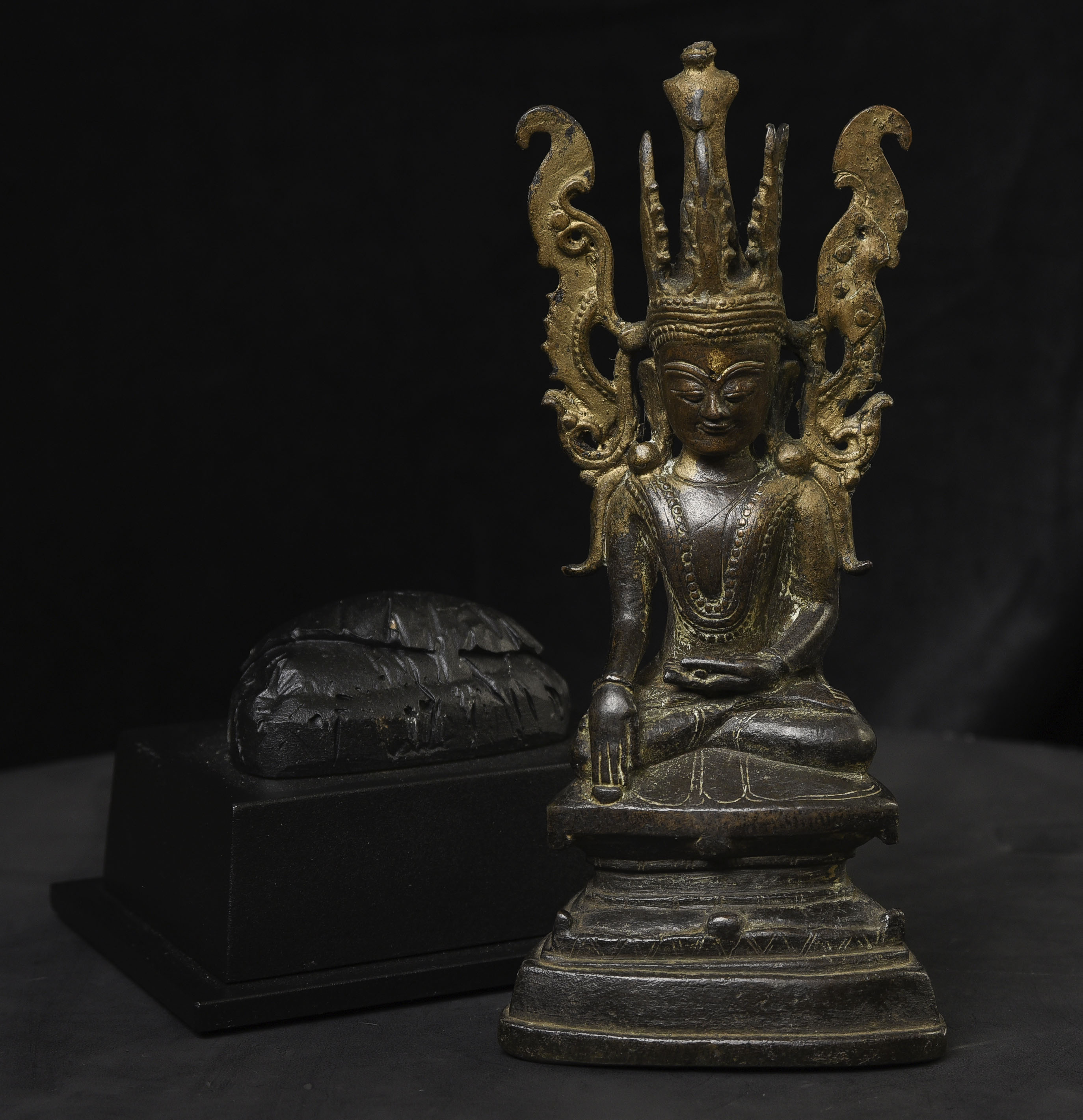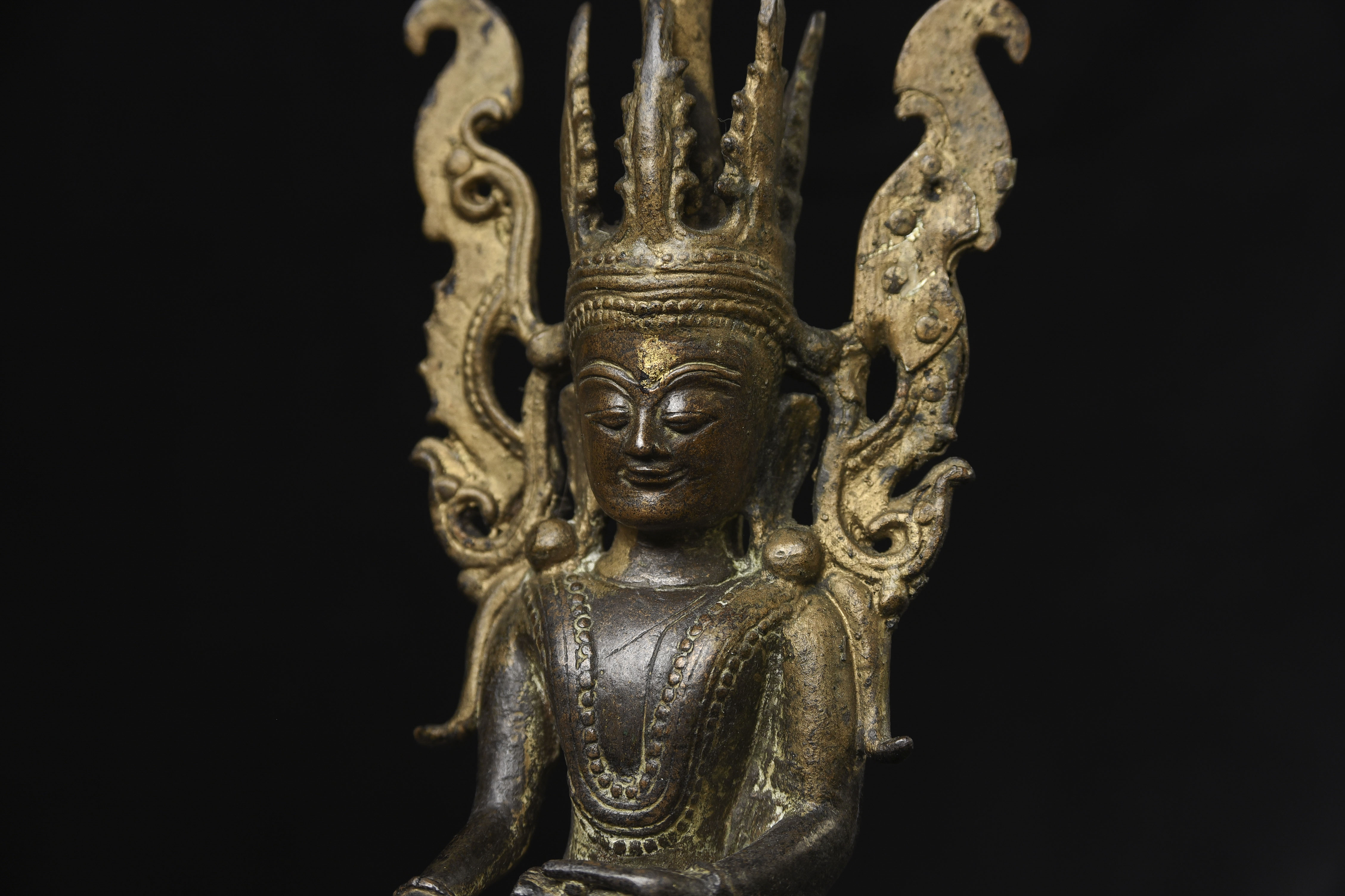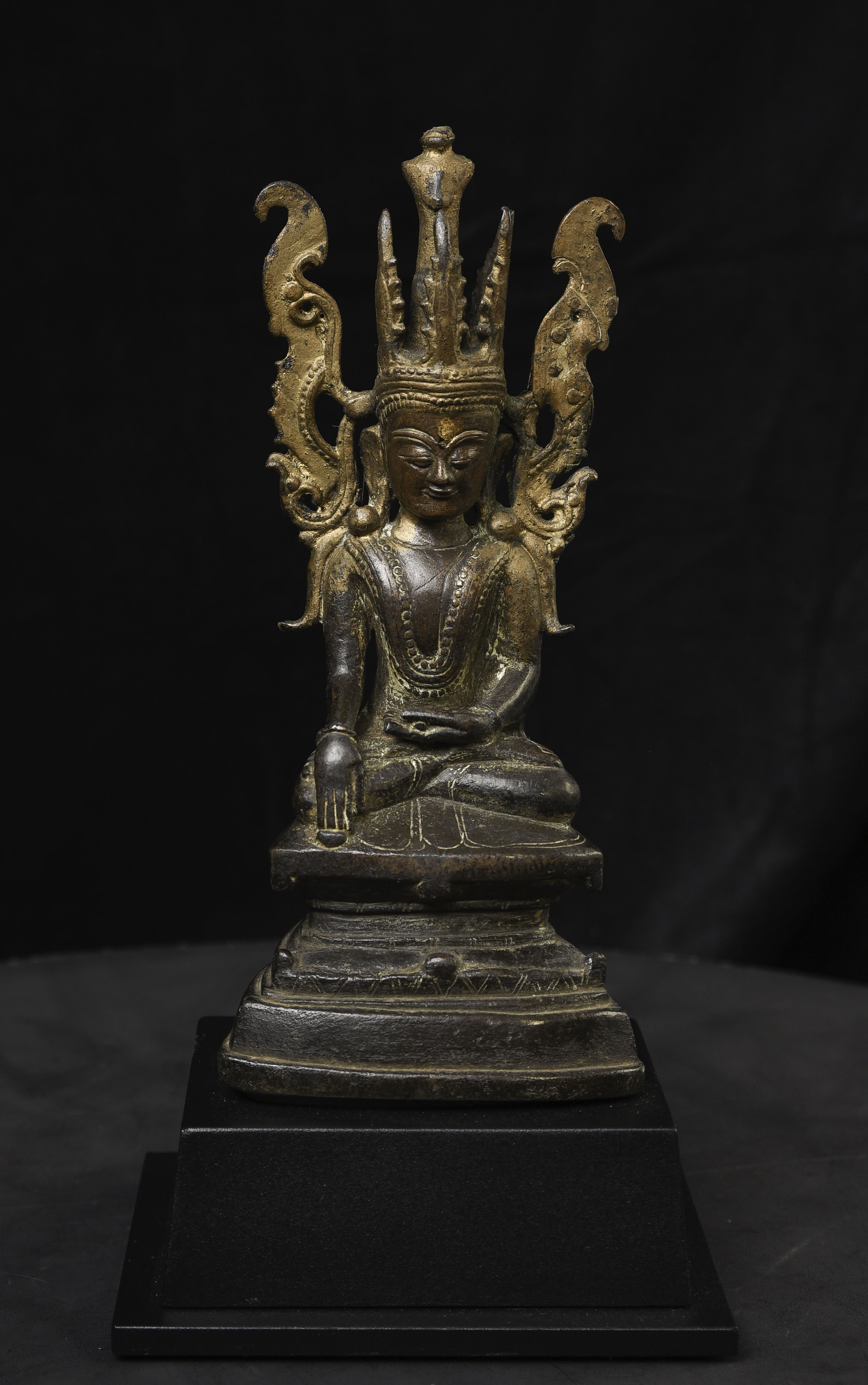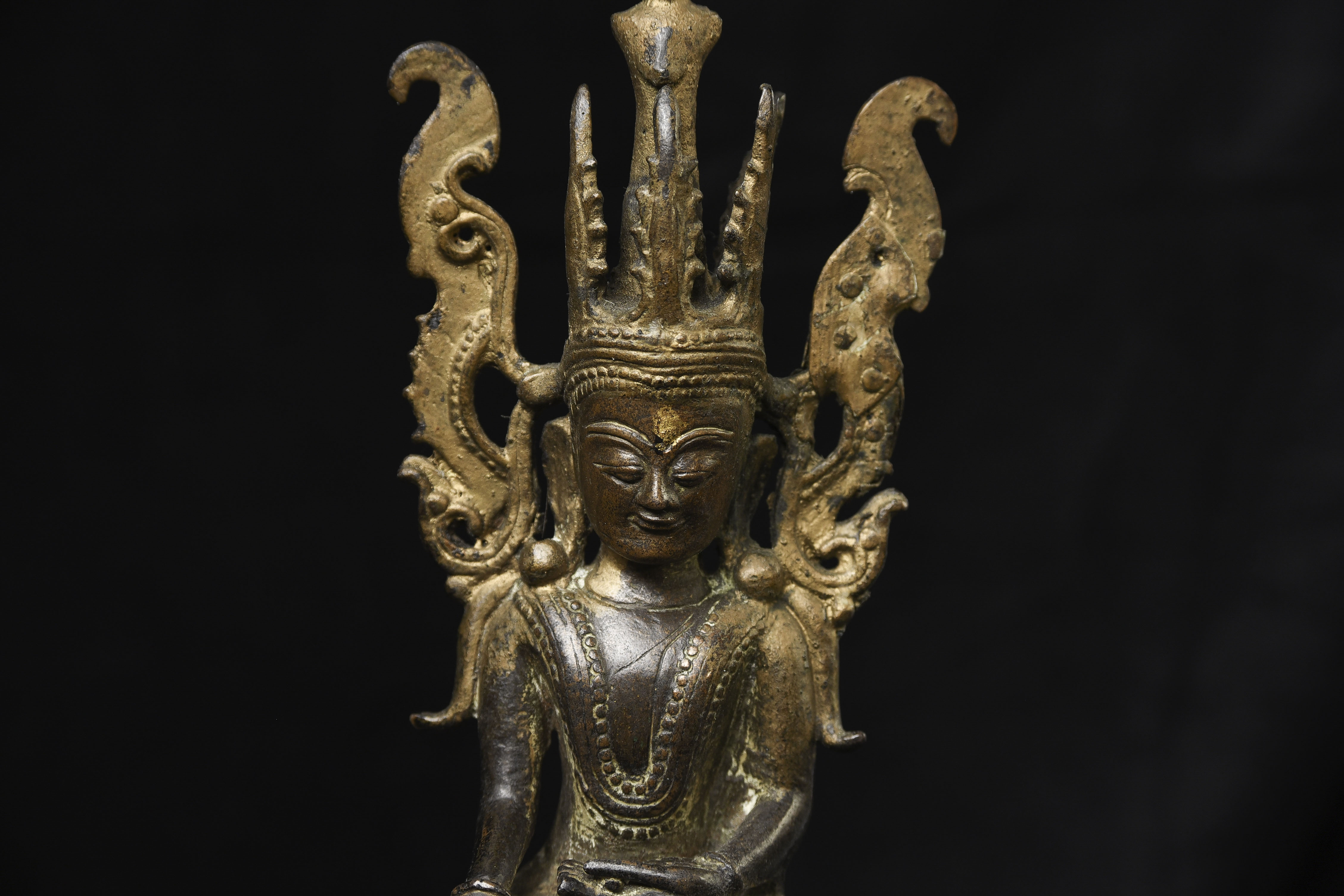 18thC Burmese Shan style "Jambupati" Bronze Buddha. An exceptional example of its type, with a face that brings a smile to all who lays eyes upon him. Repairs to the wings of his crown (typical due to their elaborate nature). One of the most sought-after forms of the Burmese Buddha. 7.75 inches tall