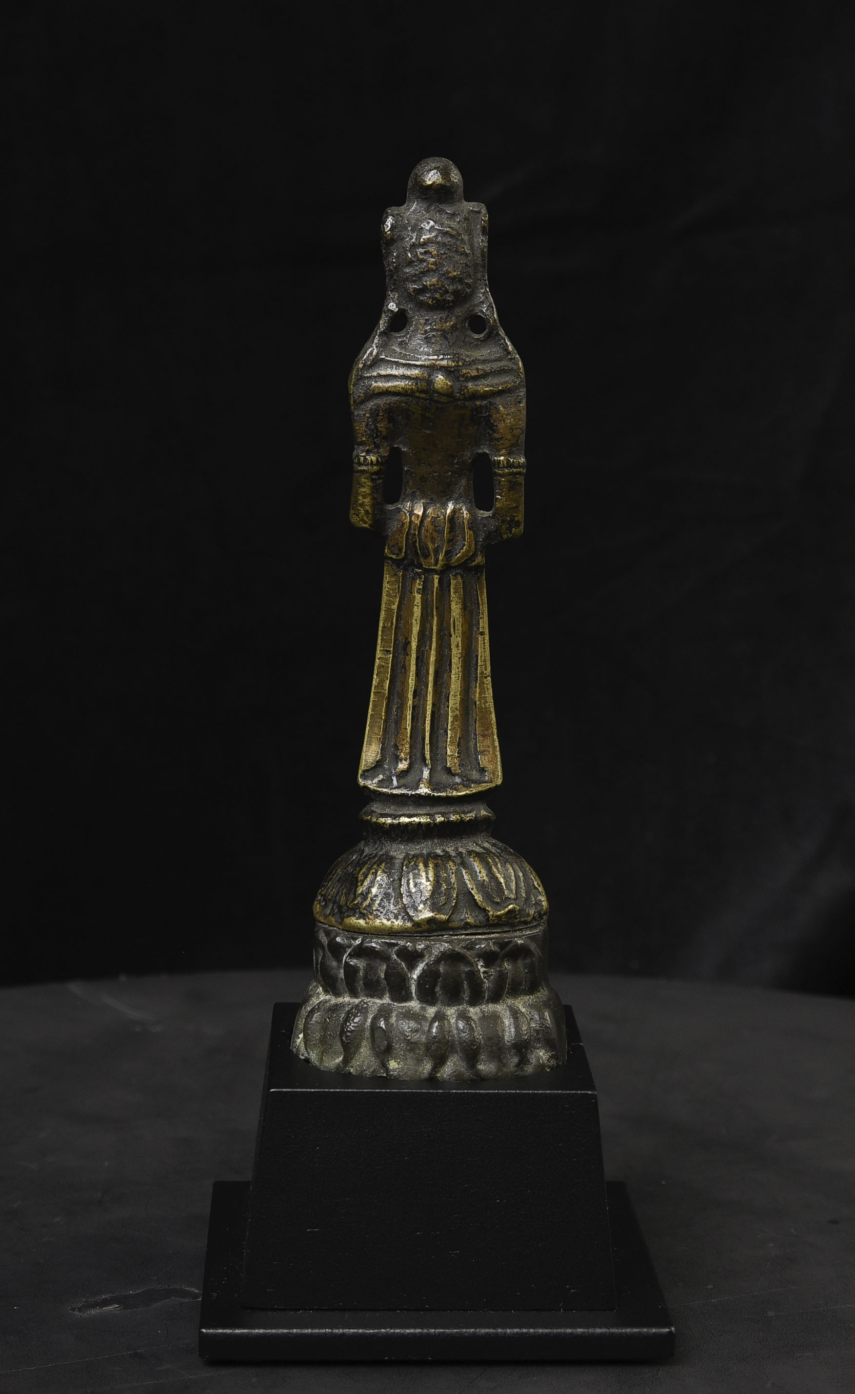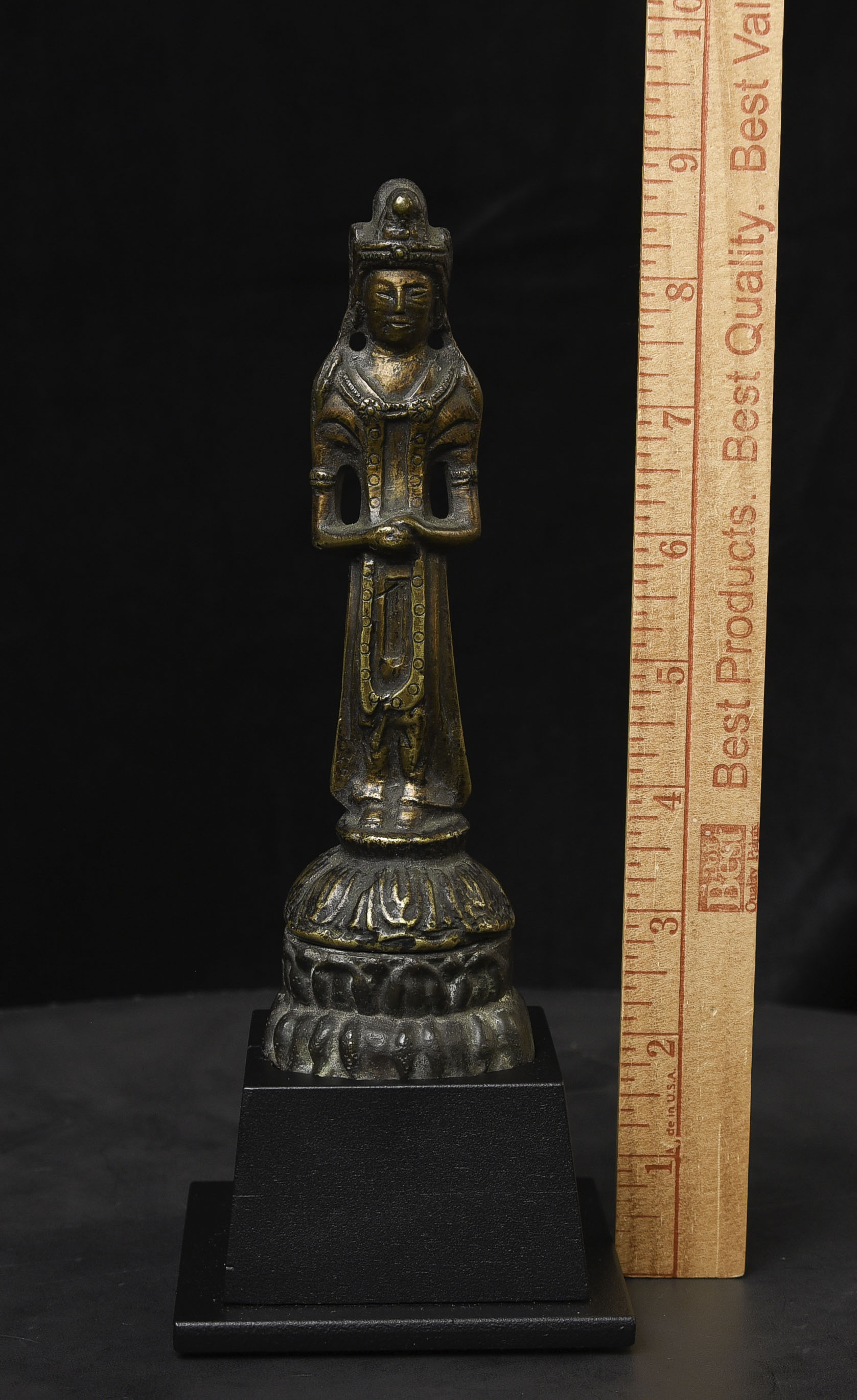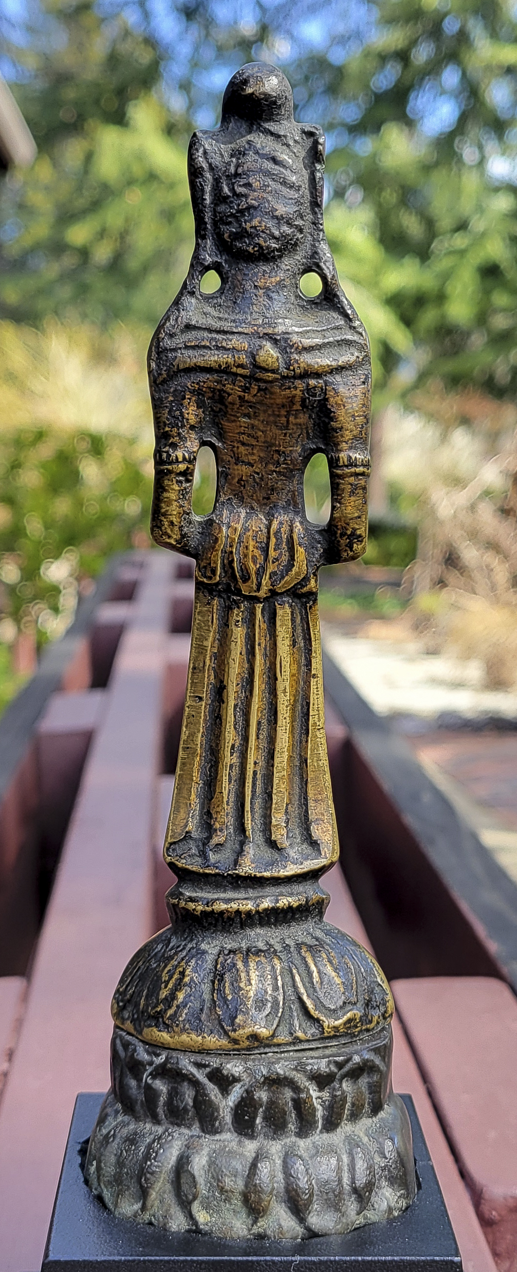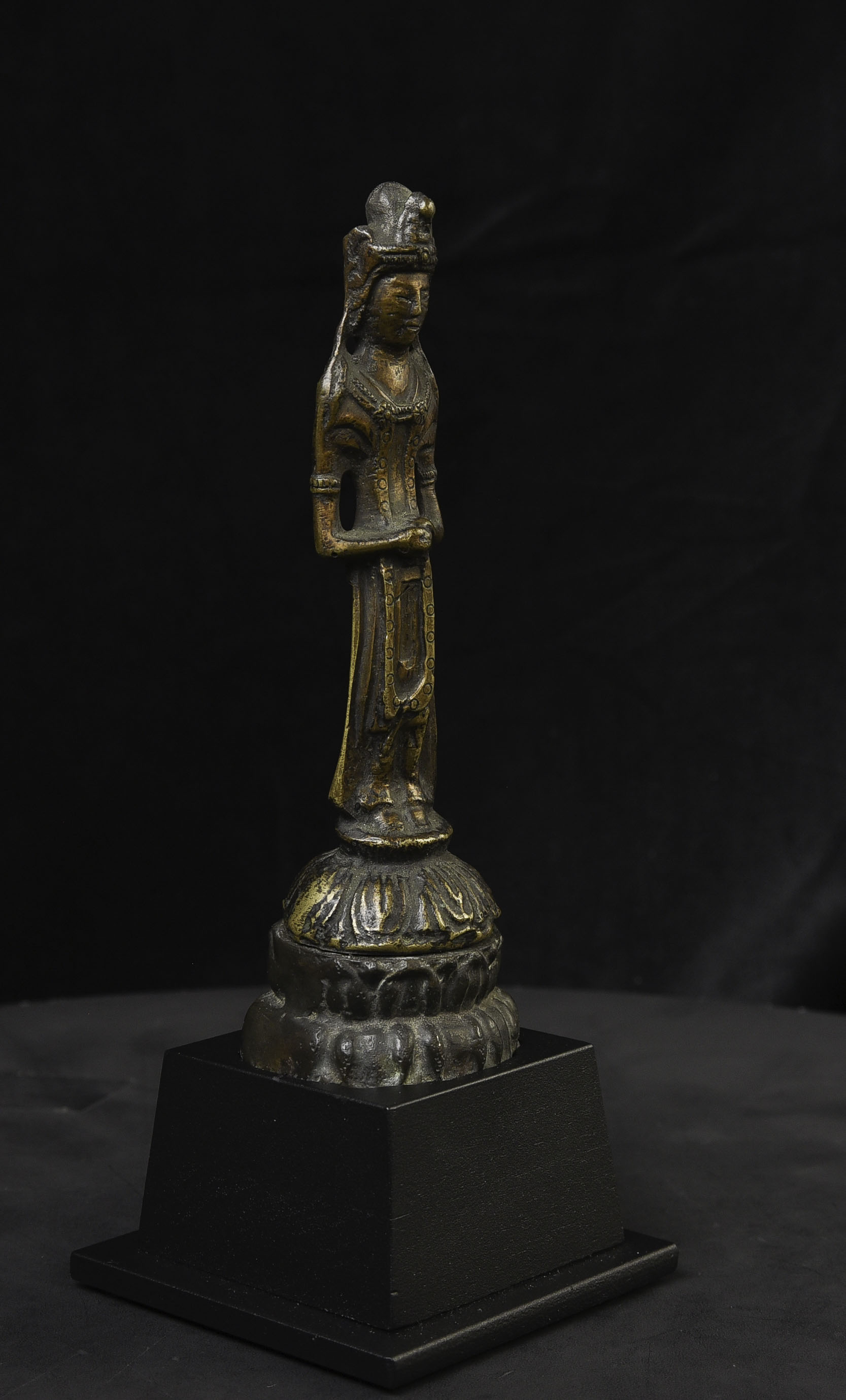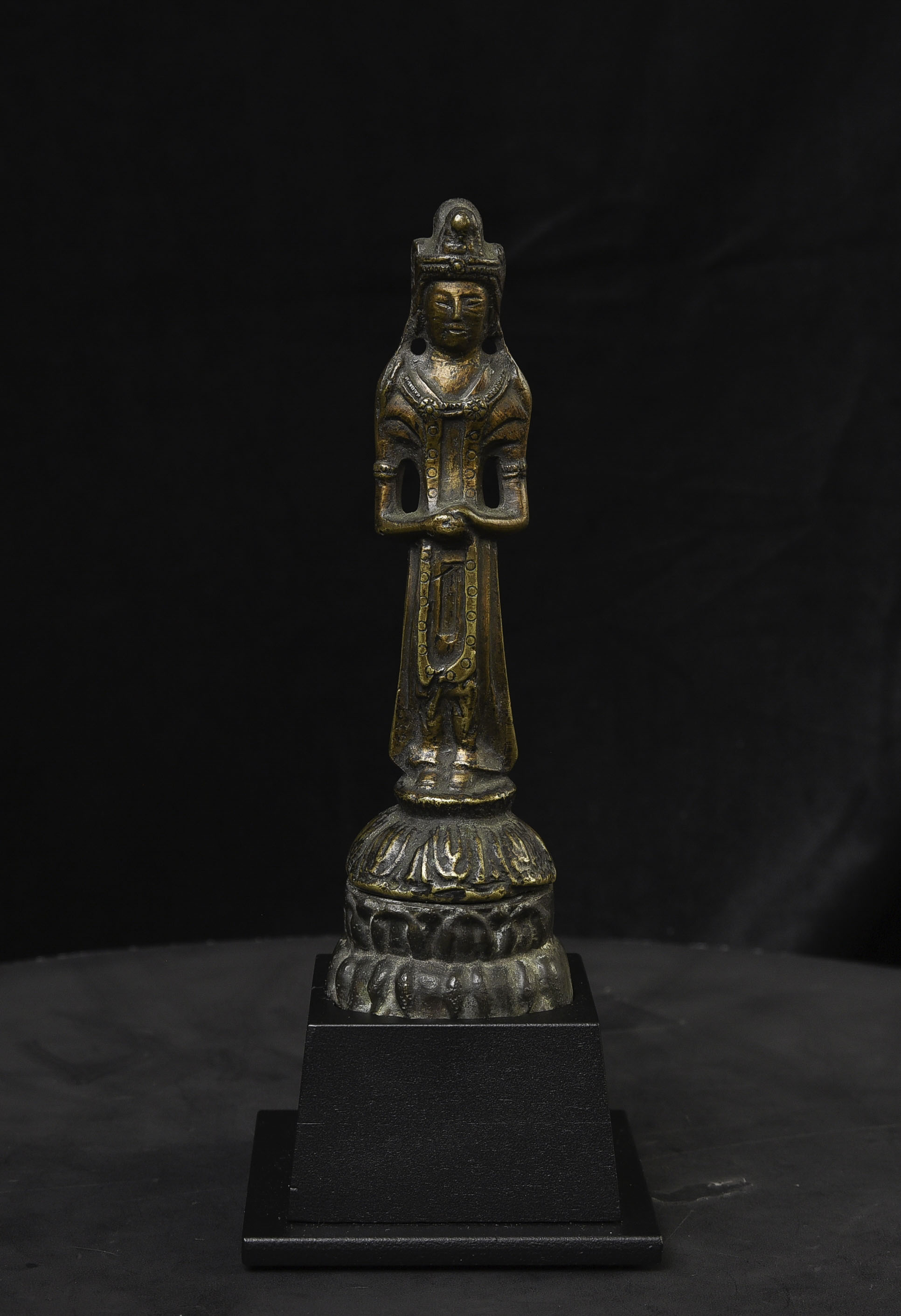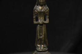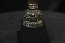 This piece is from China or Korea. I have had three of the style over the past 30 years, this is the largest, and the only one that has this very unusual lead alloy integral base that appears original. The Buddha on the base is 7". Theirs is 4/7/8 ((has no base)to this one has-in their June 2016 auction (lot 175) with a pre-estimate of 2000 to 3000 Swiss dollars. They describe theirs as 6th-century Sui, and Chinese. Koller often sells much higher than their pre-auction estimates. The last photo below is of the Koller example up for auction. Please see my website thebuddhagallery.com and put 6721 and 7419 in the search box (only one at a time)to see related examples. Starting bid lowered.