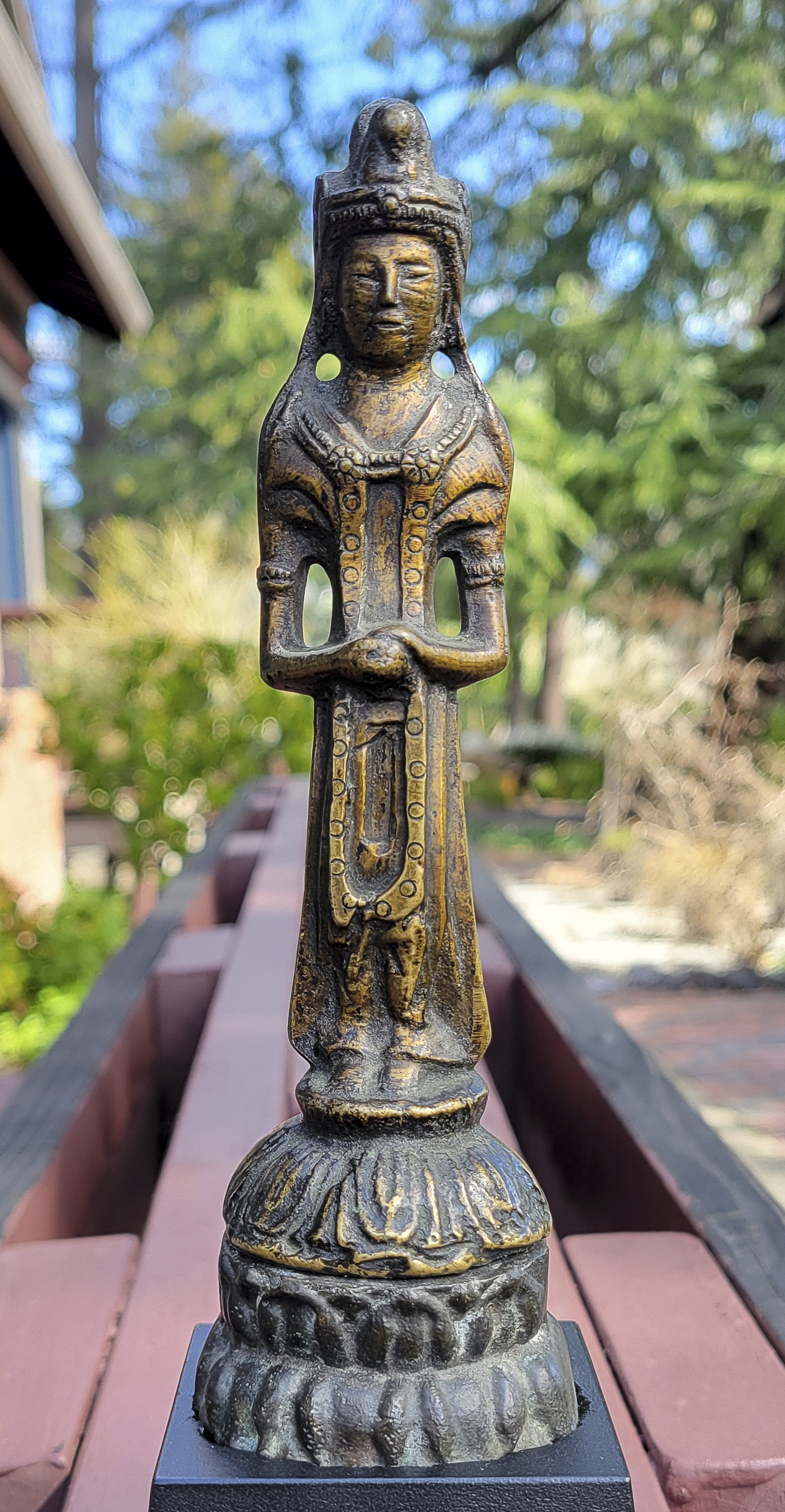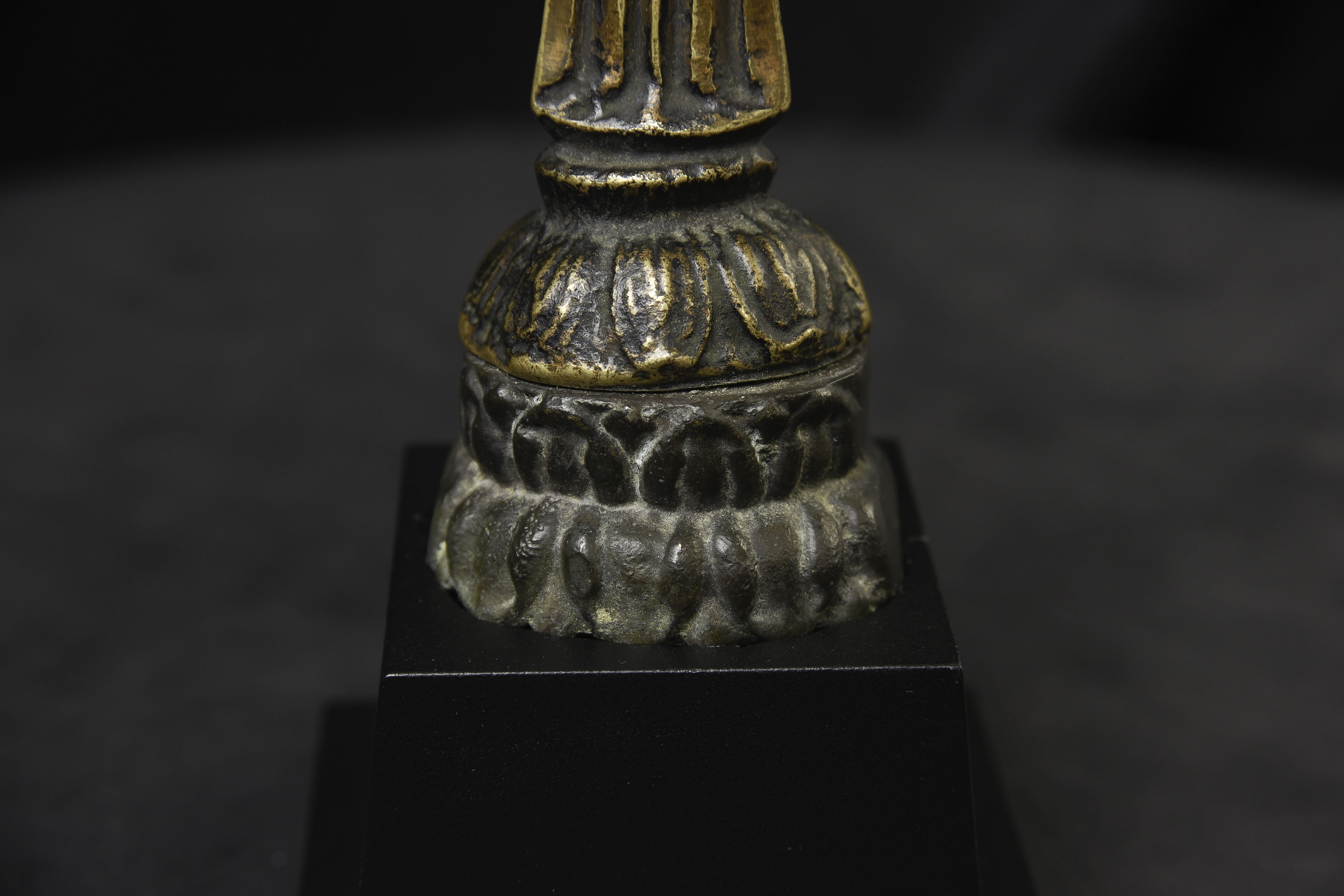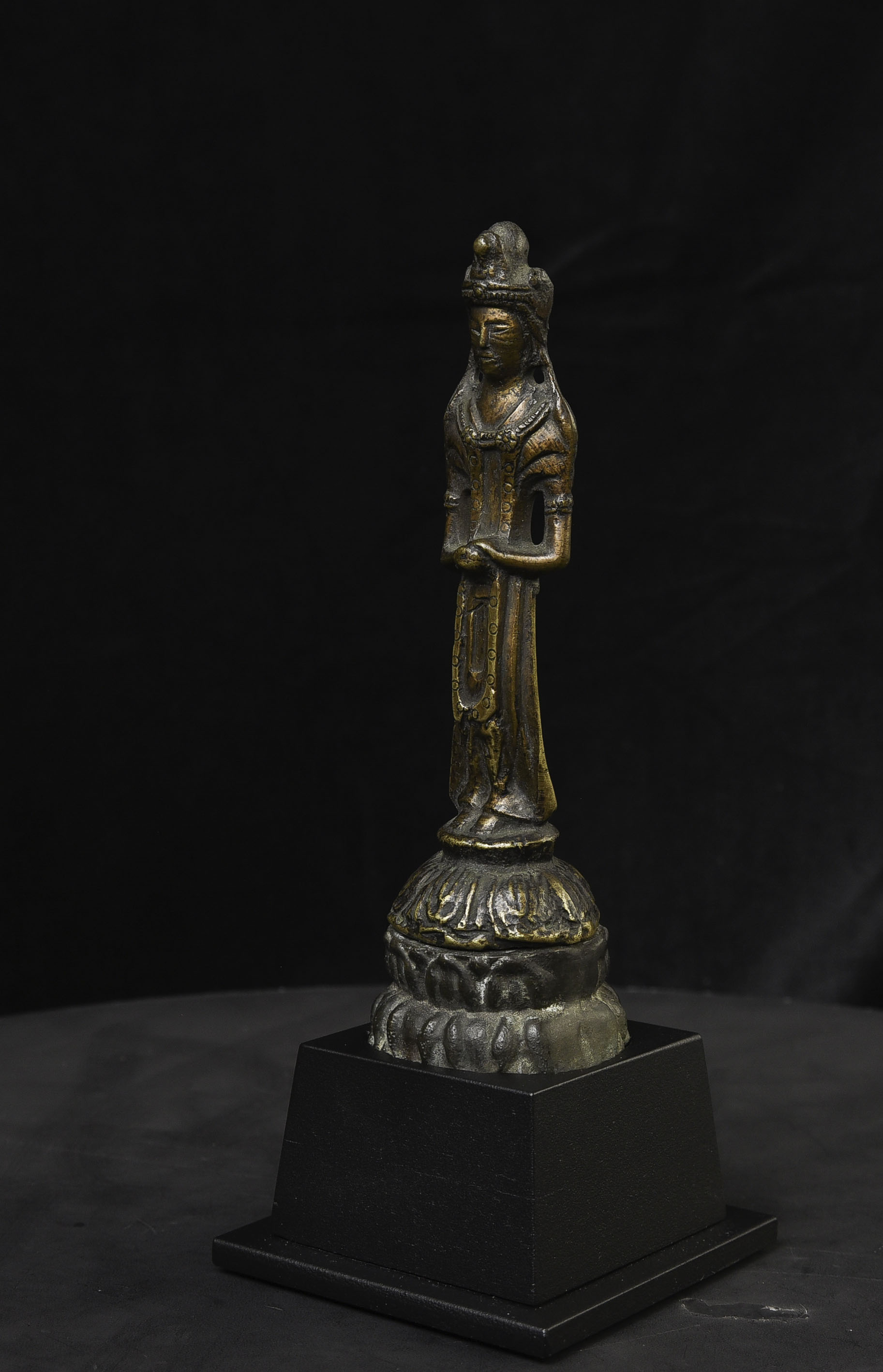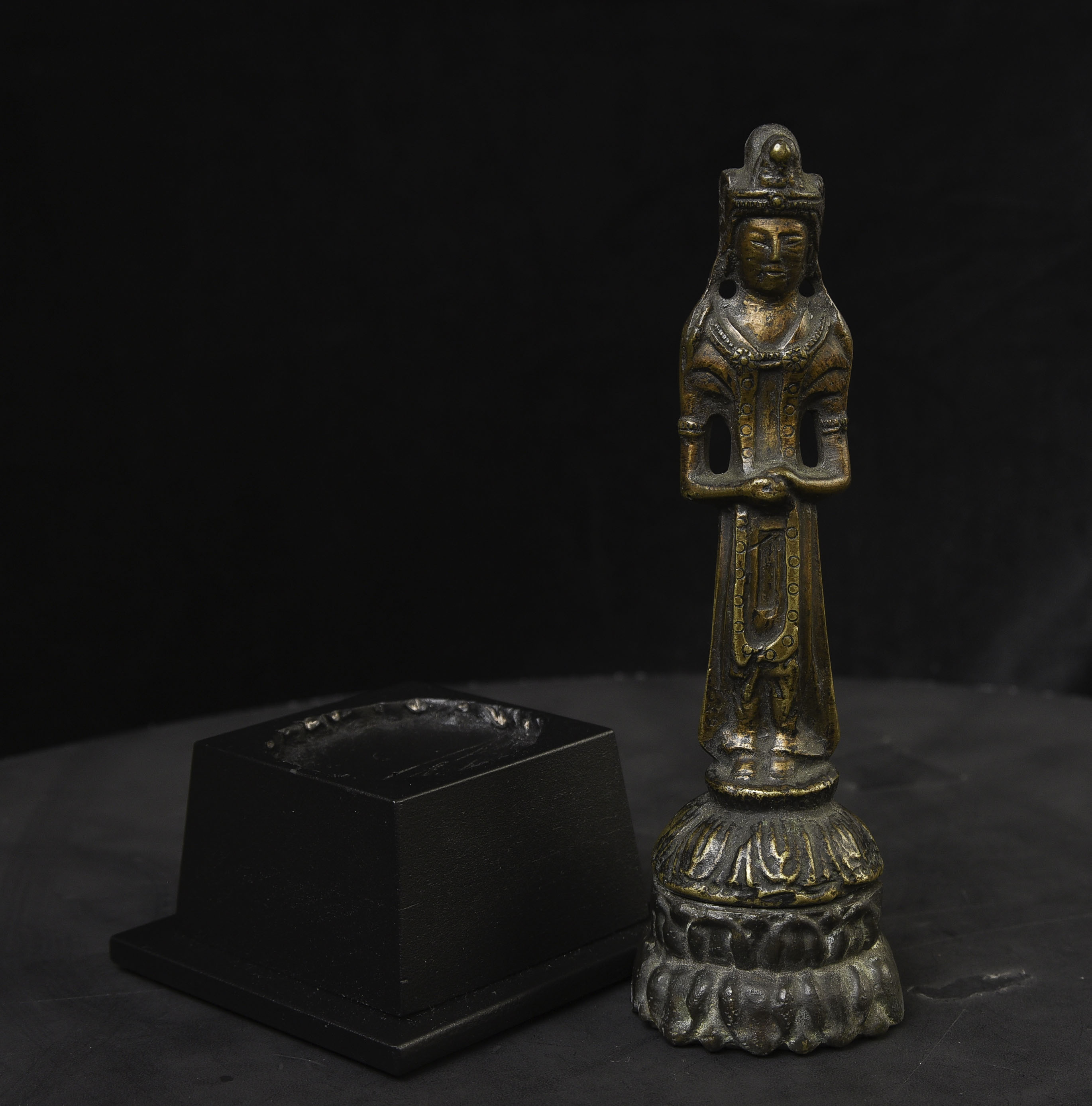 This piece is from China or Korea. I have had three of the style over the past 30 years, this is the largest, and the only one that has this very unusual lead alloy integral base that appears original. The Buddha on the base is 7". Theirs is 4/7/8 ((has no base)to this one has-in their June 2016 auction (lot 175) with a pre-estimate of 2000 to 3000 Swiss dollars. They describe theirs as 6th-century Sui, and Chinese. Koller often sells much higher than their pre-auction estimates. The last photo below is of the Koller example up for auction. Please see my website thebuddhagallery.com and put 6721 and 7419 in the search box (only one at a time)to see related examples. Starting bid lowered.