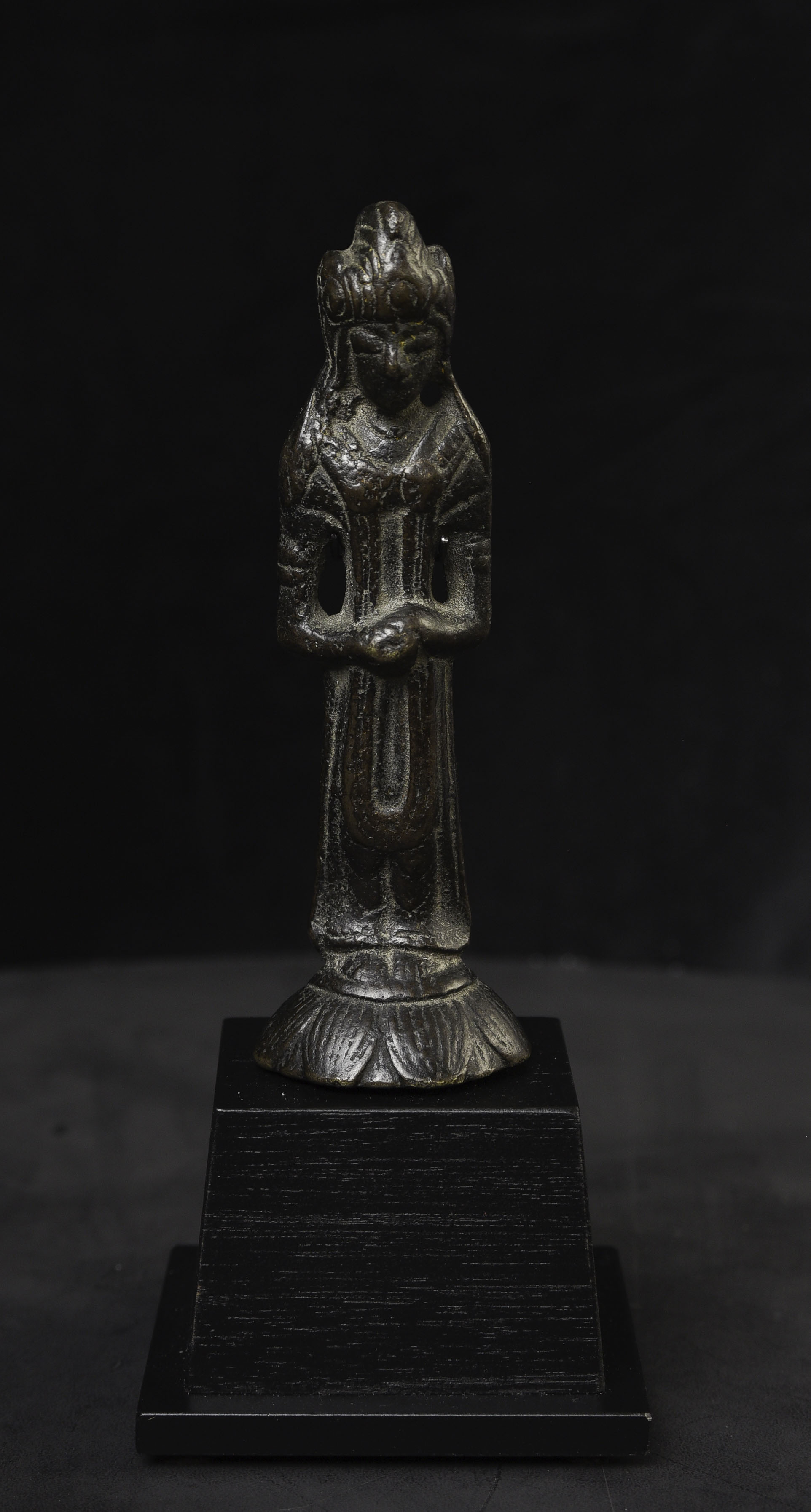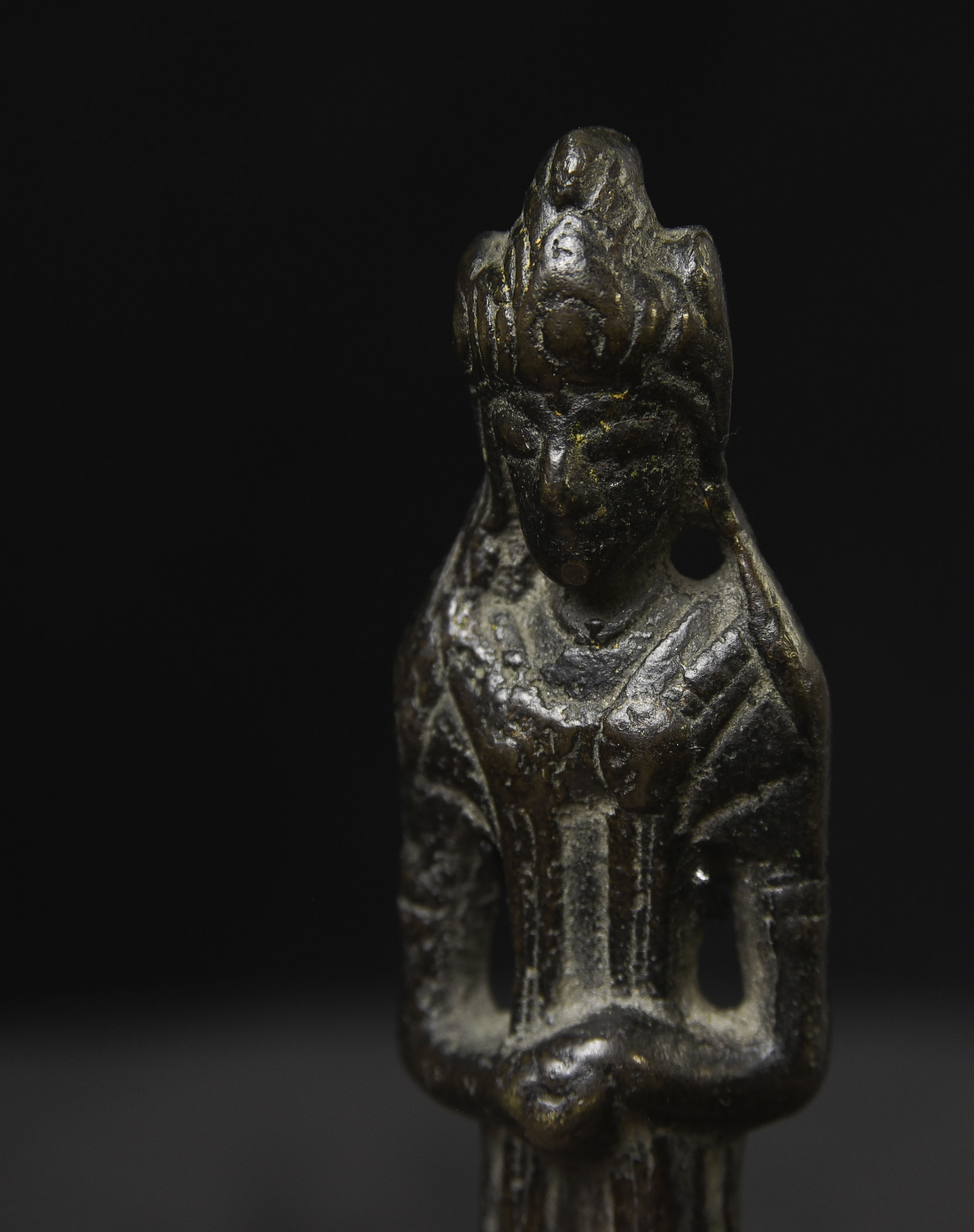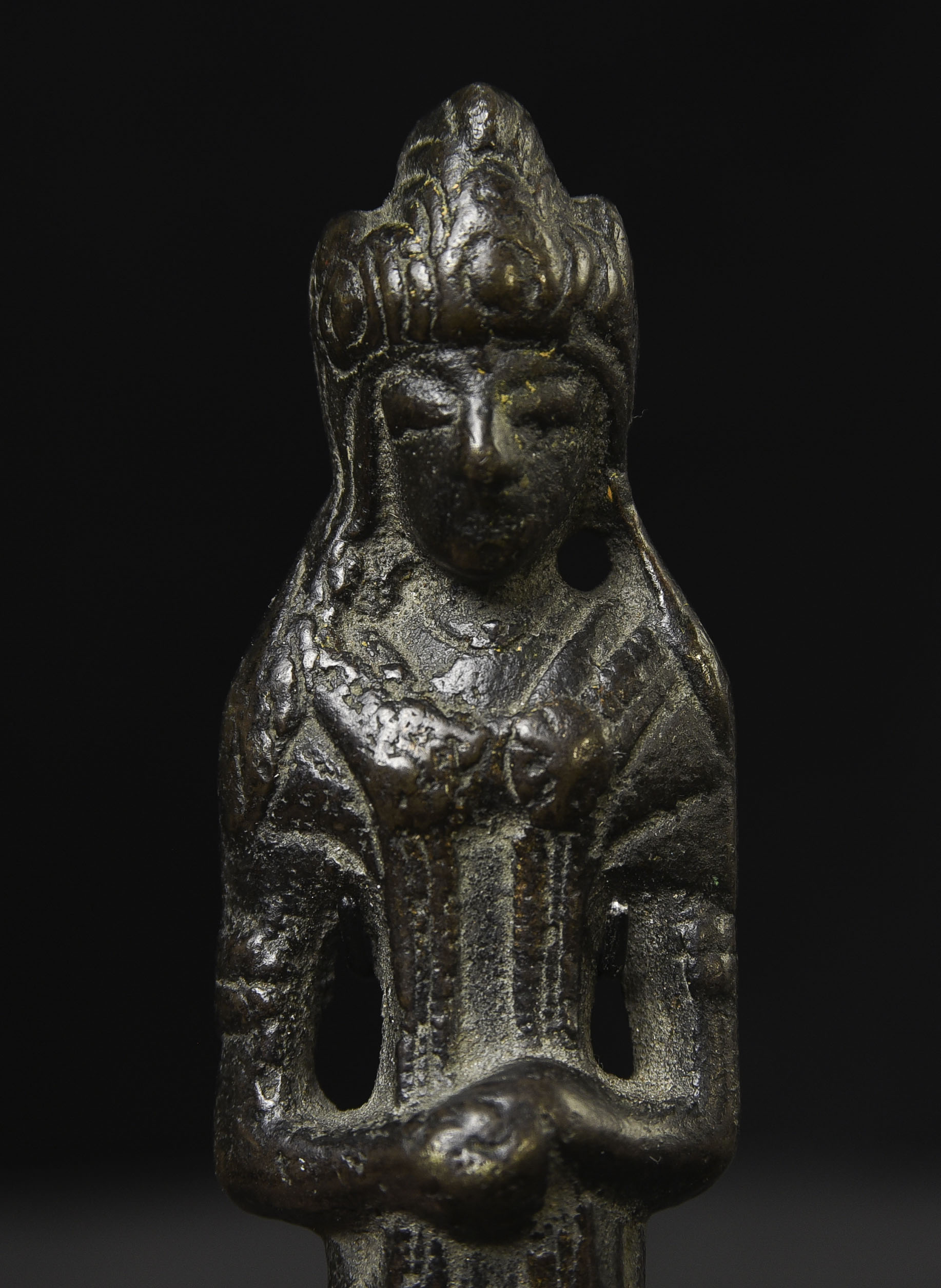 This piece is likely Sui from China o. I have had three of the style over the past 30 years, One came from Koller Auction House with a pre-estimate of 2000 to 3000 Swiss dollars. They describe theirs as 6th-century Sui and Chinese. Koller often sells much higher than their pre-auction estimates. The last photo below is of the Koller example up for auction. (4.75"H x 1.5"W x 1.25"D - 190g)