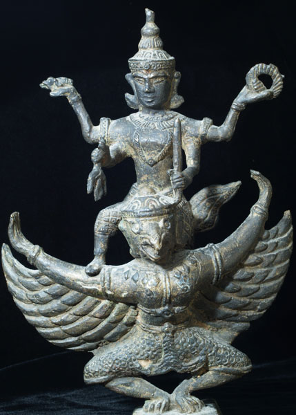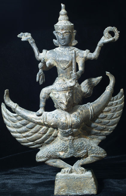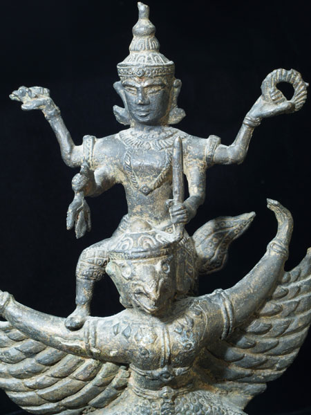 Nice Thai bronze Vishnu atop Garuda. Unlike the vast majority of this type- this grouping actually has nice age with a lovely natural patina. It came out of an estate collection, and is probably early 20th century. Appears to be solid cast, and a very good size at over 10 inches tall by 6.75 inches wide. Nicely cast.