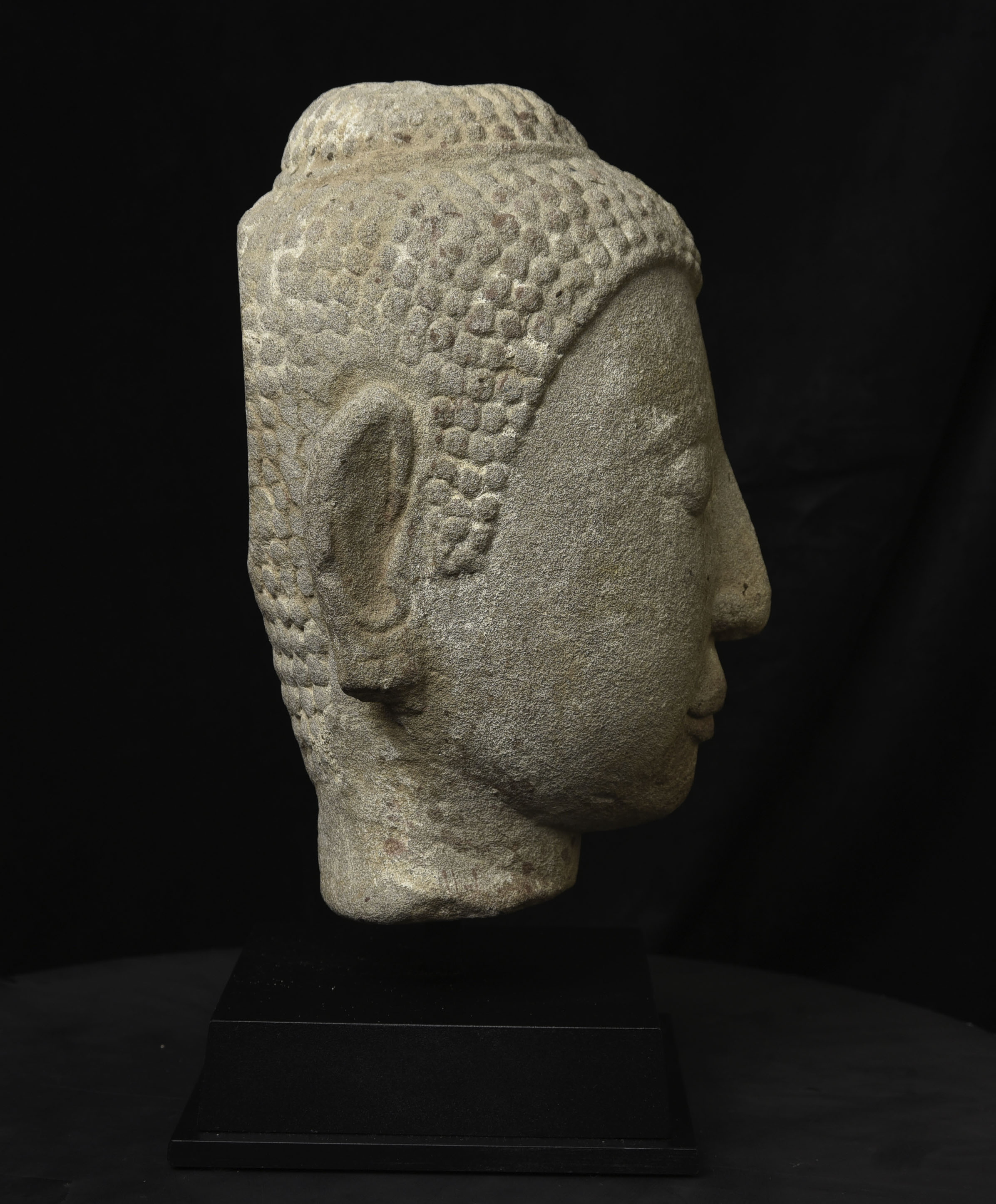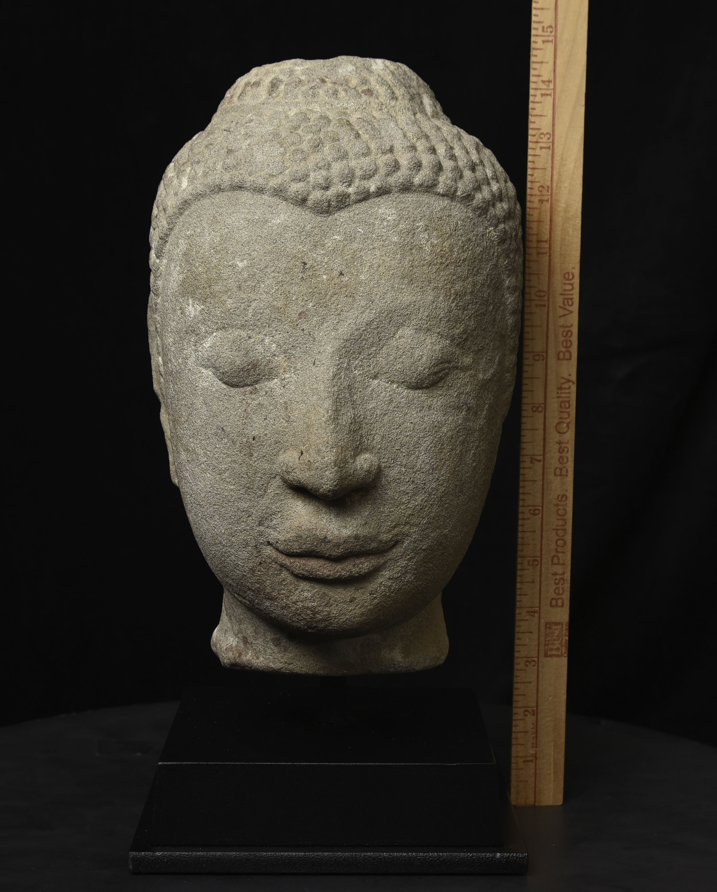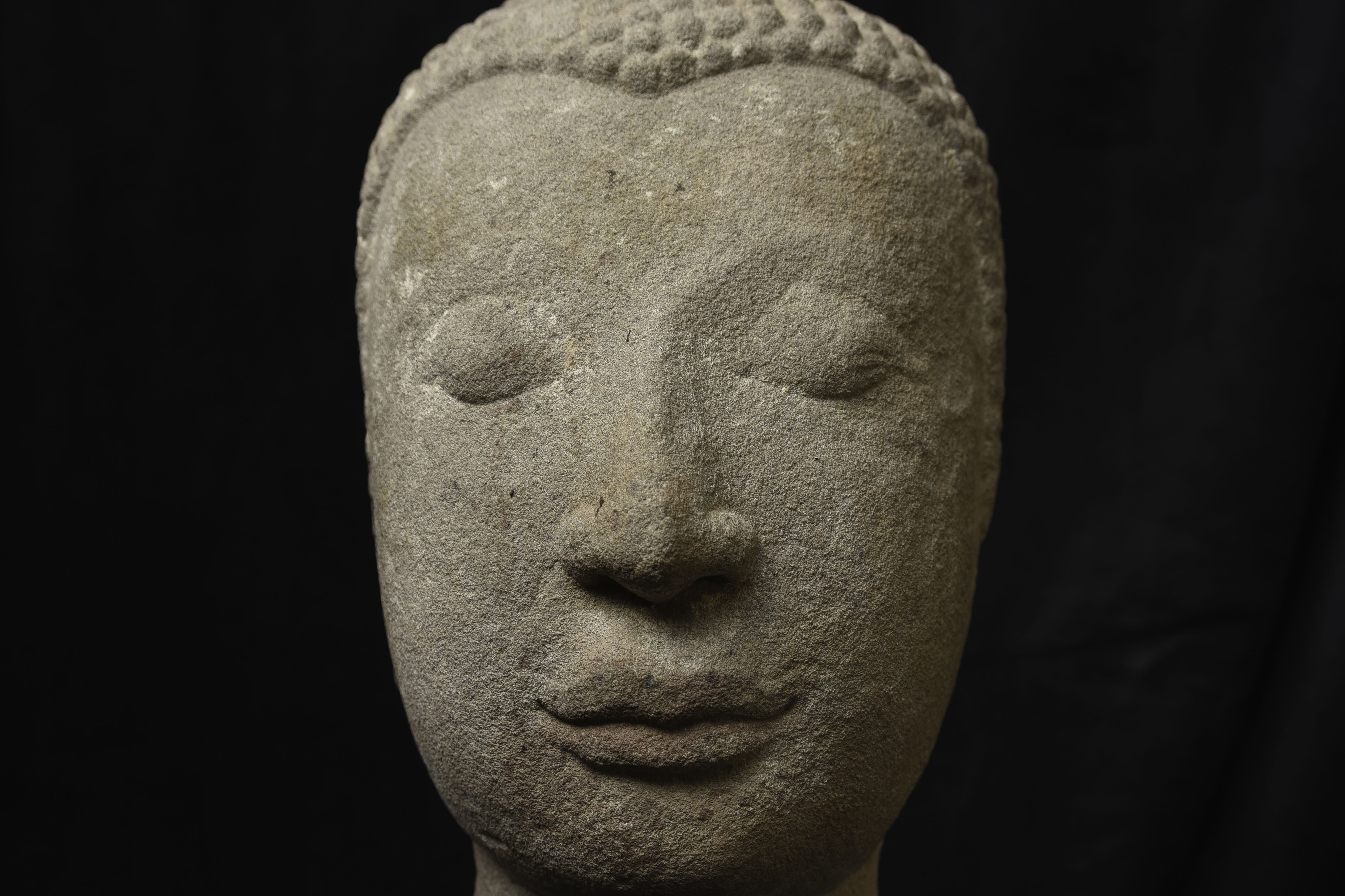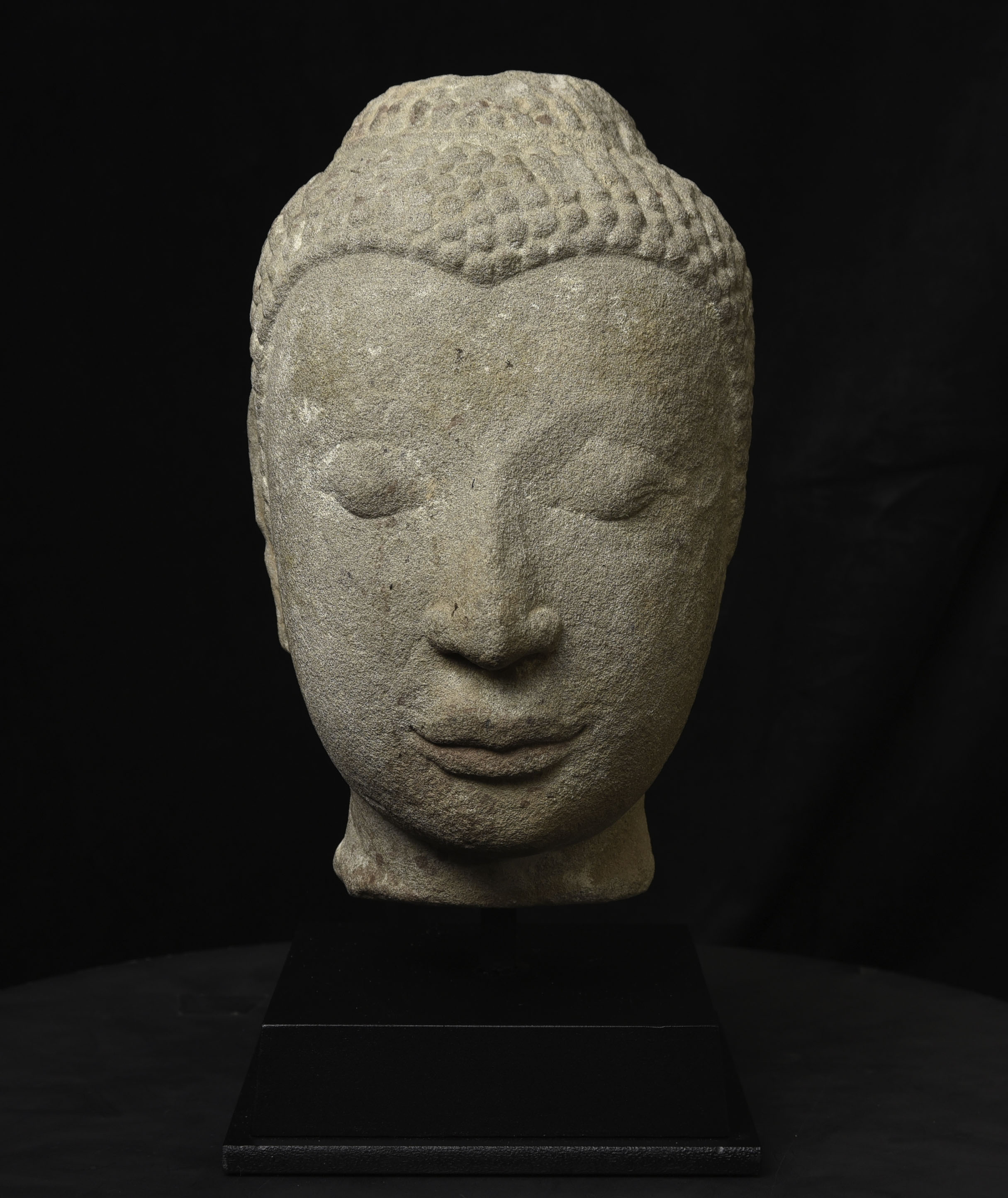 Life-size 16thC Thai stone head. The face is absolutely classic for this type--powerful, kind, and calm. The condition is very good, as can be seen in the photos. Large Buddhas of this type were meant to be looked at from below, as this Buddha would have stood above its devotees, who would have sat at his feet.