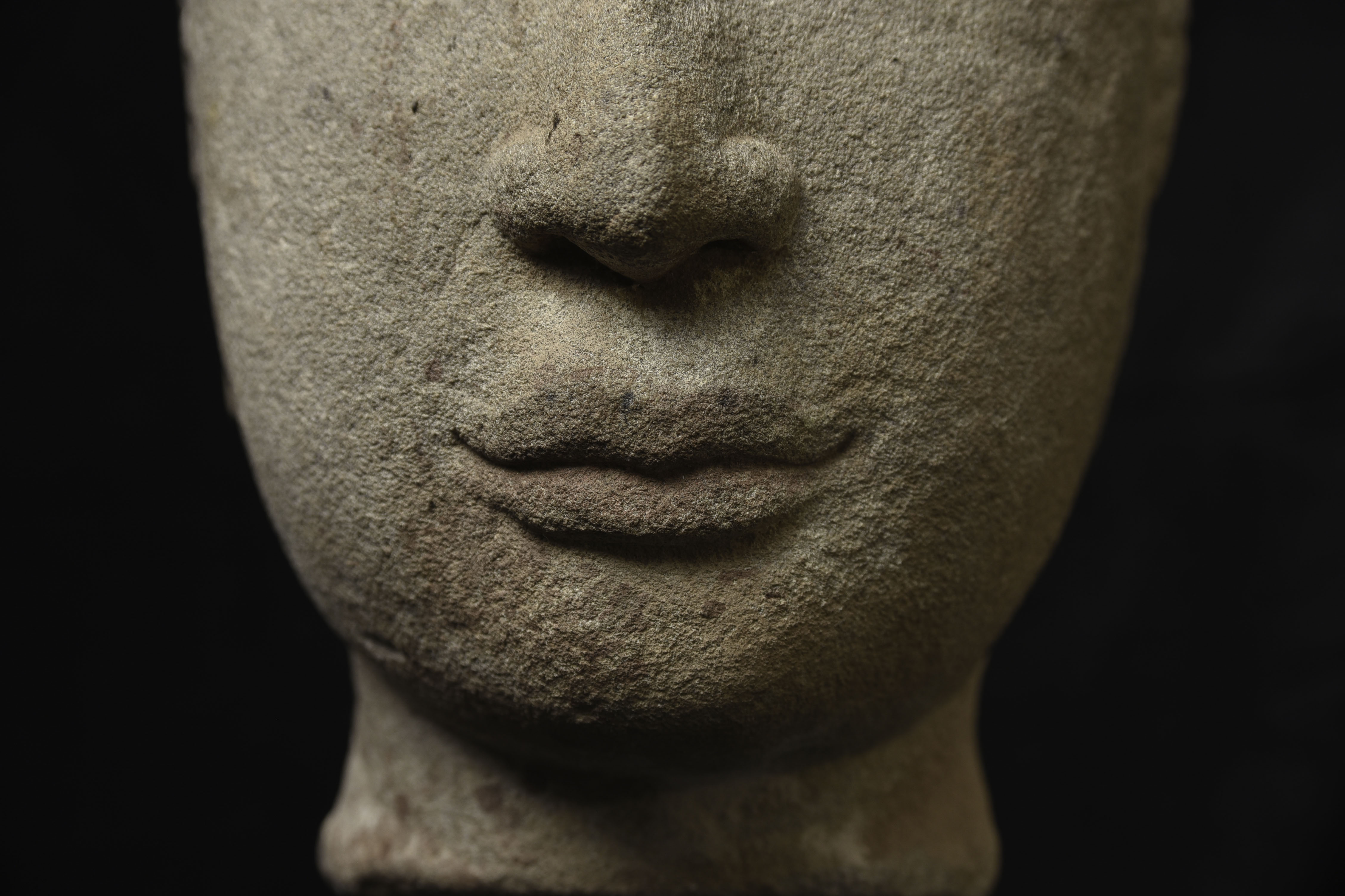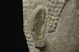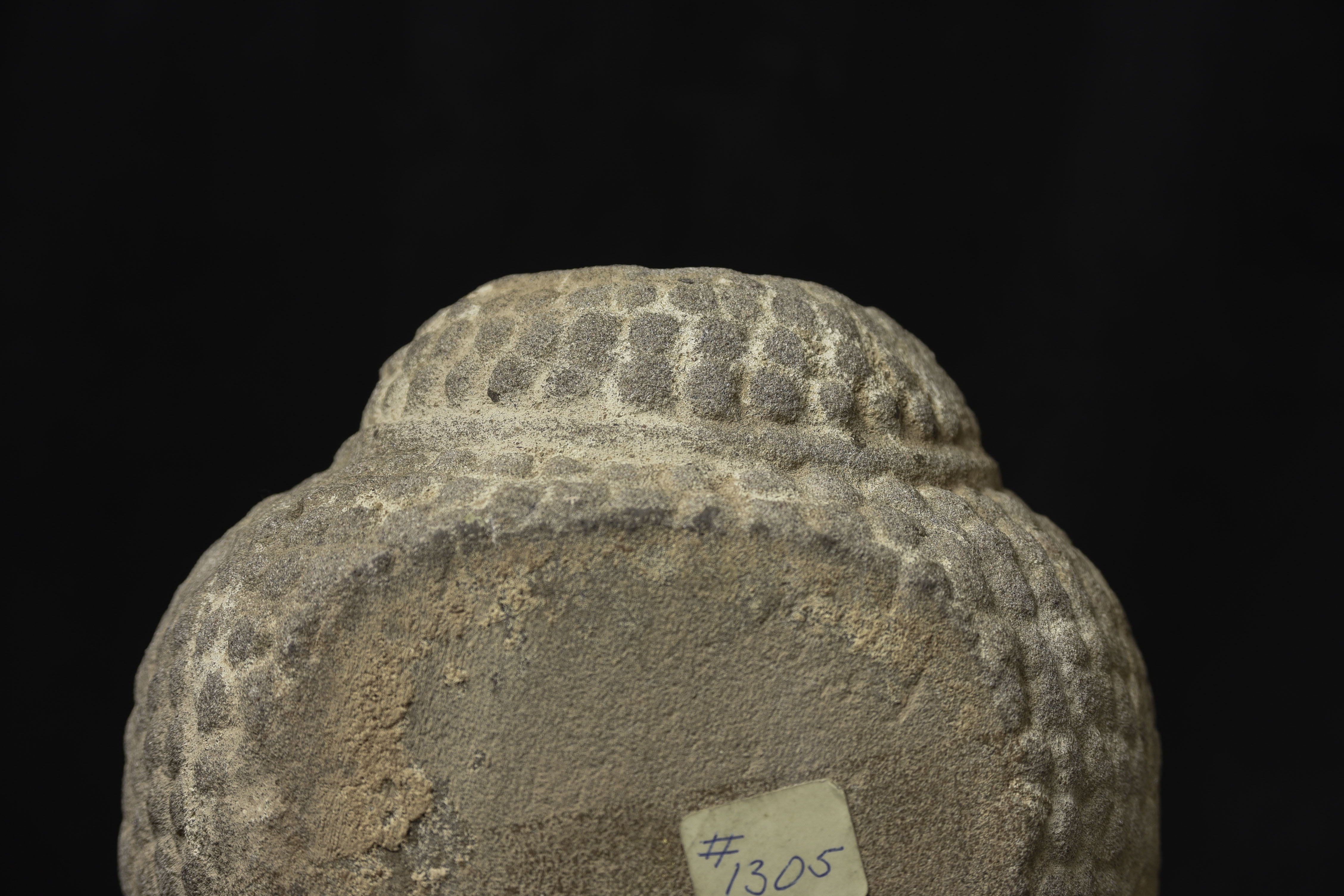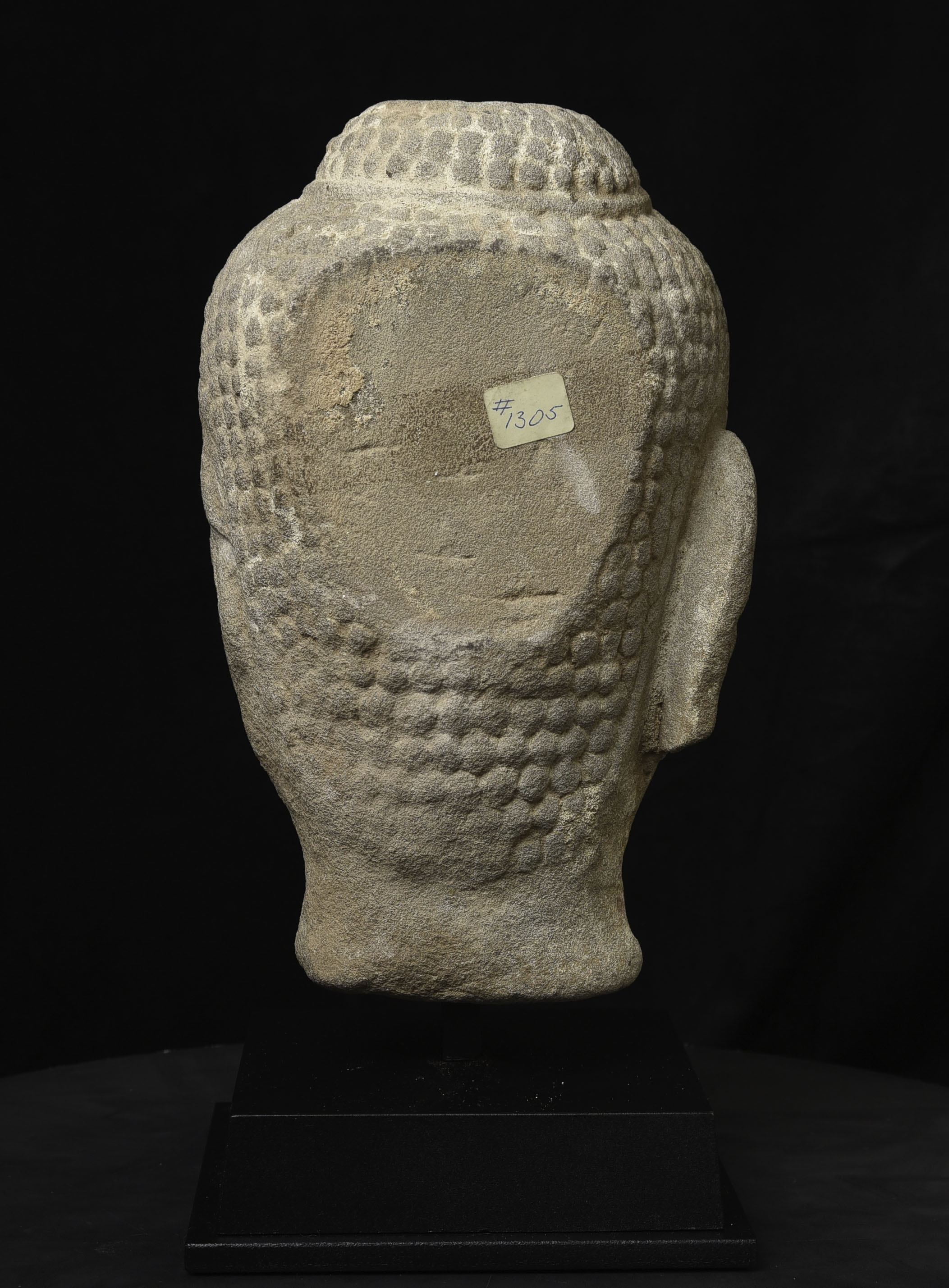 Life-size 16thC Thai stone head. The face is absolutely classic for this type--powerful, kind, and calm. The condition is very good, as can be seen in the photos. Large Buddhas of this type were meant to be looked at from below, as this Buddha would have stood above its devotees, who would have sat at his feet.