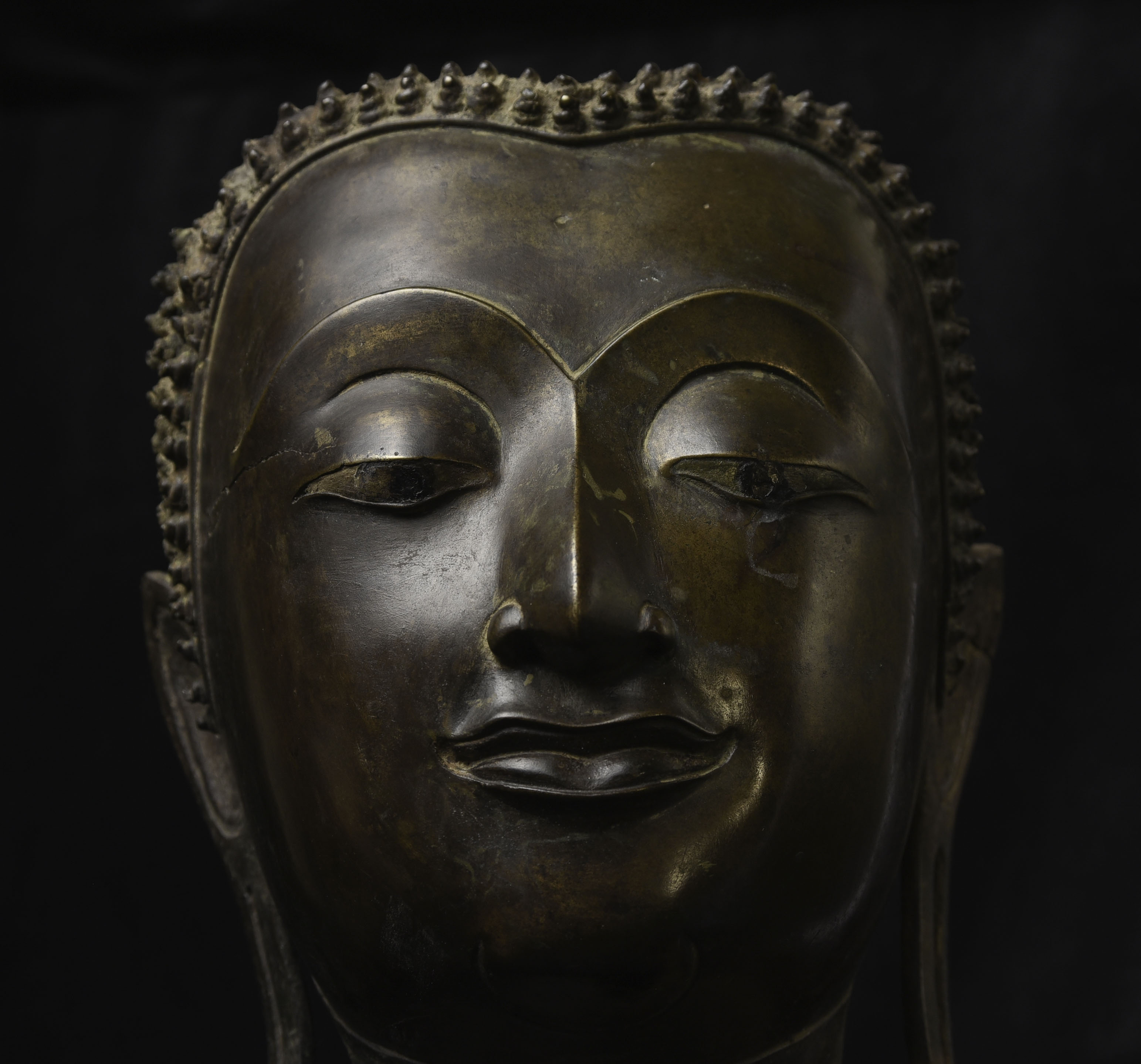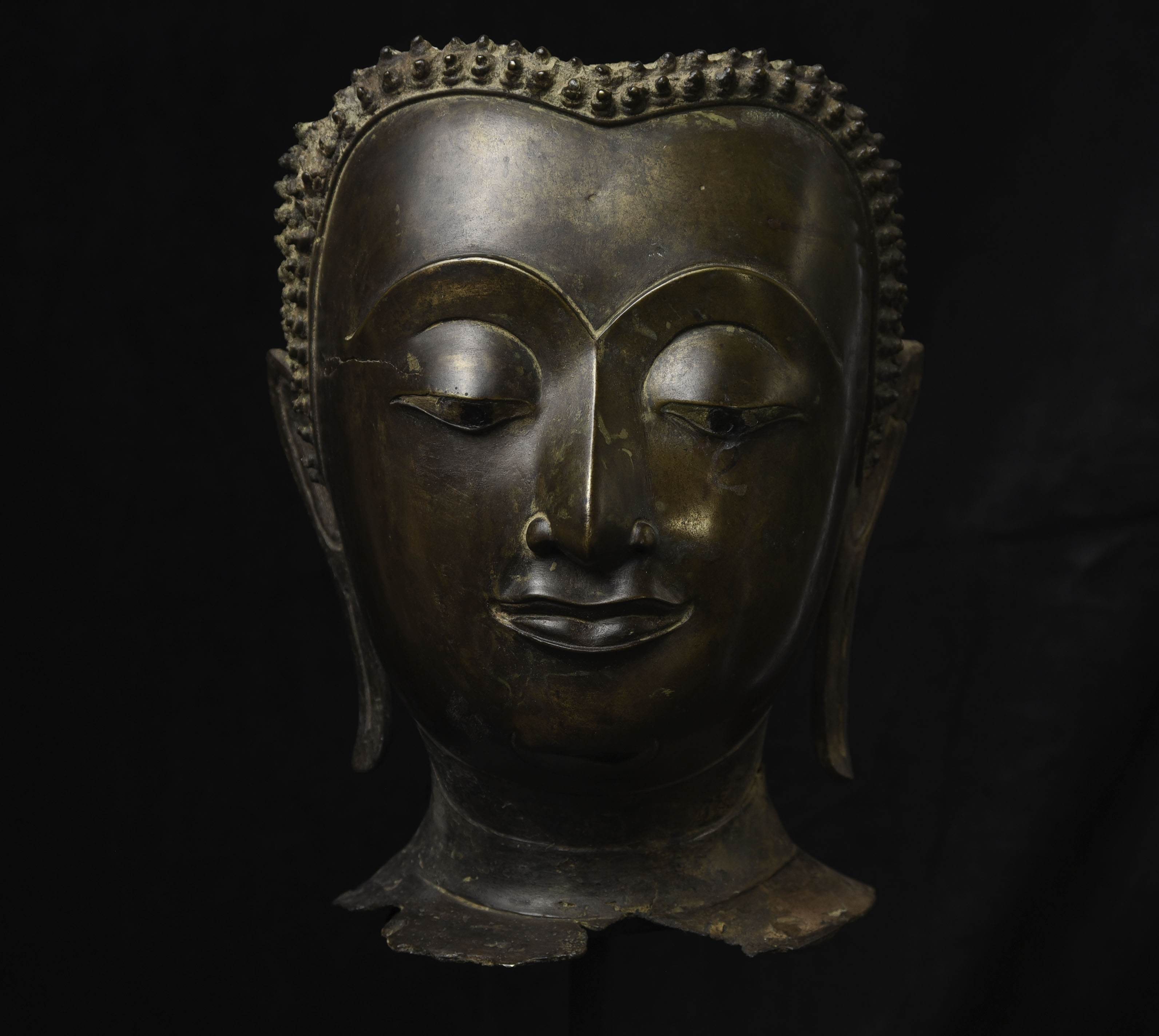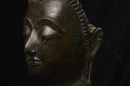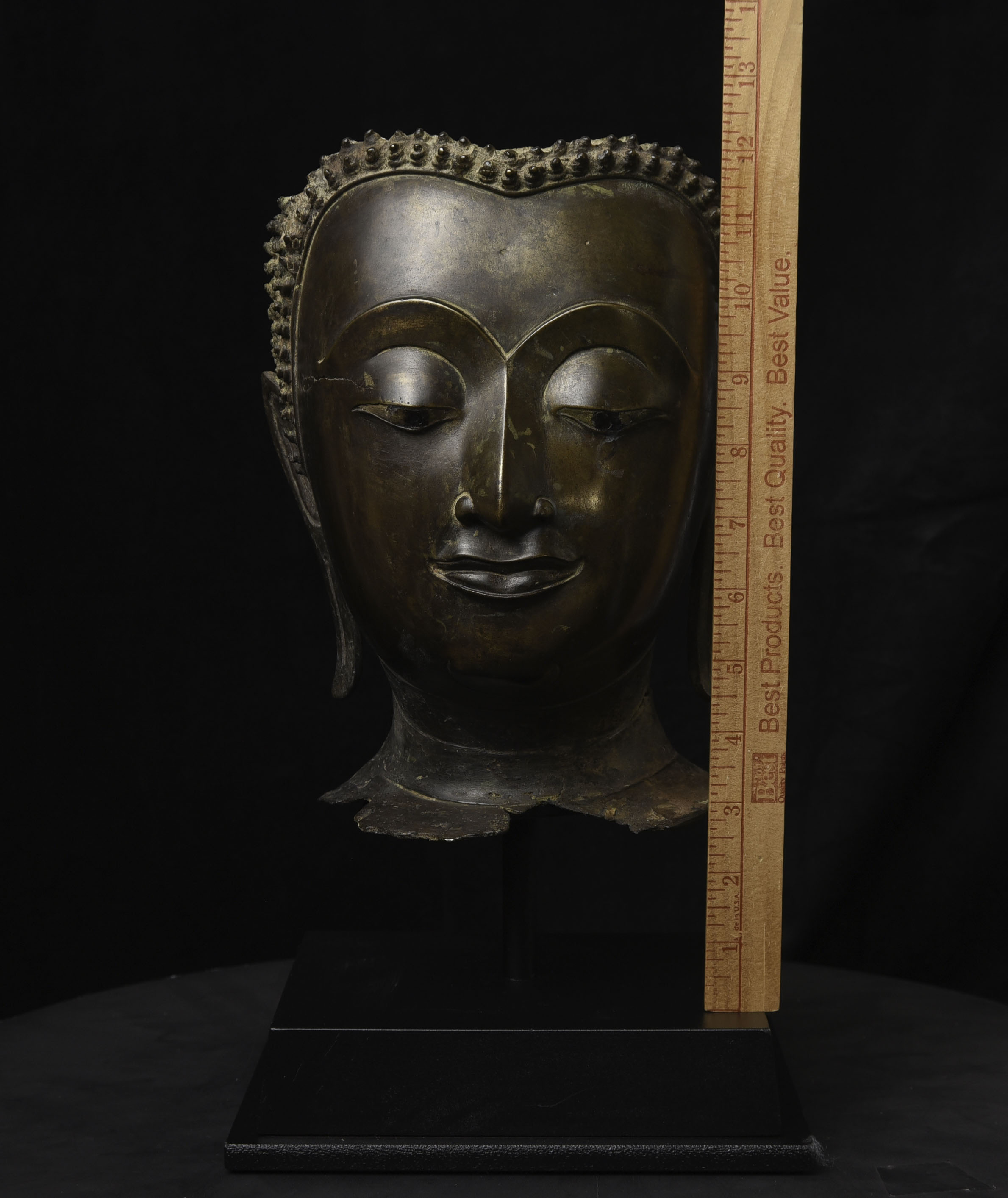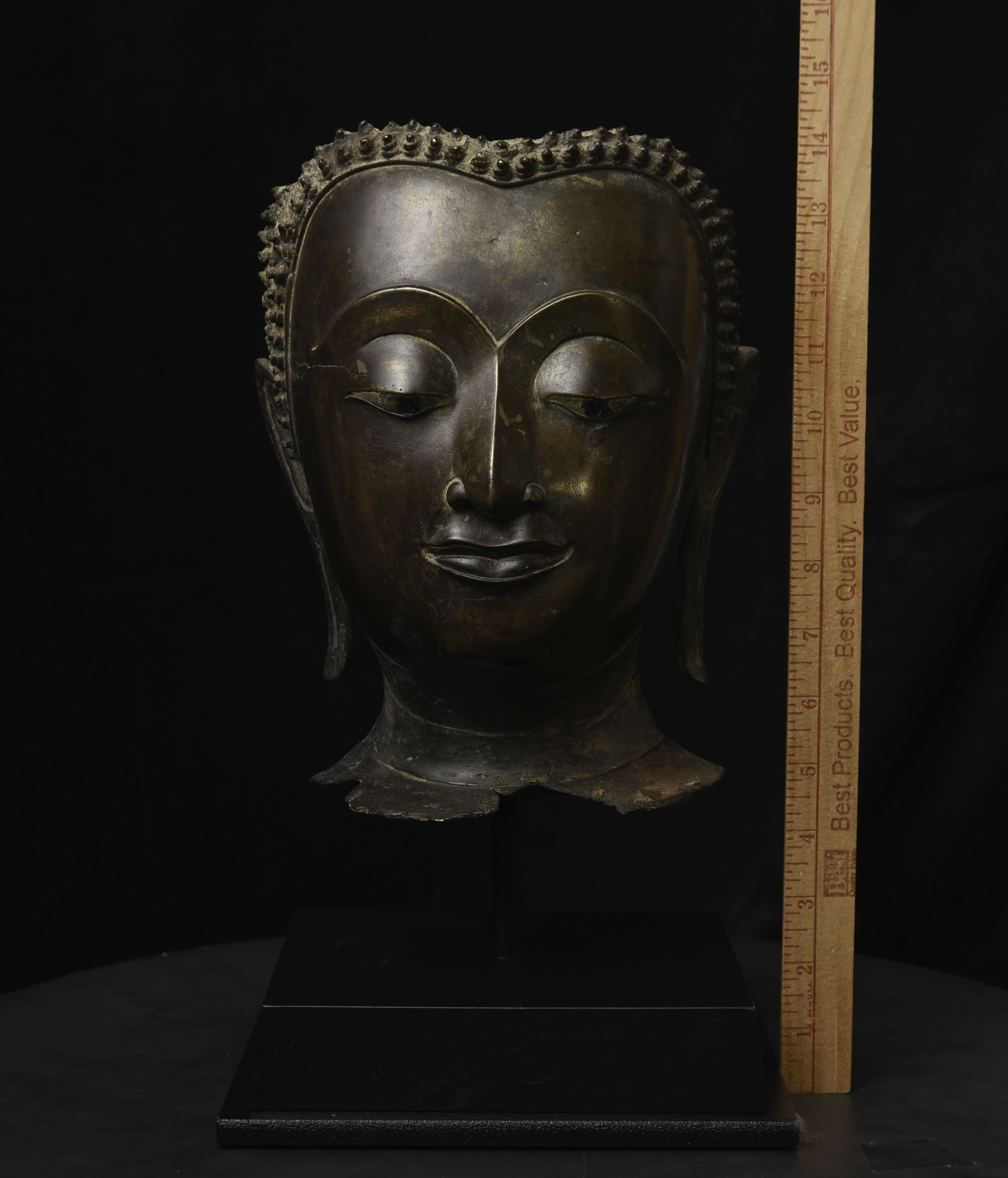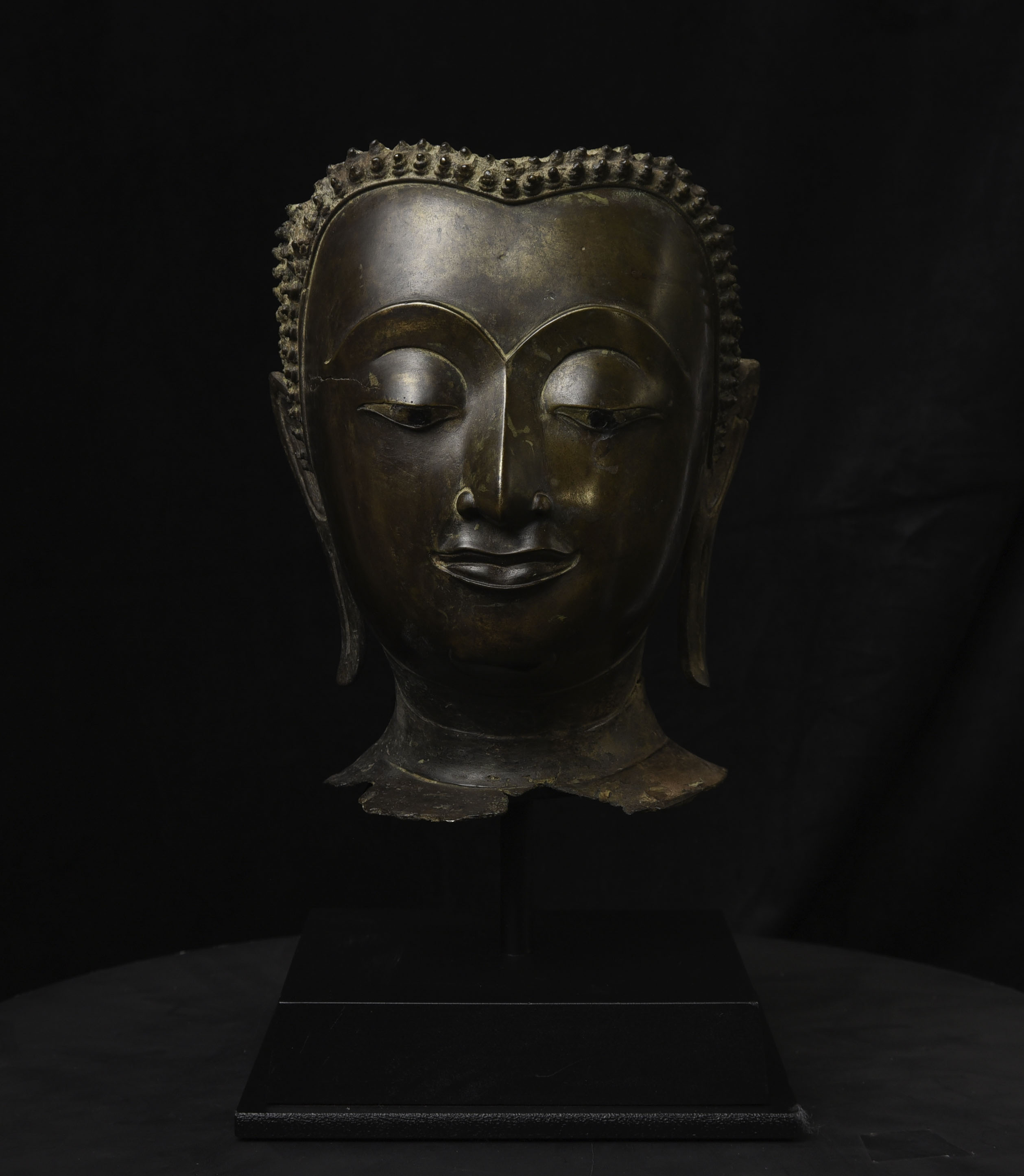Magnificent 15thC Thai Buddha partial head from a high-level or royal foundry. Originally part of a life-size Buddha that was cast in many parts. Even the head was cast in the highest-level boundary during the early Ayuthaya period. It was cast in several parts. This was done in order to be able to gain the highest level of detail and lifelike quality in the completed statue. It is from the Early Ayuthaya or possibly Kamphen Phet period (which occurred just after the Sukhothai period, near the beginning of the Ayuthaya period in Central Thailand) Grandfather of the fist King of Kamphen Phet was the last king of Sukhothai). 9.75"H for the bronze alone, not including the newly crafted custom museum-style base. World Class. ( H 9.75" x W 7.5" x D 6.75" )