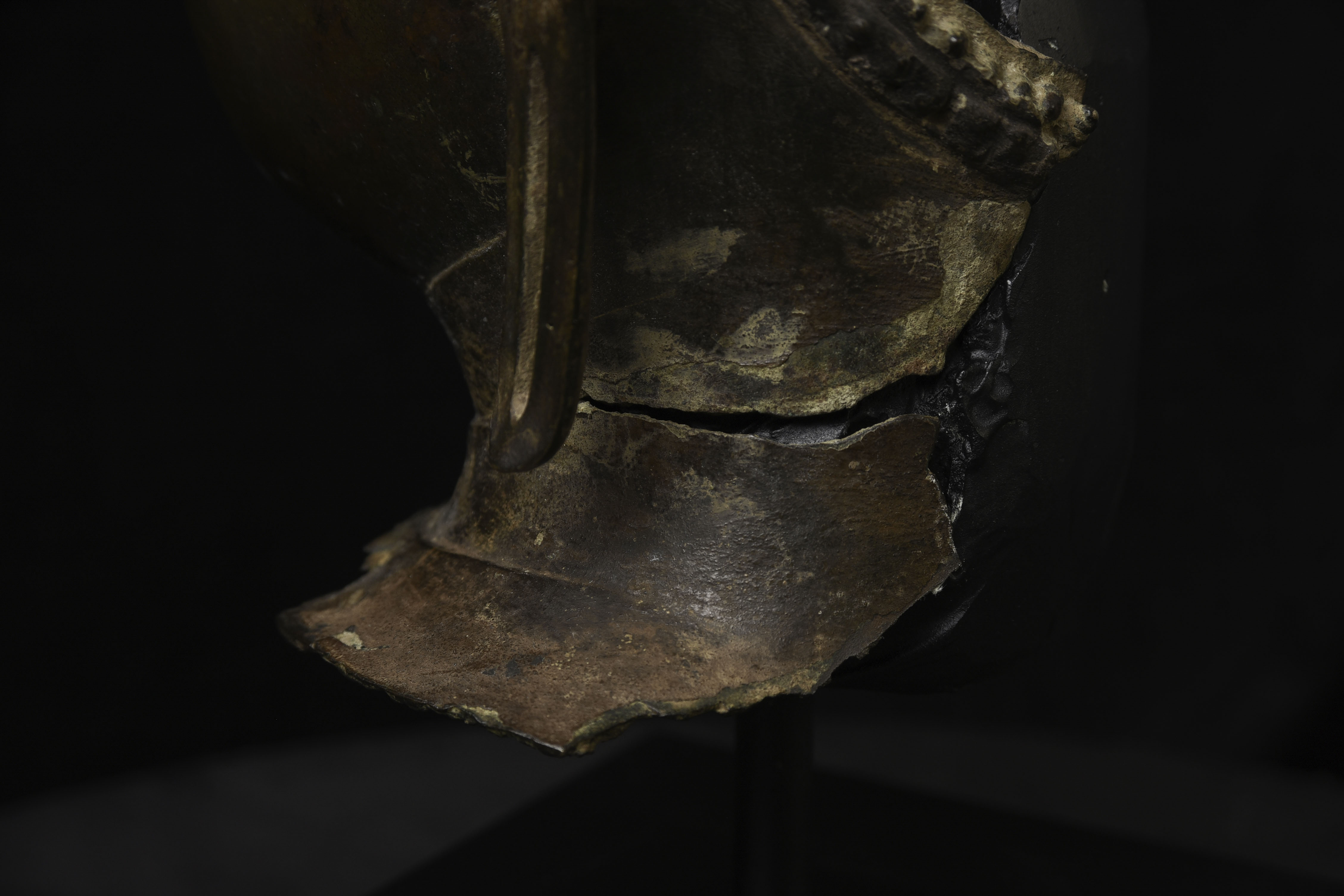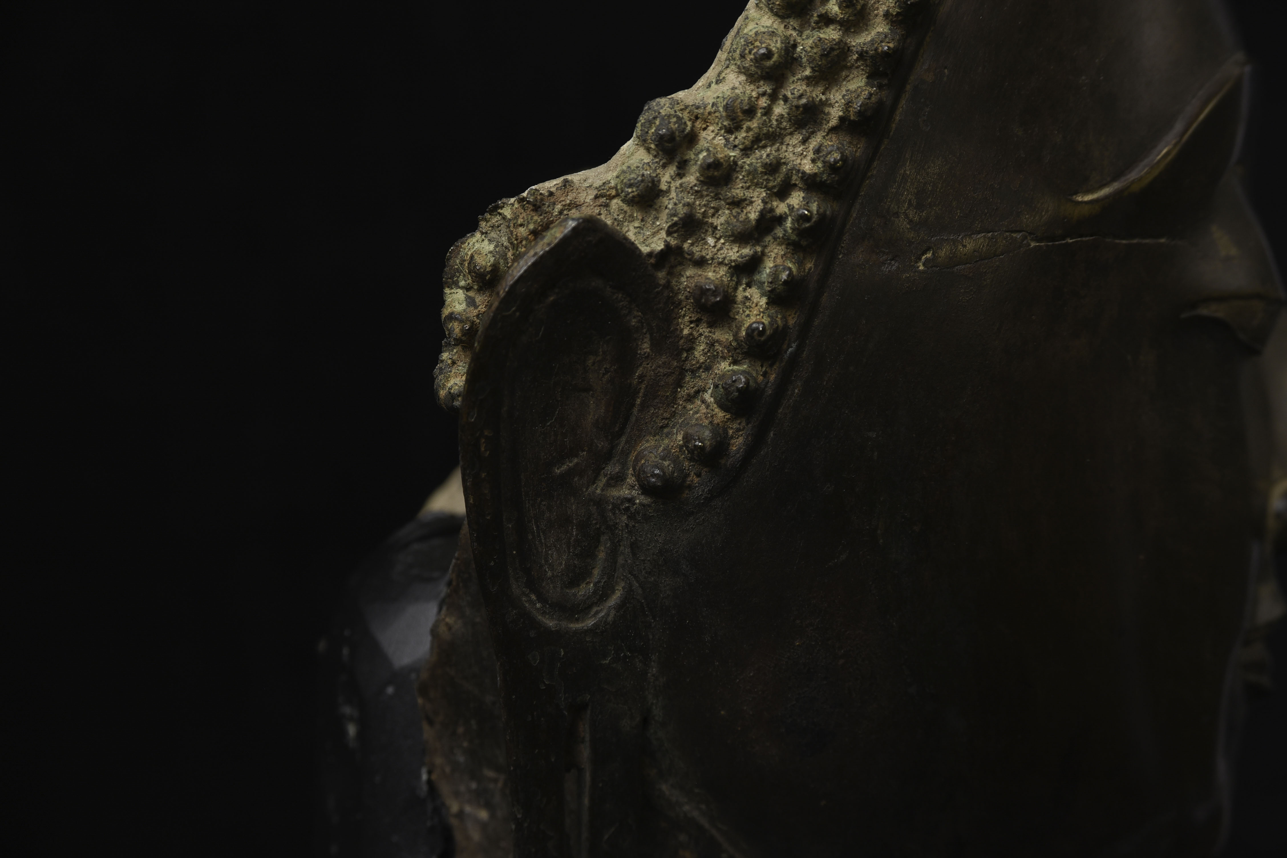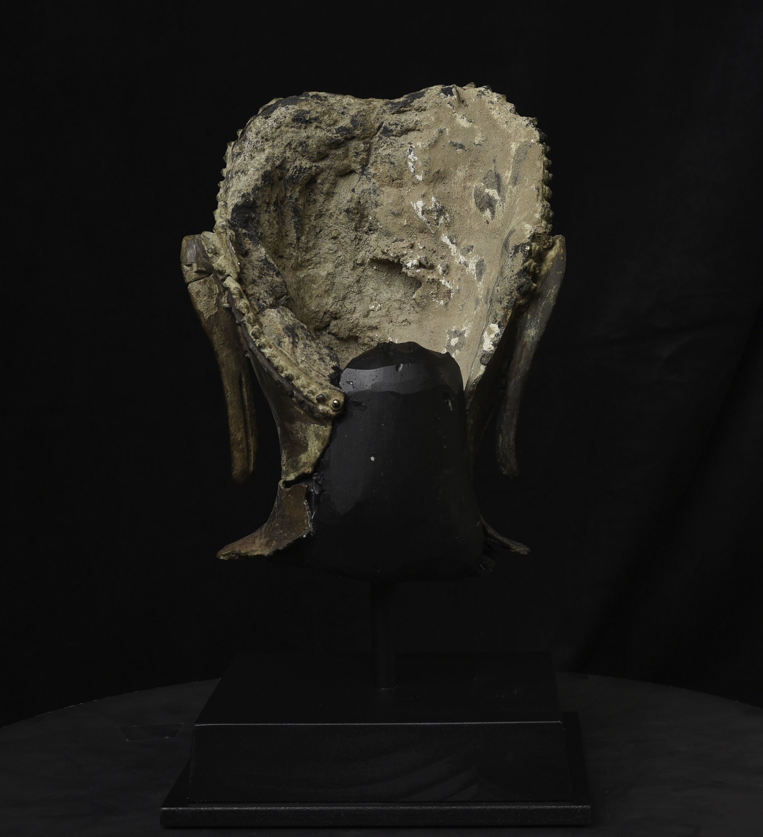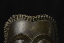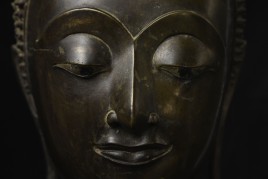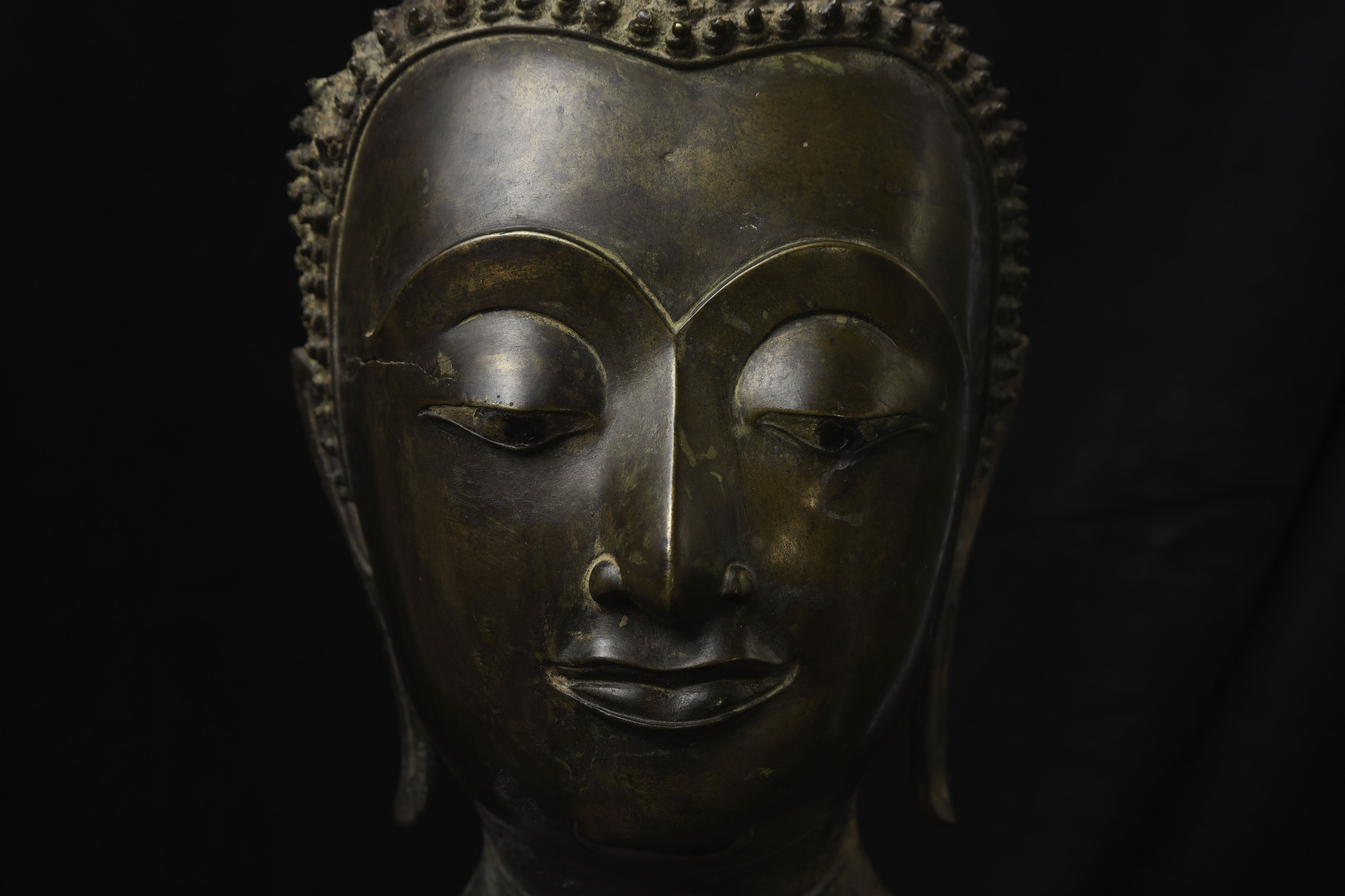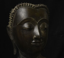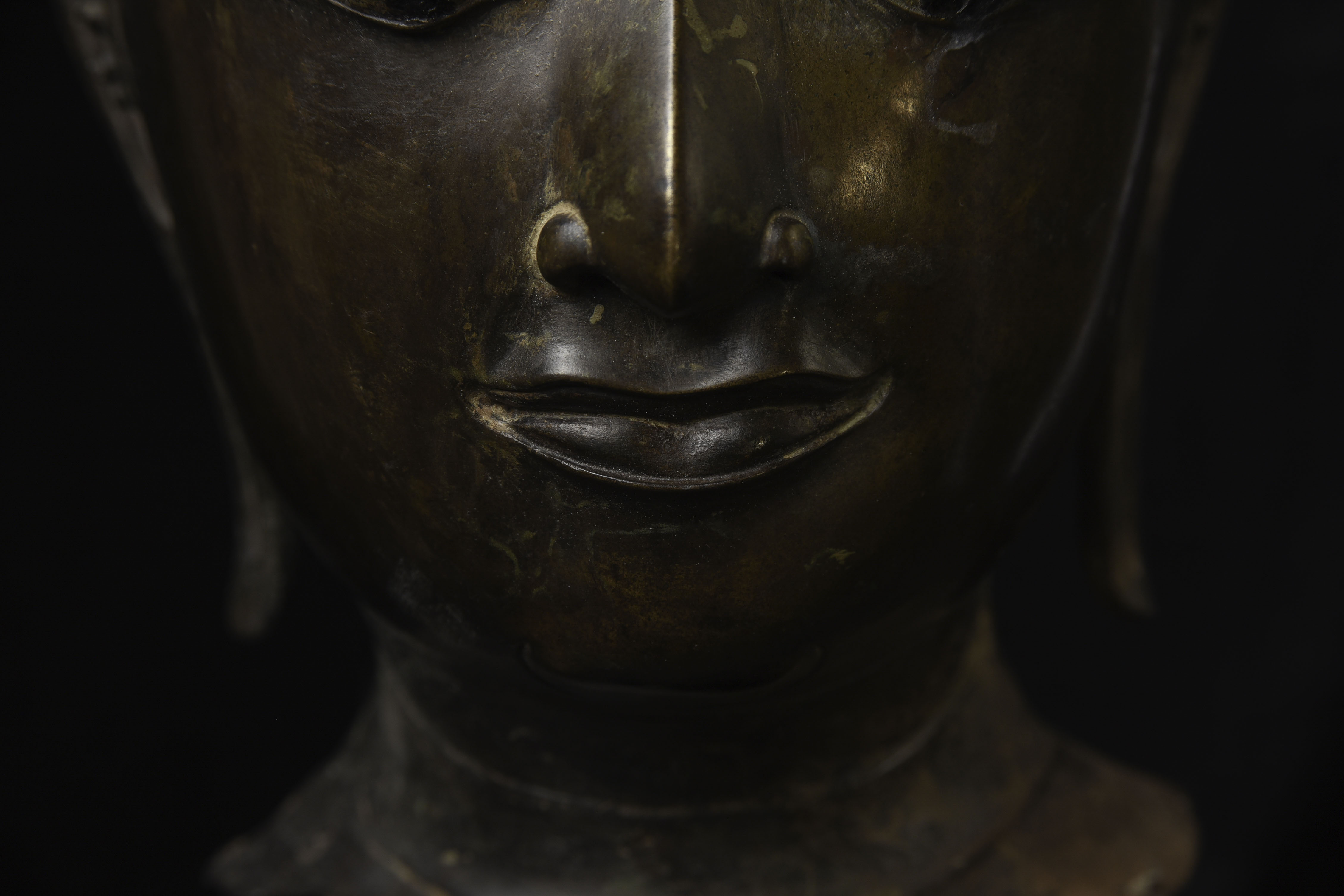 Magnificent 15thC Thai Buddha partial head from a high-level or royal foundry. Originally part of a life-size Buddha that was cast in many parts. Even the head was cast in the highest-level boundary during the early Ayuthaya period. It was cast in several parts. This was done in order to be able to gain the highest level of detail and lifelike quality in the completed statue. It is from the Early Ayuthaya or possibly Kamphen Phet period (which occurred just after the Sukhothai period, near the beginning of the Ayuthaya period in Central Thailand) Grandfather of the fist King of Kamphen Phet was the last king of Sukhothai). 9.75"H for the bronze alone, not including the newly crafted custom museum-style base. World Class. ( H 9.75" x W 7.5" x D 6.75" )