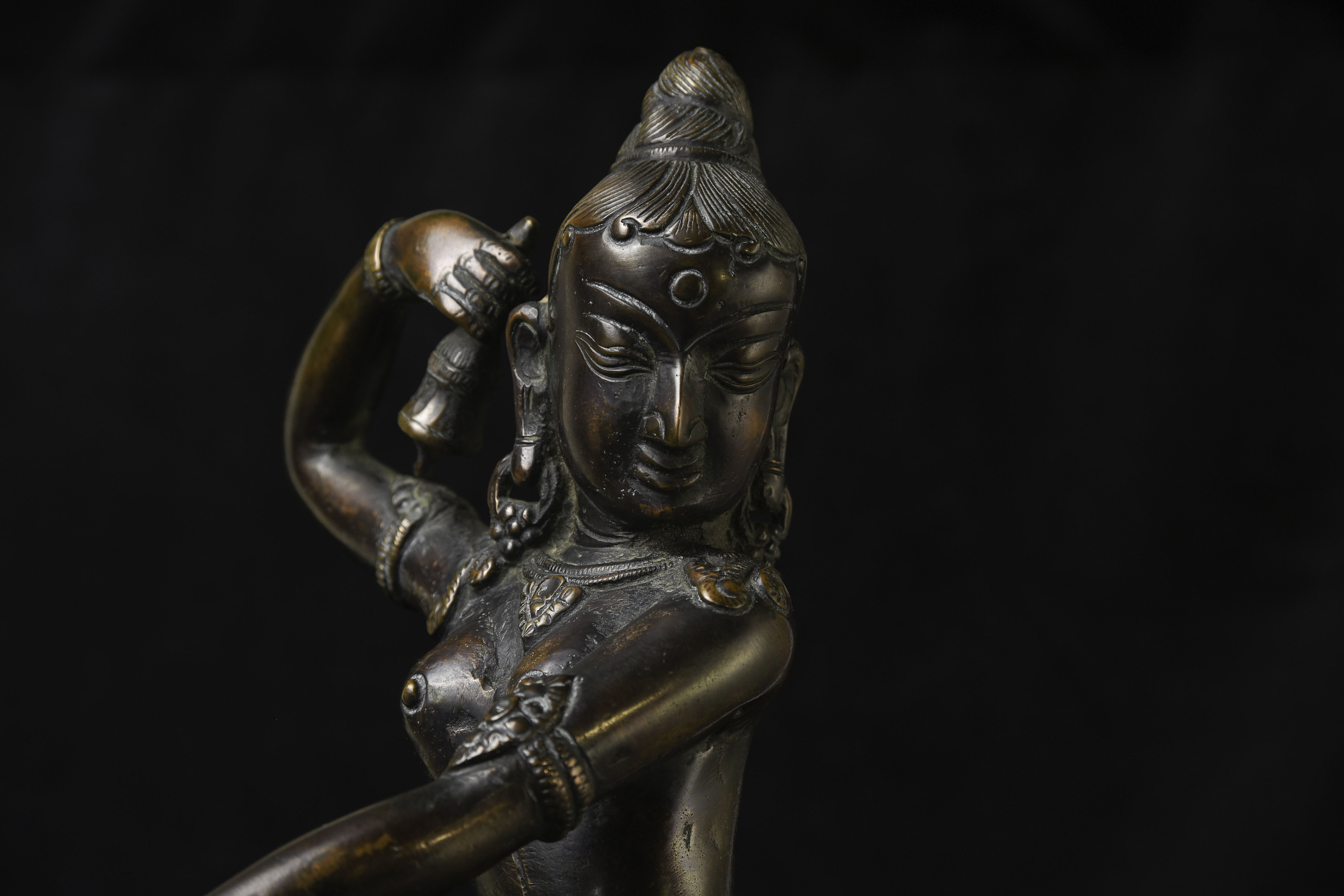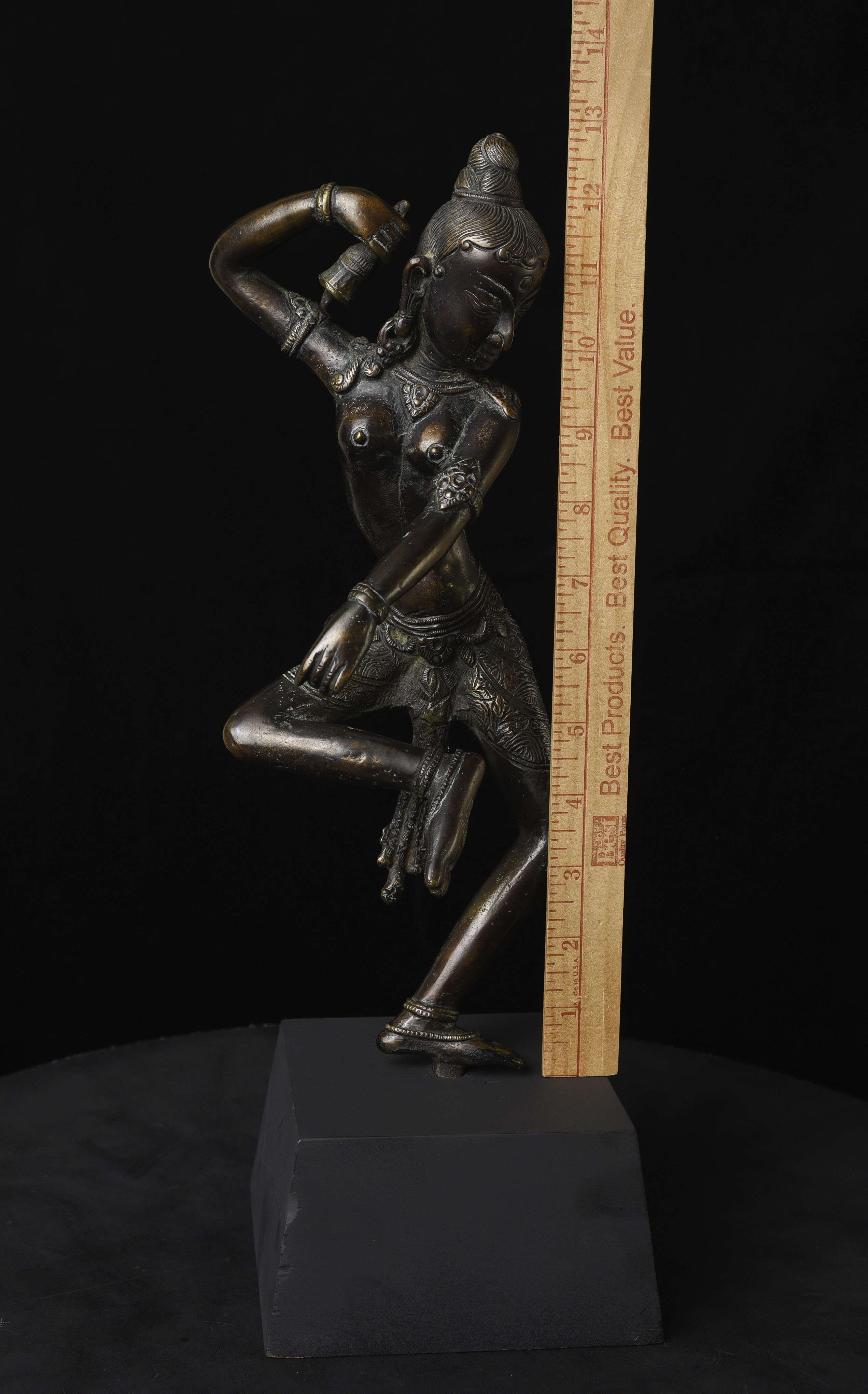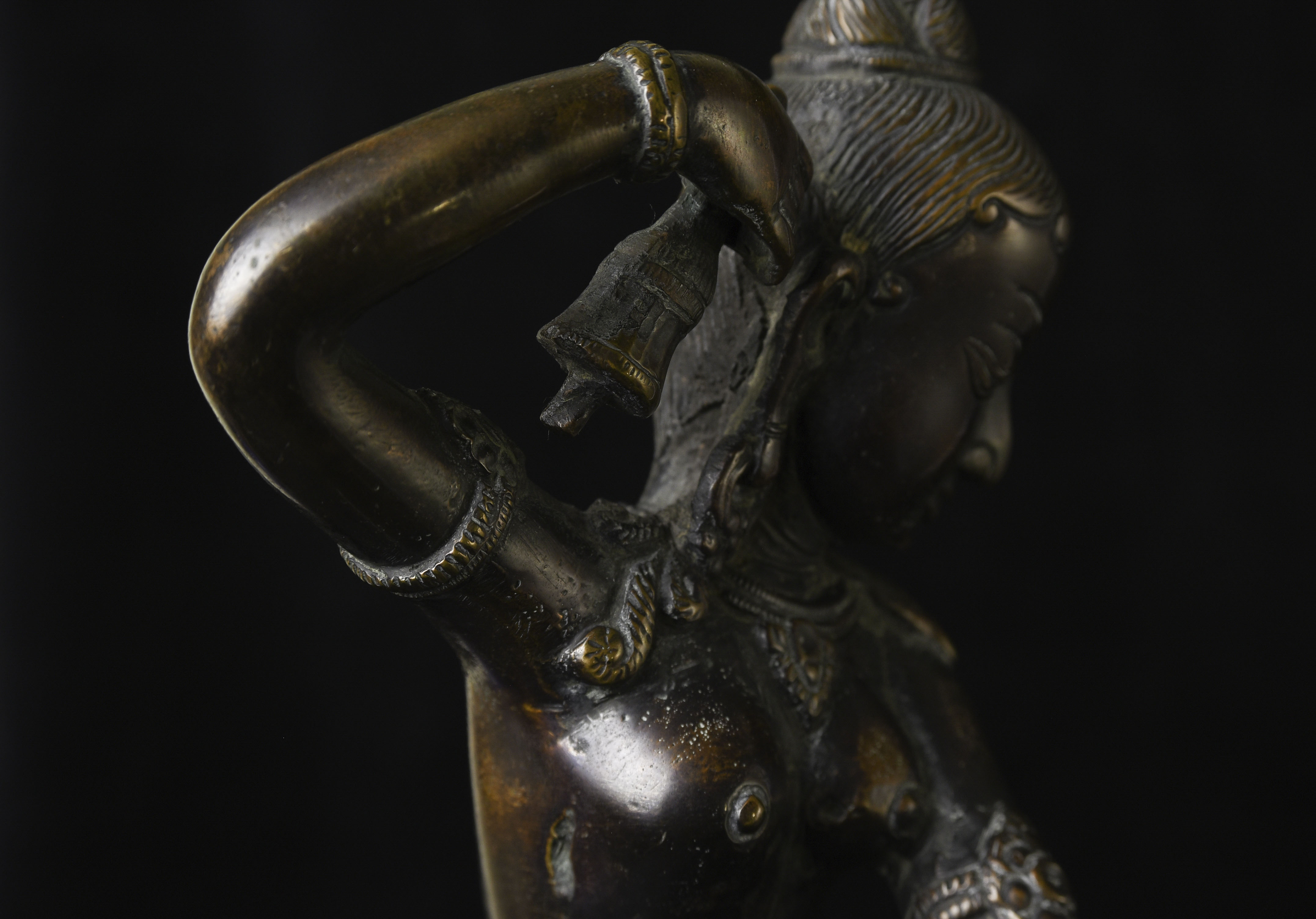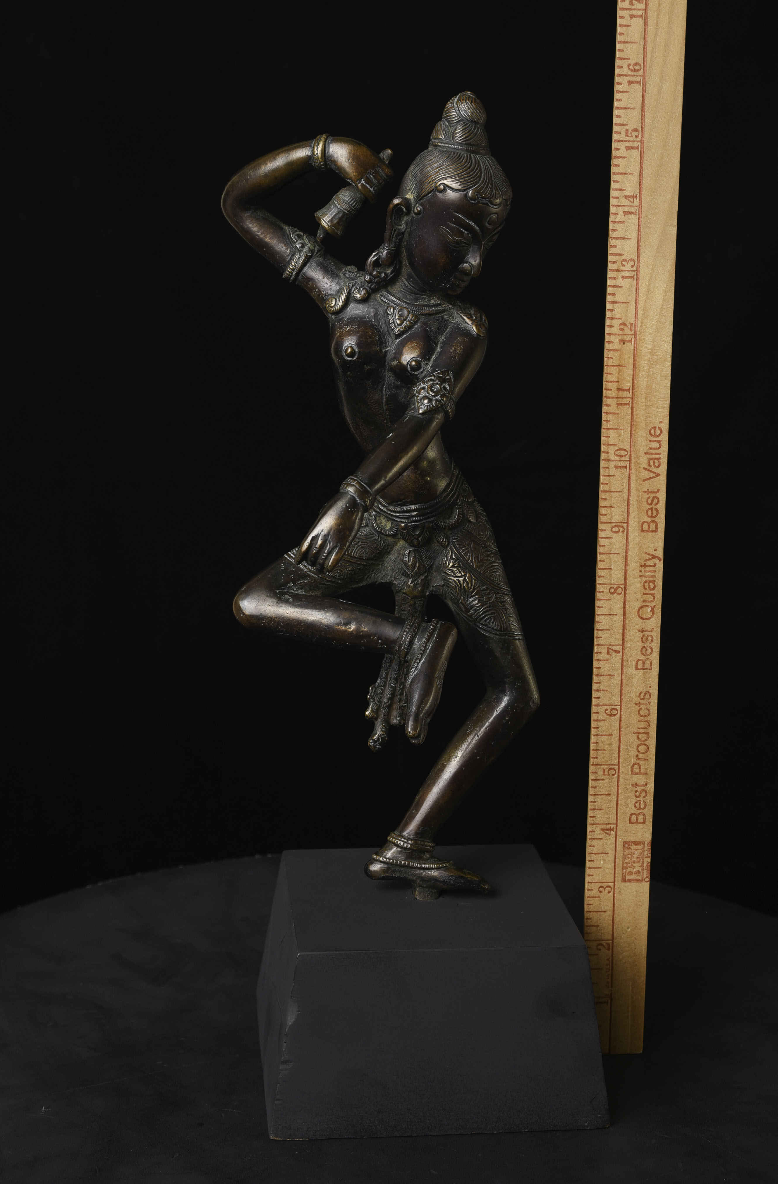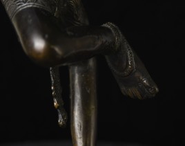 This is a large and lovely Dakini with a wonderful glow to the surface, and a delightful overall balance to the figure. While it would typically be attributed to Tibet or Nepal, over the years I've seen several related examples that were attributed to Burma. I, therefore, leave it to the buyer to determine whether this piece is from Burma or the Himalayas