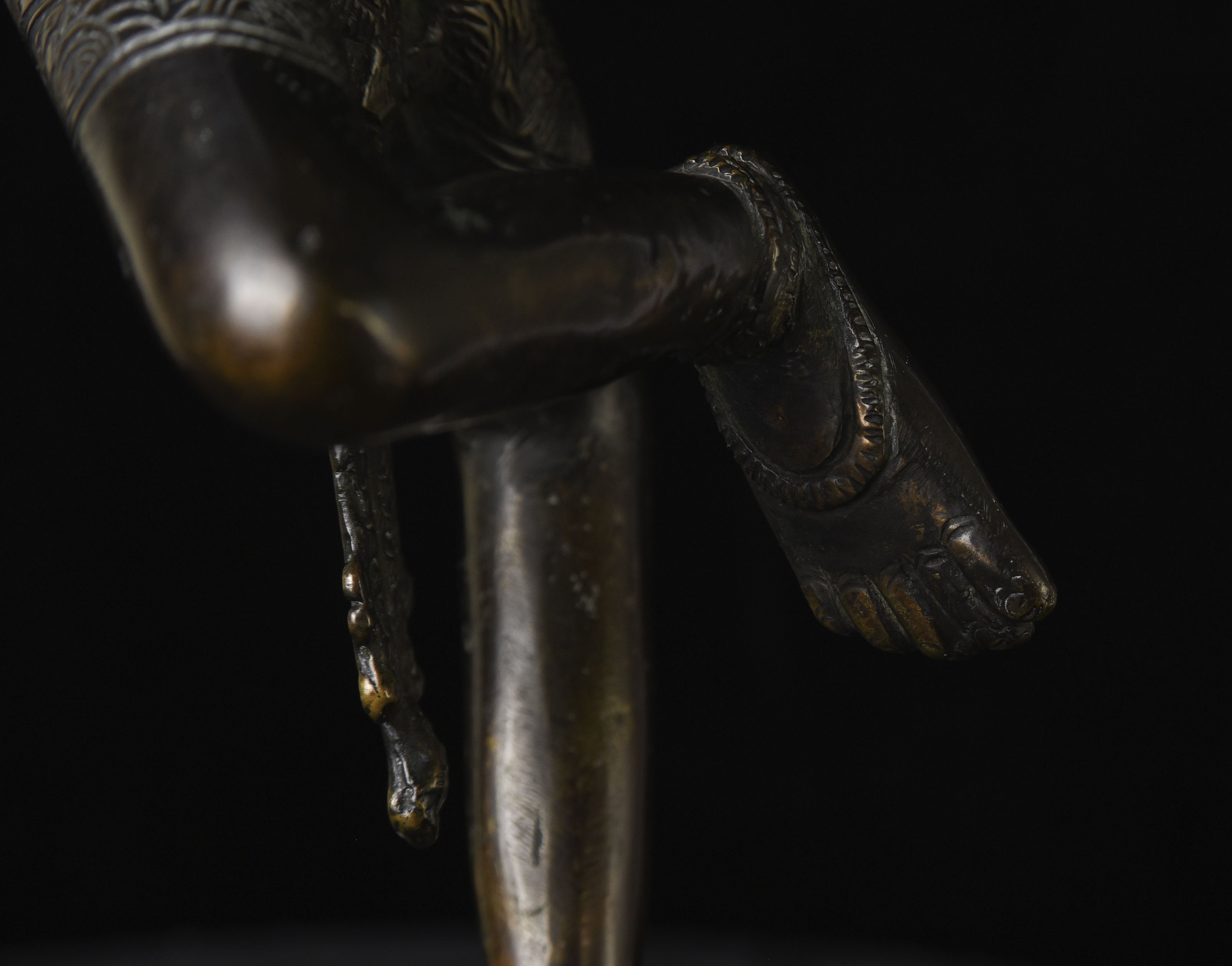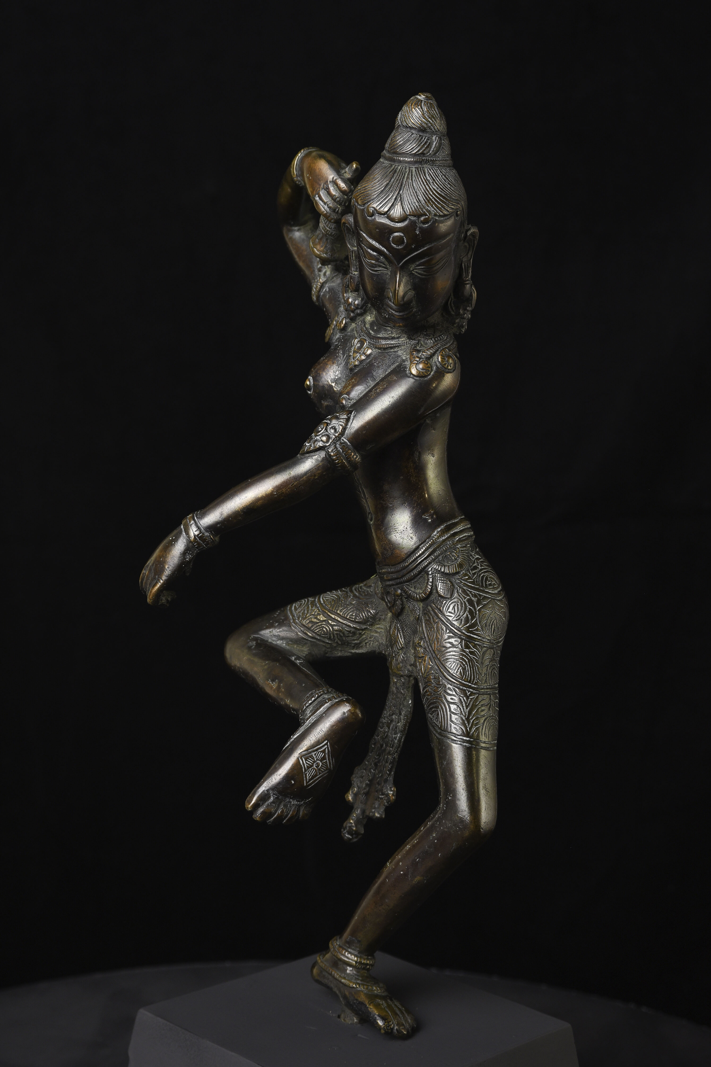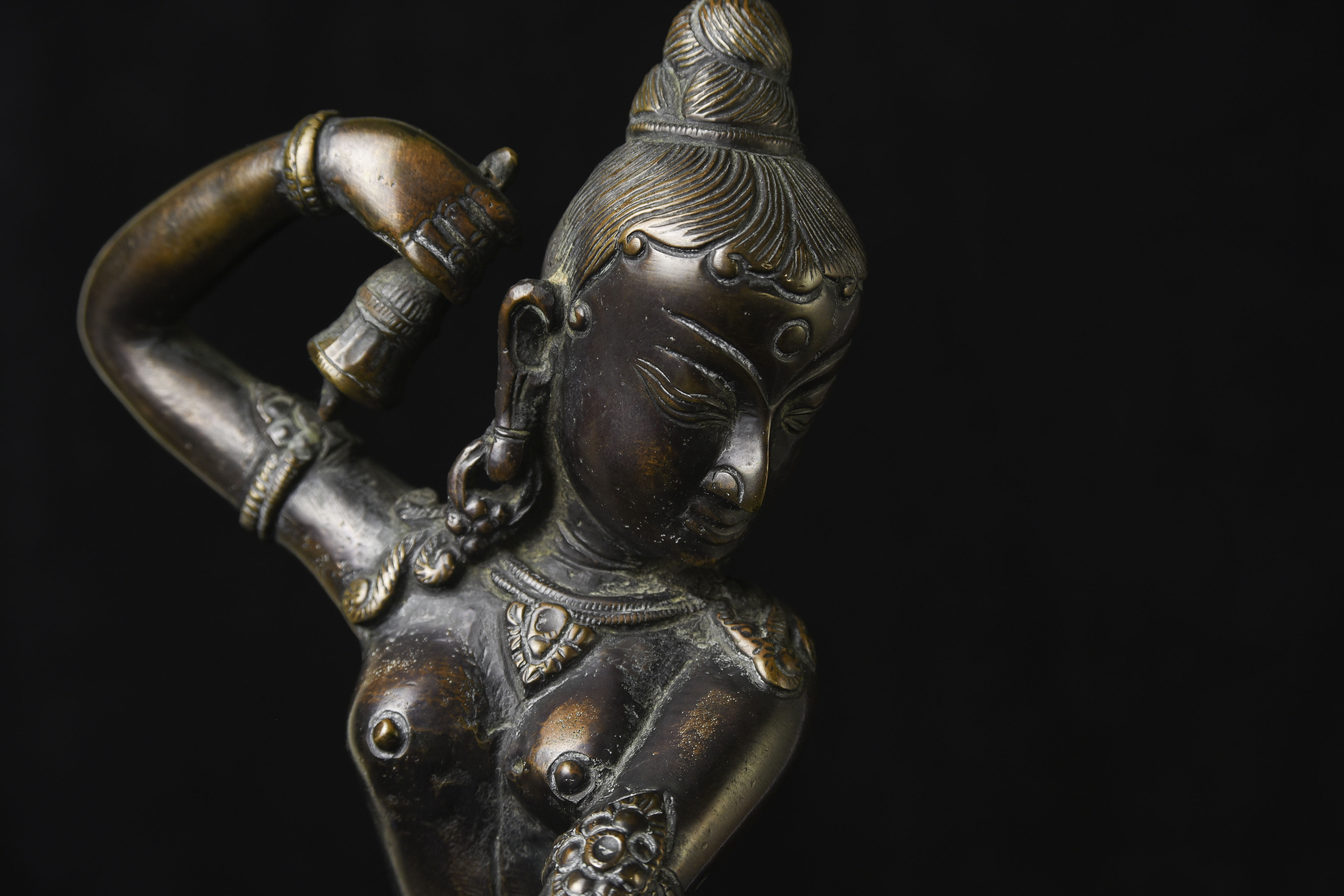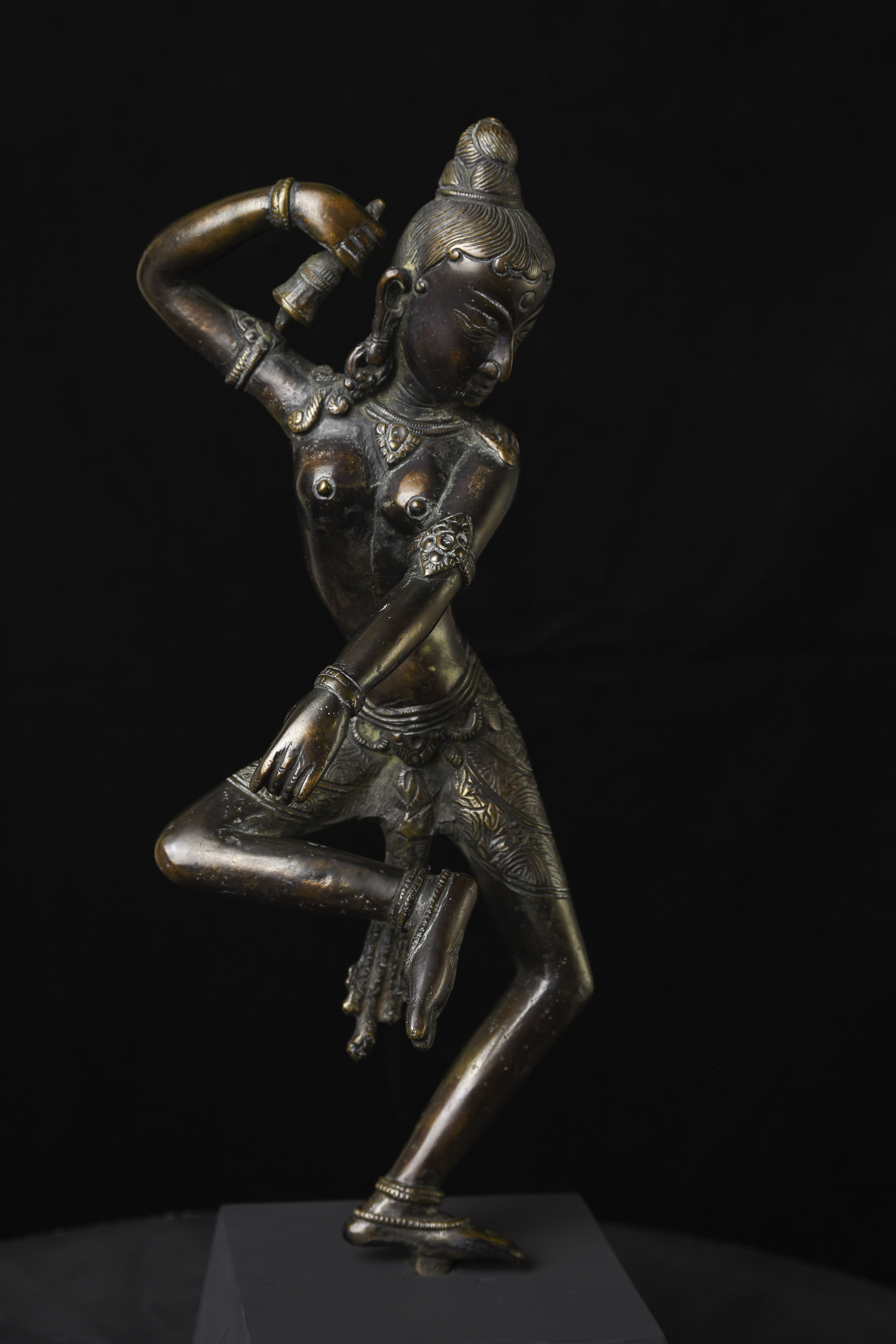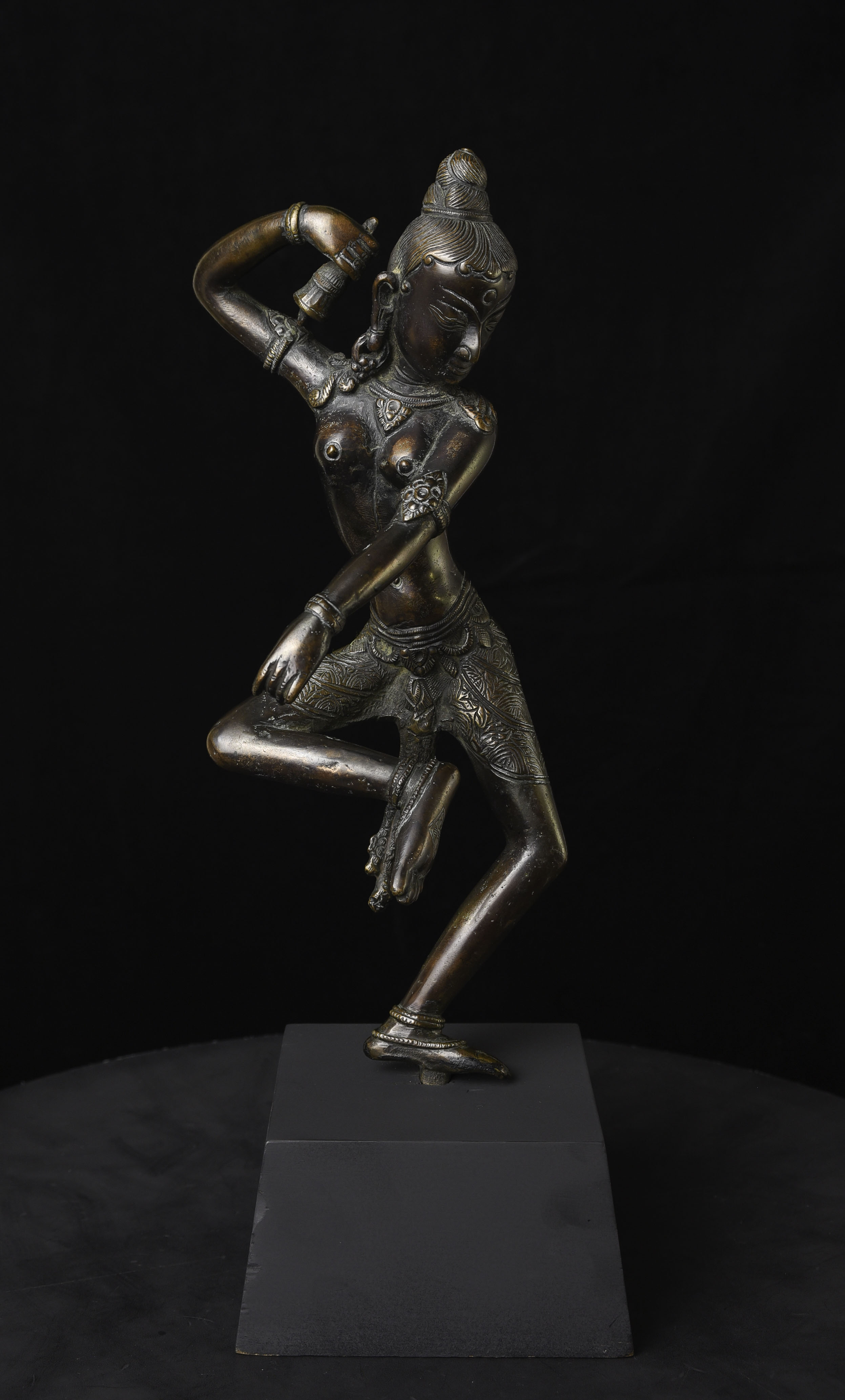 This is a large and lovely Dakini with a wonderful glow to the surface, and a delightful overall balance to the figure. While it would typically be attributed to Tibet or Nepal, over the years I've seen several related examples that were attributed to Burma. I, therefore, leave it to the buyer to determine whether this piece is from Burma or the Himalayas